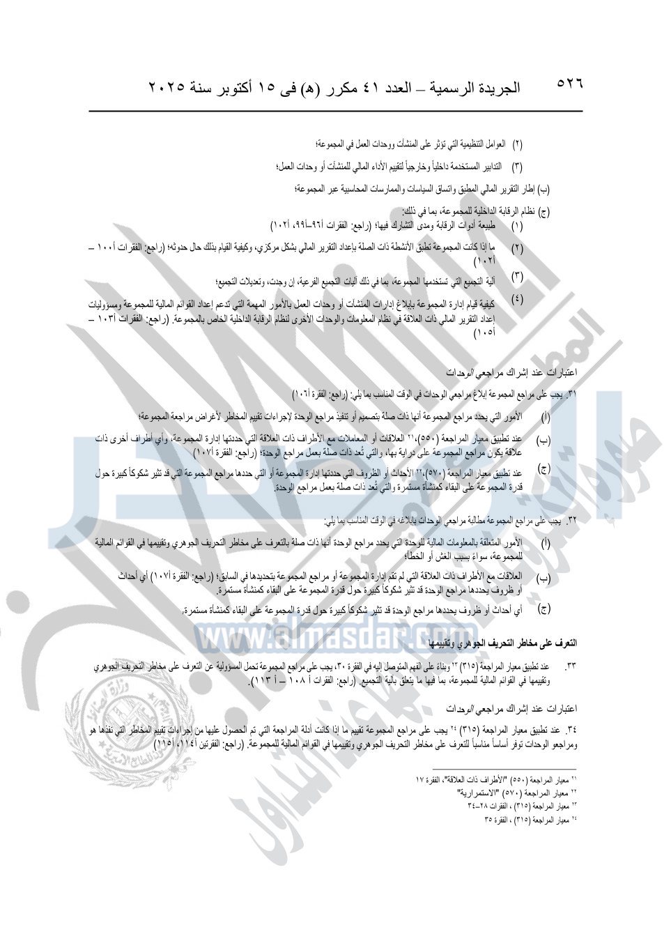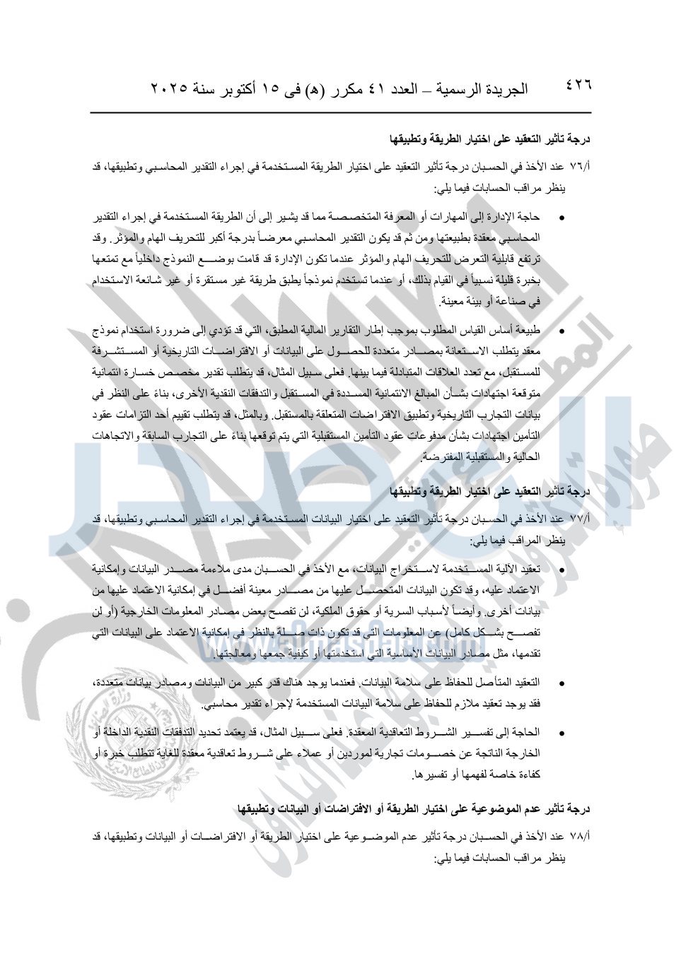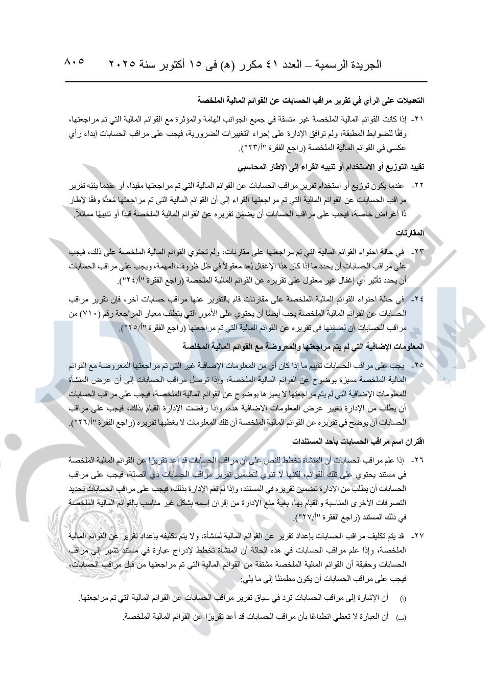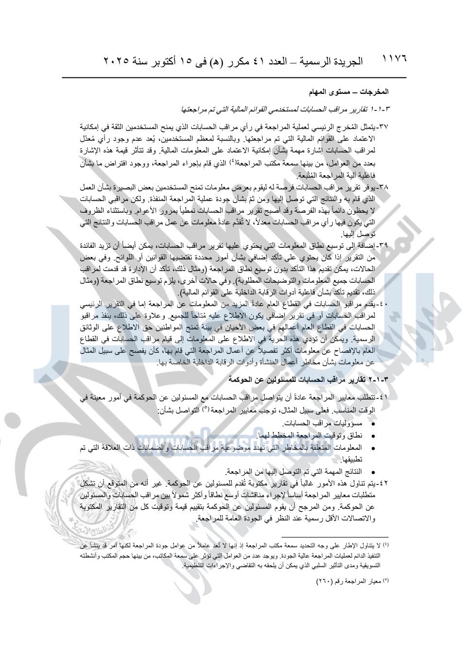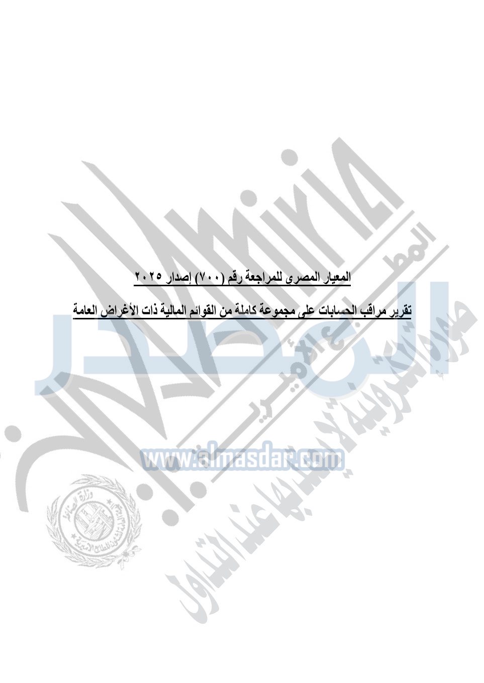نشرت الجريدة الرسمية في العدد 41 مكرر "هـ" الصادر في 15 أكتوبر سنة 2025، قرار رئيس مجلس الوزراء رقم 3725 لسنة 2025، بشأن العمل بالمعايير المصرية للمراجعة والفحص المحدود ومهام التأكد الأخرى المرافقة لهذا القرار.