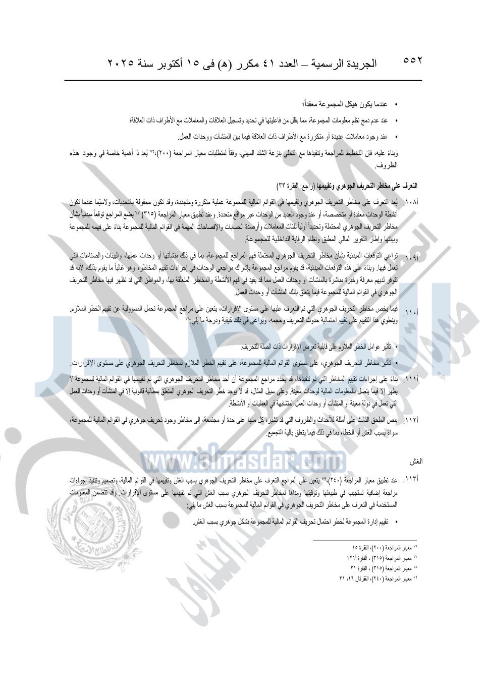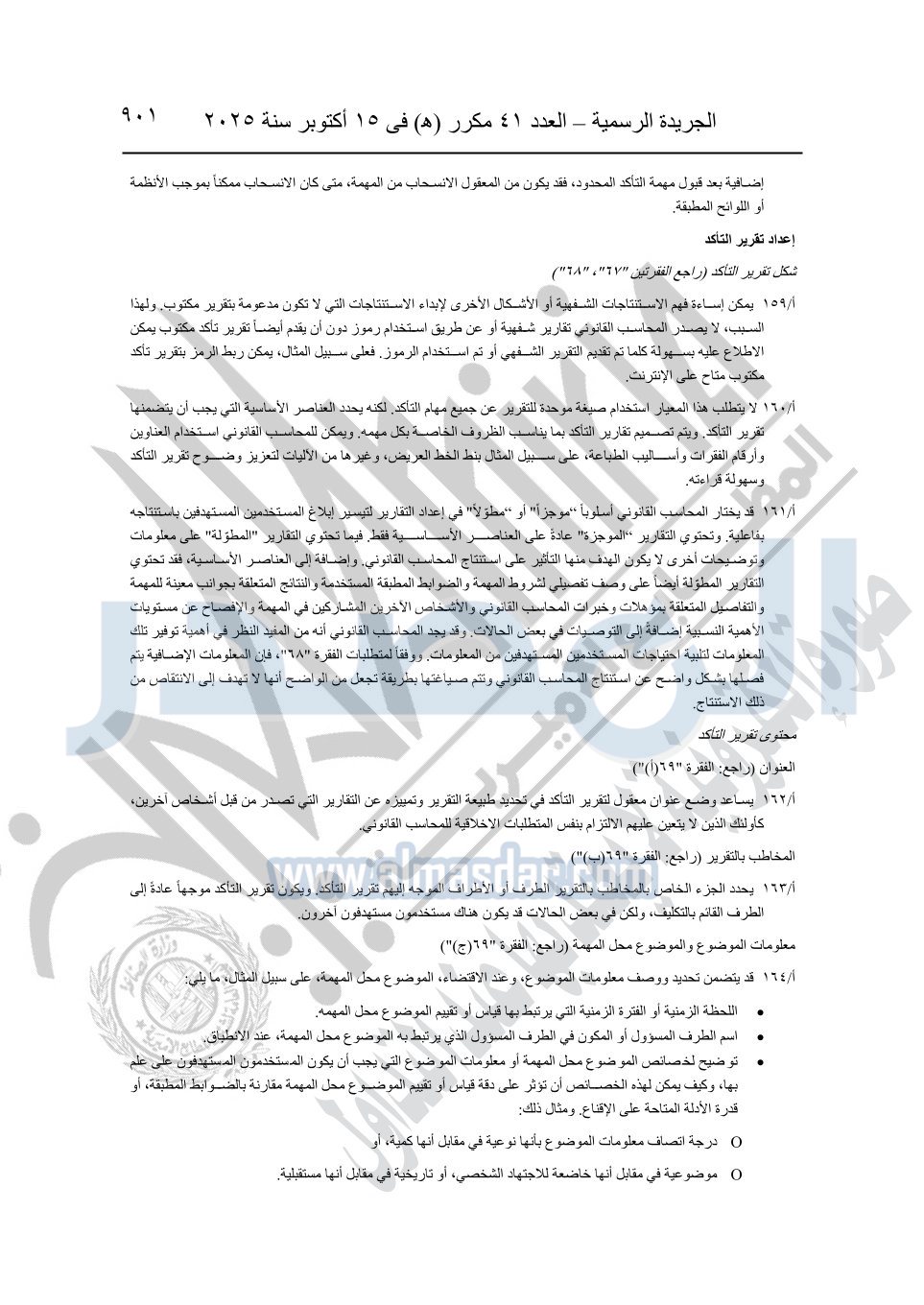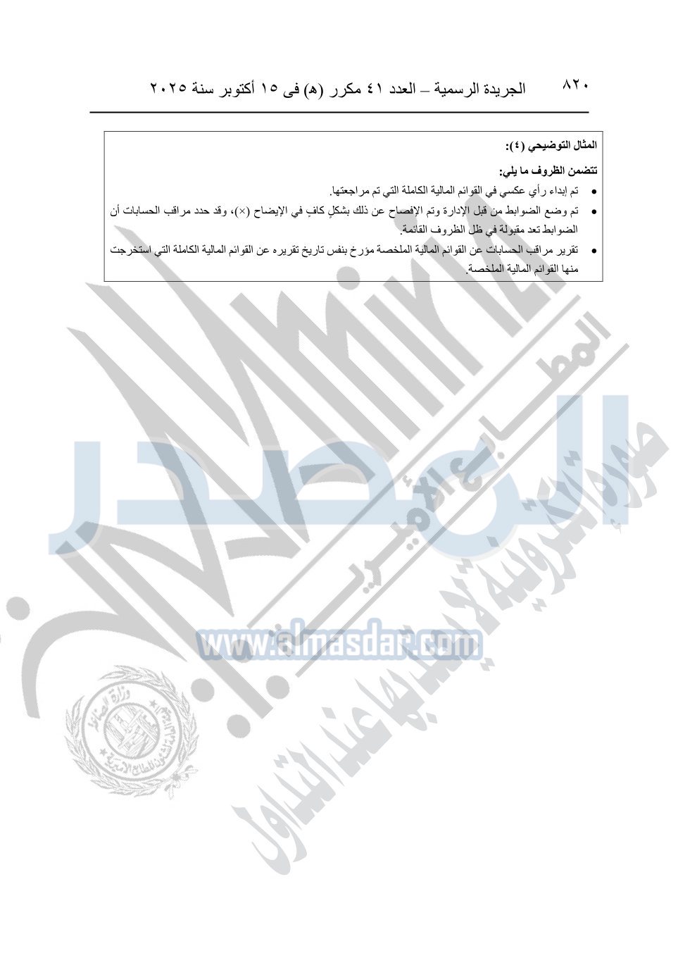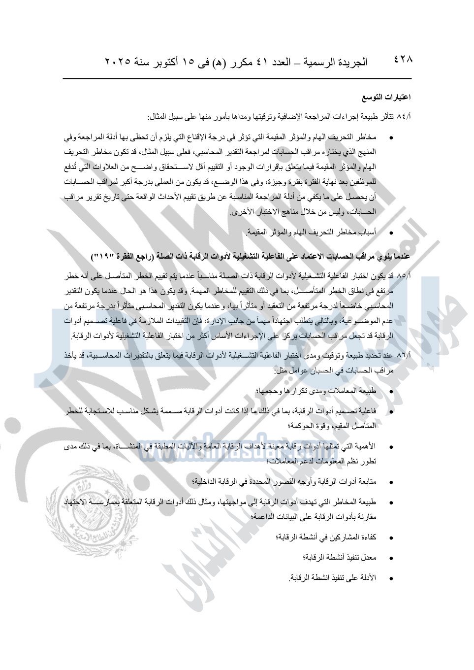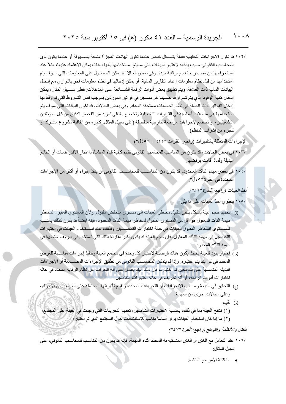نشرت الجريدة الرسمية في العدد 41 مكرر "هـ" الصادر في 15 أكتوبر سنة 2025، قرار رئيس مجلس الوزراء رقم 3725 لسنة 2025، بشأن العمل بالمعايير المصرية للمراجعة والفحص المحدود ومهام التأكد الأخرى المرافقة لهذا القرار.
