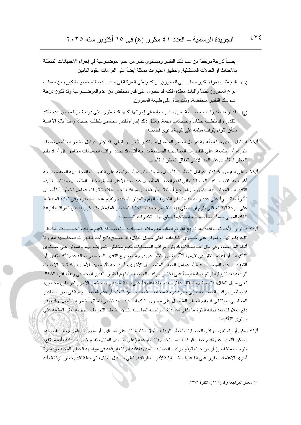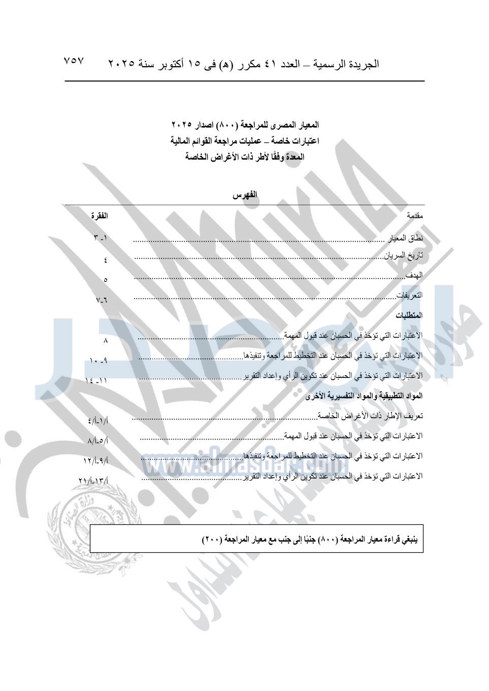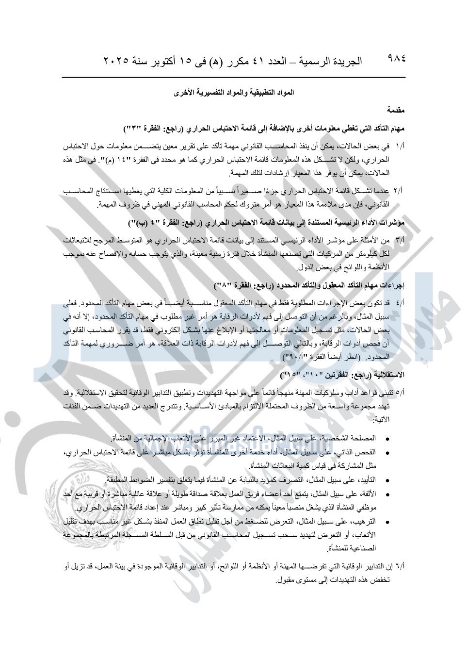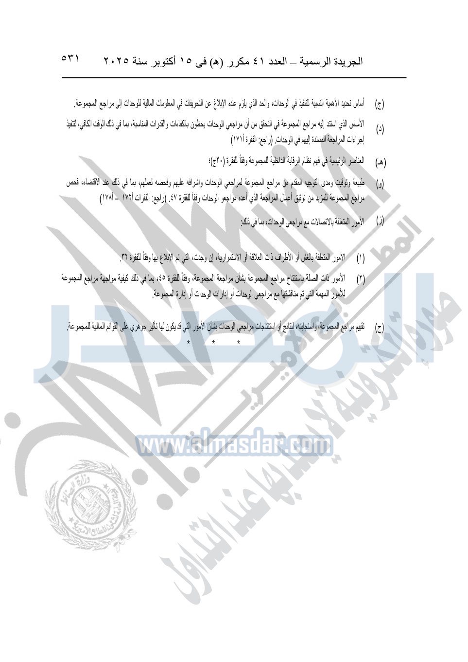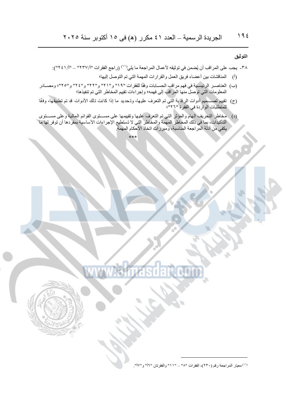 نشرت الجريدة الرسمية في العدد 41 مكرر "هـ" الصادر في 15 أكتوبر سنة 2025، قرار رئيس مجلس الوزراء رقم 3725 لسنة 2025، بشأن العمل بالمعايير المصرية للمراجعة والفحص المحدود ومهام التأكد الأخرى المرافقة لهذا القرار.