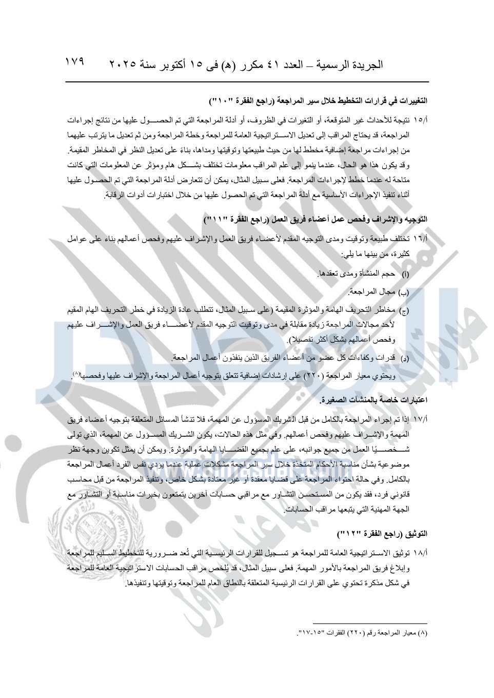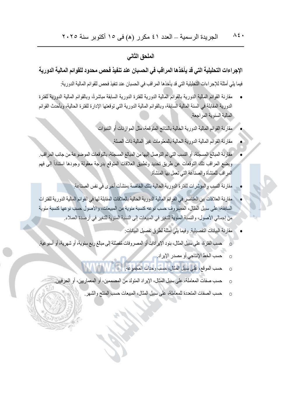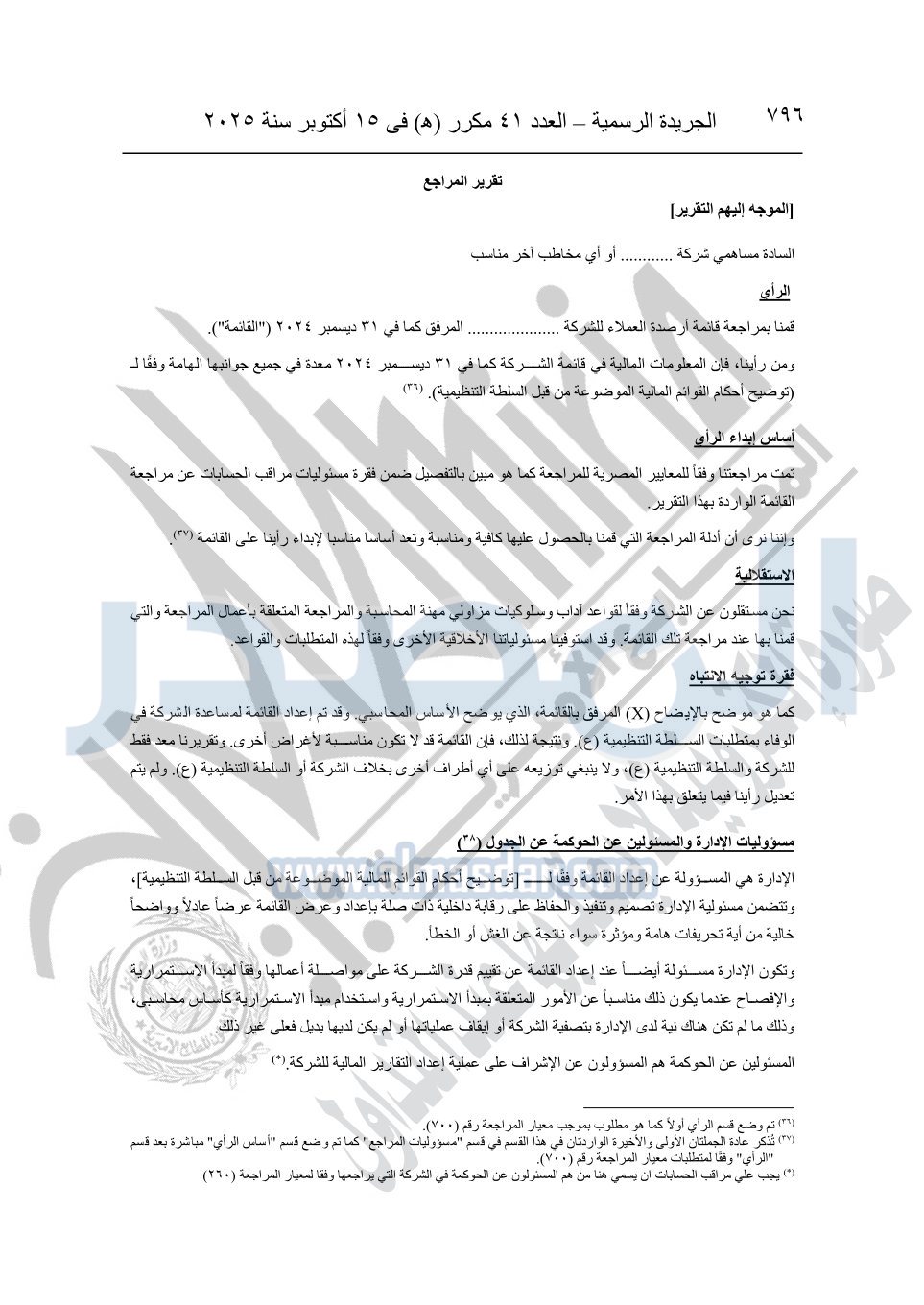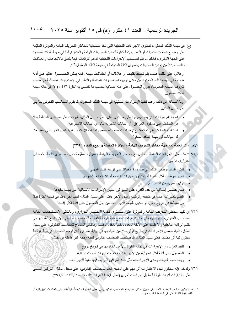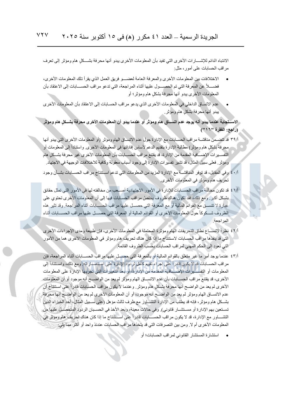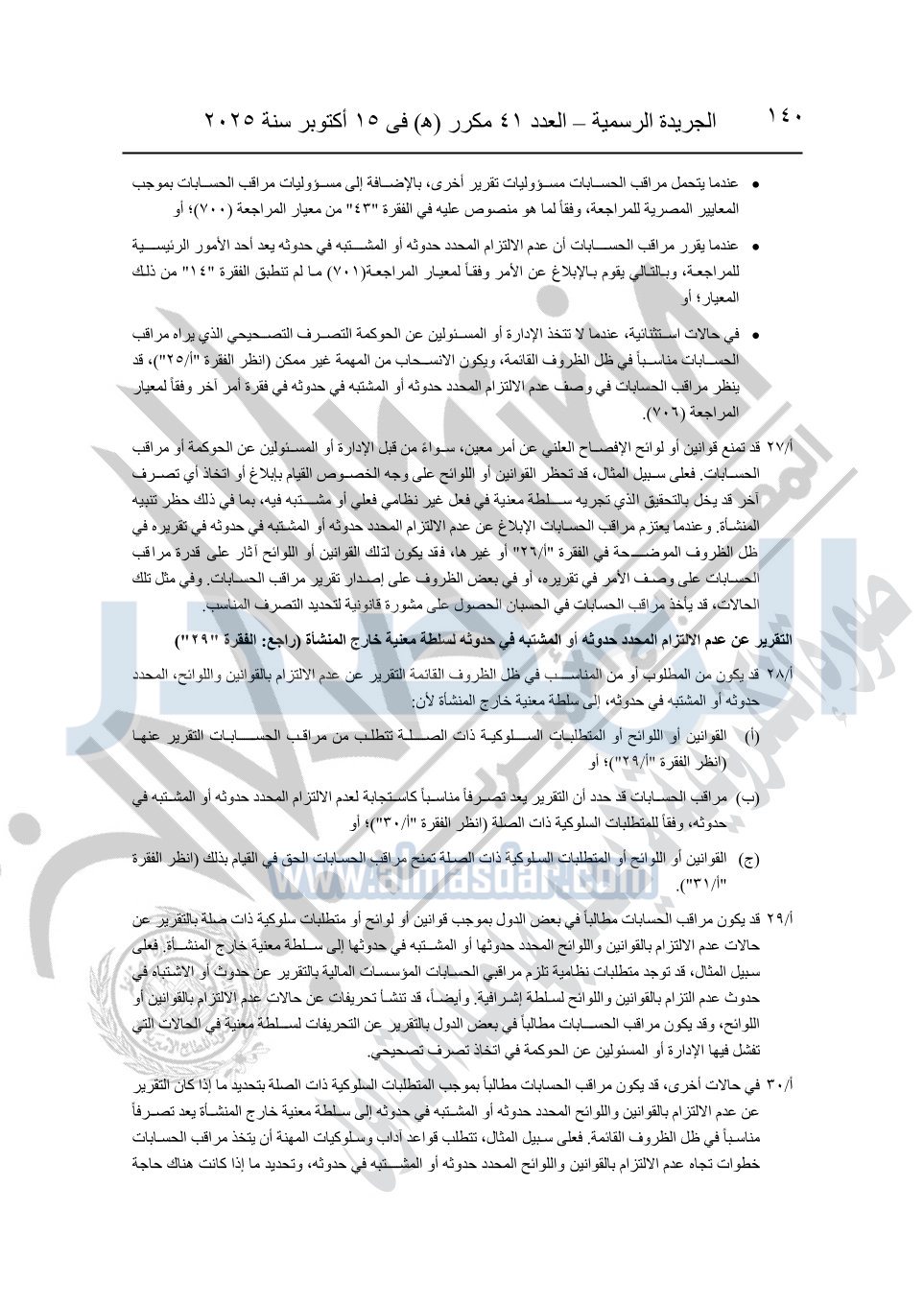 نشرت الجريدة الرسمية في العدد 41 مكرر "هـ" الصادر في 15 أكتوبر سنة 2025، قرار رئيس مجلس الوزراء رقم 3725 لسنة 2025، بشأن العمل بالمعايير المصرية للمراجعة والفحص المحدود ومهام التأكد الأخرى المرافقة لهذا القرار.