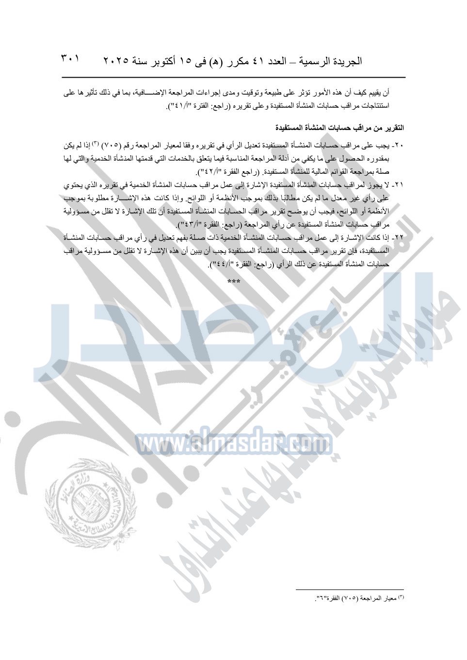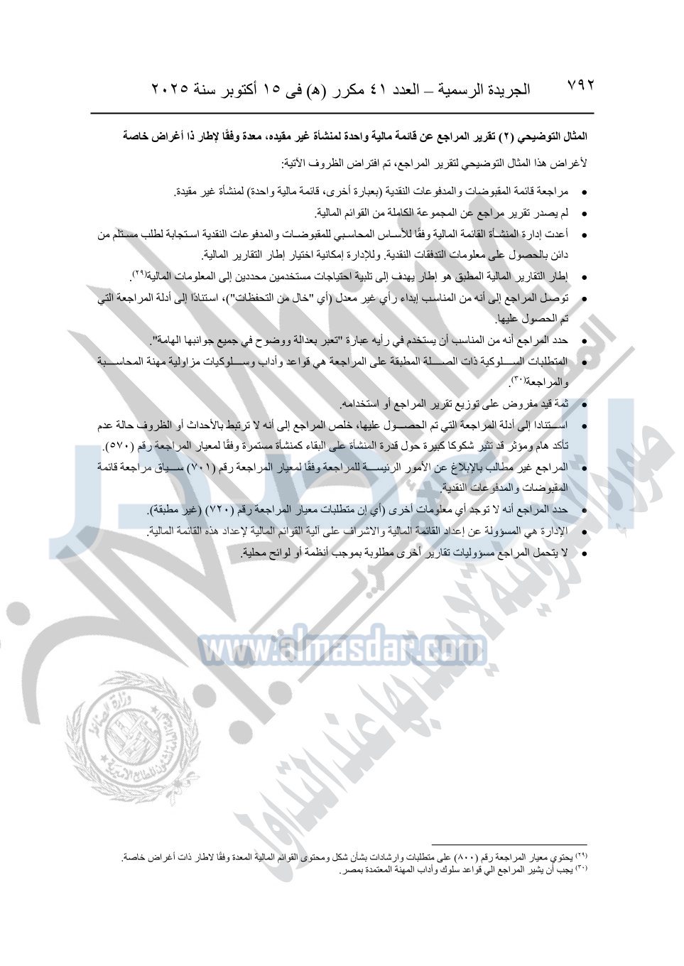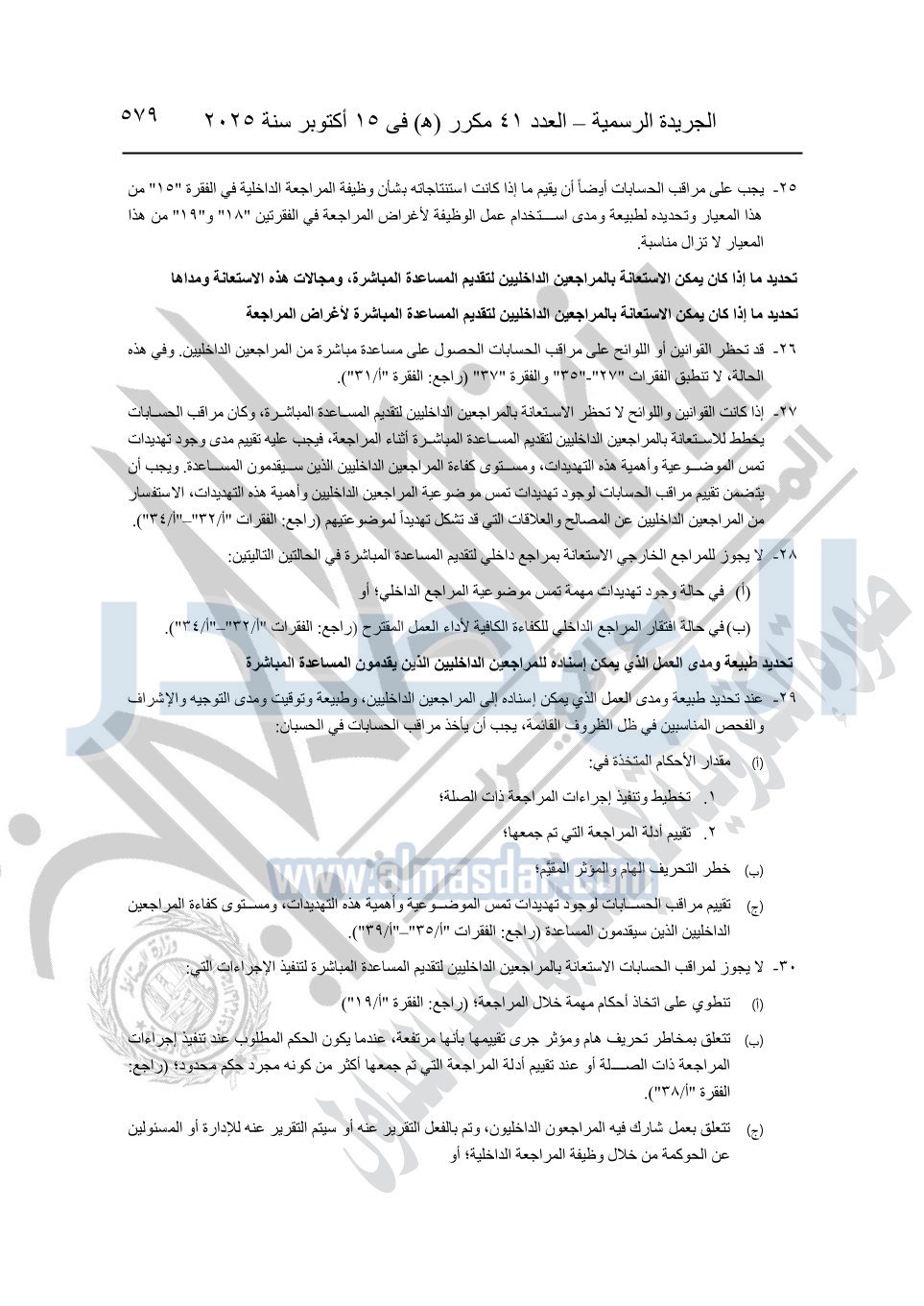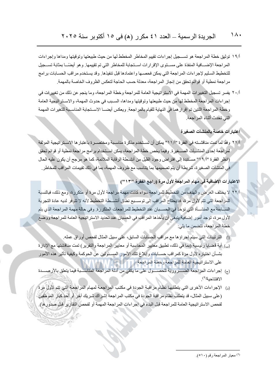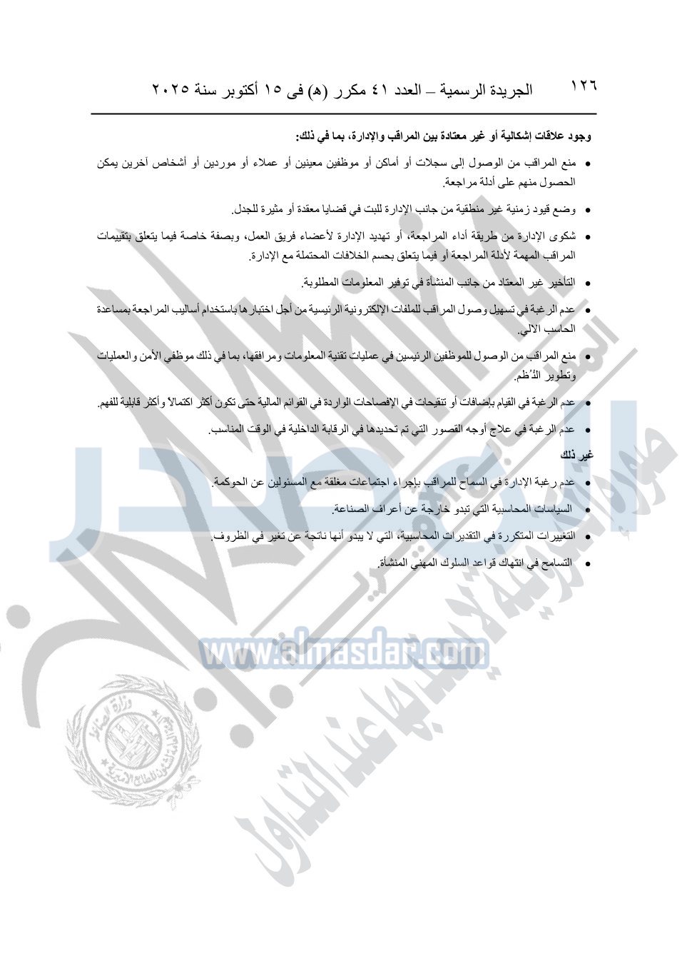 نشرت الجريدة الرسمية في العدد 41 مكرر "هـ" الصادر في 15 أكتوبر سنة 2025، قرار رئيس مجلس الوزراء رقم 3725 لسنة 2025، بشأن العمل بالمعايير المصرية للمراجعة والفحص المحدود ومهام التأكد الأخرى المرافقة لهذا القرار.