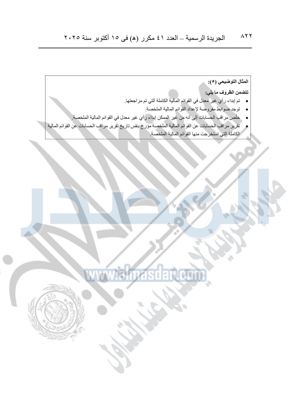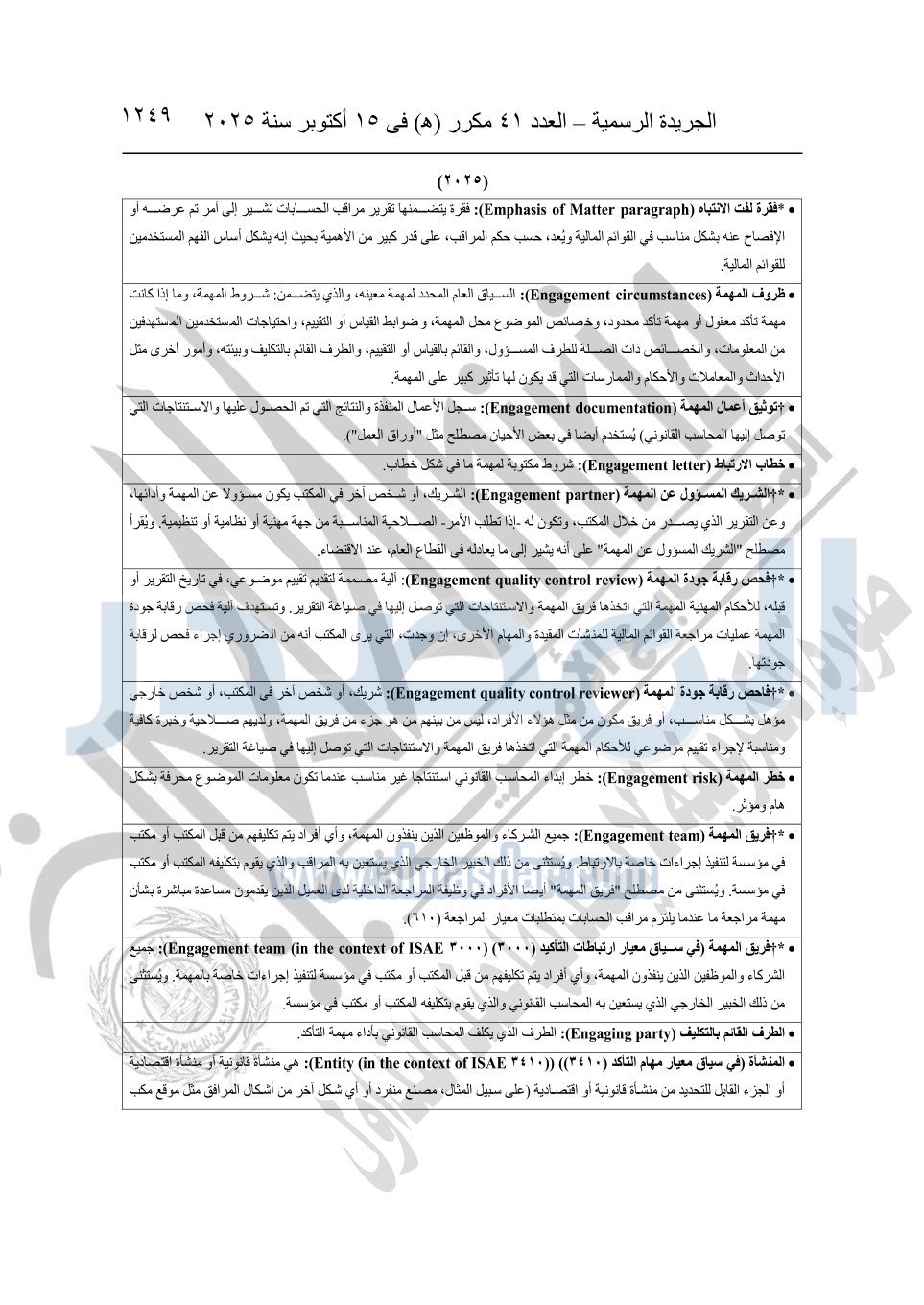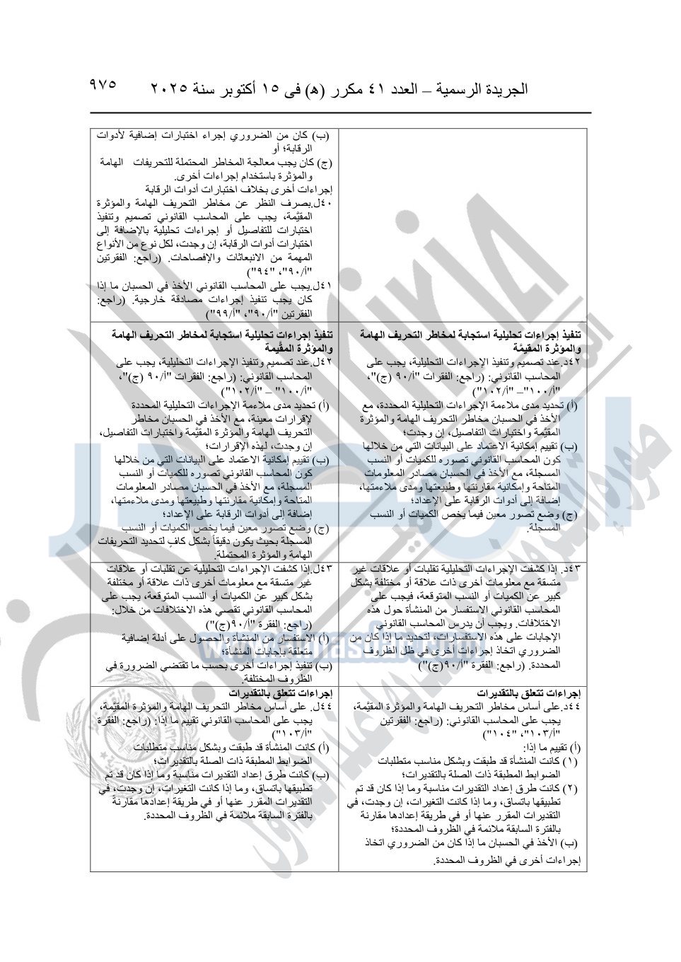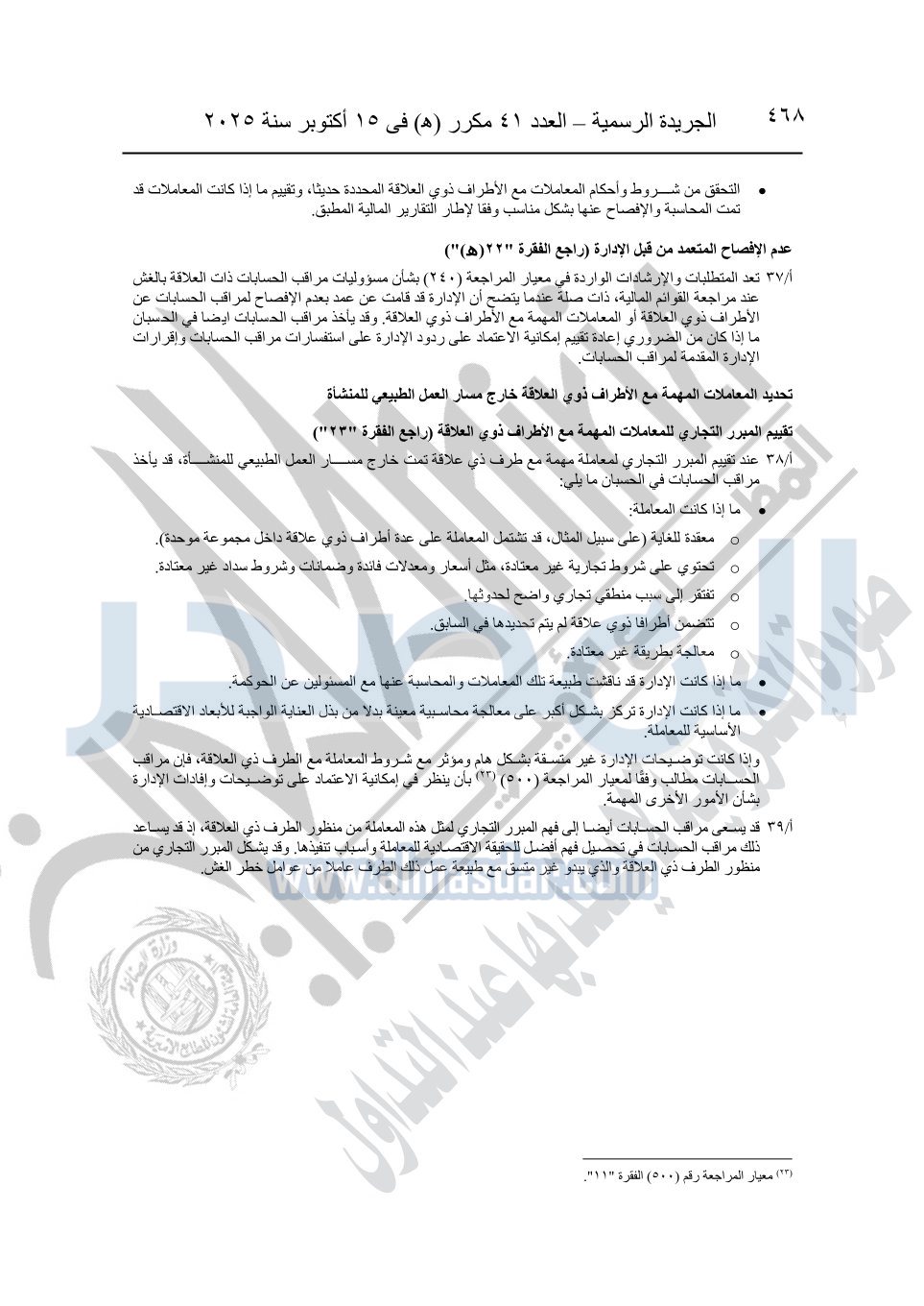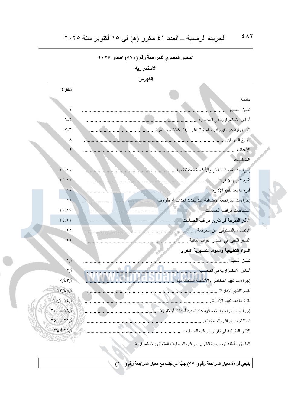 نشرت الجريدة الرسمية في العدد 41 مكرر "هـ" الصادر في 15 أكتوبر سنة 2025، قرار رئيس مجلس الوزراء رقم 3725 لسنة 2025، بشأن العمل بالمعايير المصرية للمراجعة والفحص المحدود ومهام التأكد الأخرى المرافقة لهذا القرار.