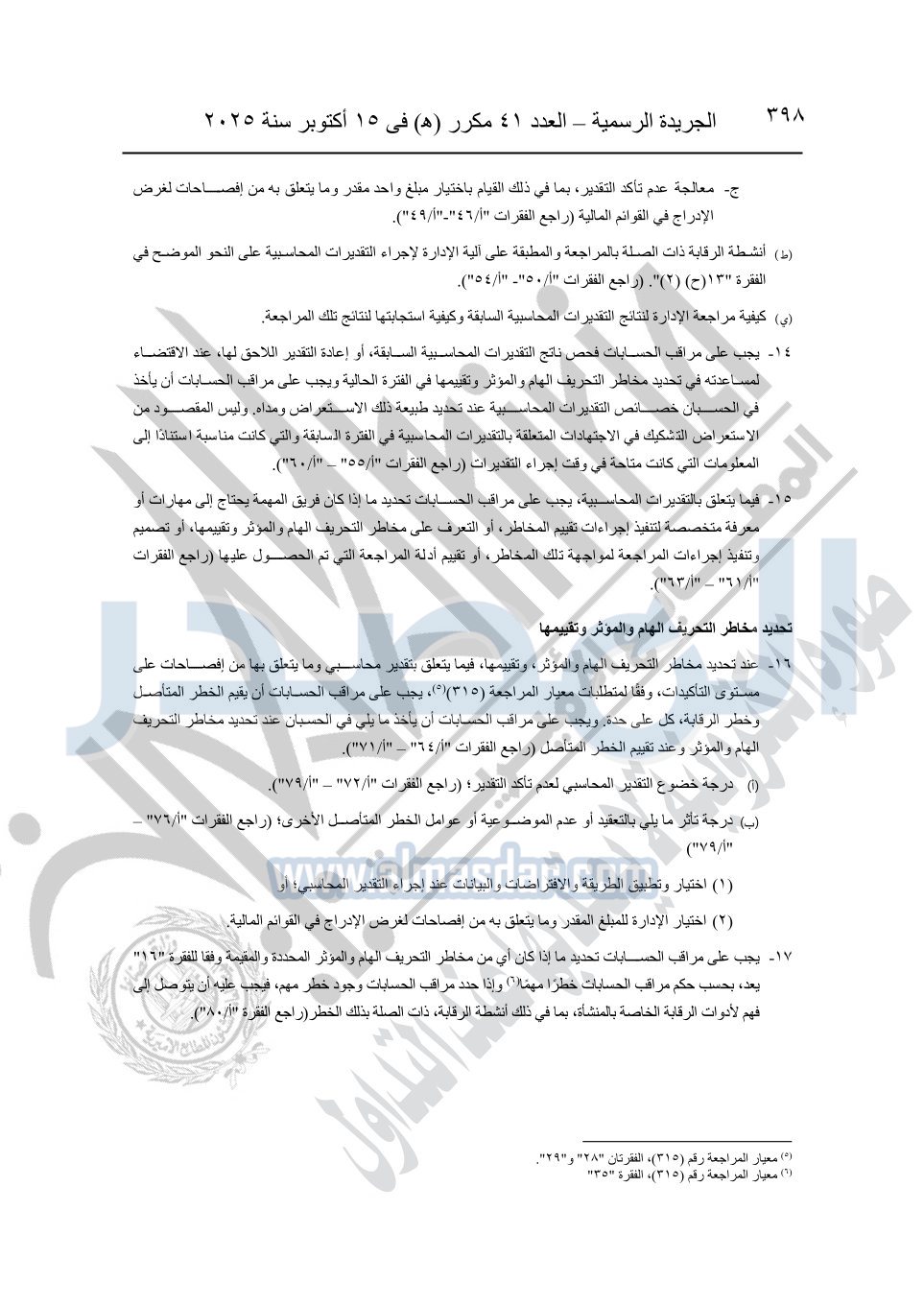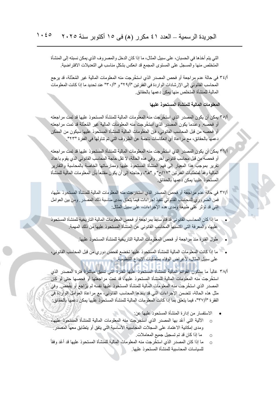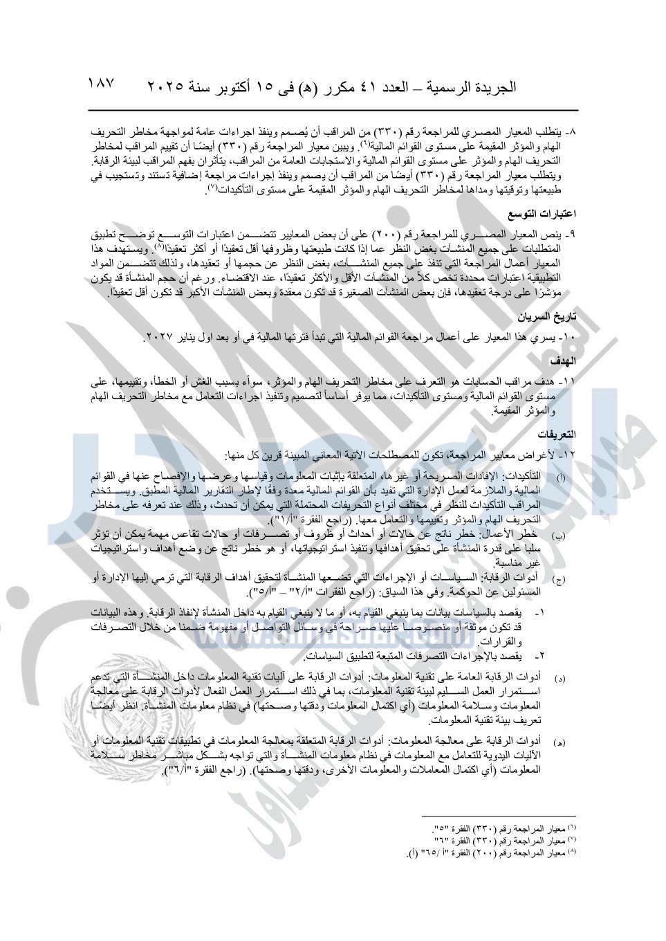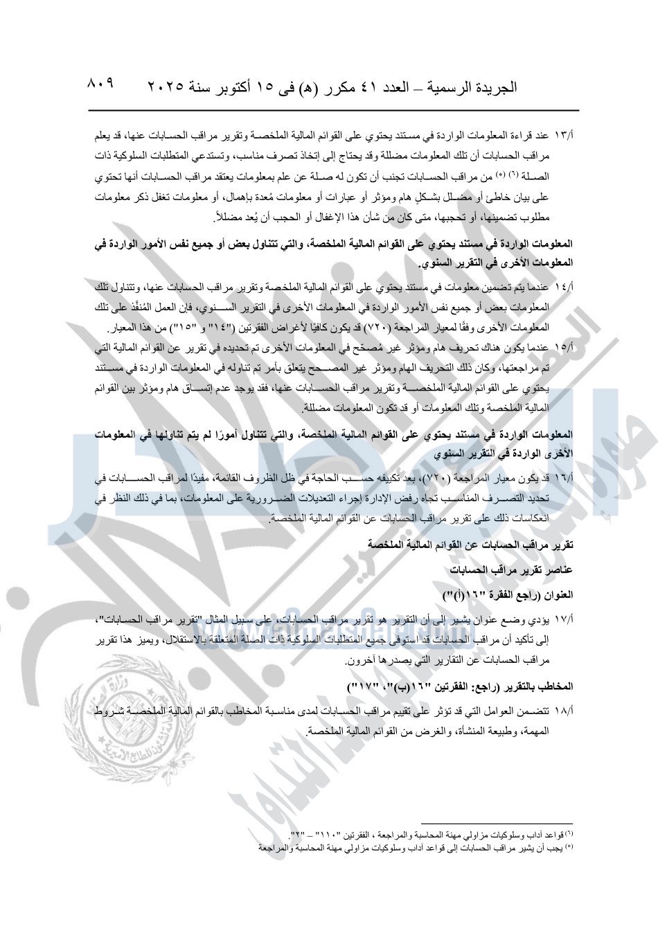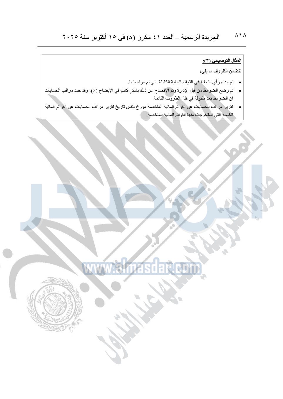 نشرت الجريدة الرسمية في العدد 41 مكرر "هـ" الصادر في 15 أكتوبر سنة 2025، قرار رئيس مجلس الوزراء رقم 3725 لسنة 2025، بشأن العمل بالمعايير المصرية للمراجعة والفحص المحدود ومهام التأكد الأخرى المرافقة لهذا القرار.