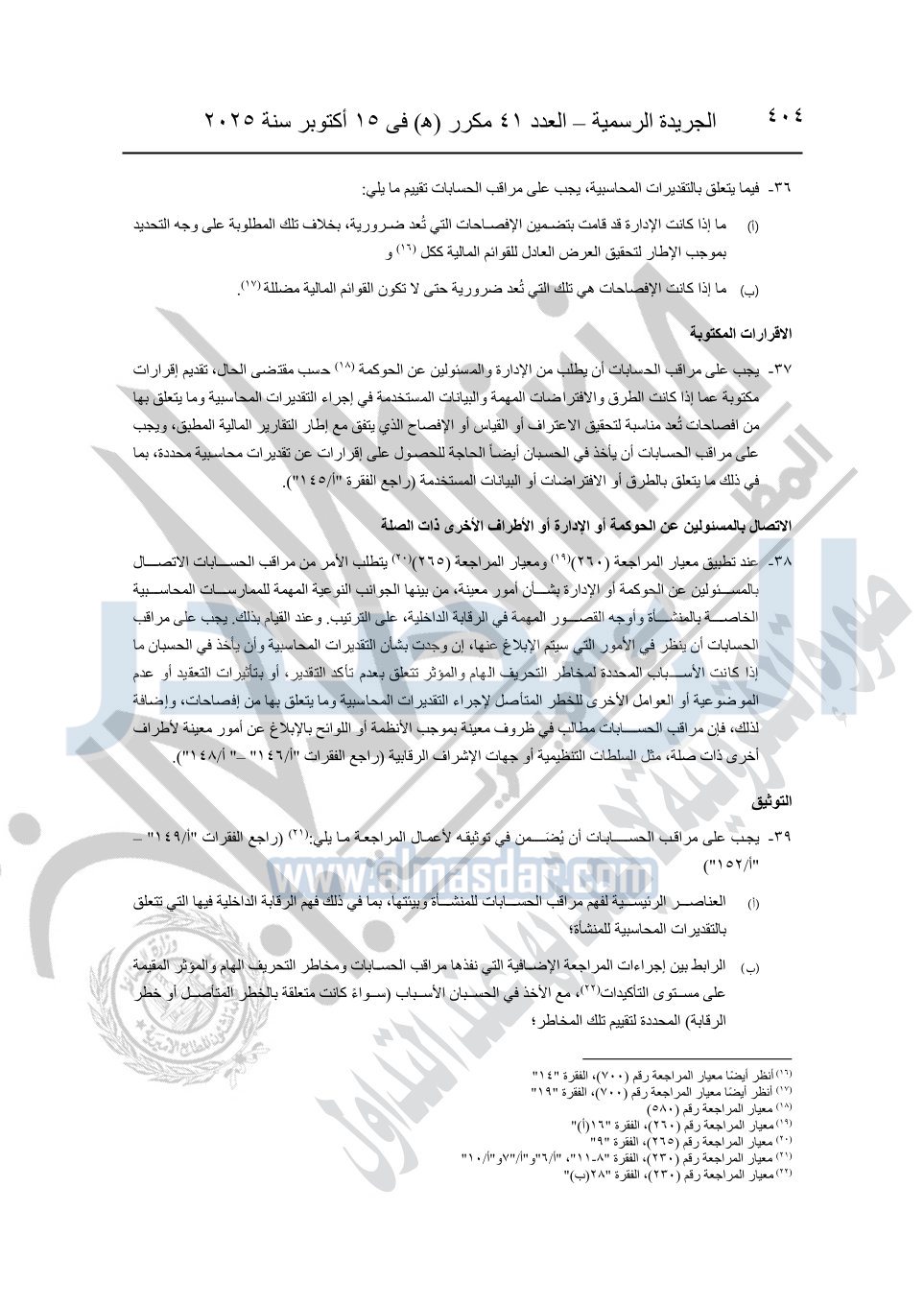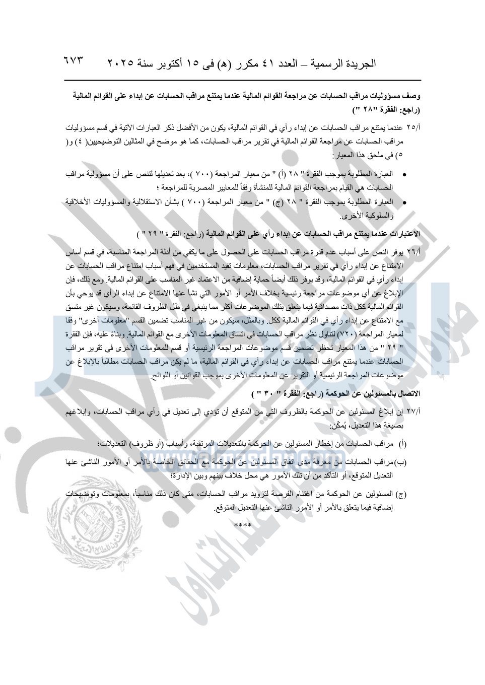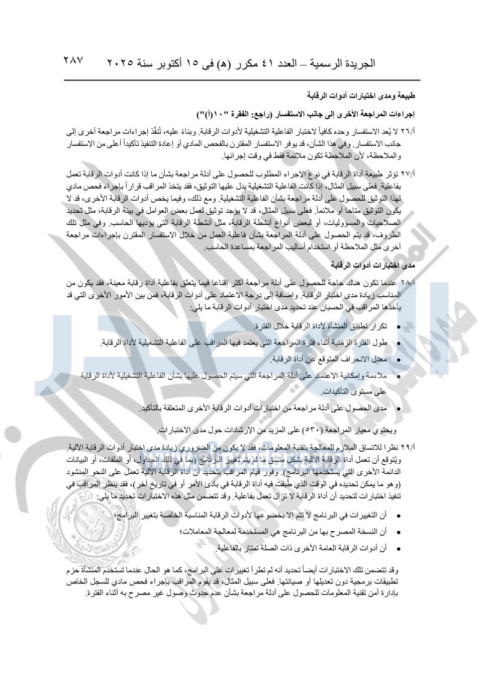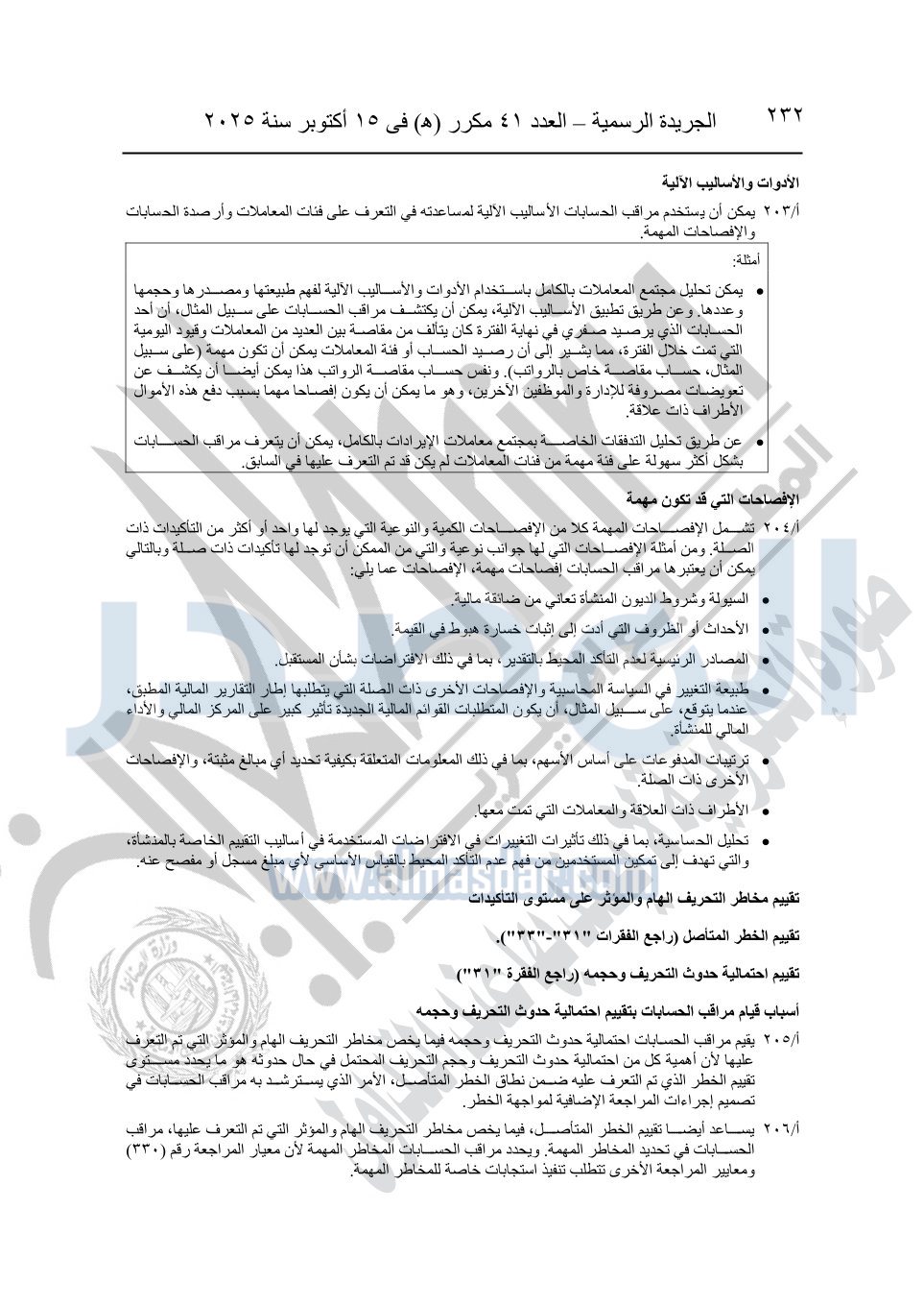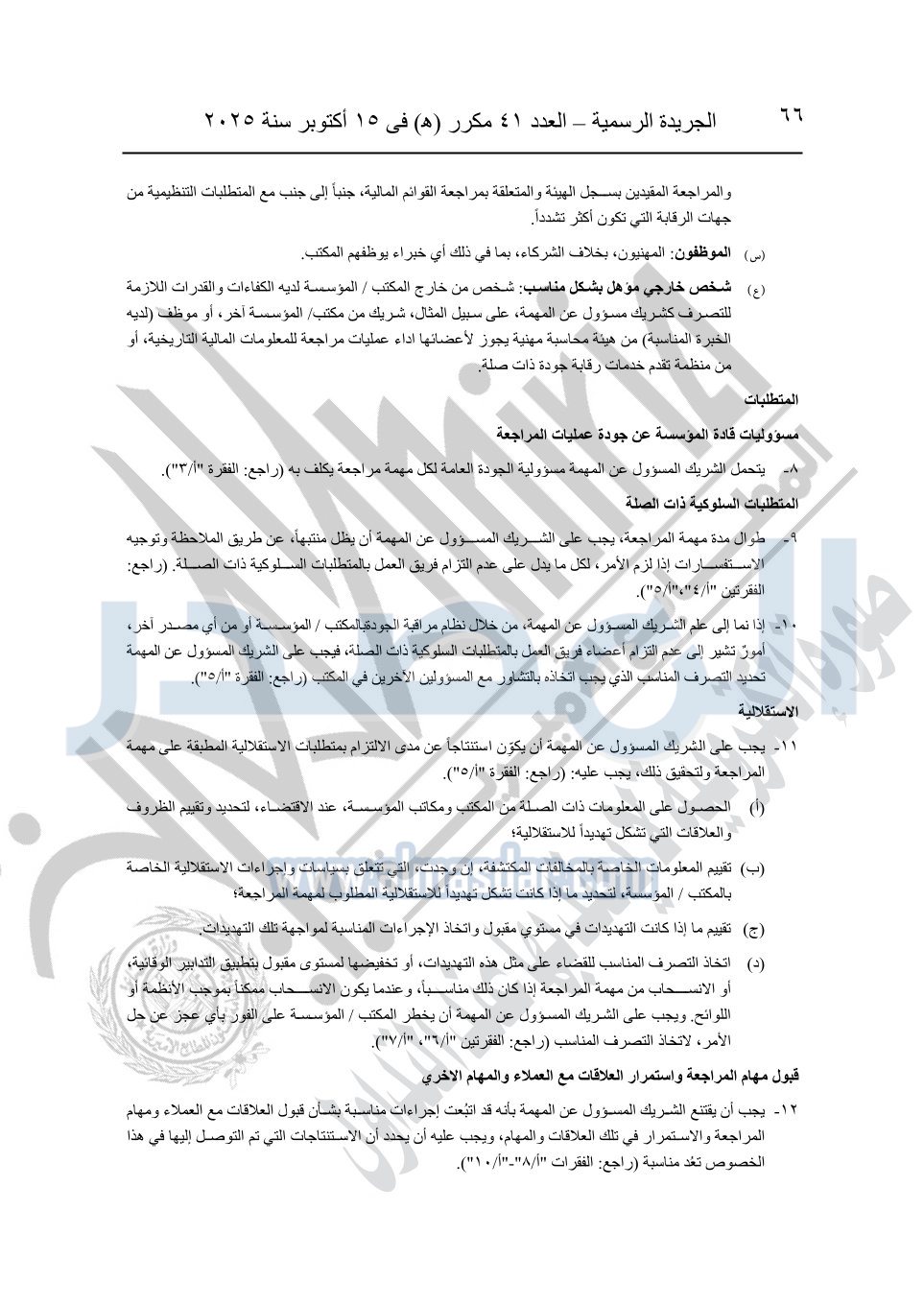 نشرت الجريدة الرسمية في العدد 41 مكرر "هـ" الصادر في 15 أكتوبر سنة 2025، قرار رئيس مجلس الوزراء رقم 3725 لسنة 2025، بشأن العمل بالمعايير المصرية للمراجعة والفحص المحدود ومهام التأكد الأخرى المرافقة لهذا القرار.
