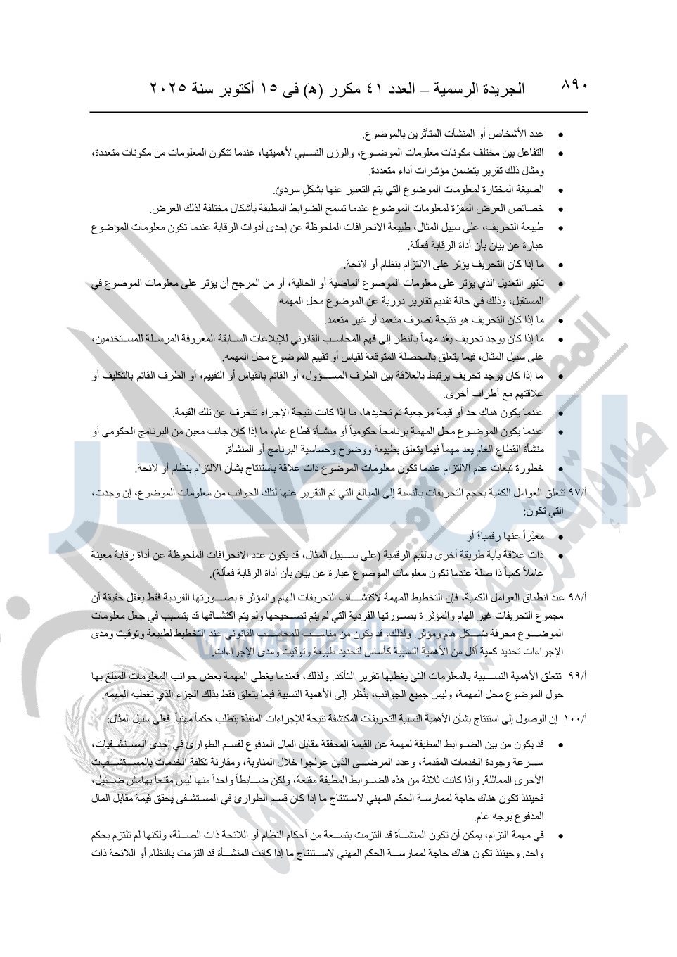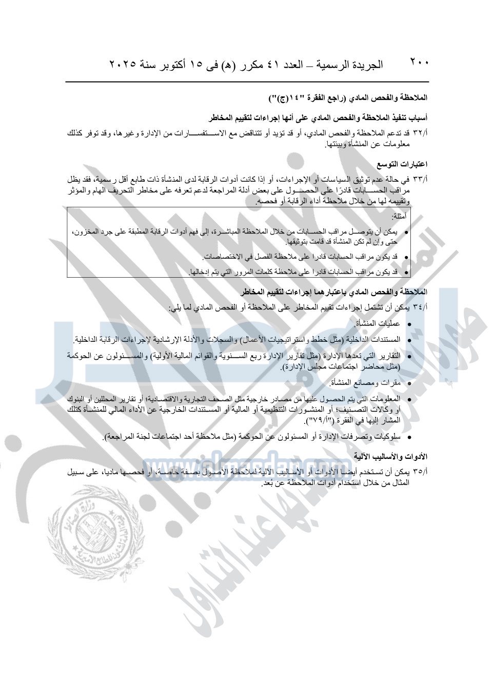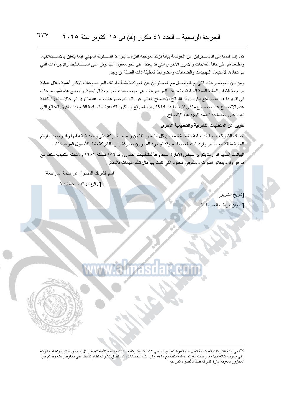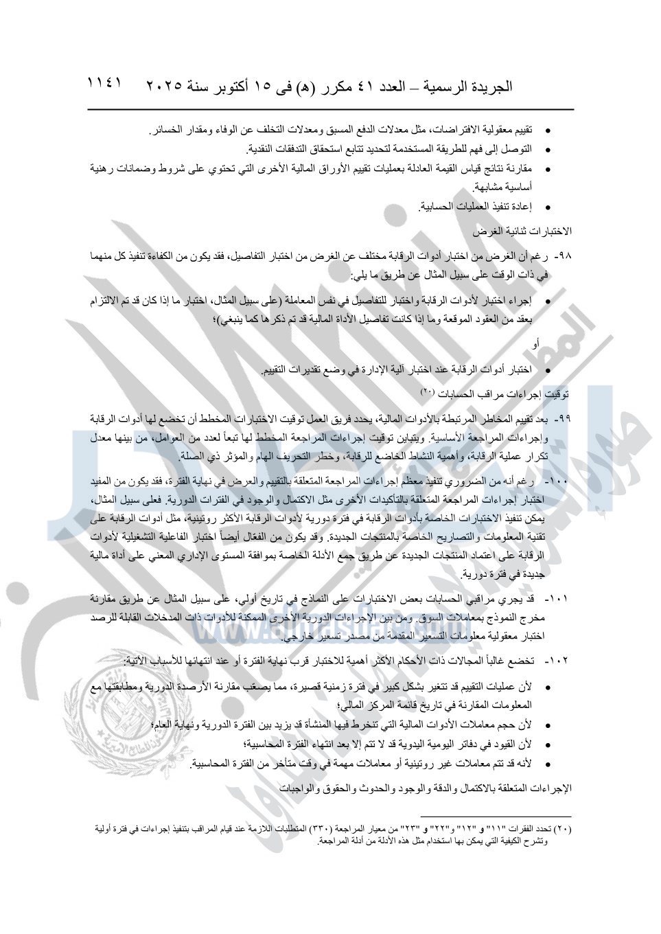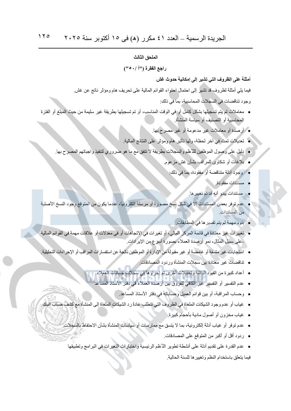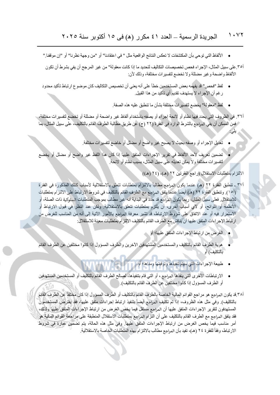 نشرت الجريدة الرسمية في العدد 41 مكرر "هـ" الصادر في 15 أكتوبر سنة 2025، قرار رئيس مجلس الوزراء رقم 3725 لسنة 2025، بشأن العمل بالمعايير المصرية للمراجعة والفحص المحدود ومهام التأكد الأخرى المرافقة لهذا القرار.