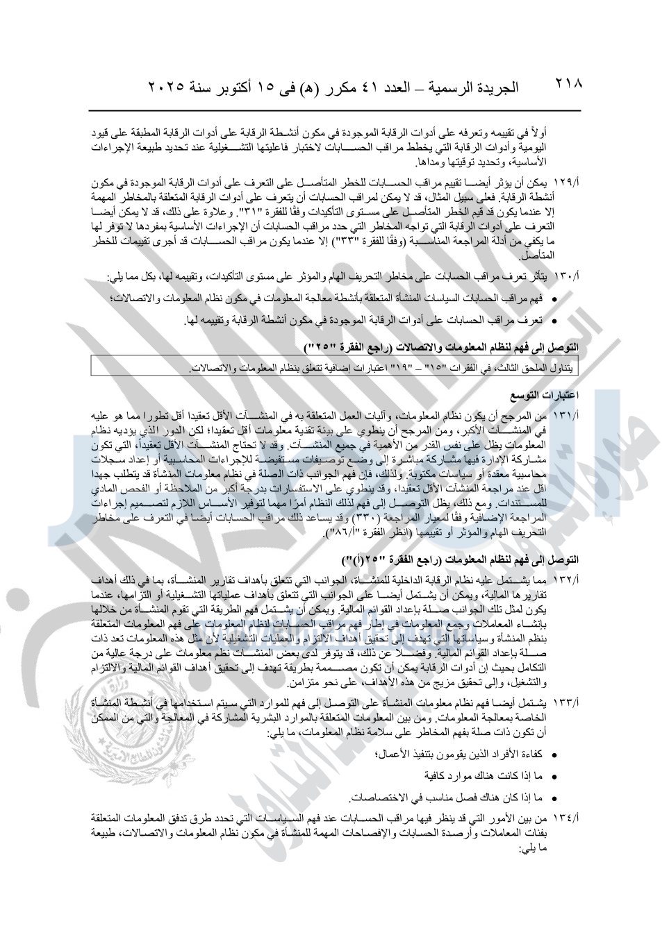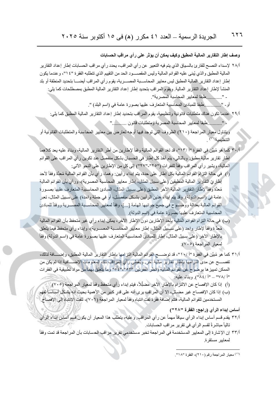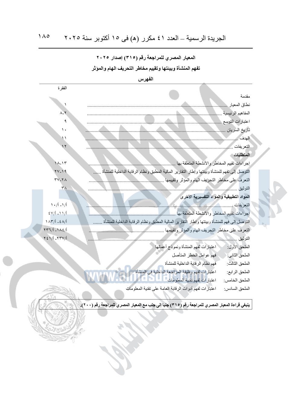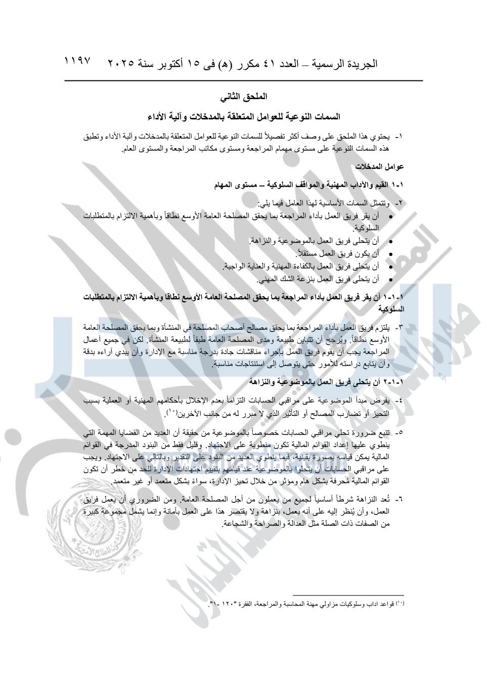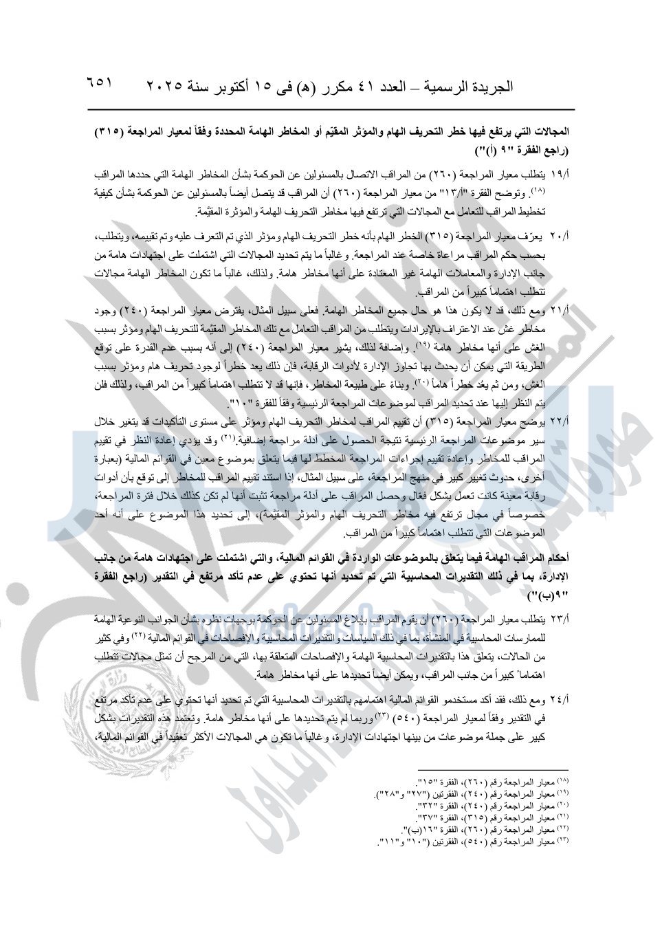 نشرت الجريدة الرسمية في العدد 41 مكرر "هـ" الصادر في 15 أكتوبر سنة 2025، قرار رئيس مجلس الوزراء رقم 3725 لسنة 2025، بشأن العمل بالمعايير المصرية للمراجعة والفحص المحدود ومهام التأكد الأخرى المرافقة لهذا القرار.