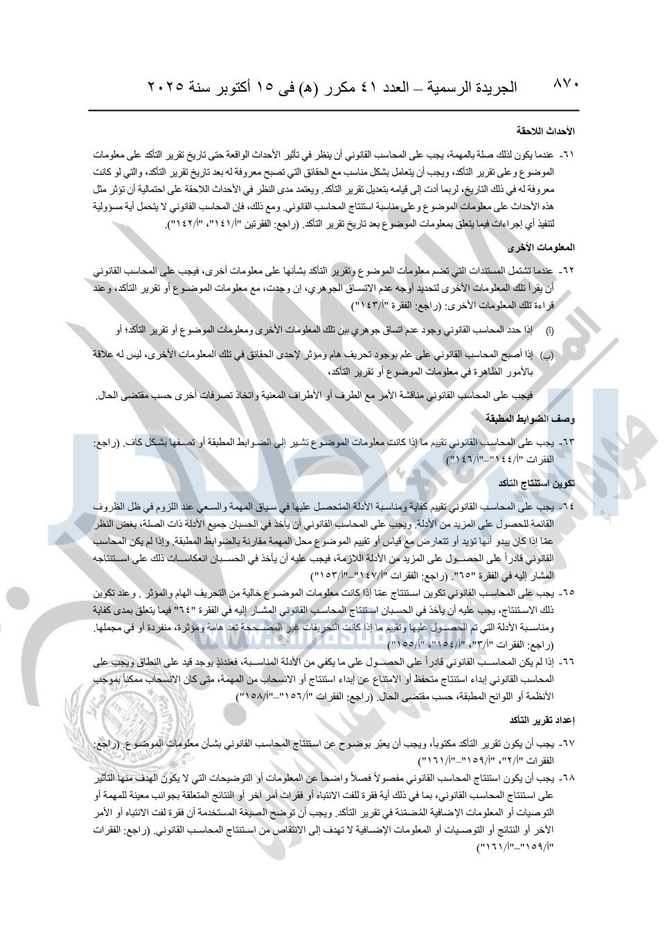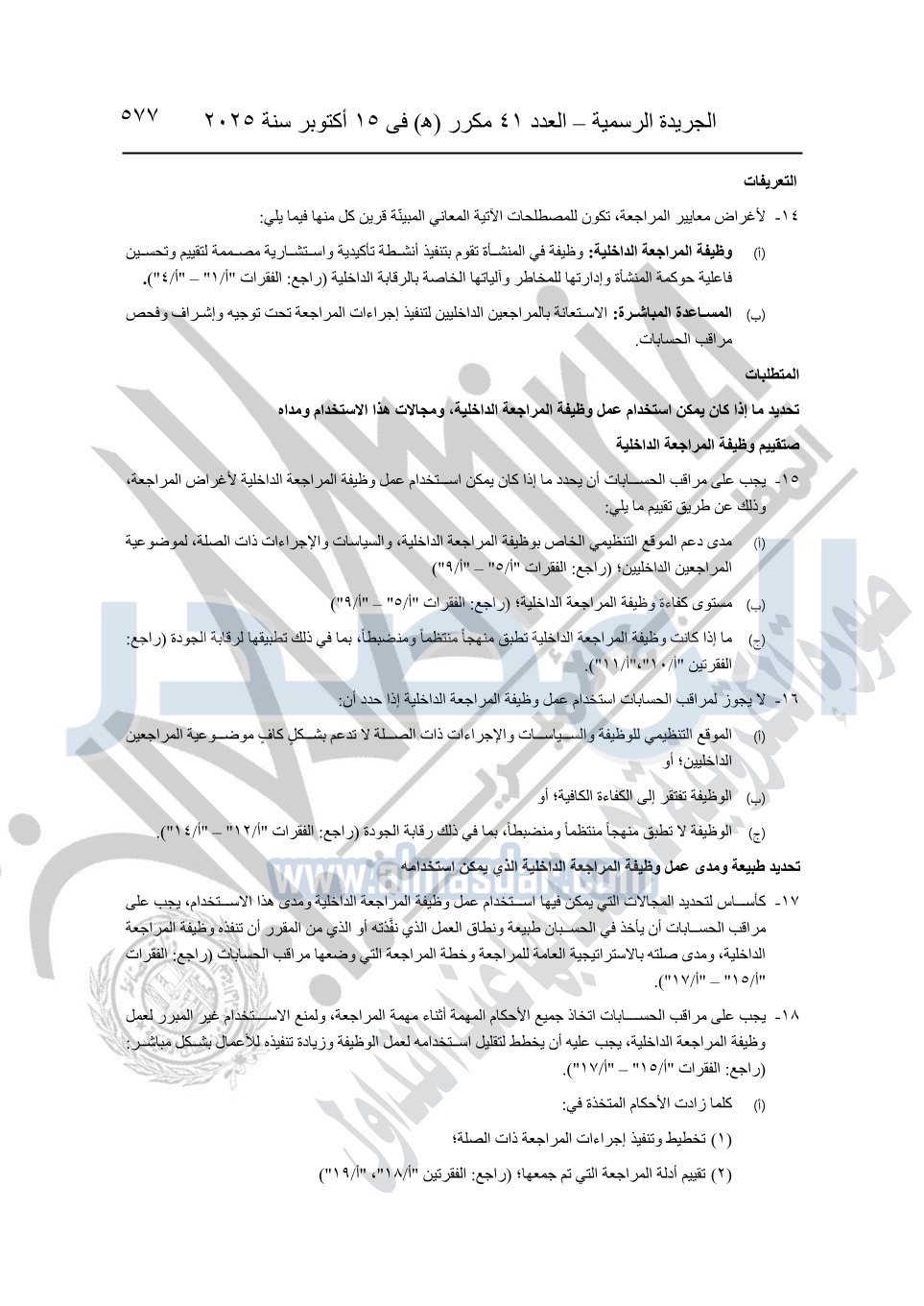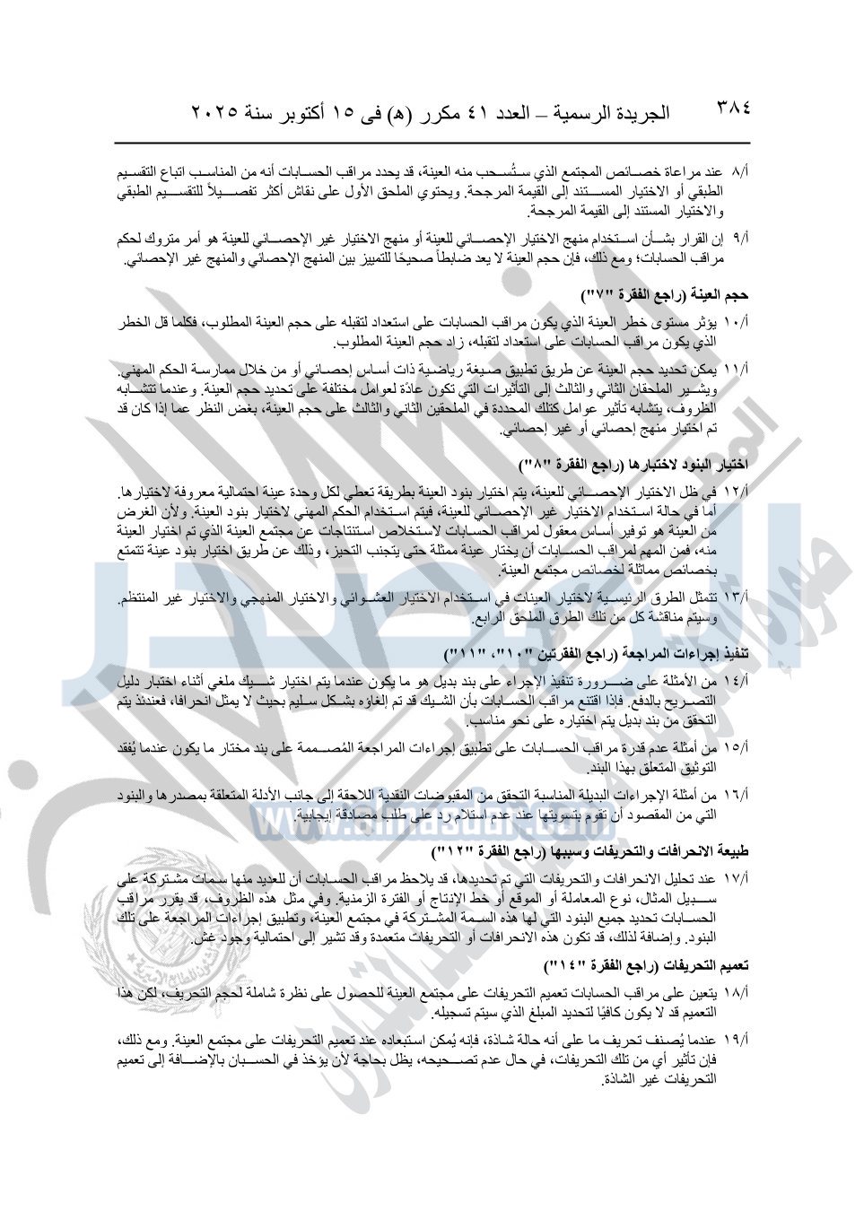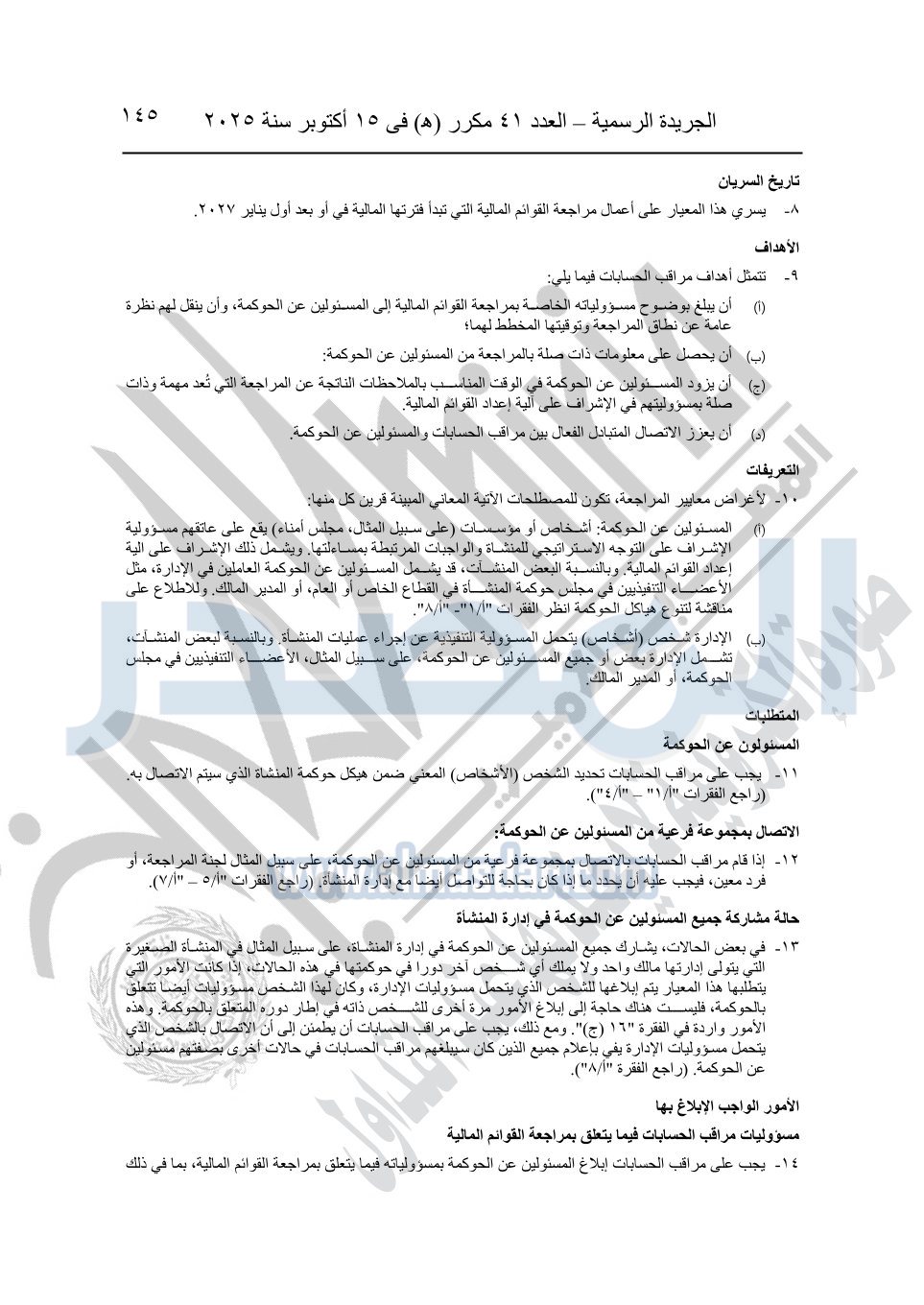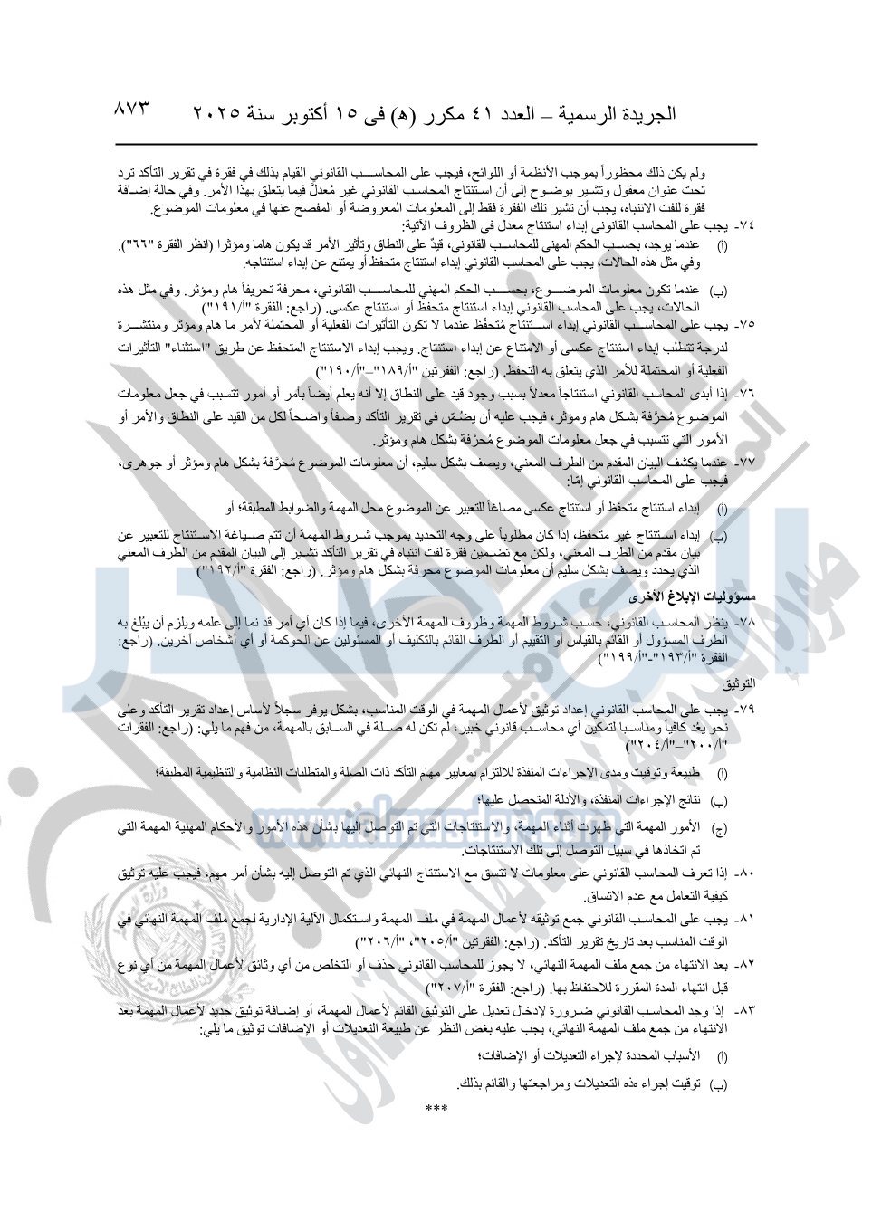 نشرت الجريدة الرسمية في العدد 41 مكرر "هـ" الصادر في 15 أكتوبر سنة 2025، قرار رئيس مجلس الوزراء رقم 3725 لسنة 2025، بشأن العمل بالمعايير المصرية للمراجعة والفحص المحدود ومهام التأكد الأخرى المرافقة لهذا القرار.