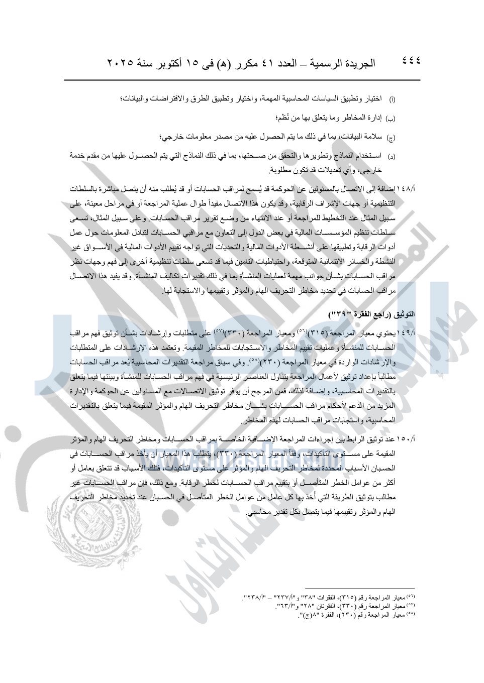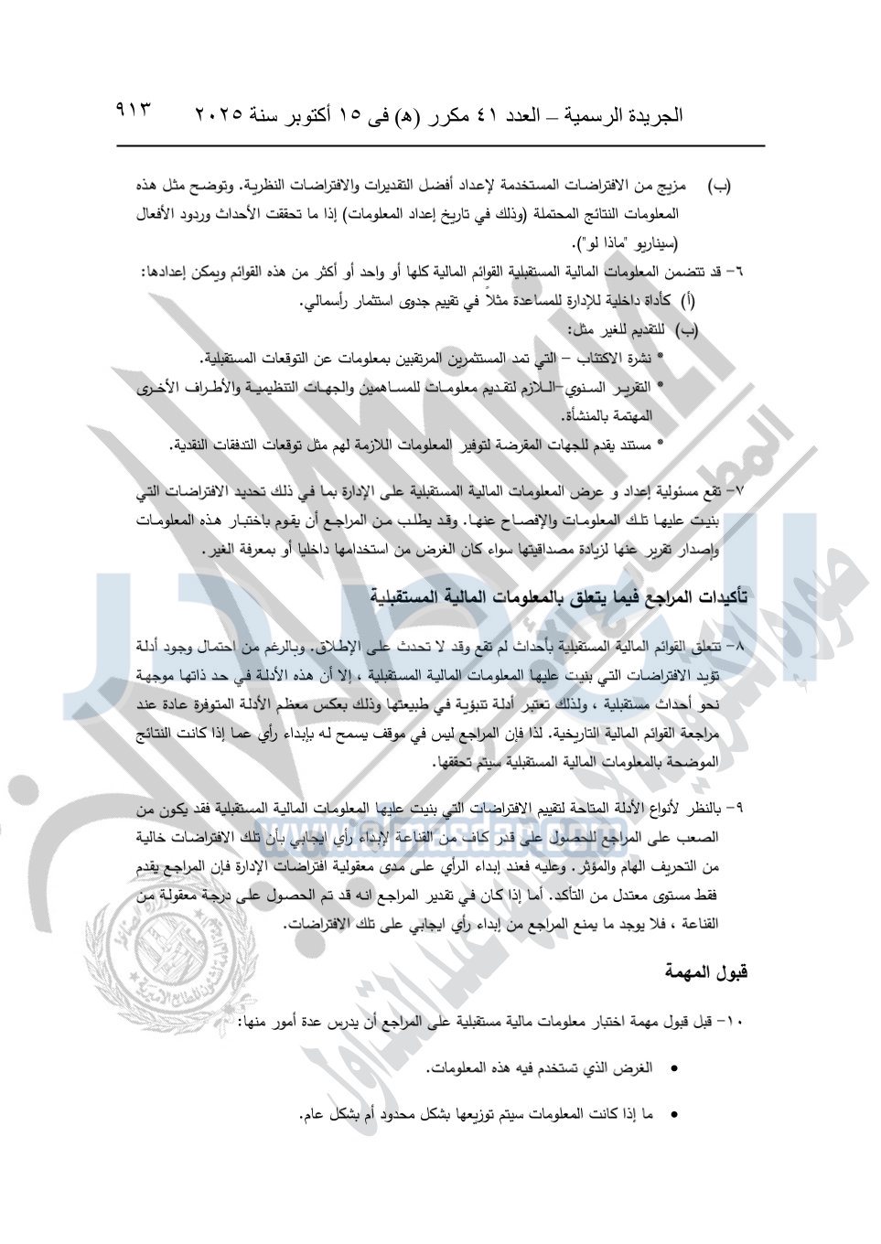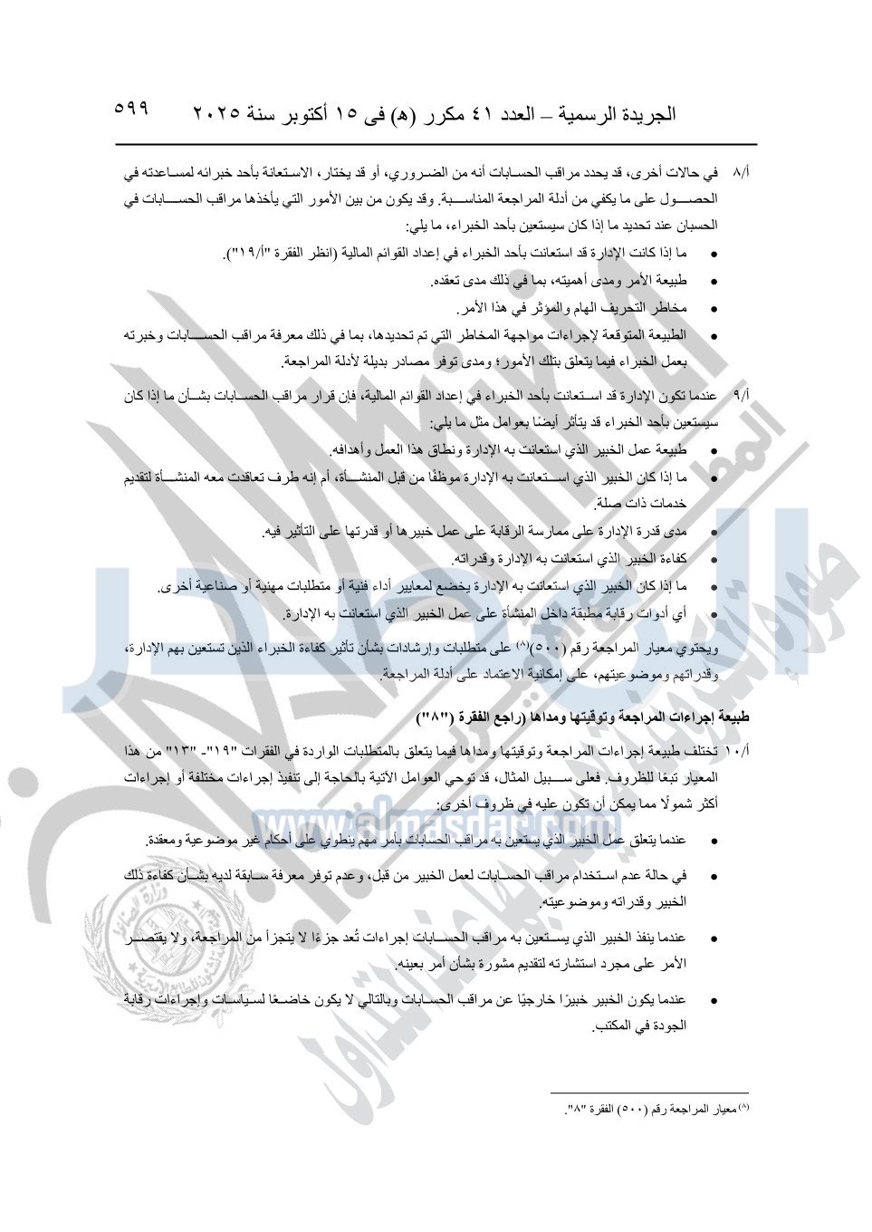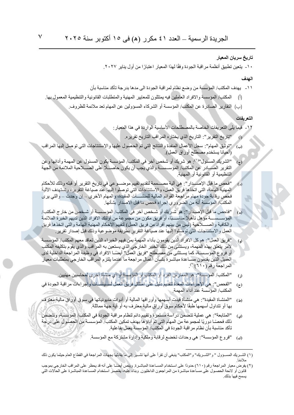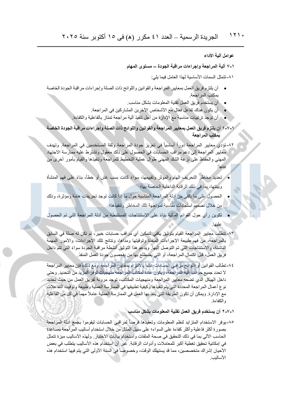 نشرت الجريدة الرسمية في العدد 41 مكرر "هـ" الصادر في 15 أكتوبر سنة 2025، قرار رئيس مجلس الوزراء رقم 3725 لسنة 2025، بشأن العمل بالمعايير المصرية للمراجعة والفحص المحدود ومهام التأكد الأخرى المرافقة لهذا القرار.