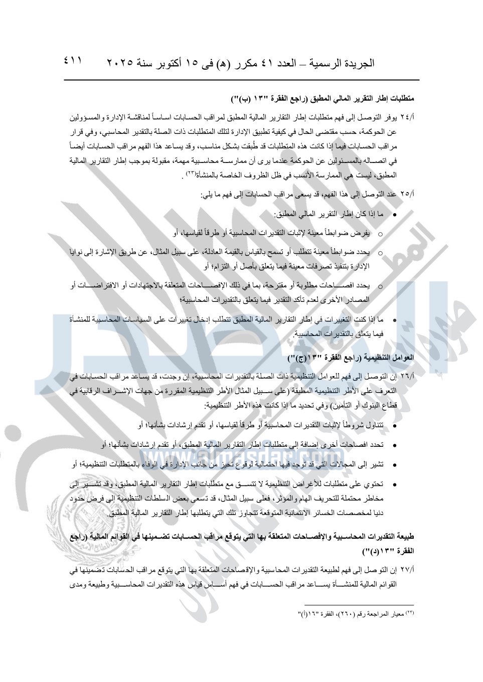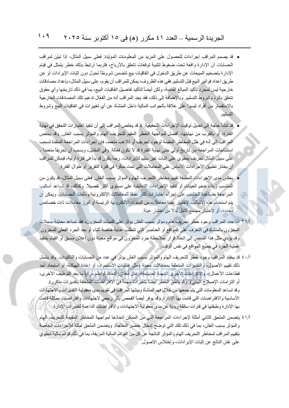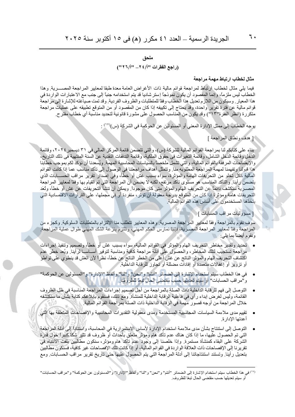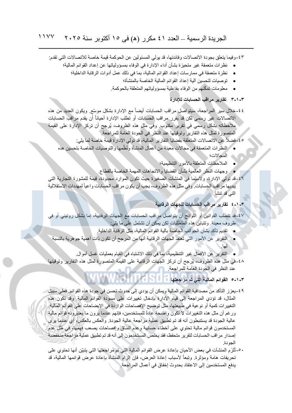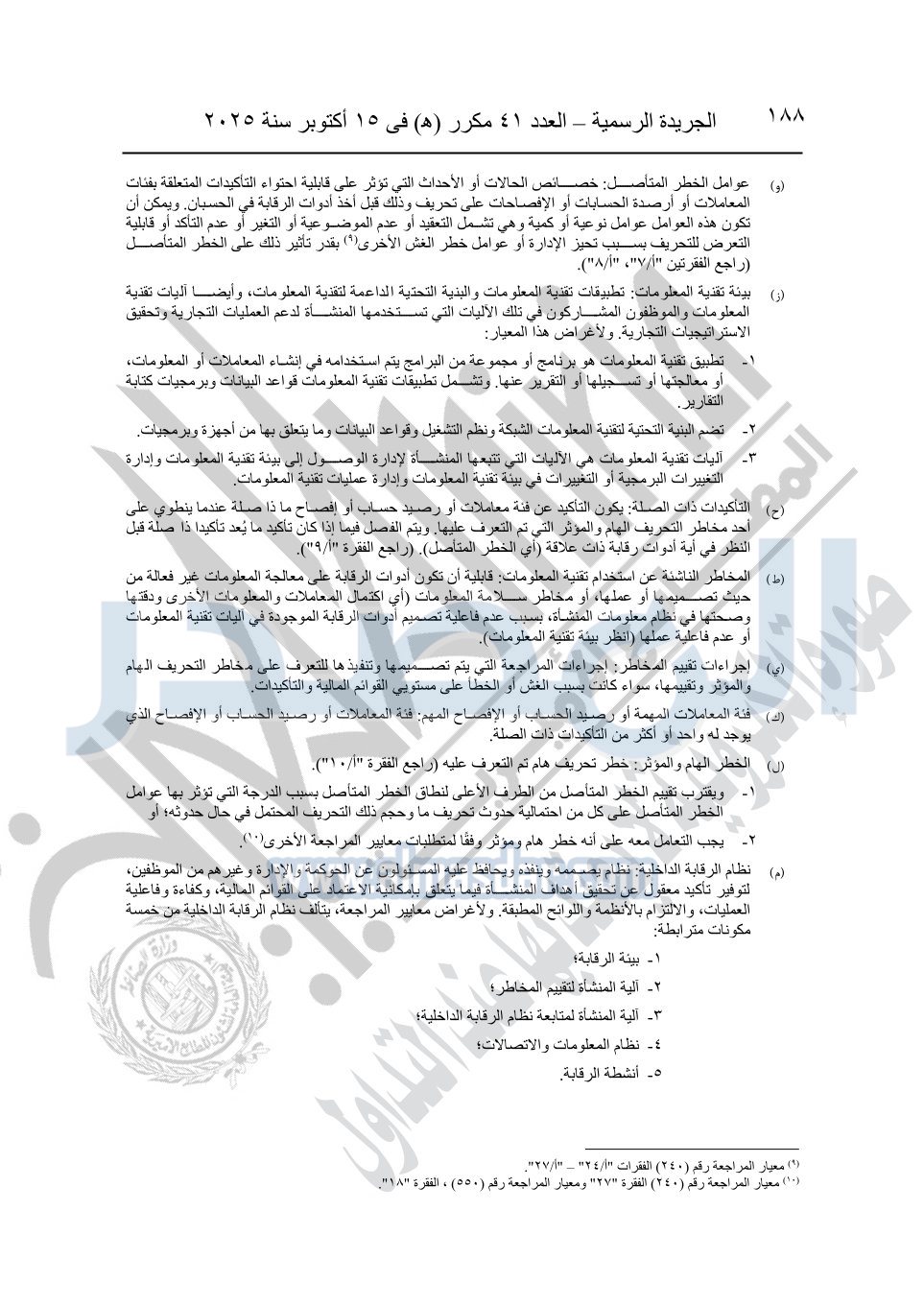 نشرت الجريدة الرسمية في العدد 41 مكرر "هـ" الصادر في 15 أكتوبر سنة 2025، قرار رئيس مجلس الوزراء رقم 3725 لسنة 2025، بشأن العمل بالمعايير المصرية للمراجعة والفحص المحدود ومهام التأكد الأخرى المرافقة لهذا القرار.