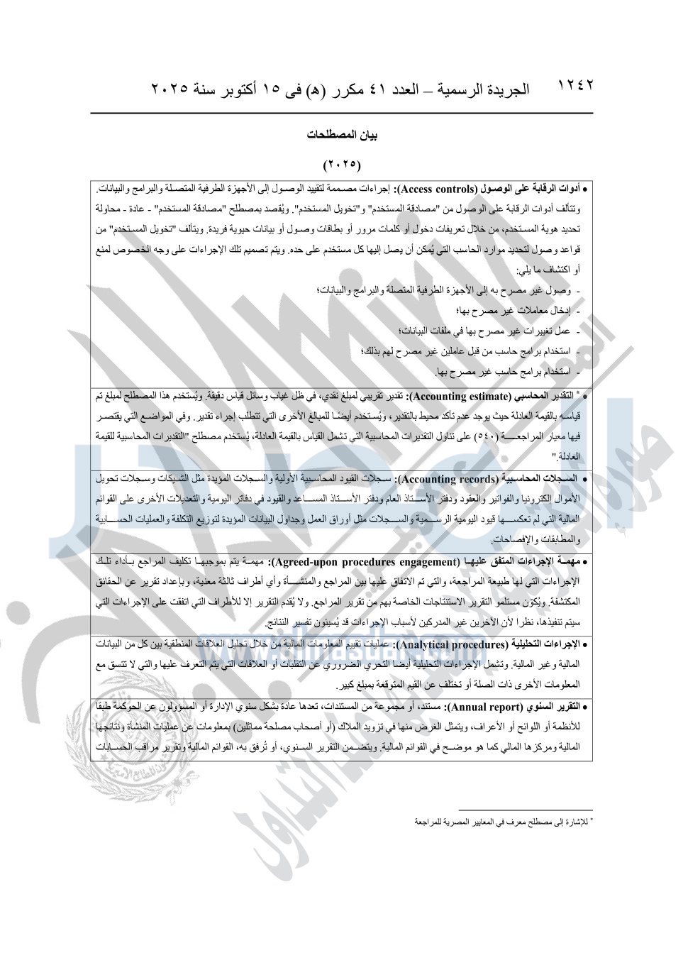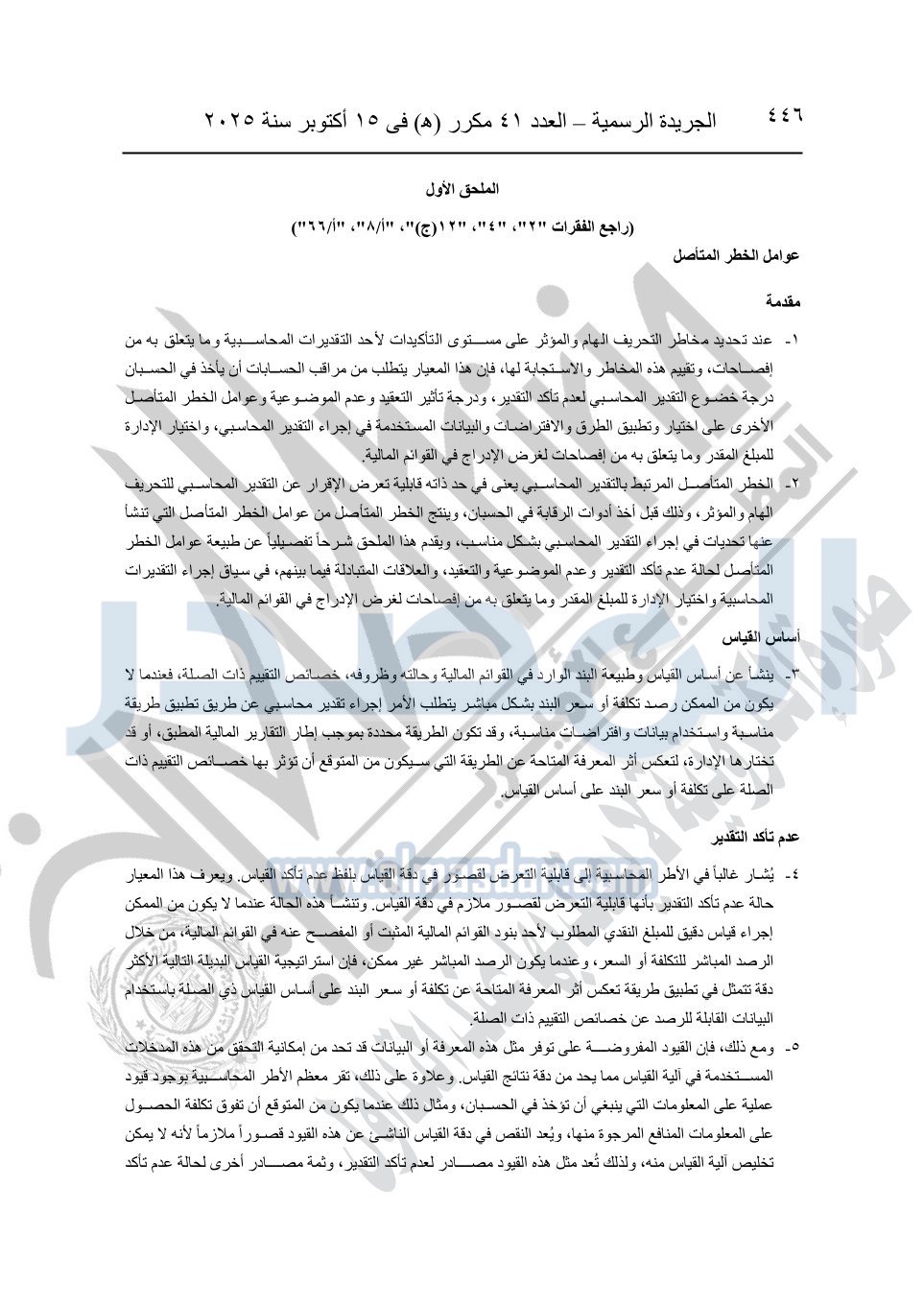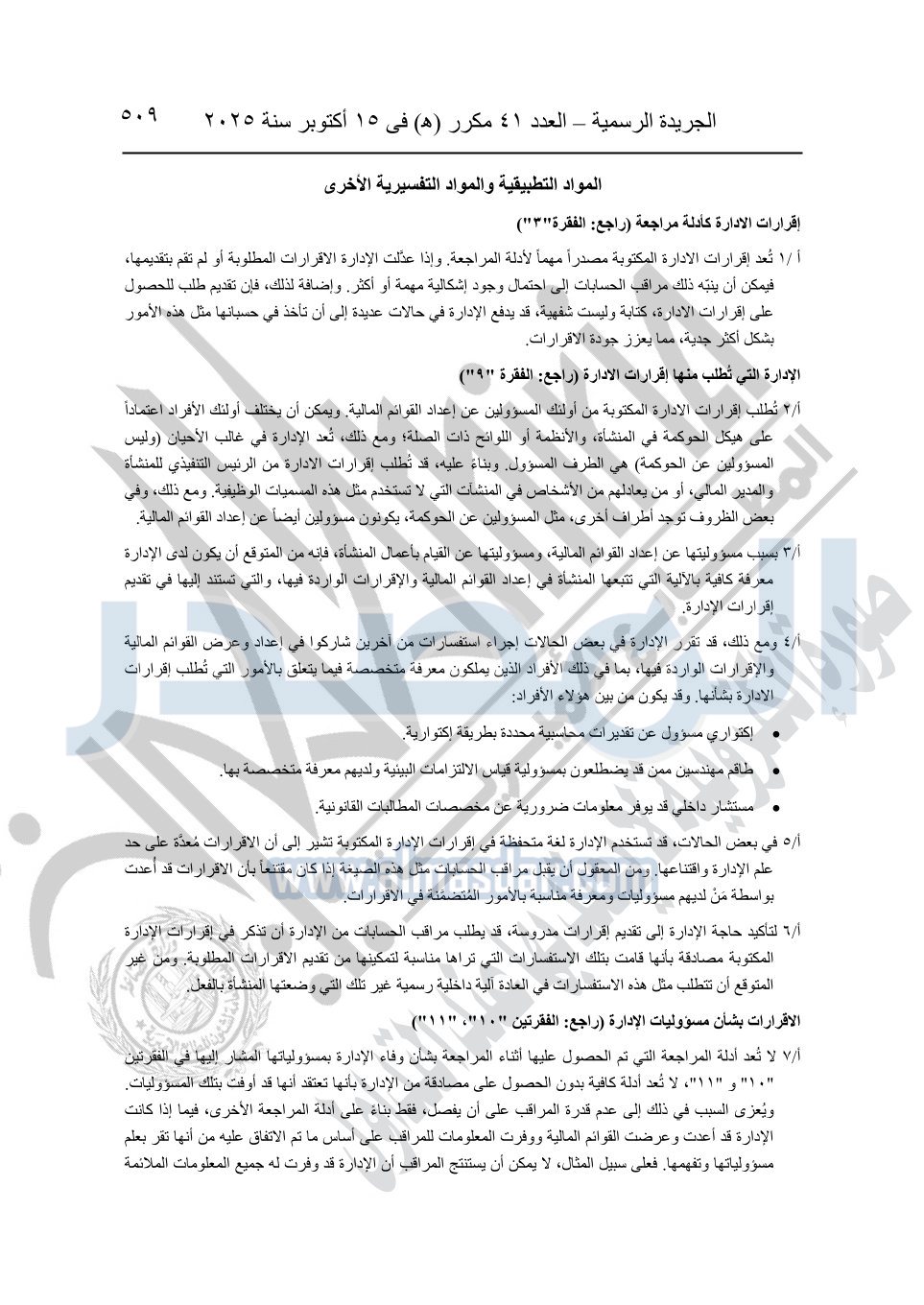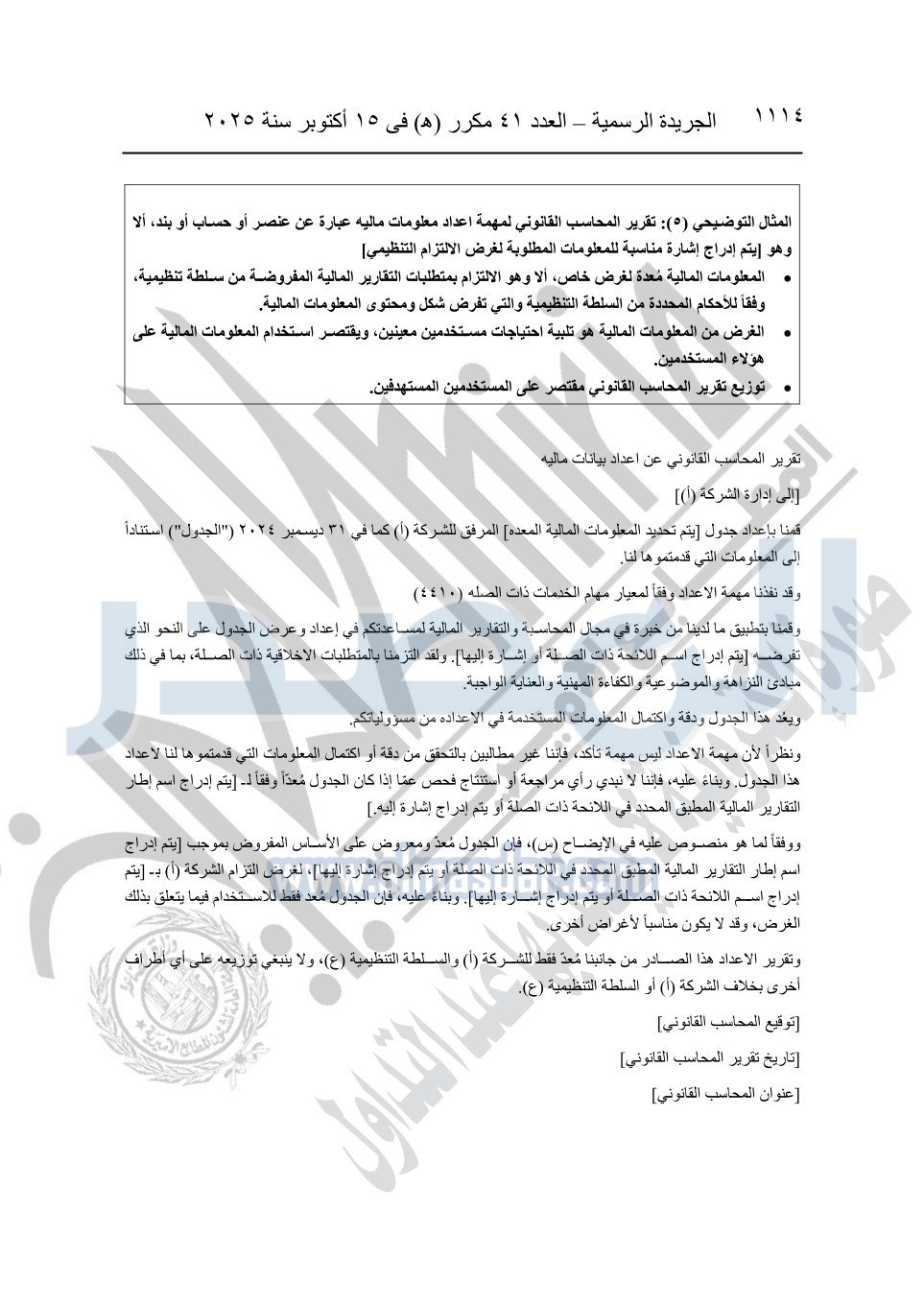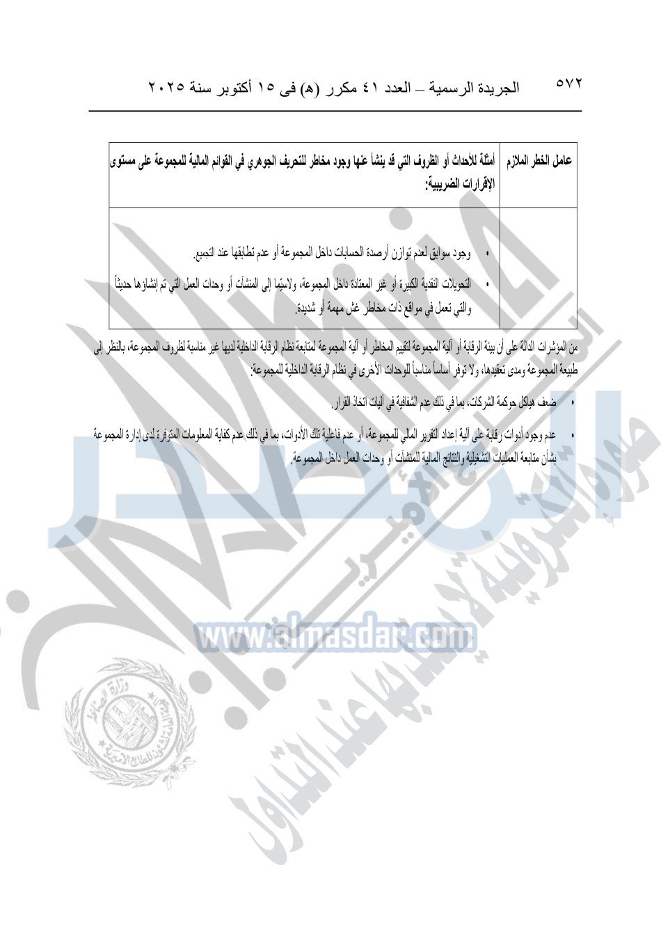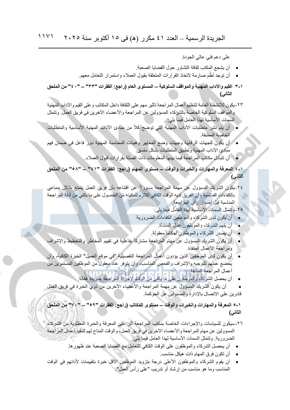 نشرت الجريدة الرسمية في العدد 41 مكرر "هـ" الصادر في 15 أكتوبر سنة 2025، قرار رئيس مجلس الوزراء رقم 3725 لسنة 2025، بشأن العمل بالمعايير المصرية للمراجعة والفحص المحدود ومهام التأكد الأخرى المرافقة لهذا القرار.