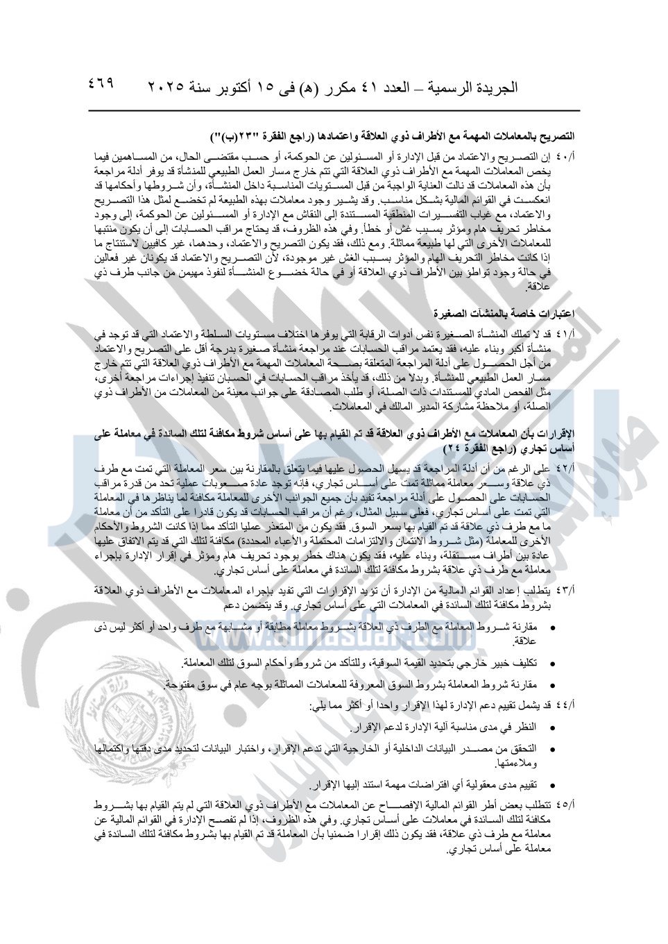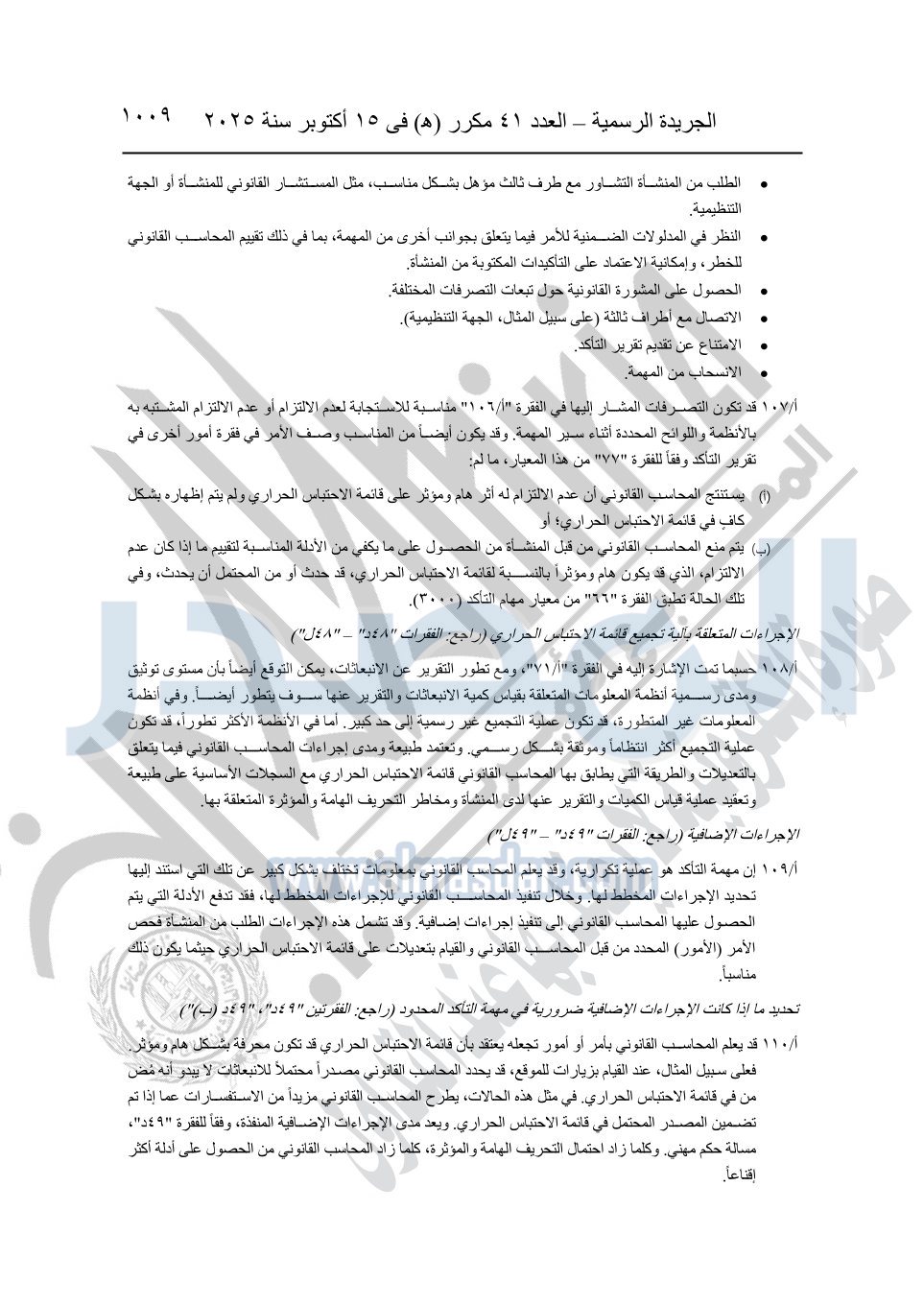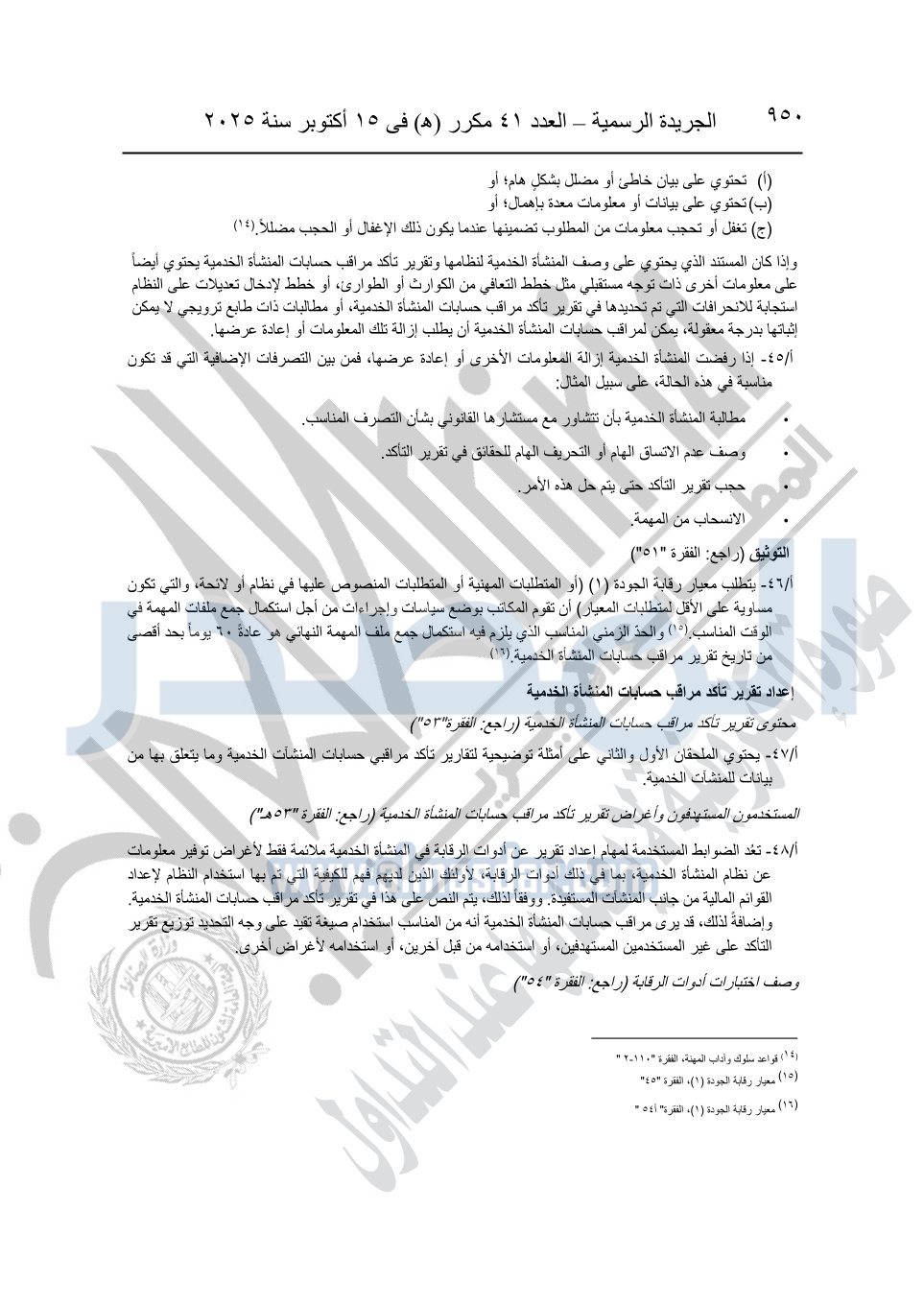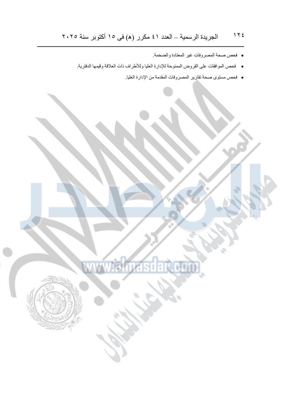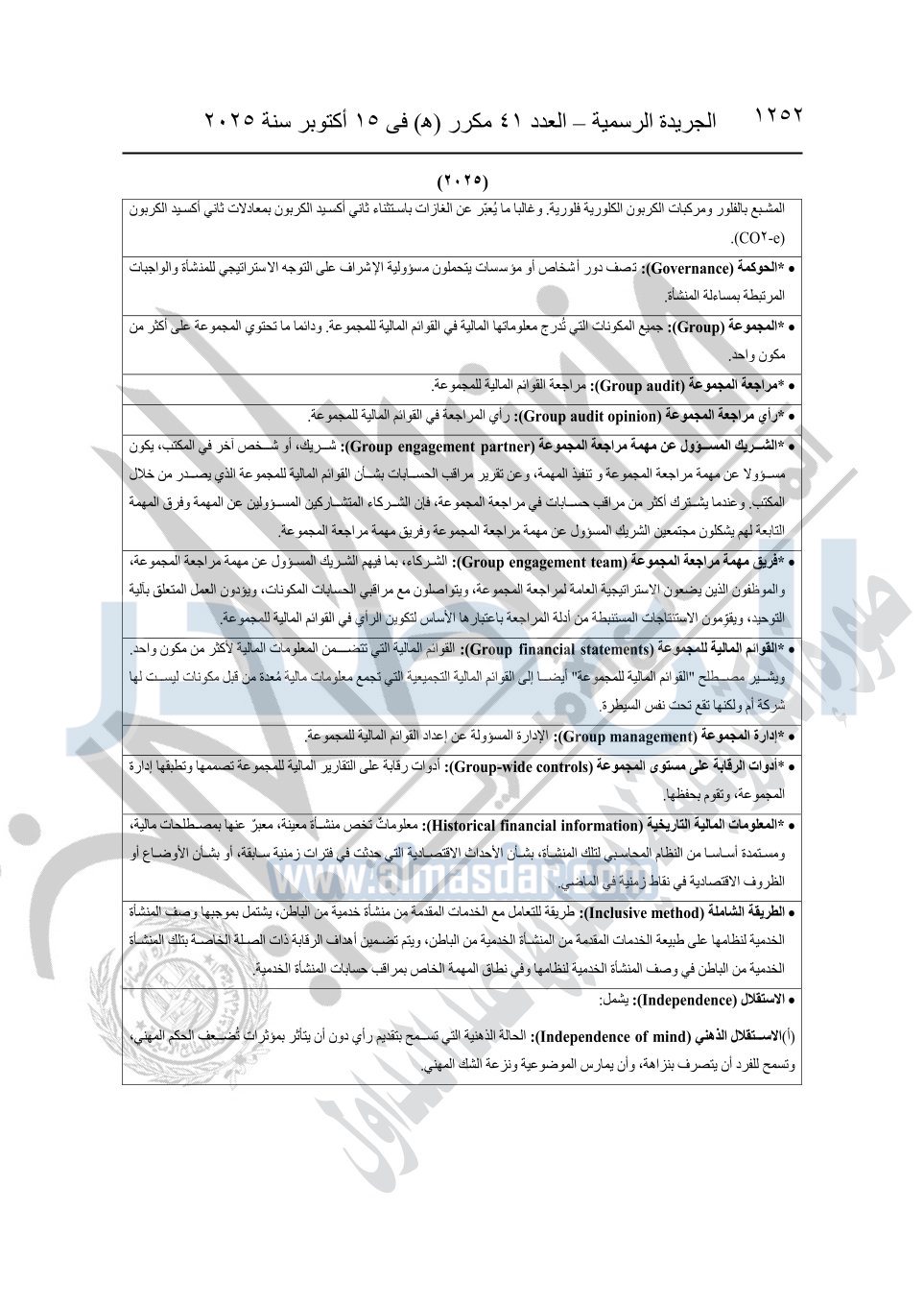نشرت الجريدة الرسمية في العدد 41 مكرر "هـ" الصادر في 15 أكتوبر سنة 2025، قرار رئيس مجلس الوزراء رقم 3725 لسنة 2025، بشأن العمل بالمعايير المصرية للمراجعة والفحص المحدود ومهام التأكد الأخرى المرافقة لهذا القرار.