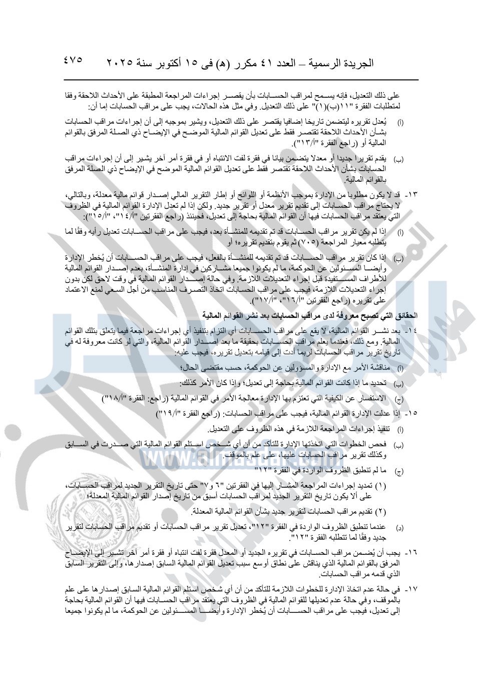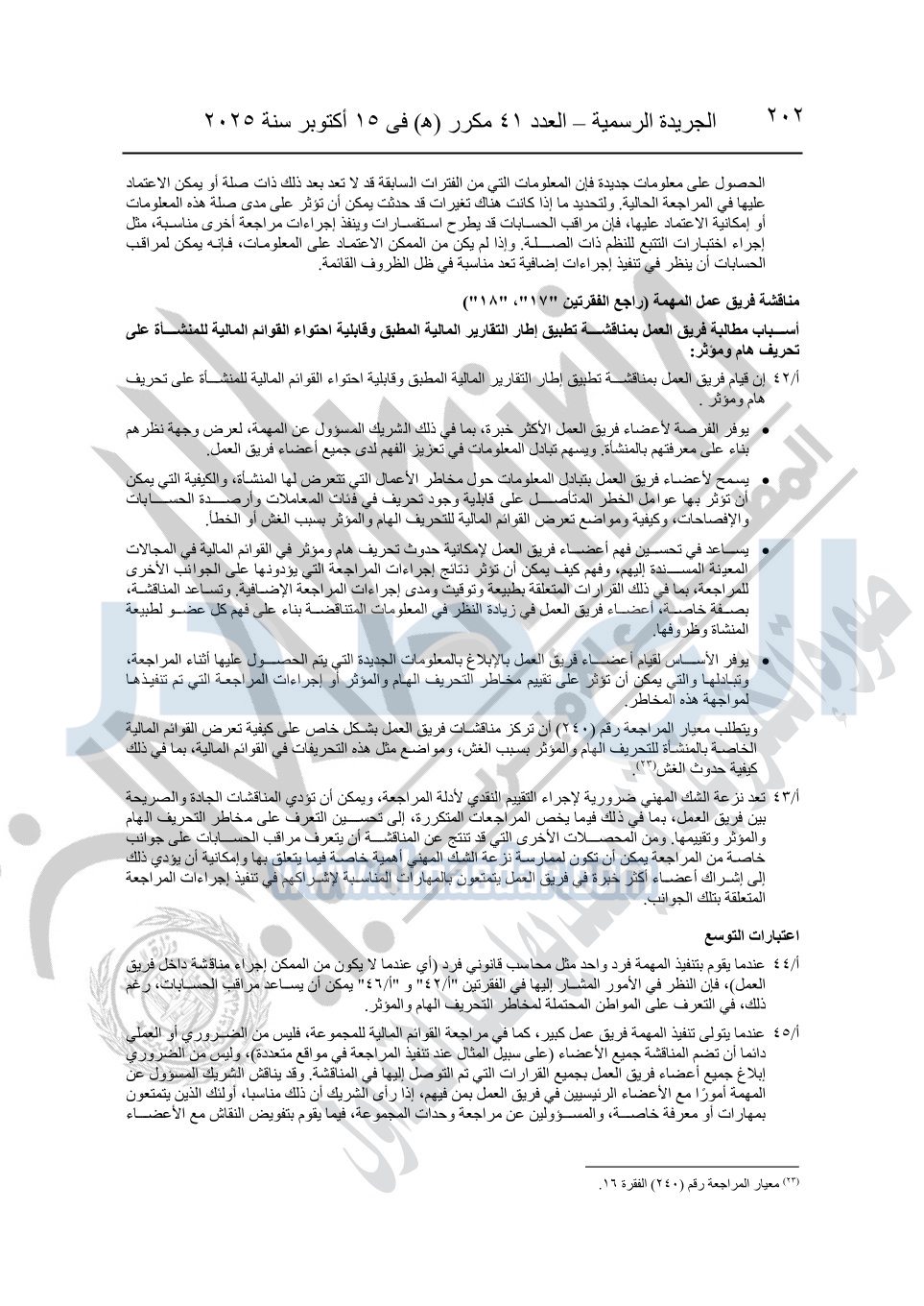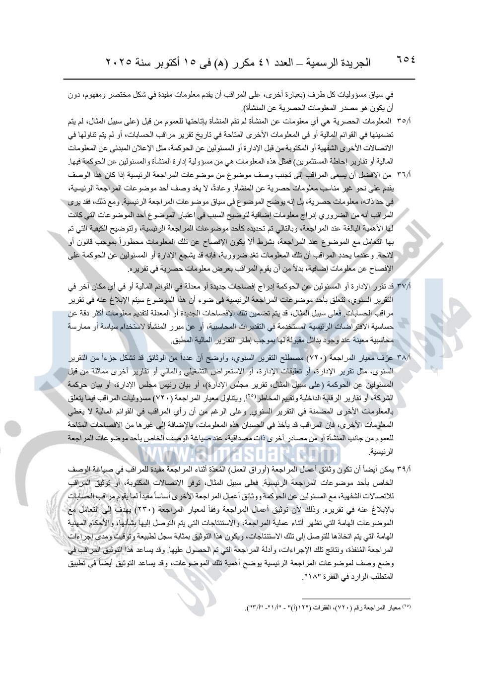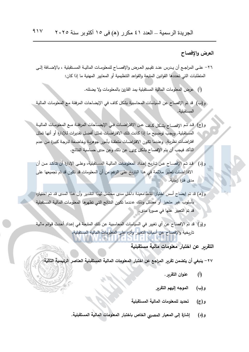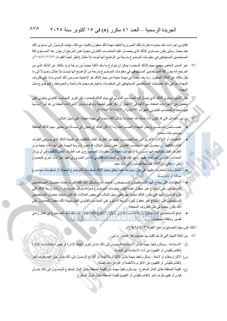 نشرت الجريدة الرسمية في العدد 41 مكرر "هـ" الصادر في 15 أكتوبر سنة 2025، قرار رئيس مجلس الوزراء رقم 3725 لسنة 2025، بشأن العمل بالمعايير المصرية للمراجعة والفحص المحدود ومهام التأكد الأخرى المرافقة لهذا القرار.