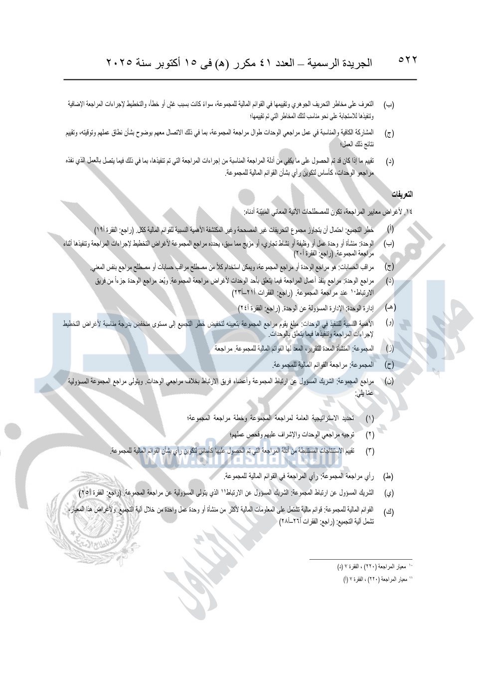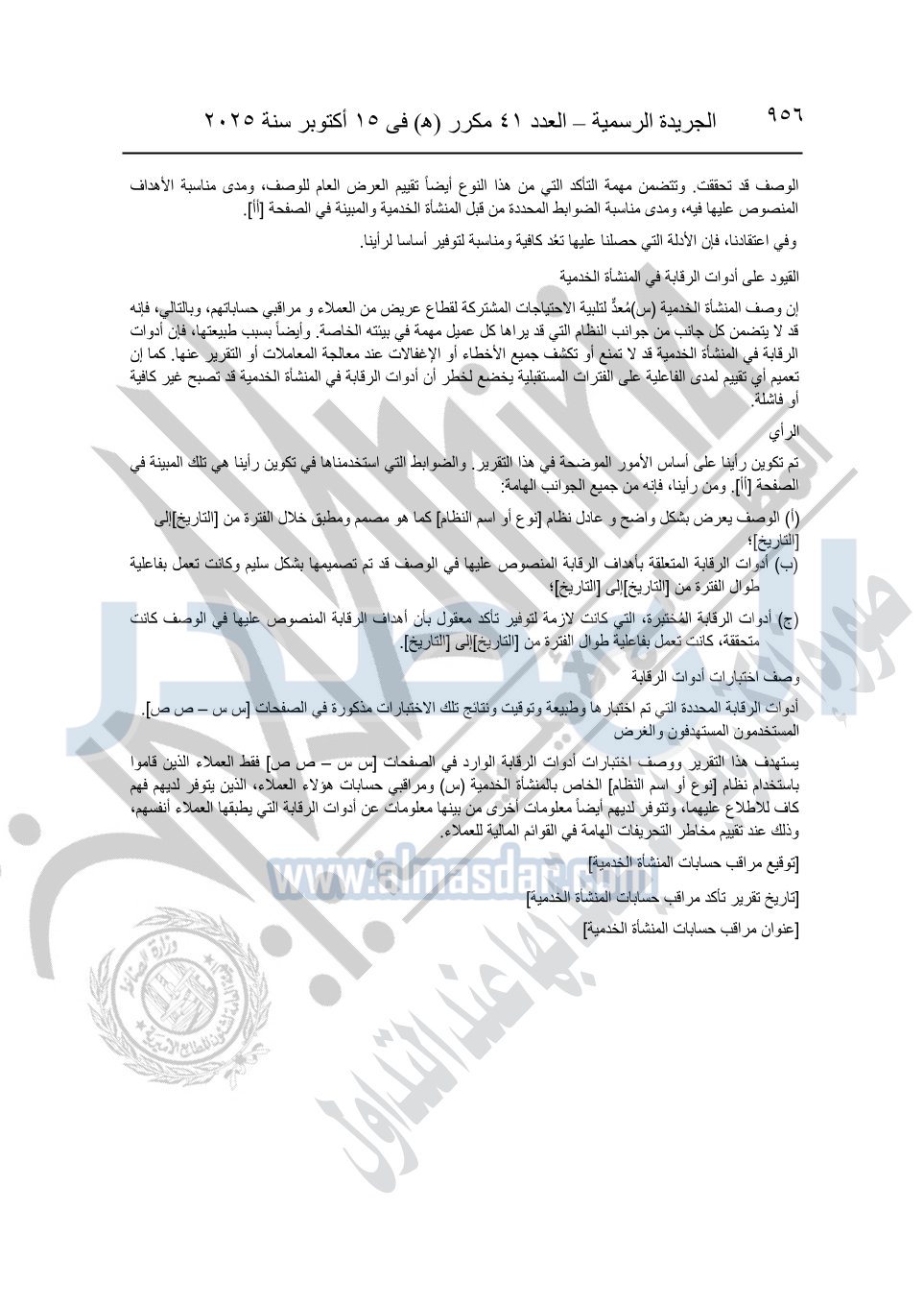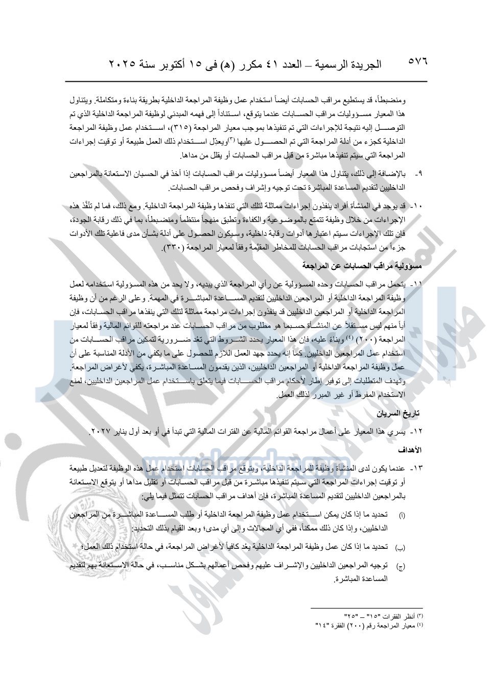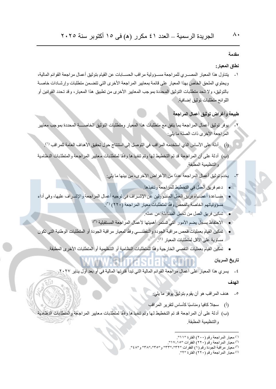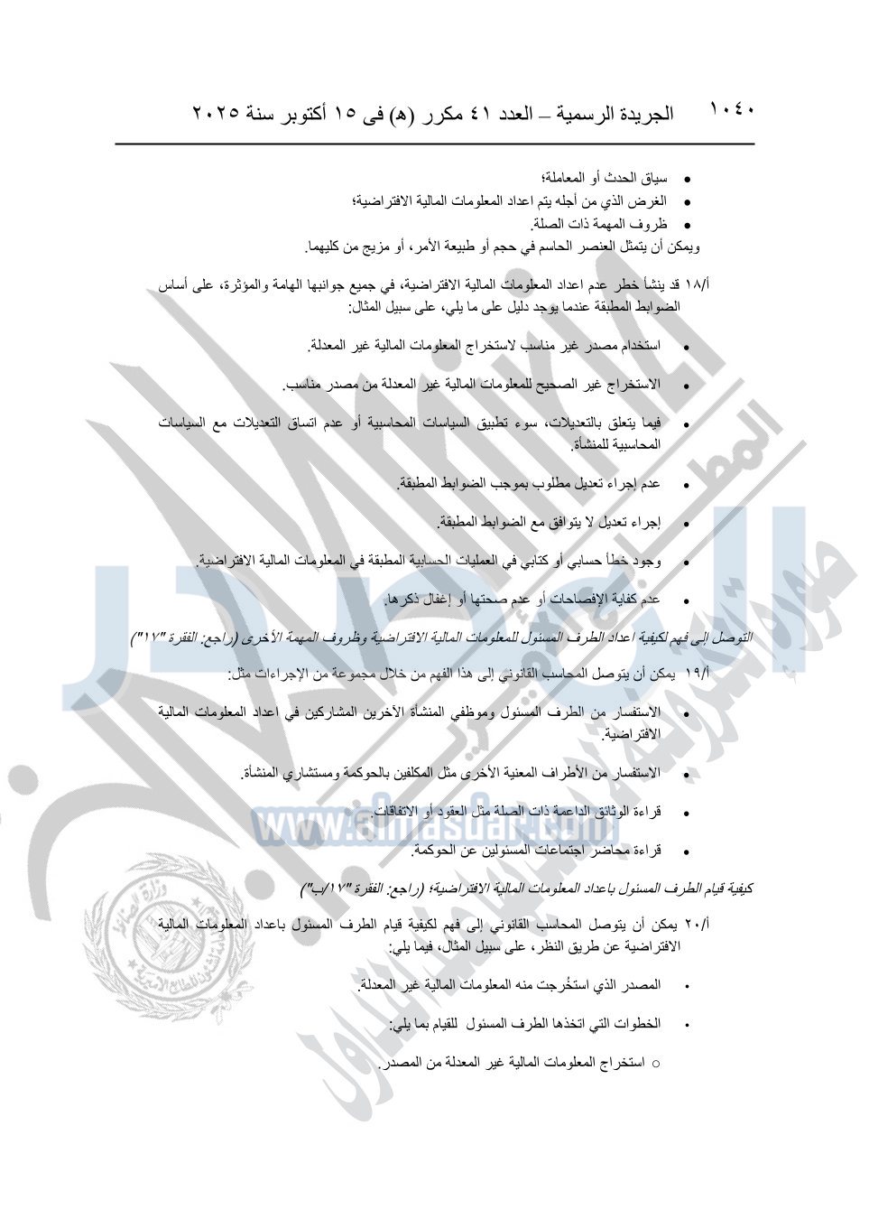 نشرت الجريدة الرسمية في العدد 41 مكرر "هـ" الصادر في 15 أكتوبر سنة 2025، قرار رئيس مجلس الوزراء رقم 3725 لسنة 2025، بشأن العمل بالمعايير المصرية للمراجعة والفحص المحدود ومهام التأكد الأخرى المرافقة لهذا القرار.