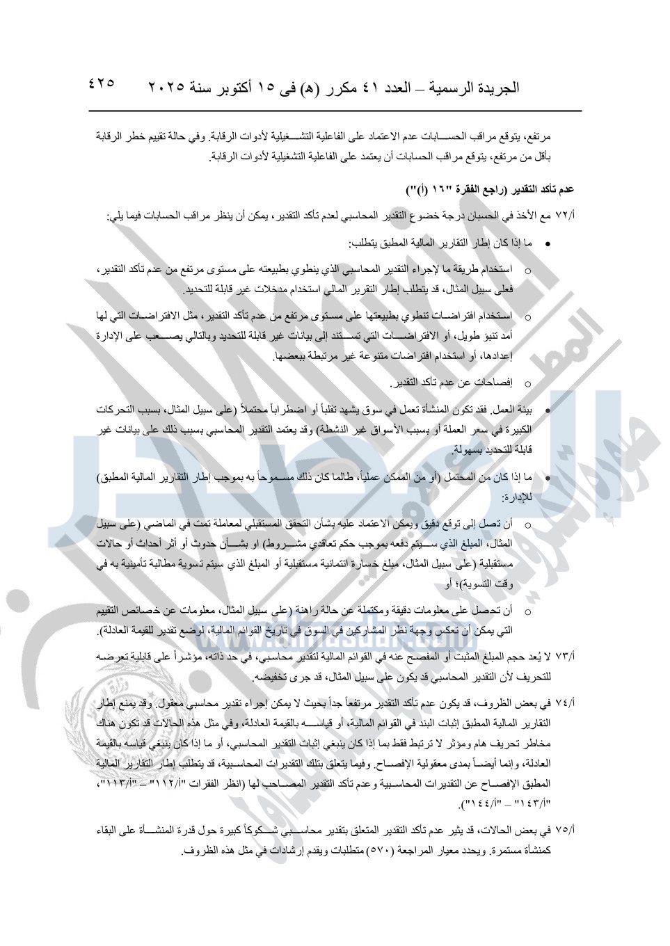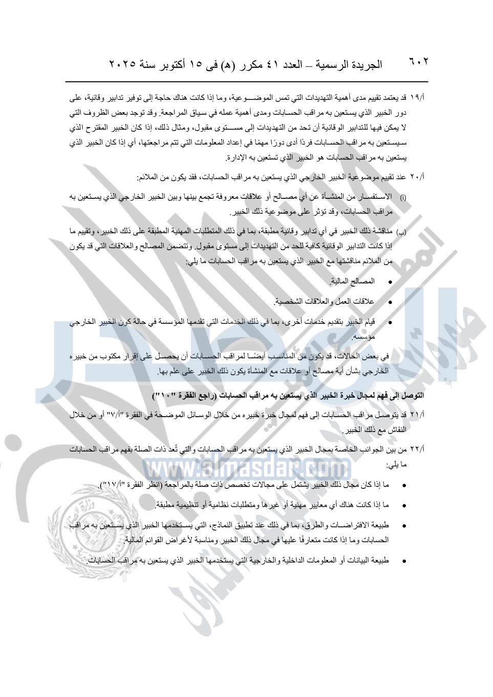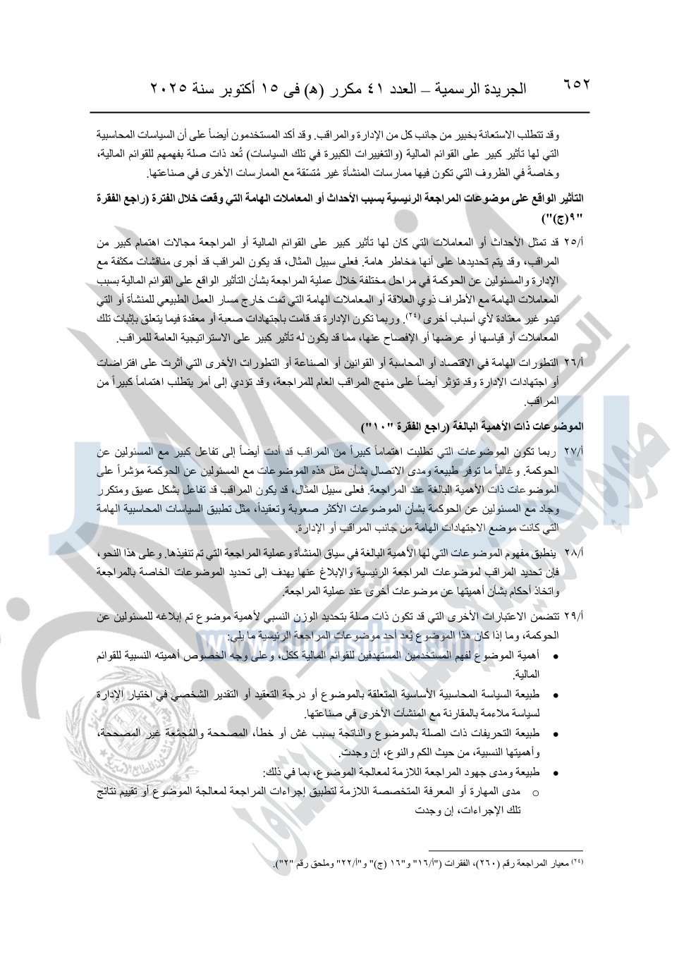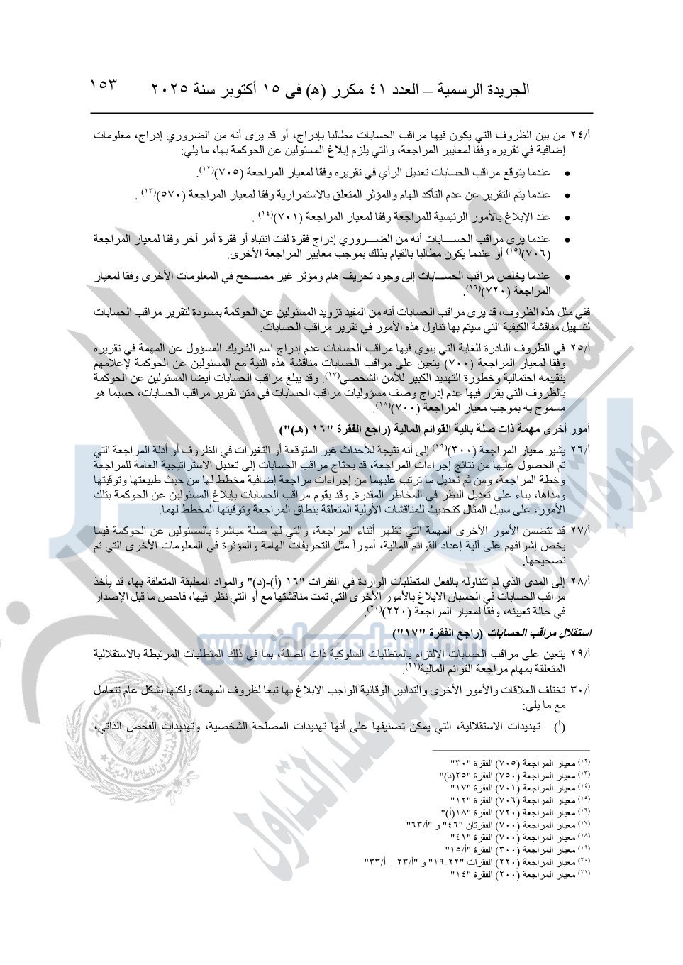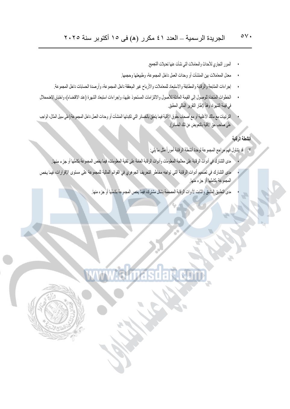 نشرت الجريدة الرسمية في العدد 41 مكرر "هـ" الصادر في 15 أكتوبر سنة 2025، قرار رئيس مجلس الوزراء رقم 3725 لسنة 2025، بشأن العمل بالمعايير المصرية للمراجعة والفحص المحدود ومهام التأكد الأخرى المرافقة لهذا القرار.