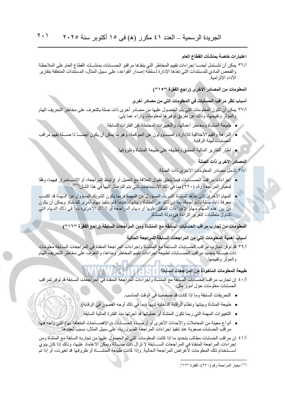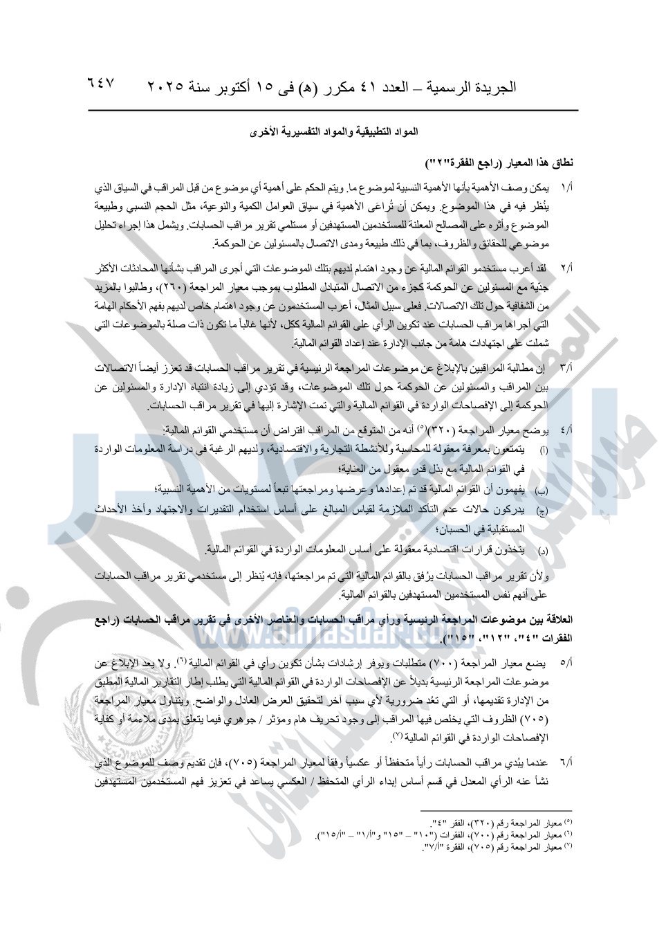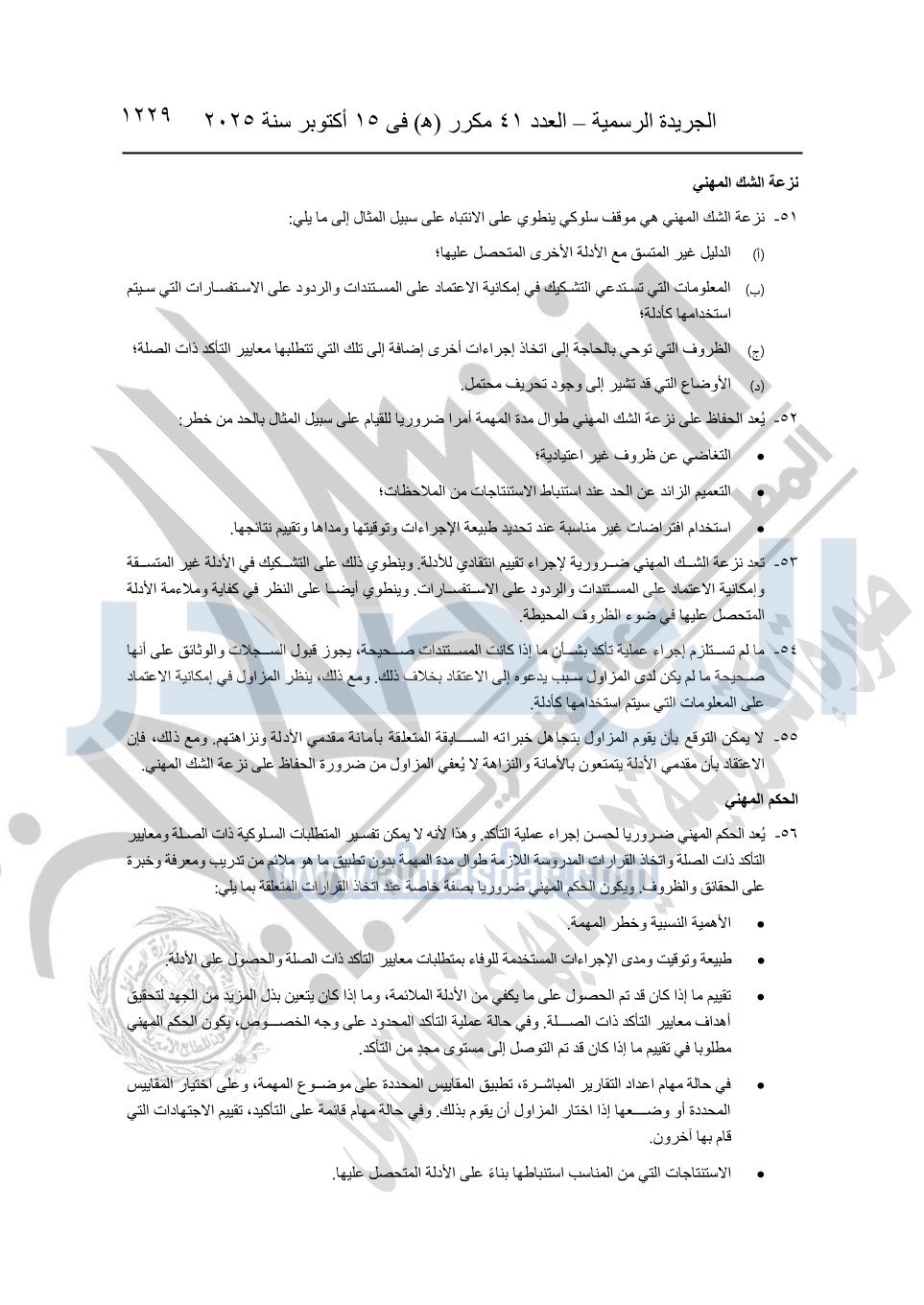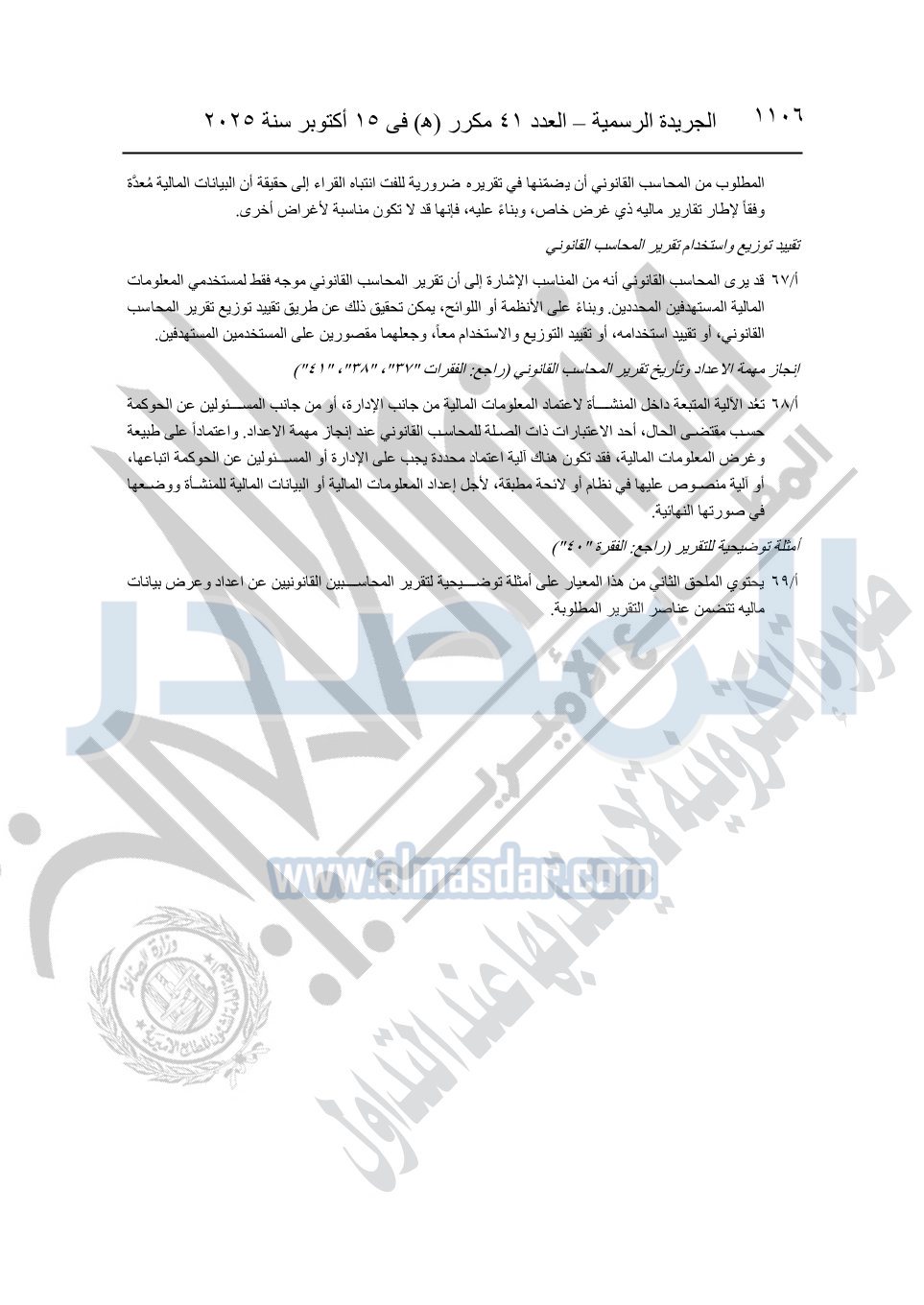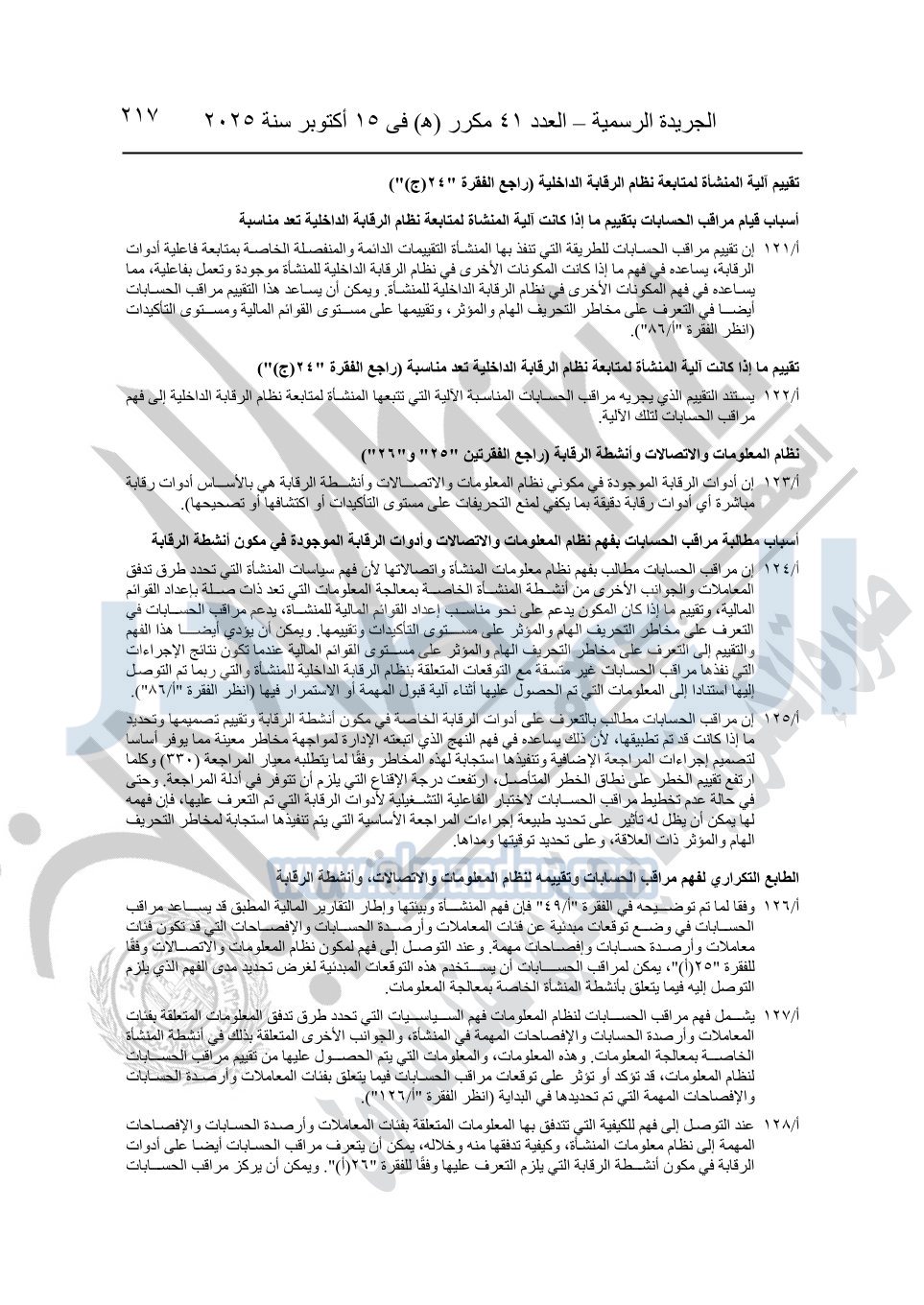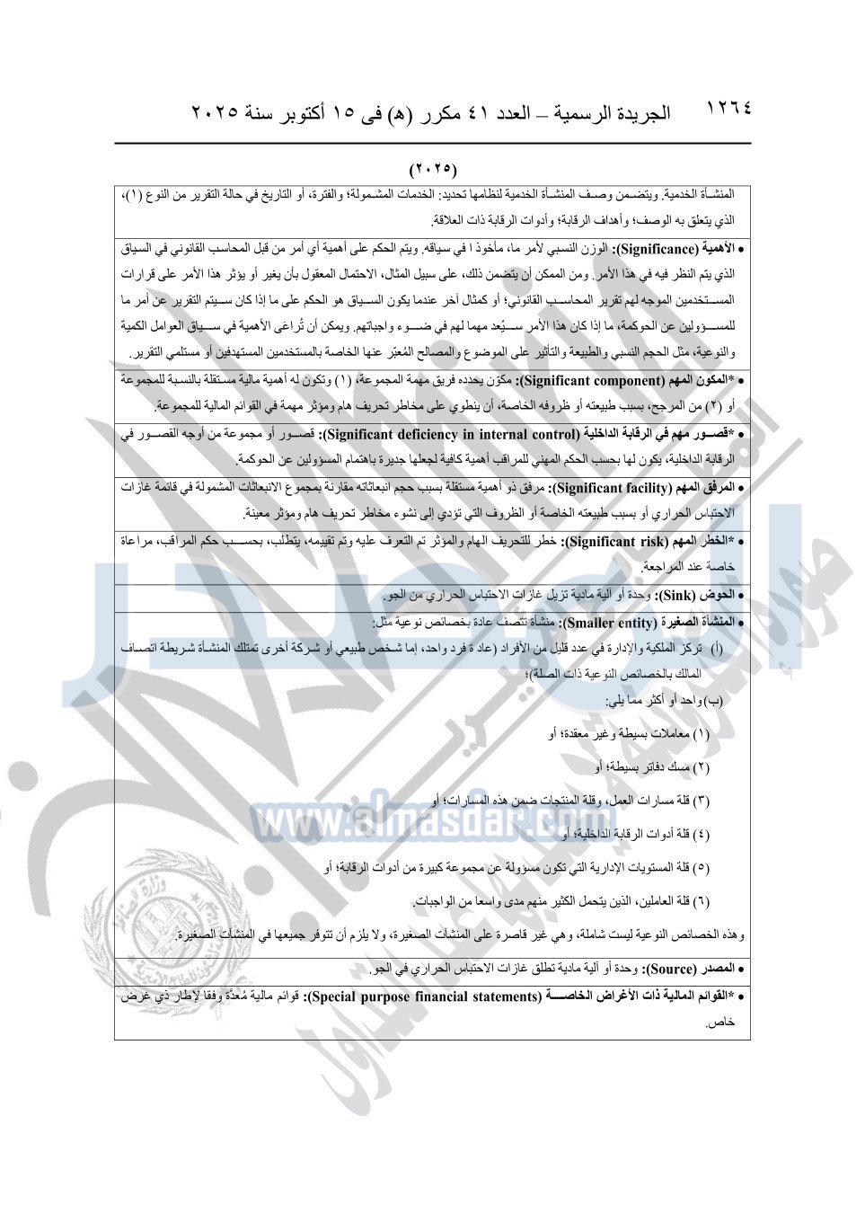 نشرت الجريدة الرسمية في العدد 41 مكرر "هـ" الصادر في 15 أكتوبر سنة 2025، قرار رئيس مجلس الوزراء رقم 3725 لسنة 2025، بشأن العمل بالمعايير المصرية للمراجعة والفحص المحدود ومهام التأكد الأخرى المرافقة لهذا القرار.
