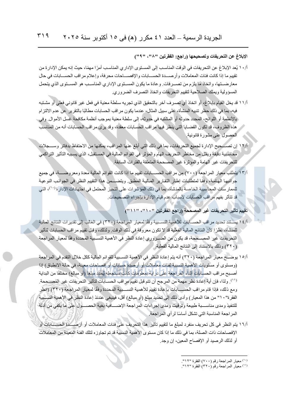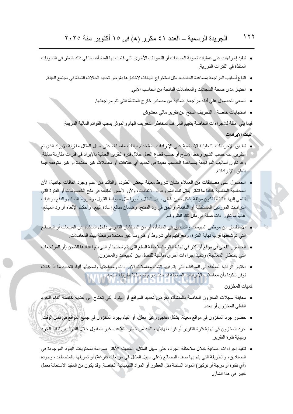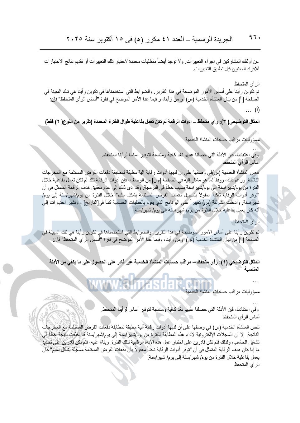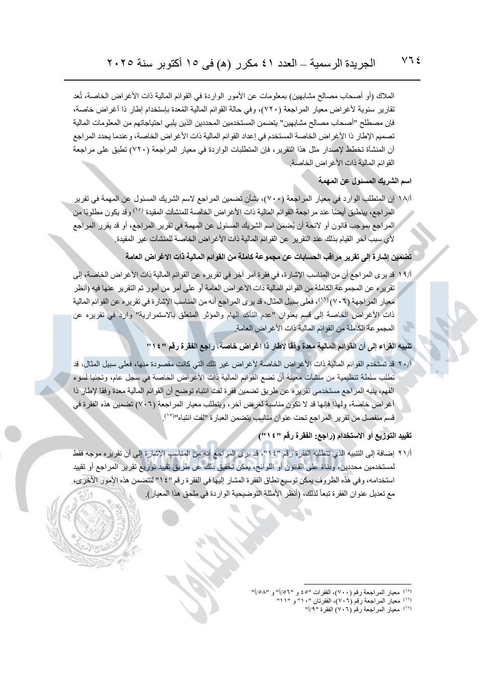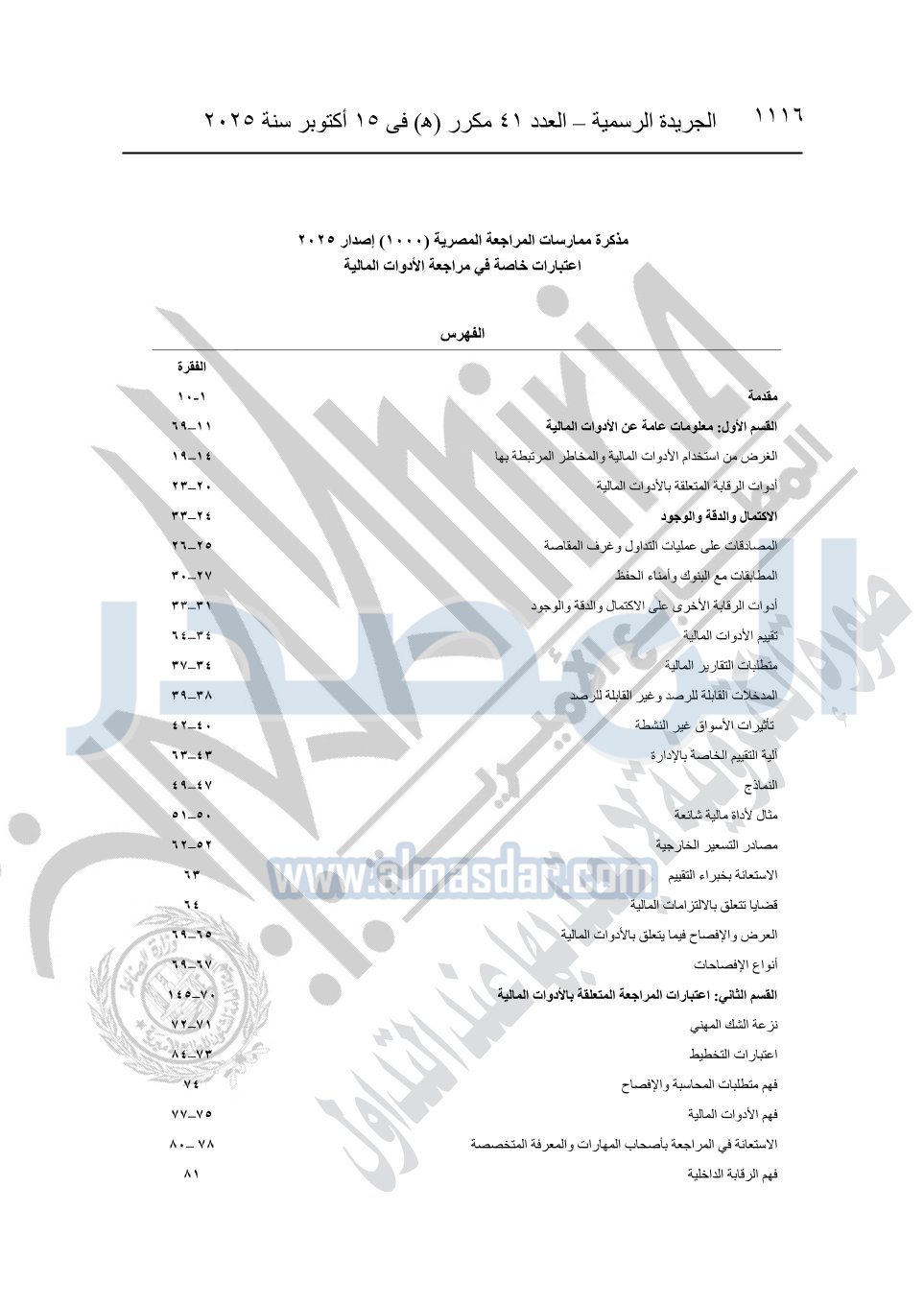 نشرت الجريدة الرسمية في العدد 41 مكرر "هـ" الصادر في 15 أكتوبر سنة 2025، قرار رئيس مجلس الوزراء رقم 3725 لسنة 2025، بشأن العمل بالمعايير المصرية للمراجعة والفحص المحدود ومهام التأكد الأخرى المرافقة لهذا القرار.
