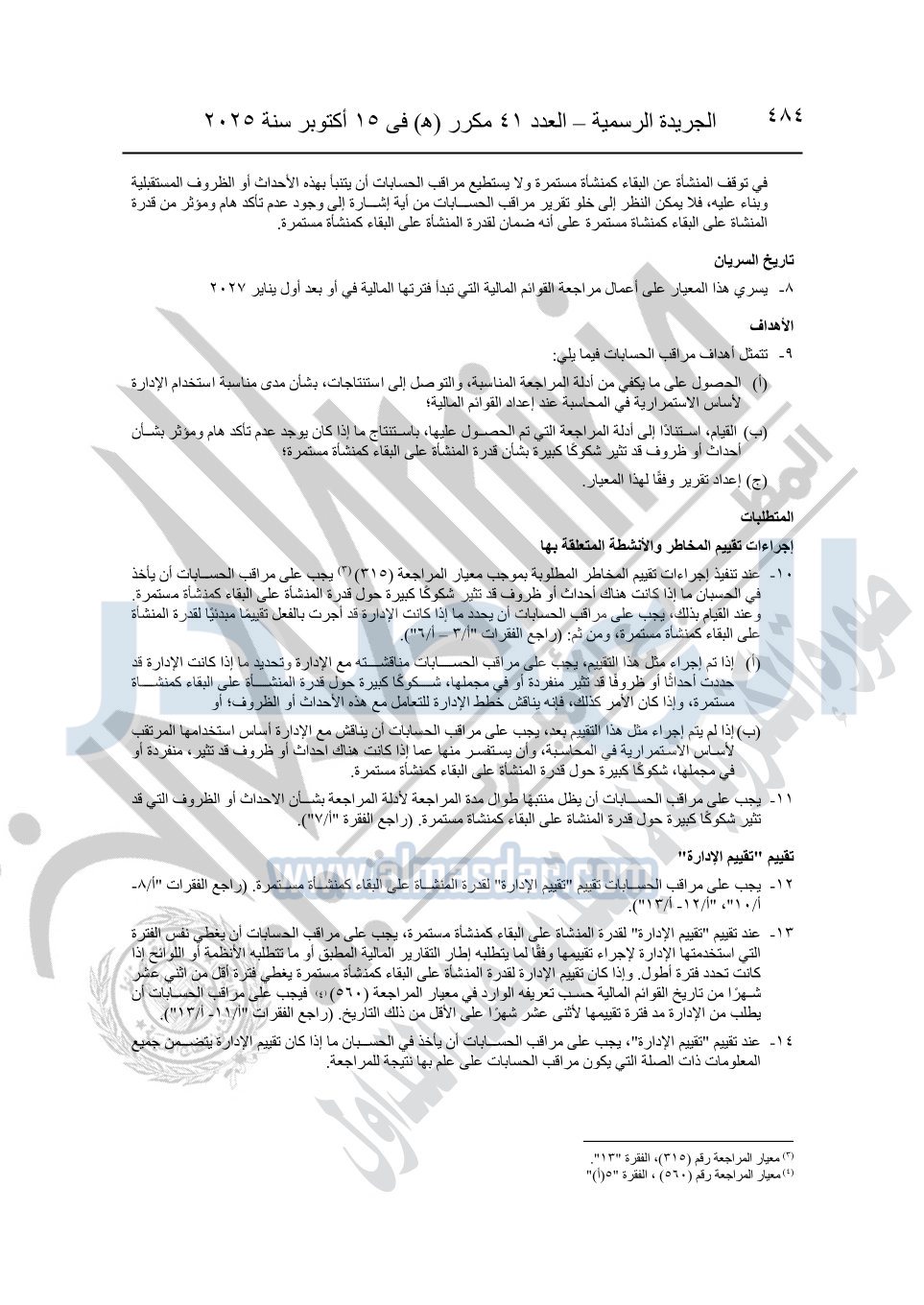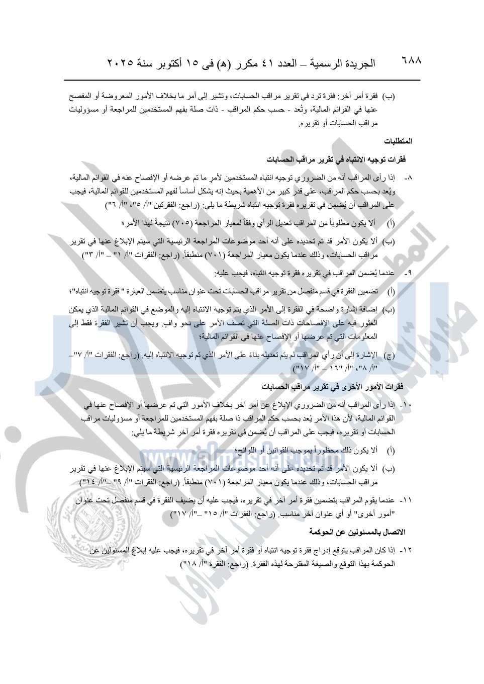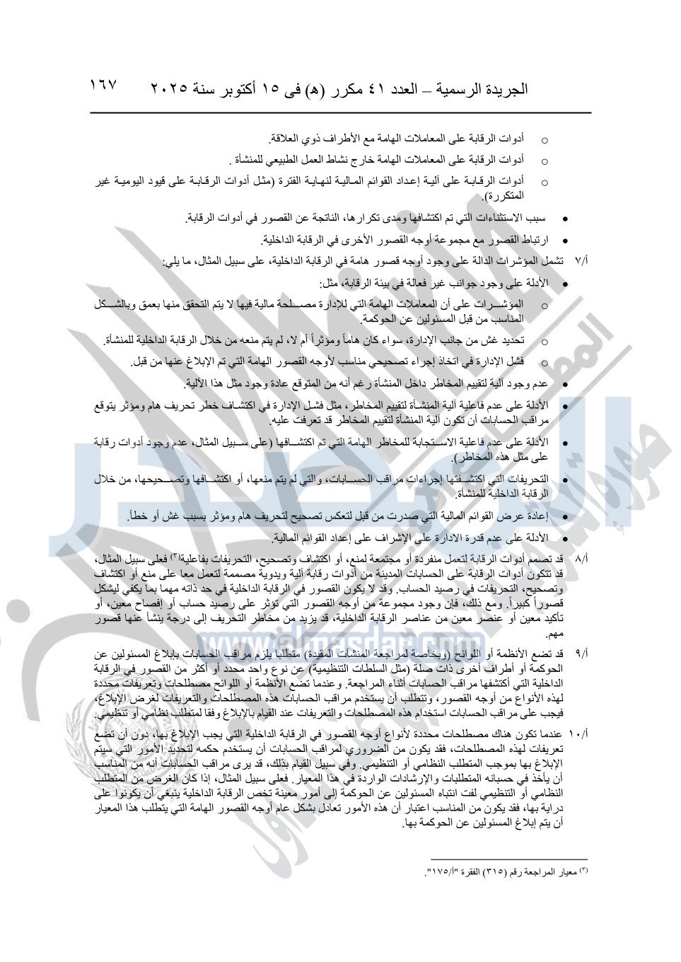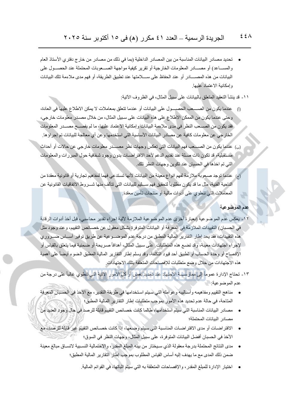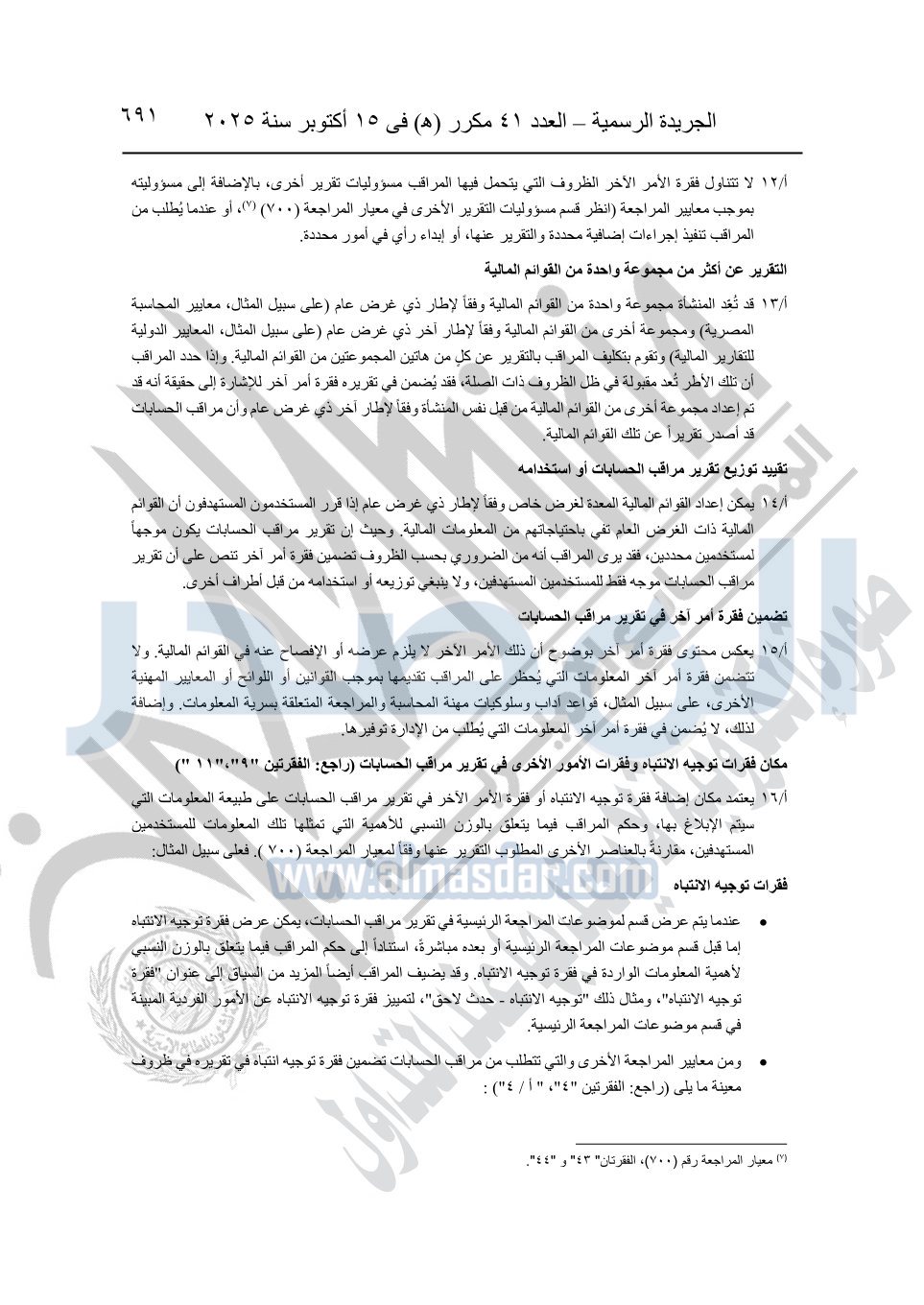 نشرت الجريدة الرسمية في العدد 41 مكرر "هـ" الصادر في 15 أكتوبر سنة 2025، قرار رئيس مجلس الوزراء رقم 3725 لسنة 2025، بشأن العمل بالمعايير المصرية للمراجعة والفحص المحدود ومهام التأكد الأخرى المرافقة لهذا القرار.