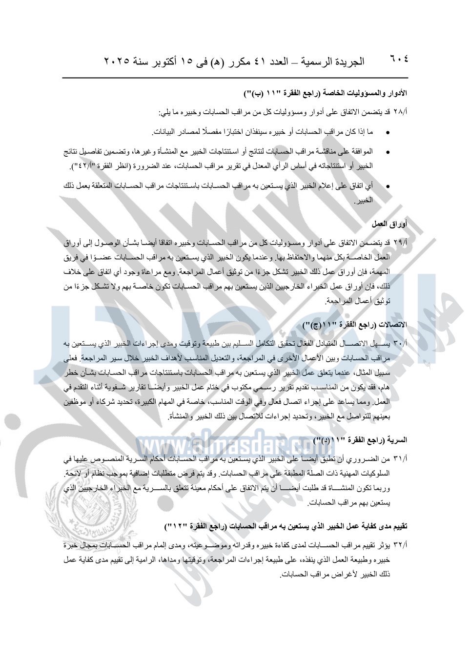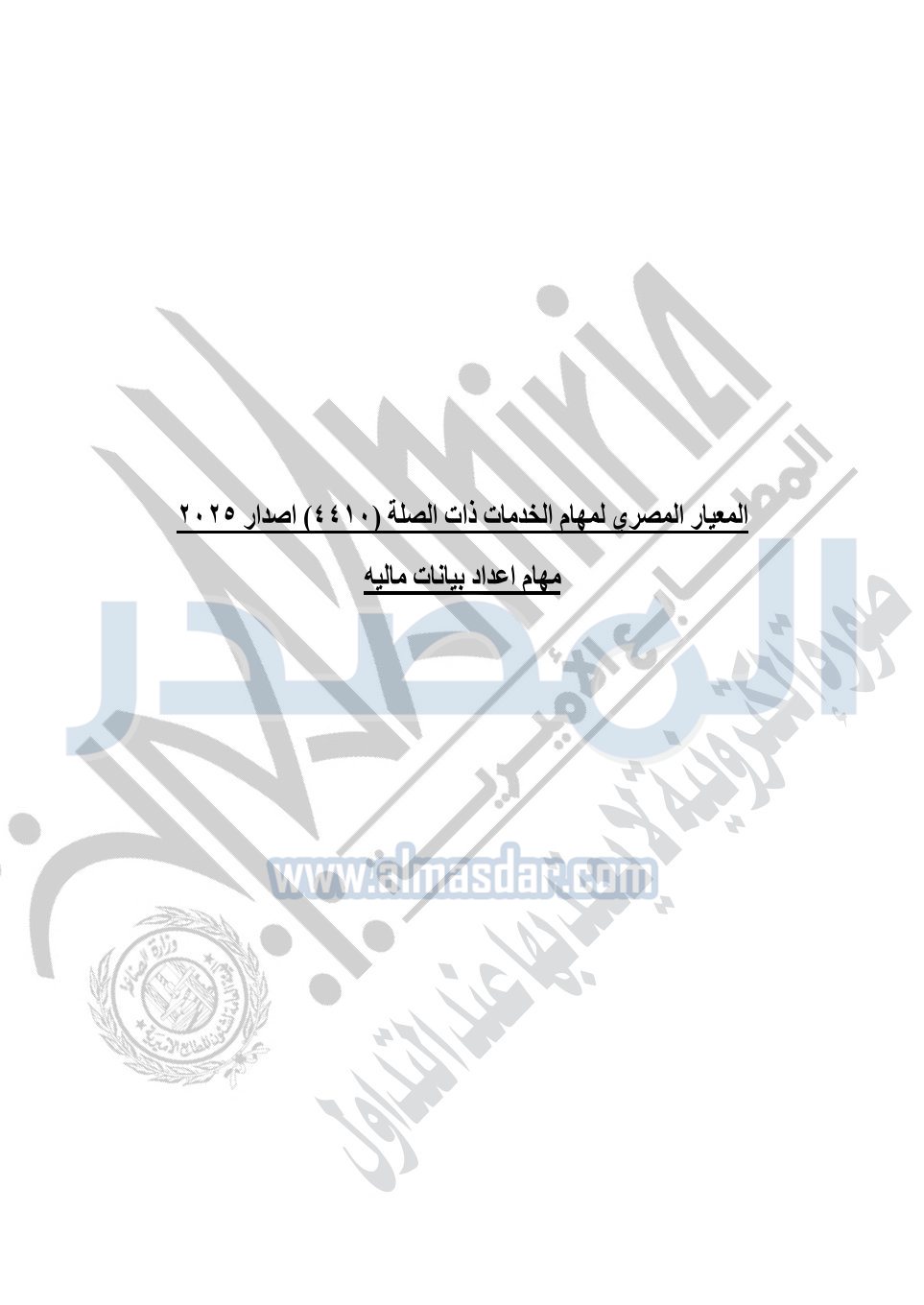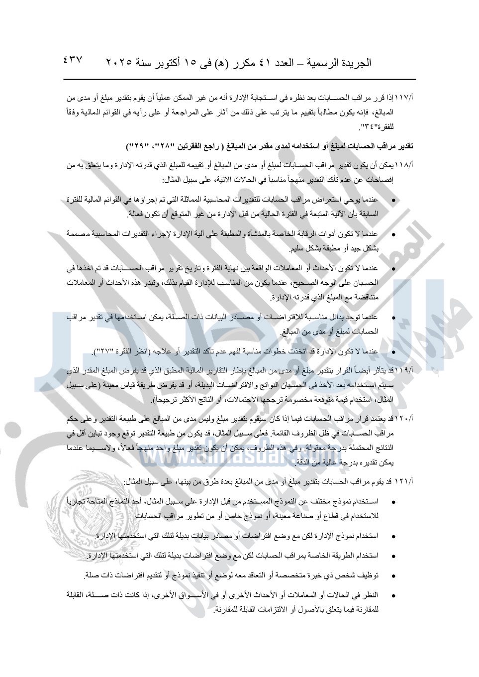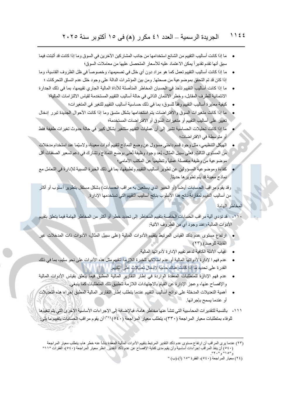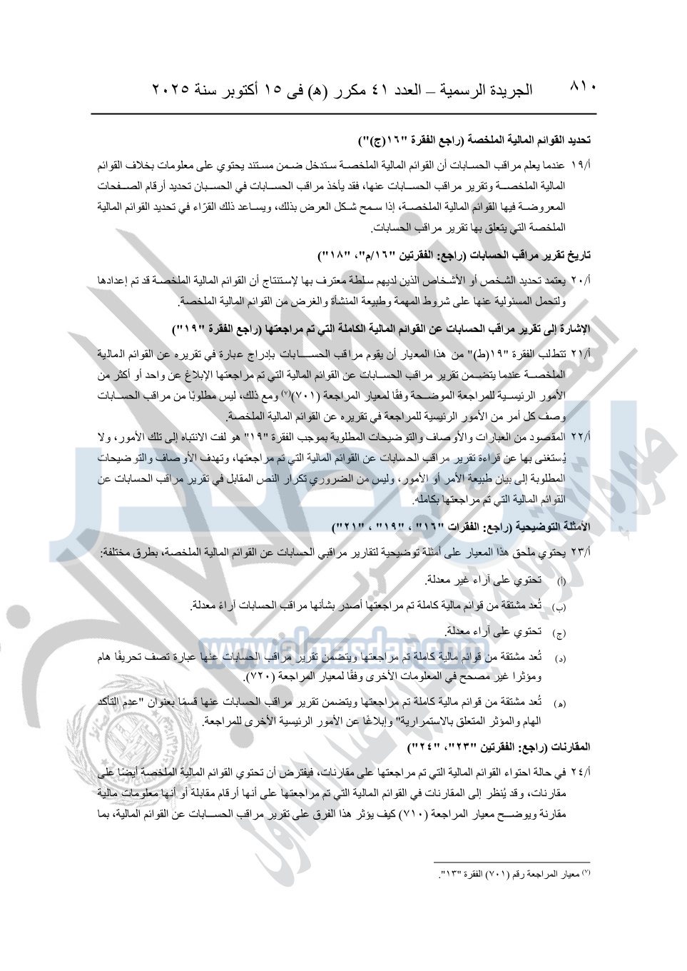 نشرت الجريدة الرسمية في العدد 41 مكرر "هـ" الصادر في 15 أكتوبر سنة 2025، قرار رئيس مجلس الوزراء رقم 3725 لسنة 2025، بشأن العمل بالمعايير المصرية للمراجعة والفحص المحدود ومهام التأكد الأخرى المرافقة لهذا القرار.