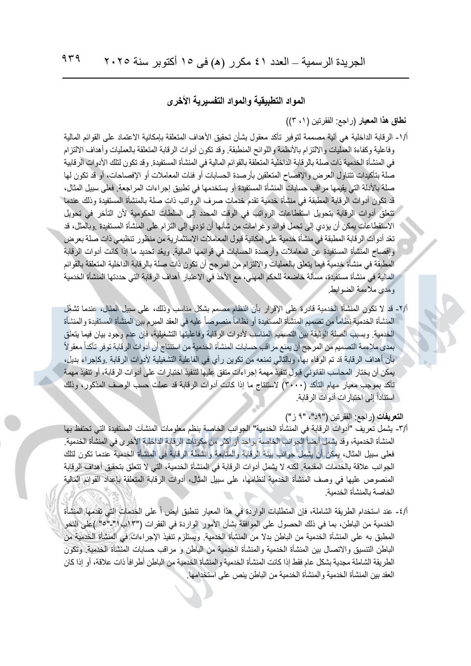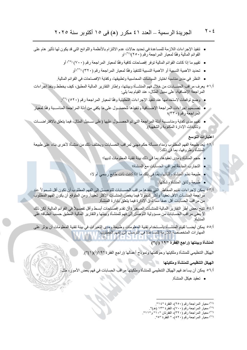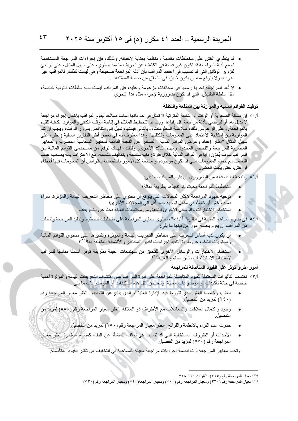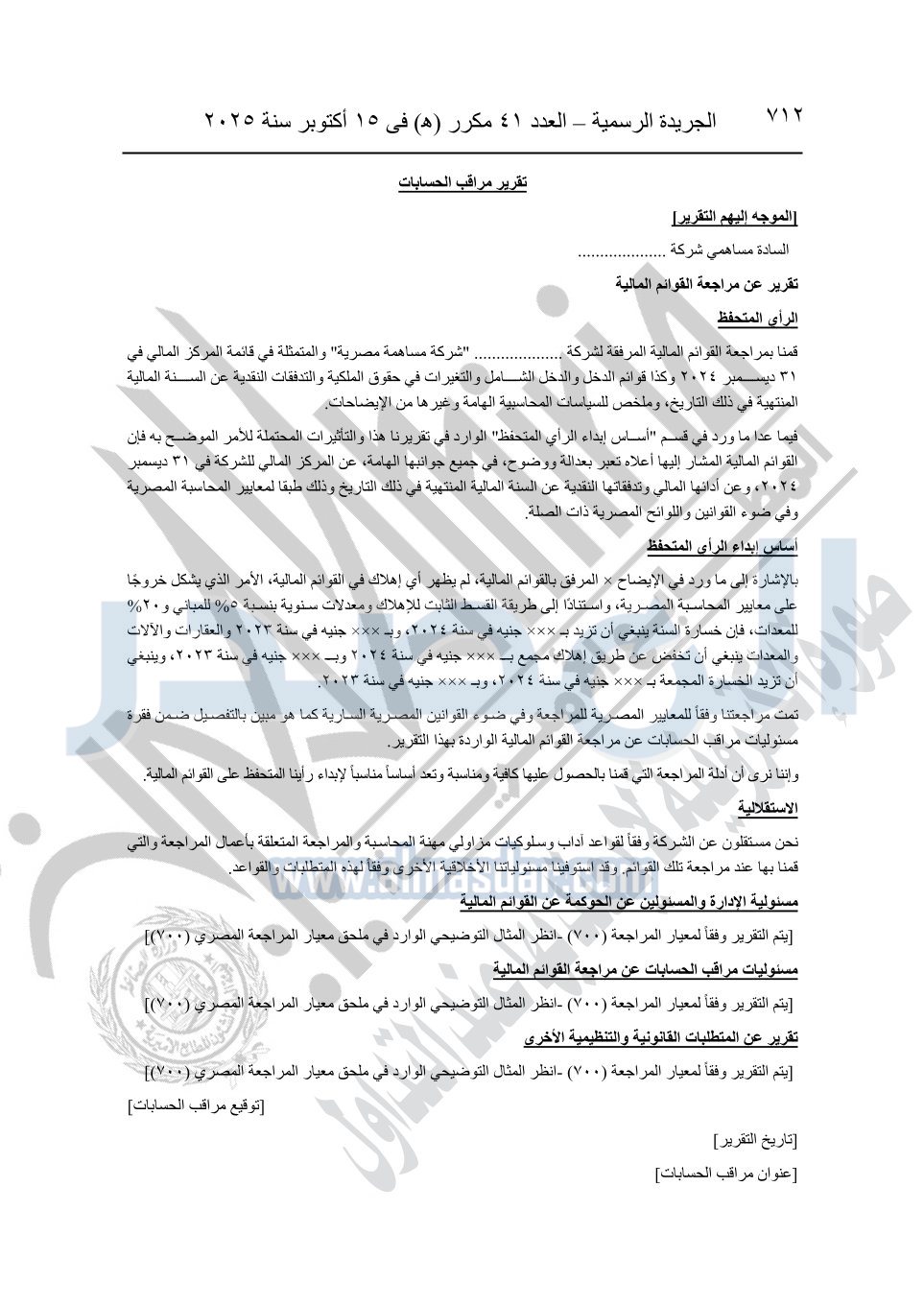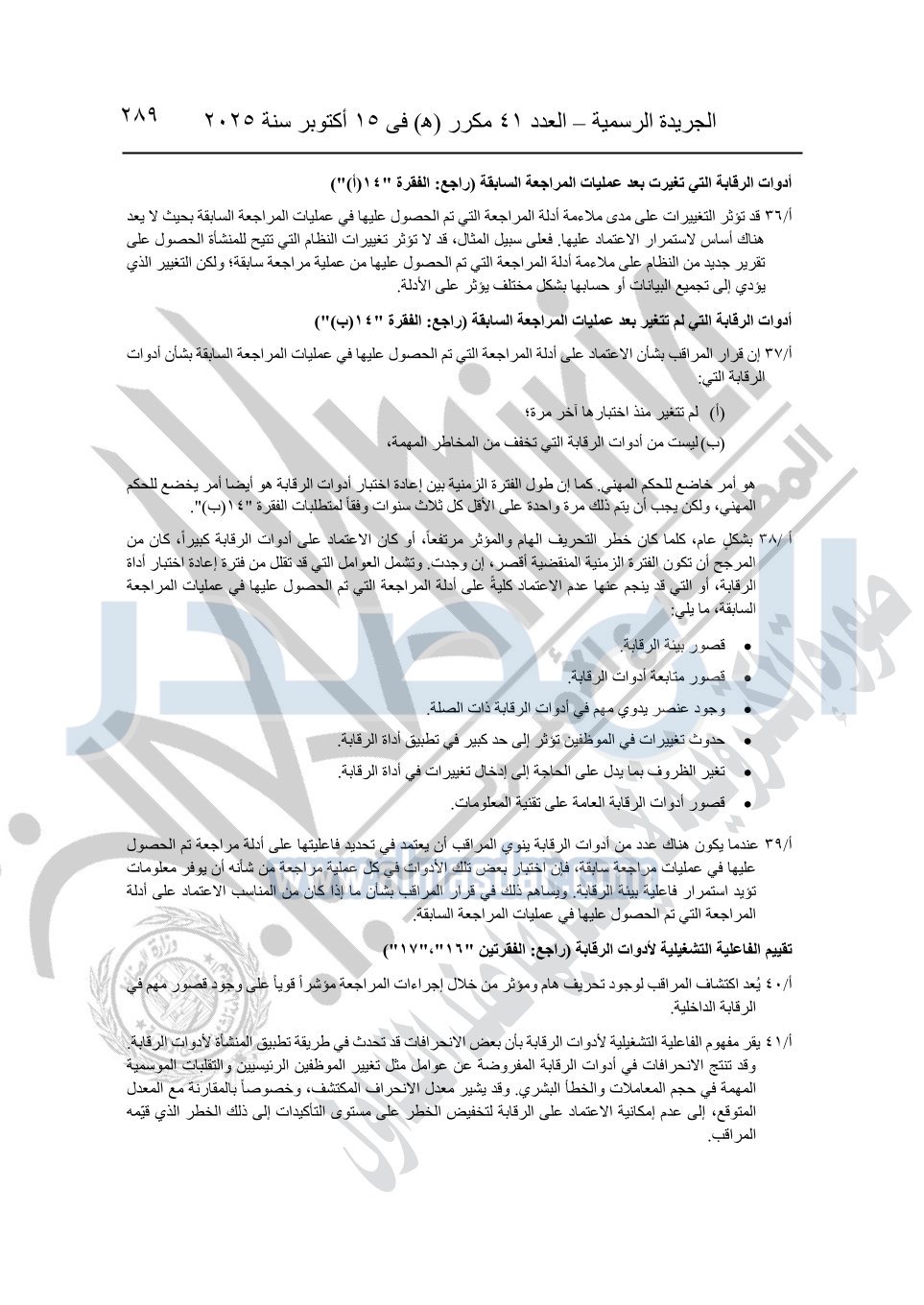 نشرت الجريدة الرسمية في العدد 41 مكرر "هـ" الصادر في 15 أكتوبر سنة 2025، قرار رئيس مجلس الوزراء رقم 3725 لسنة 2025، بشأن العمل بالمعايير المصرية للمراجعة والفحص المحدود ومهام التأكد الأخرى المرافقة لهذا القرار.