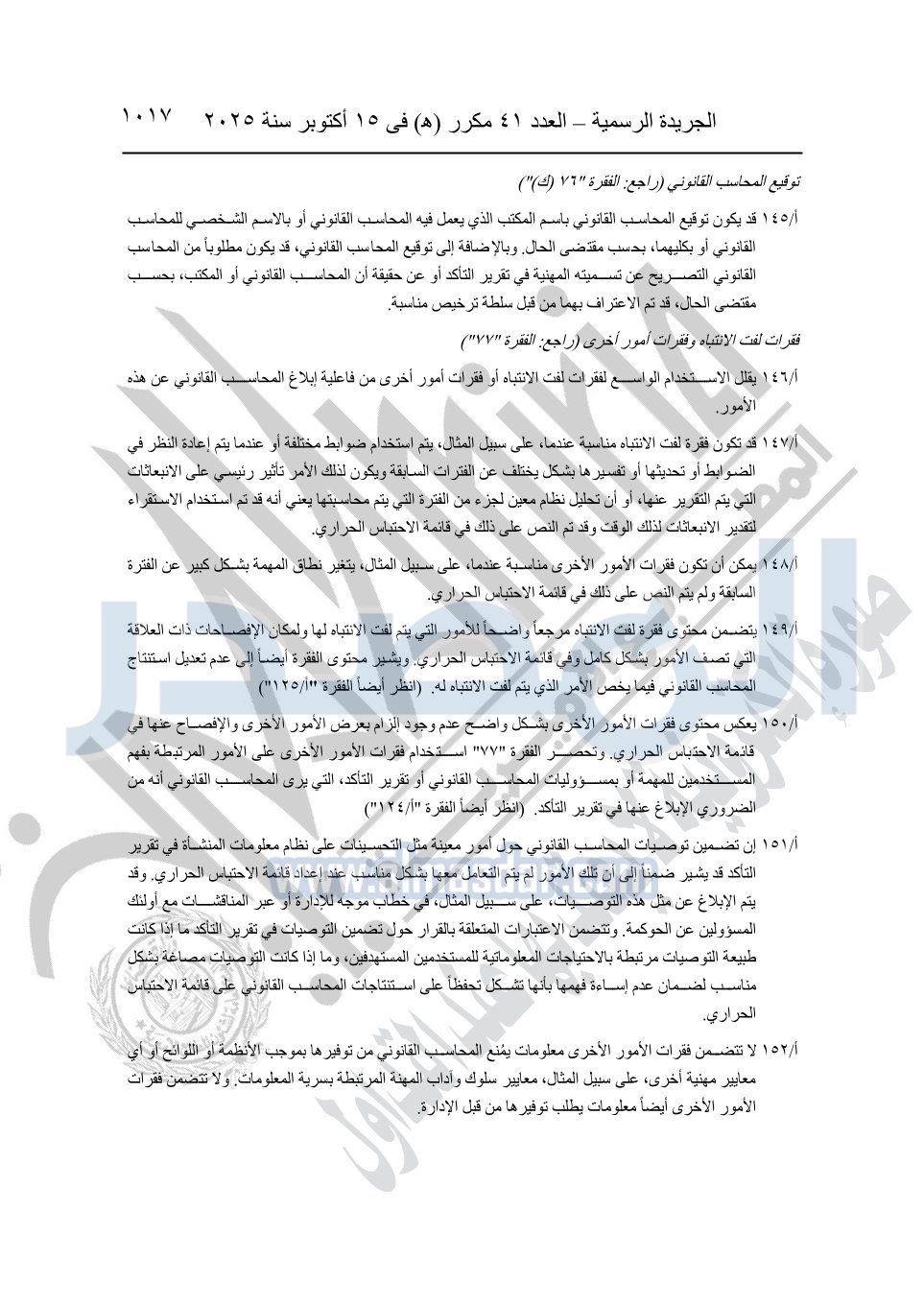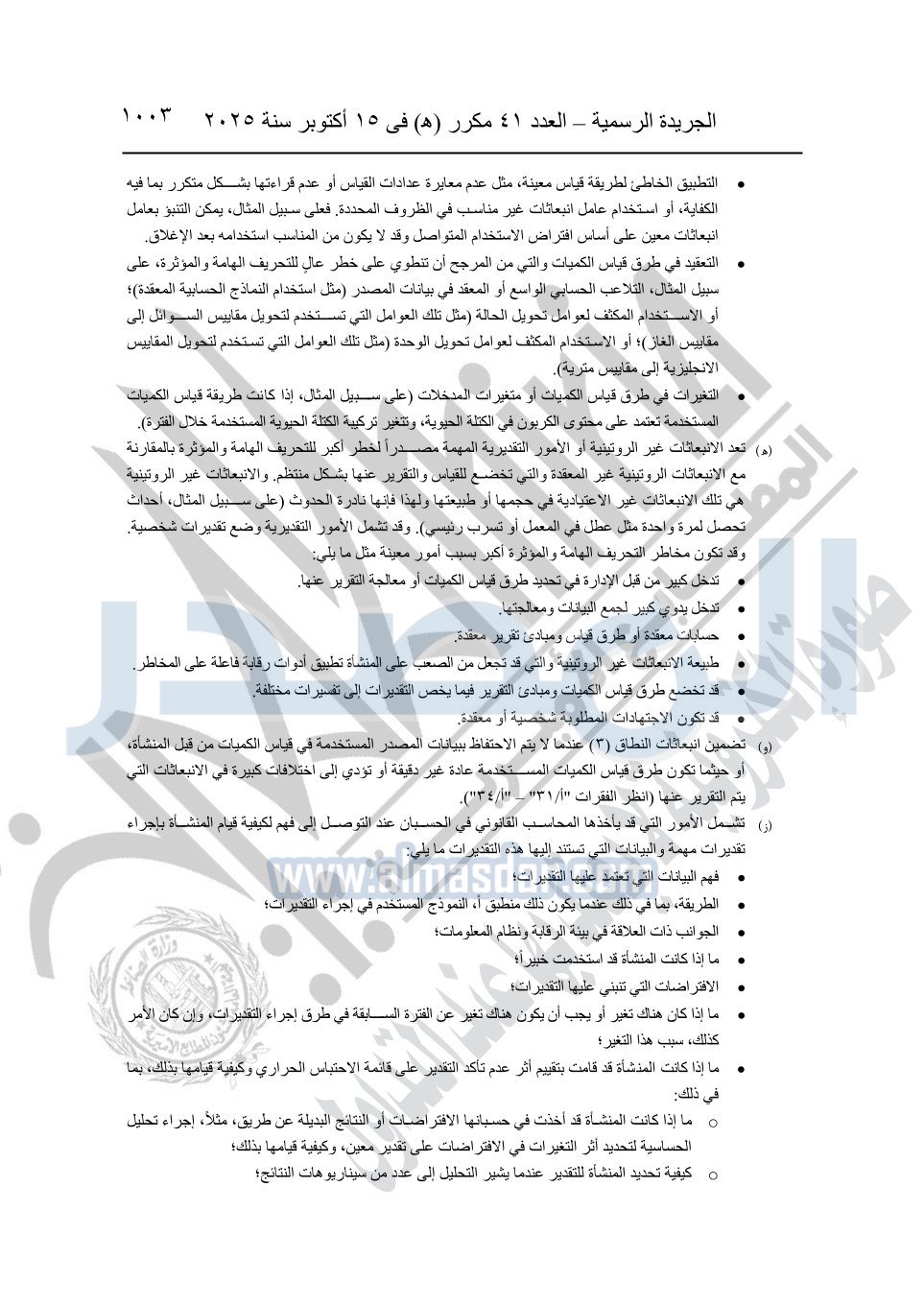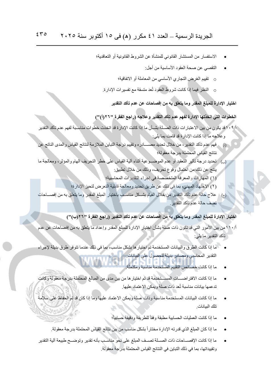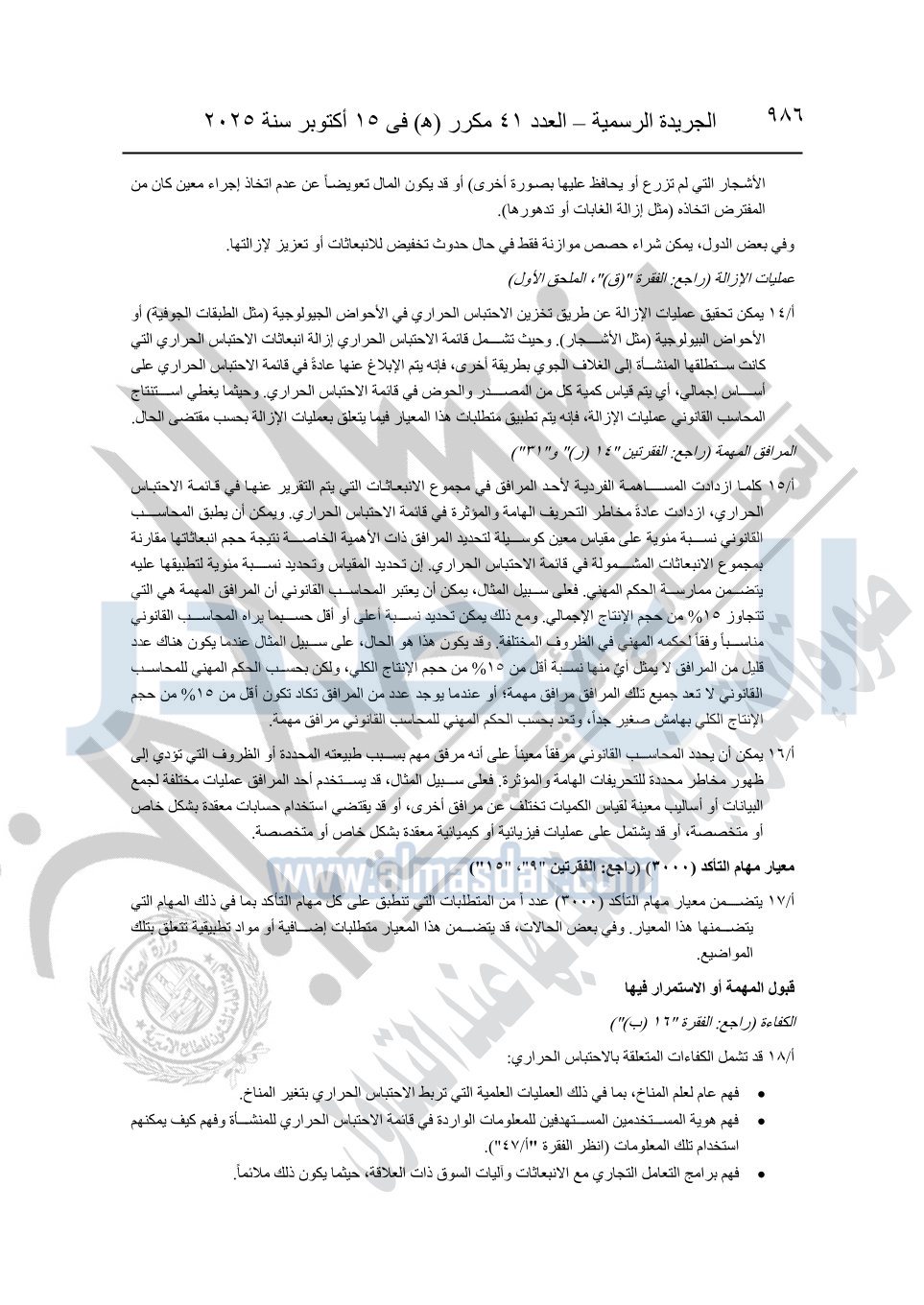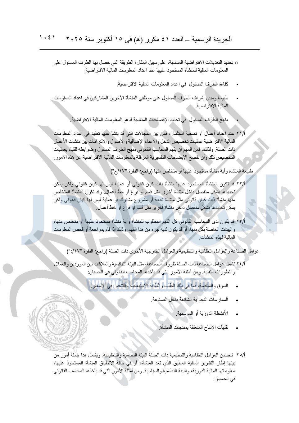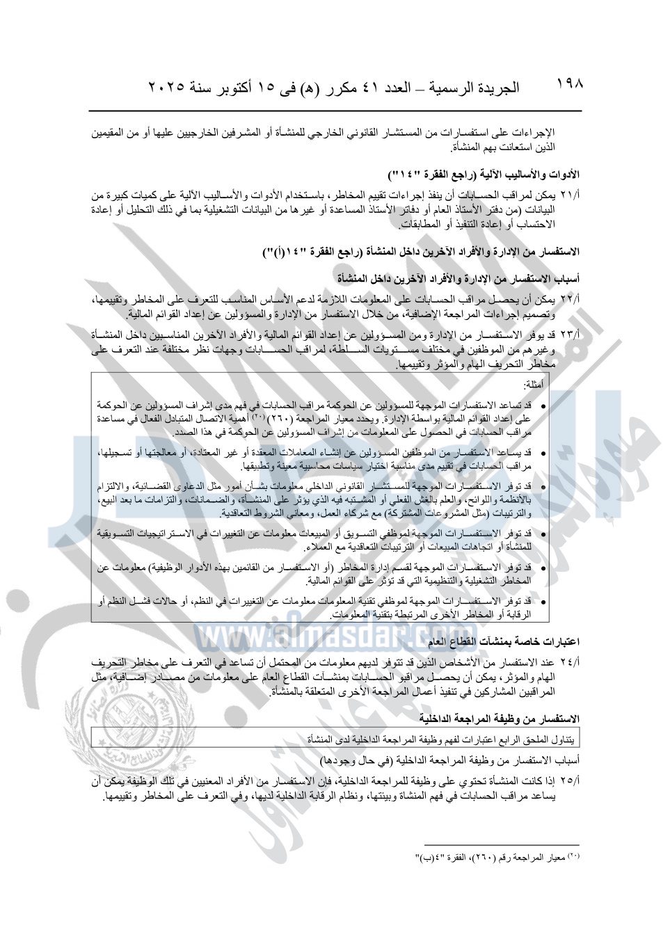 نشرت الجريدة الرسمية في العدد 41 مكرر "هـ" الصادر في 15 أكتوبر سنة 2025، قرار رئيس مجلس الوزراء رقم 3725 لسنة 2025، بشأن العمل بالمعايير المصرية للمراجعة والفحص المحدود ومهام التأكد الأخرى المرافقة لهذا القرار.