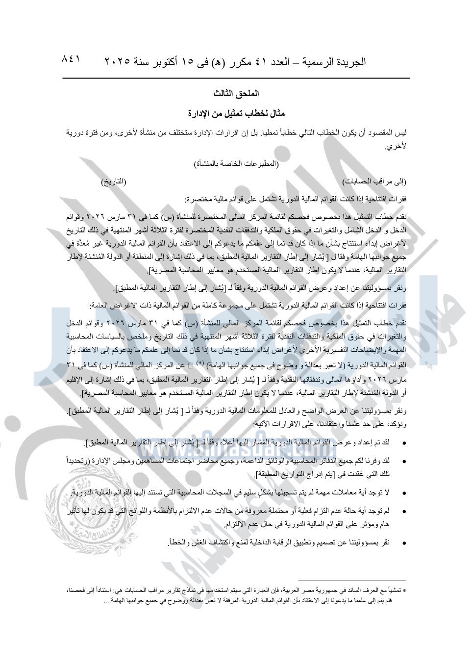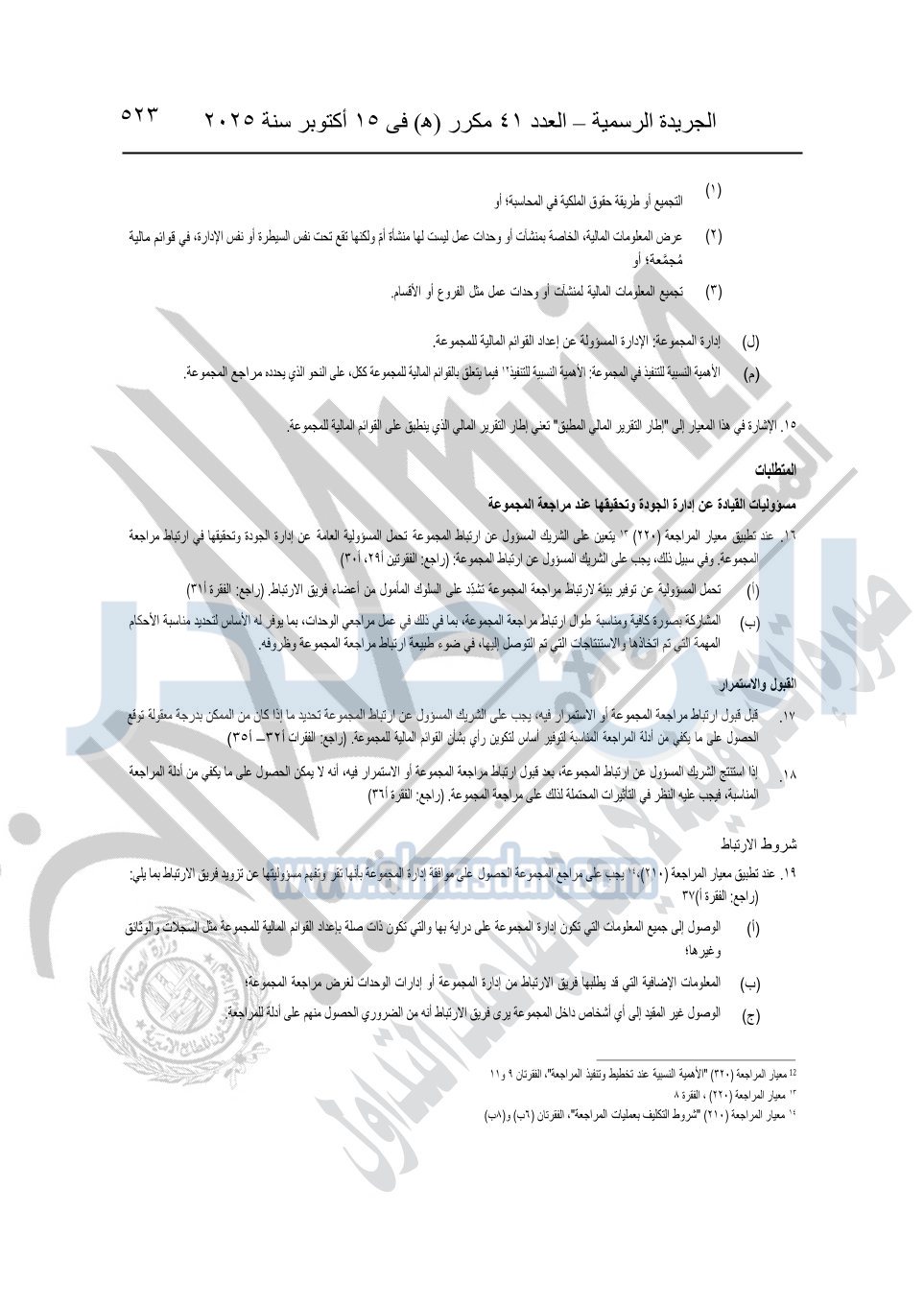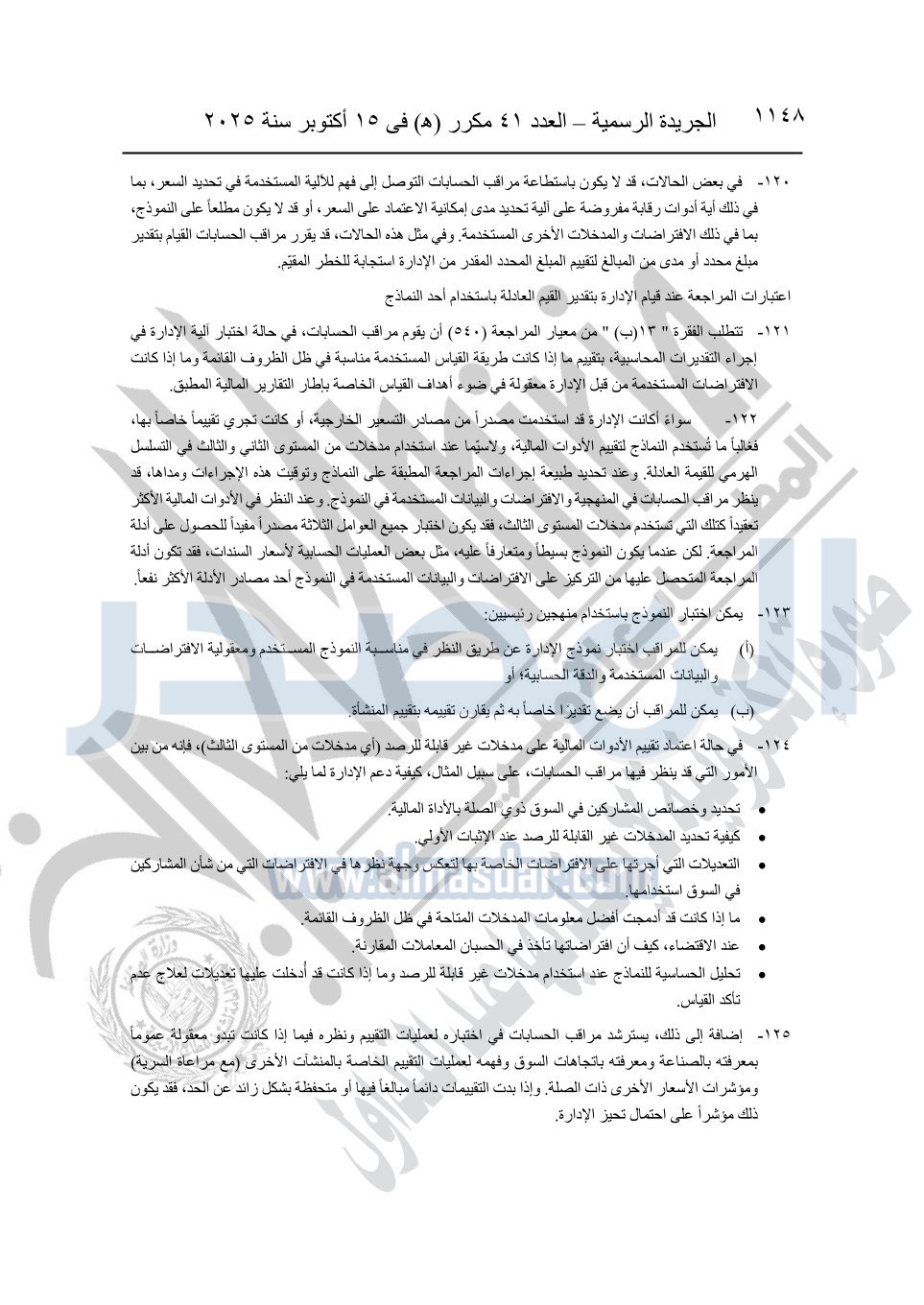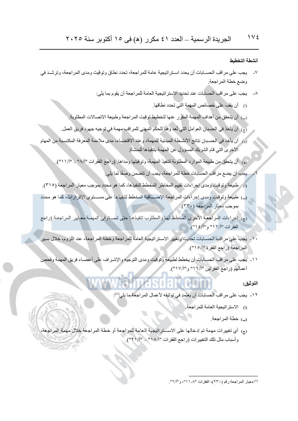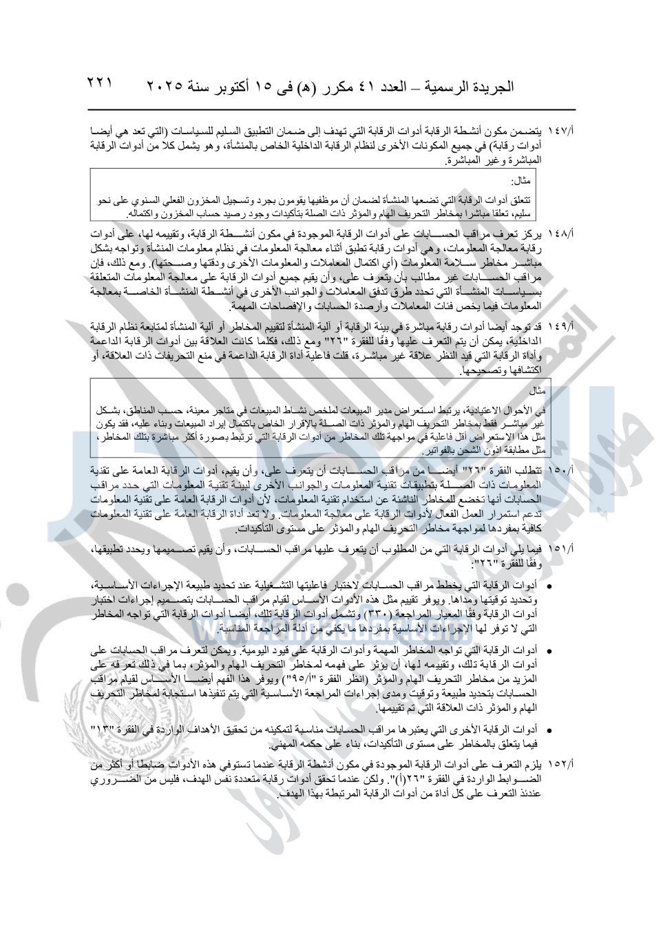 نشرت الجريدة الرسمية في العدد 41 مكرر "هـ" الصادر في 15 أكتوبر سنة 2025، قرار رئيس مجلس الوزراء رقم 3725 لسنة 2025، بشأن العمل بالمعايير المصرية للمراجعة والفحص المحدود ومهام التأكد الأخرى المرافقة لهذا القرار.