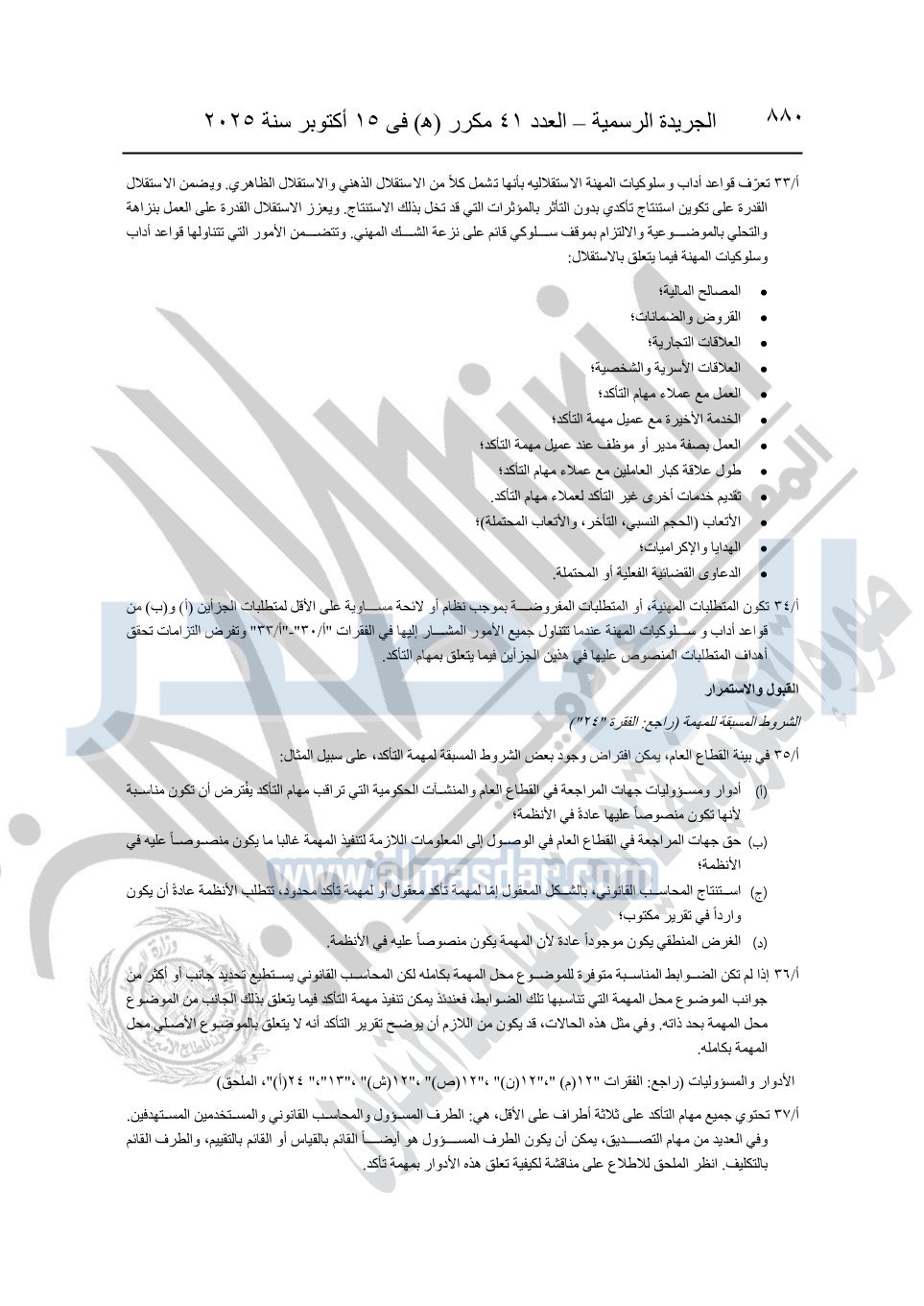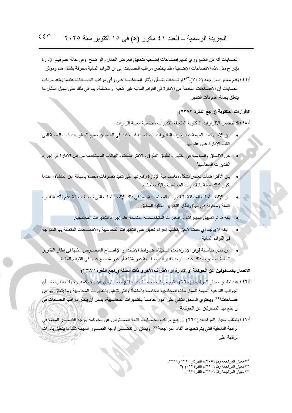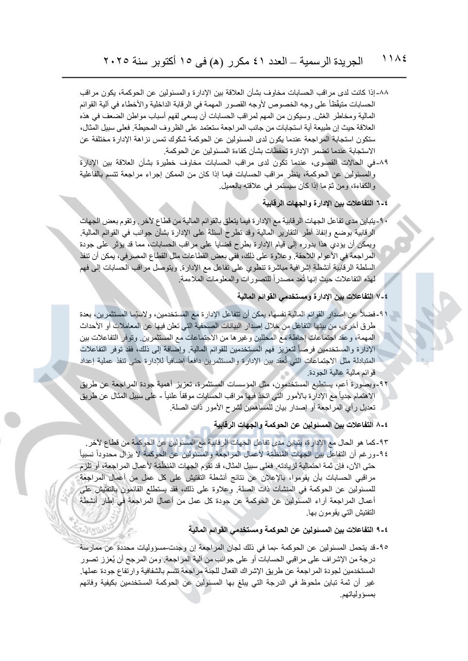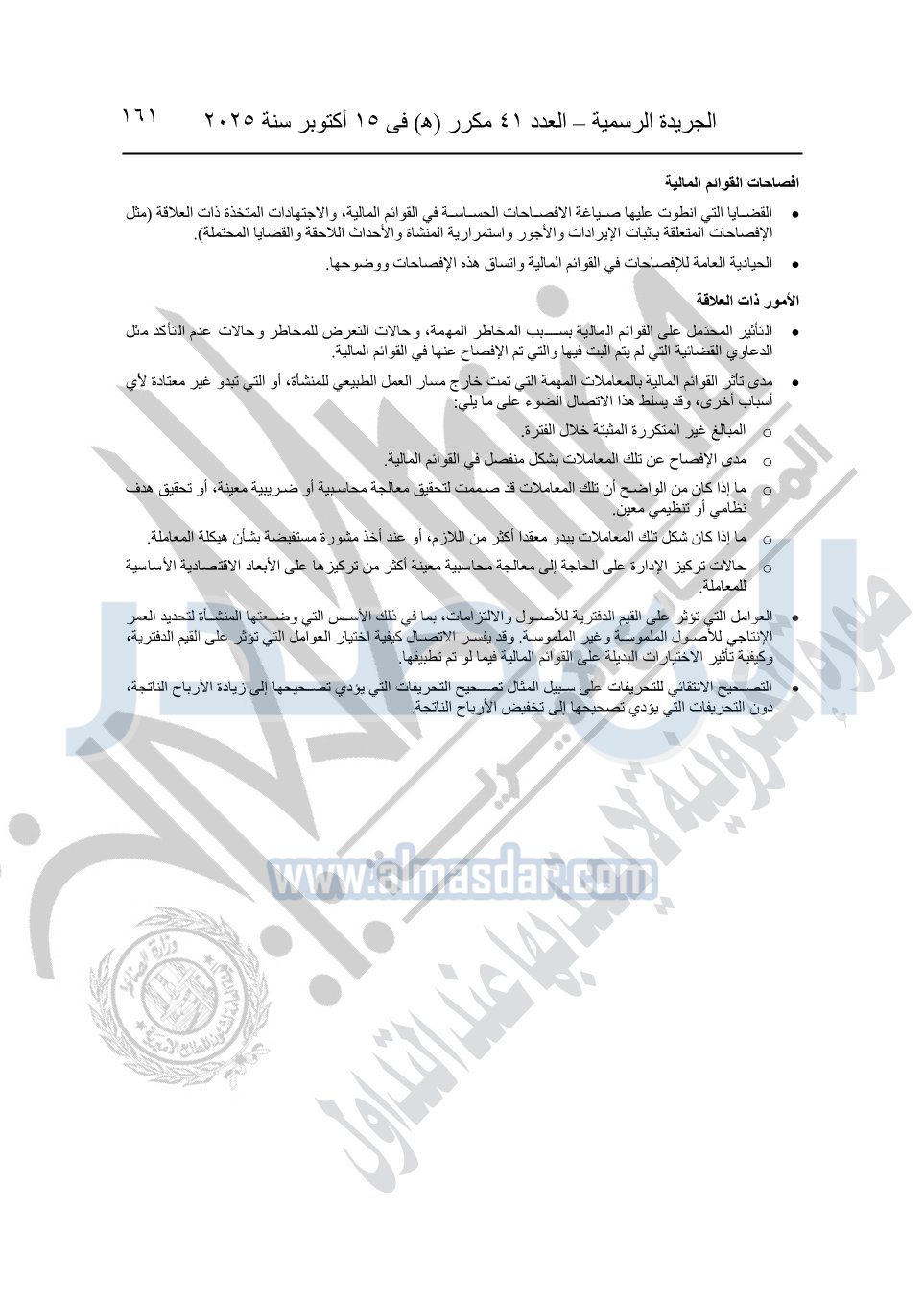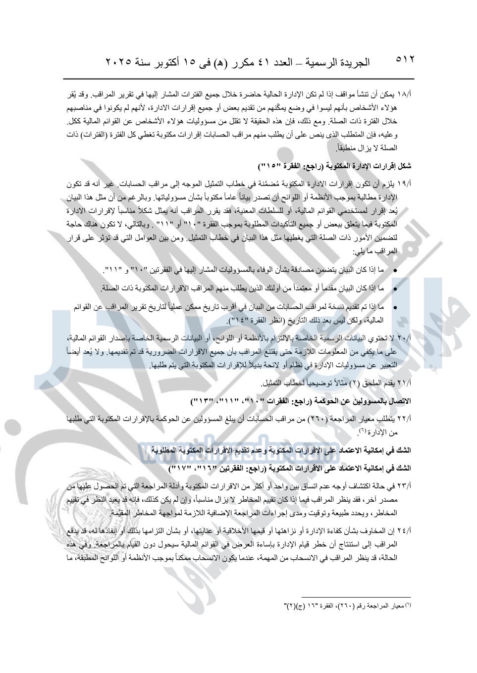 نشرت الجريدة الرسمية في العدد 41 مكرر "هـ" الصادر في 15 أكتوبر سنة 2025، قرار رئيس مجلس الوزراء رقم 3725 لسنة 2025، بشأن العمل بالمعايير المصرية للمراجعة والفحص المحدود ومهام التأكد الأخرى المرافقة لهذا القرار.