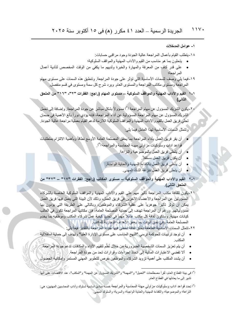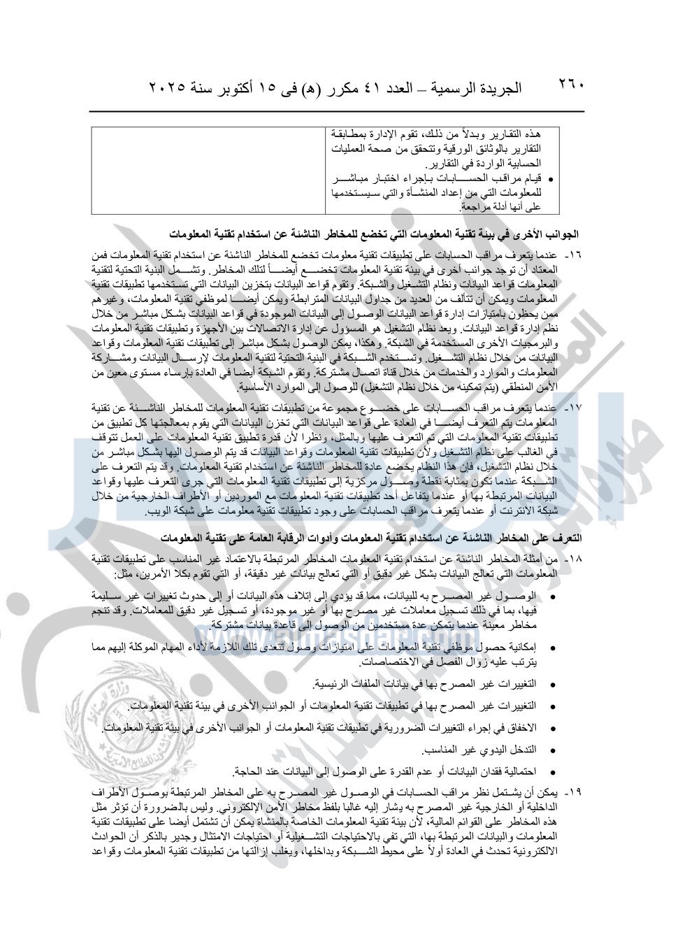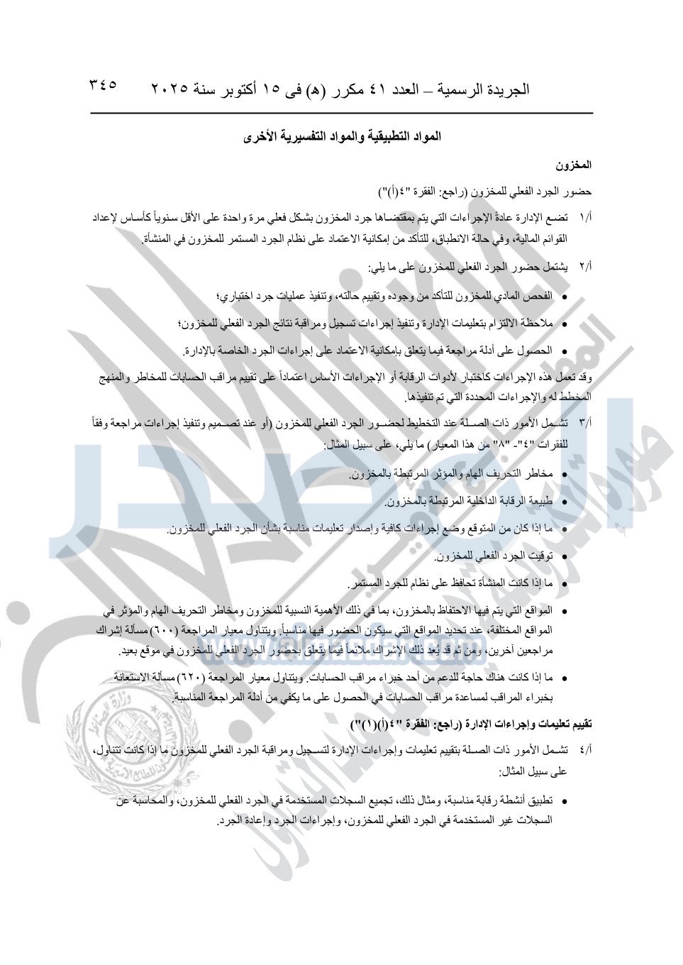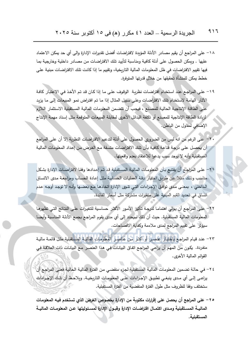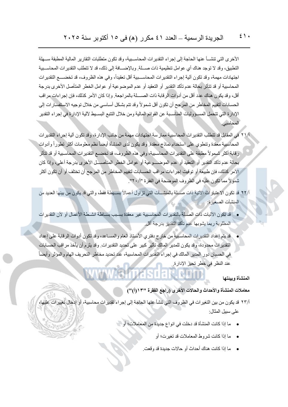 نشرت الجريدة الرسمية في العدد 41 مكرر "هـ" الصادر في 15 أكتوبر سنة 2025، قرار رئيس مجلس الوزراء رقم 3725 لسنة 2025، بشأن العمل بالمعايير المصرية للمراجعة والفحص المحدود ومهام التأكد الأخرى المرافقة لهذا القرار.