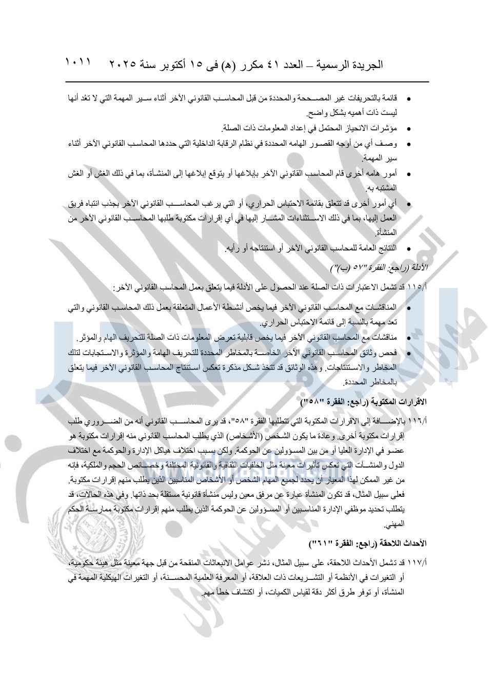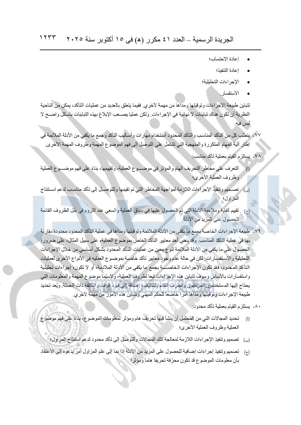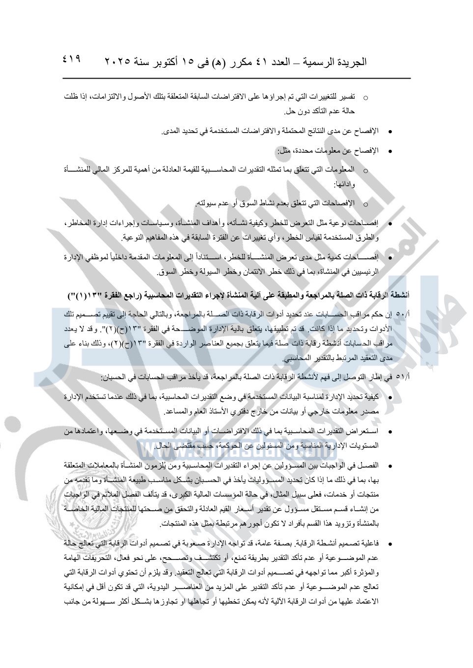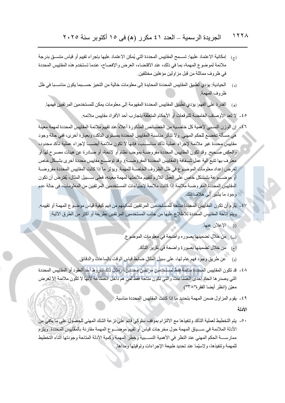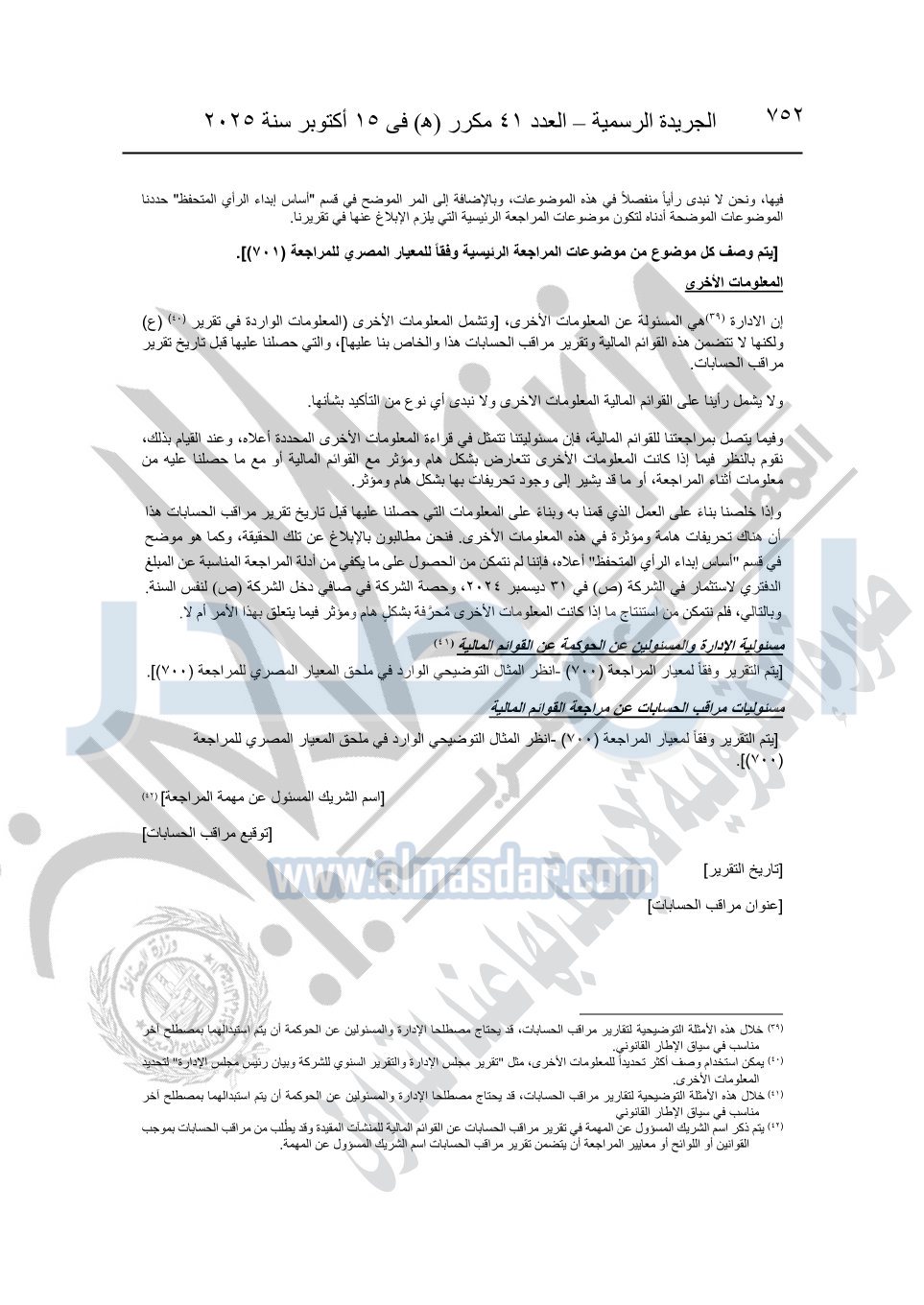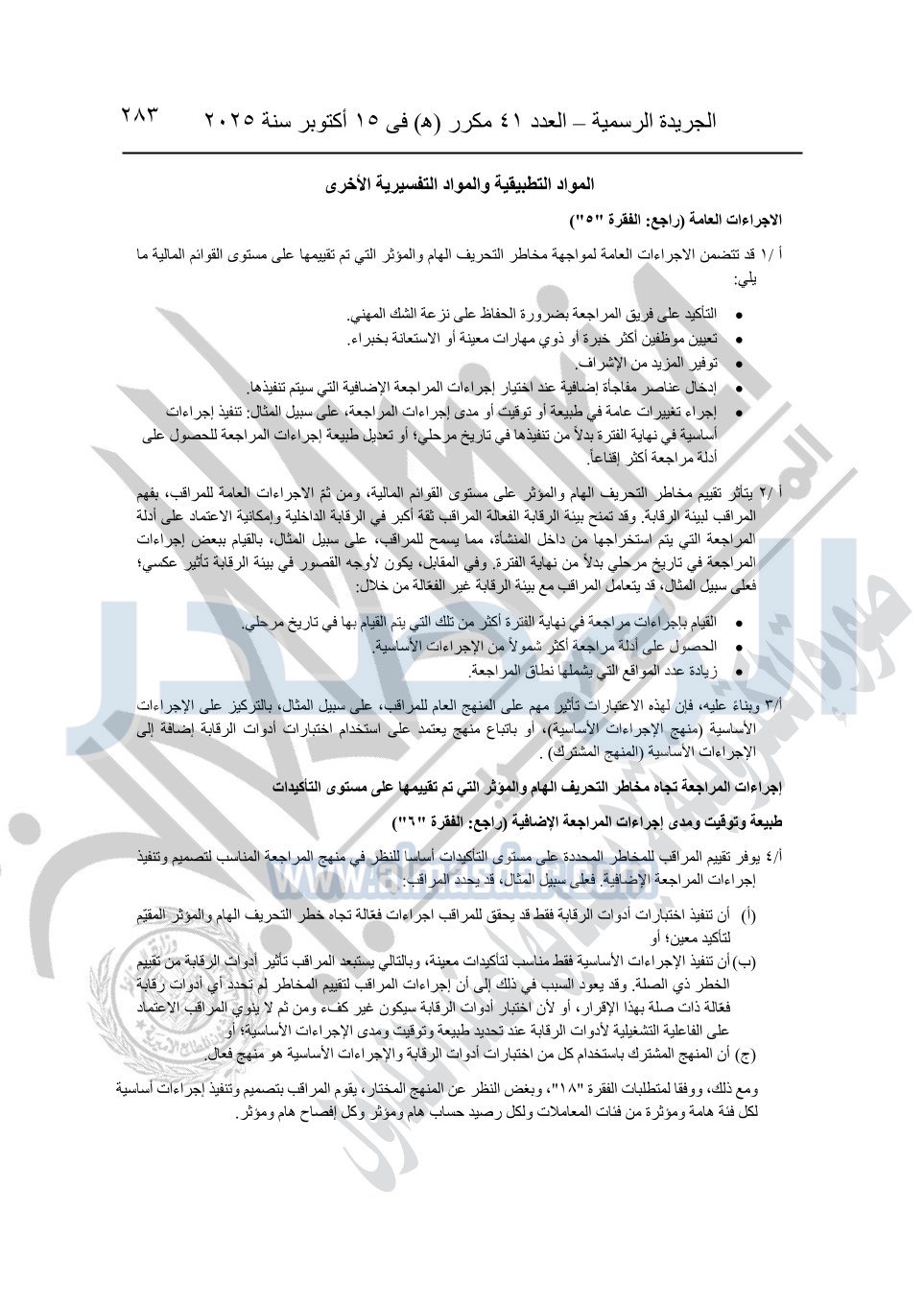 نشرت الجريدة الرسمية في العدد 41 مكرر "هـ" الصادر في 15 أكتوبر سنة 2025، قرار رئيس مجلس الوزراء رقم 3725 لسنة 2025، بشأن العمل بالمعايير المصرية للمراجعة والفحص المحدود ومهام التأكد الأخرى المرافقة لهذا القرار.