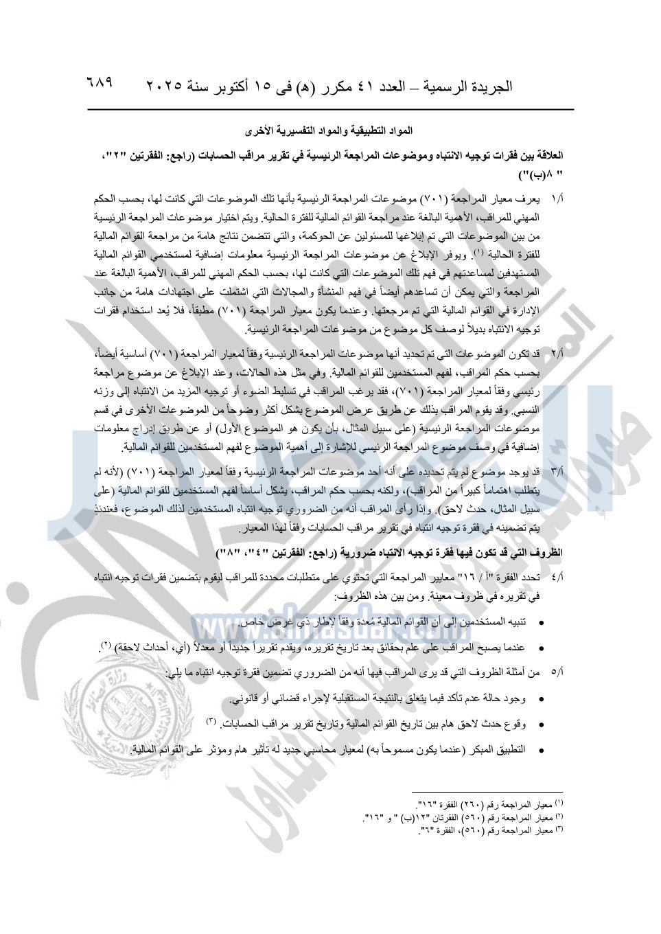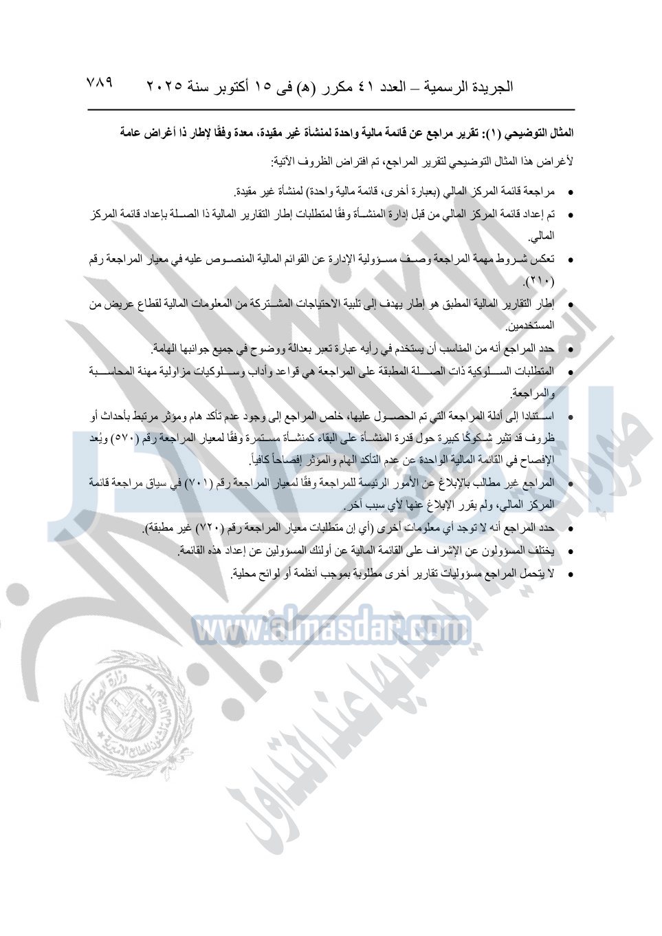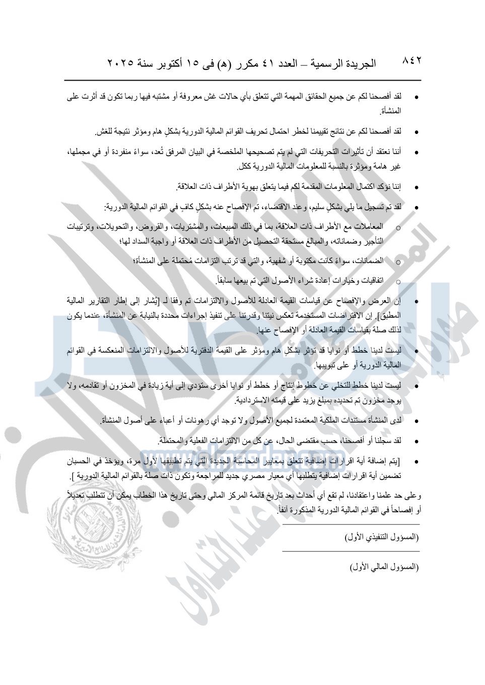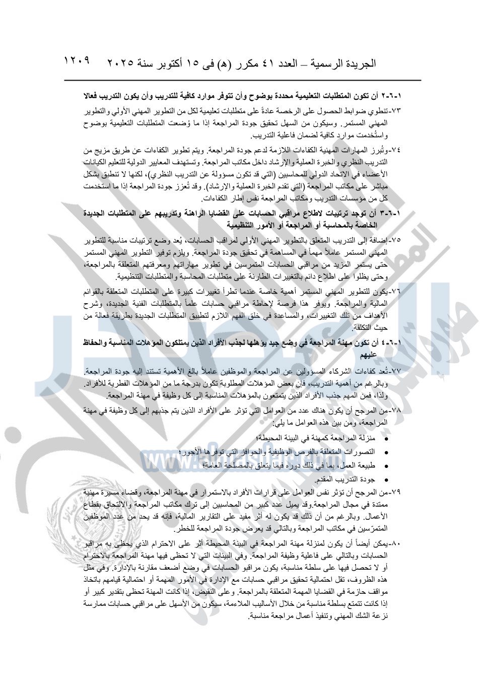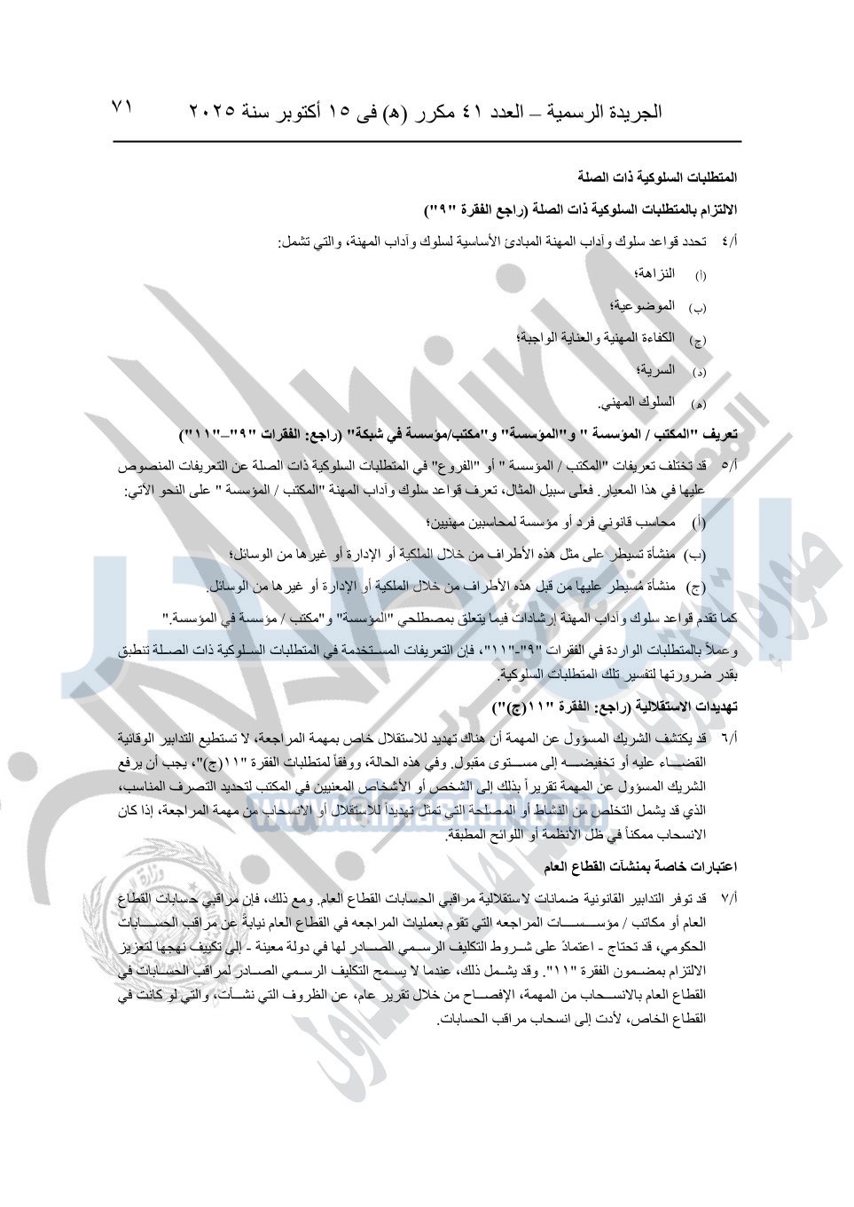 نشرت الجريدة الرسمية في العدد 41 مكرر "هـ" الصادر في 15 أكتوبر سنة 2025، قرار رئيس مجلس الوزراء رقم 3725 لسنة 2025، بشأن العمل بالمعايير المصرية للمراجعة والفحص المحدود ومهام التأكد الأخرى المرافقة لهذا القرار.