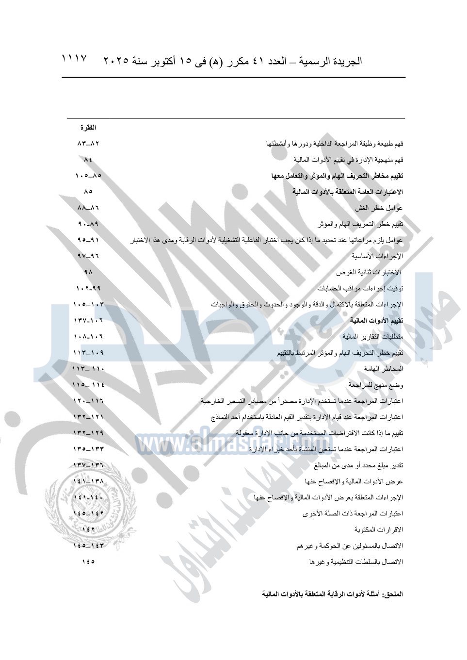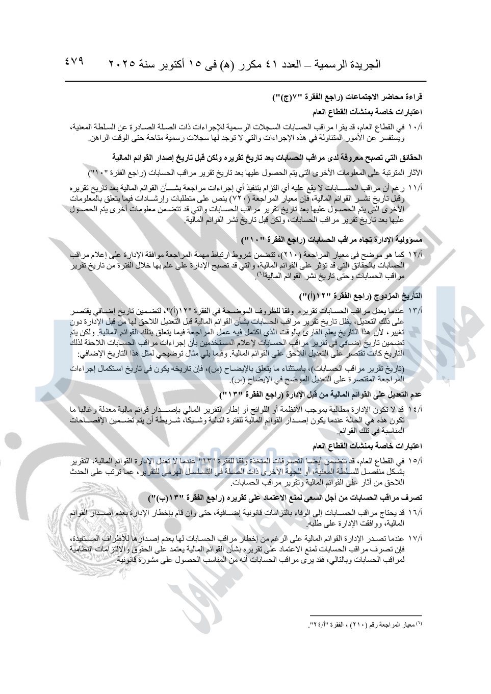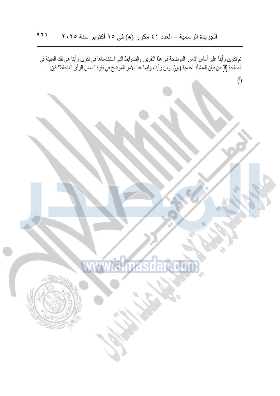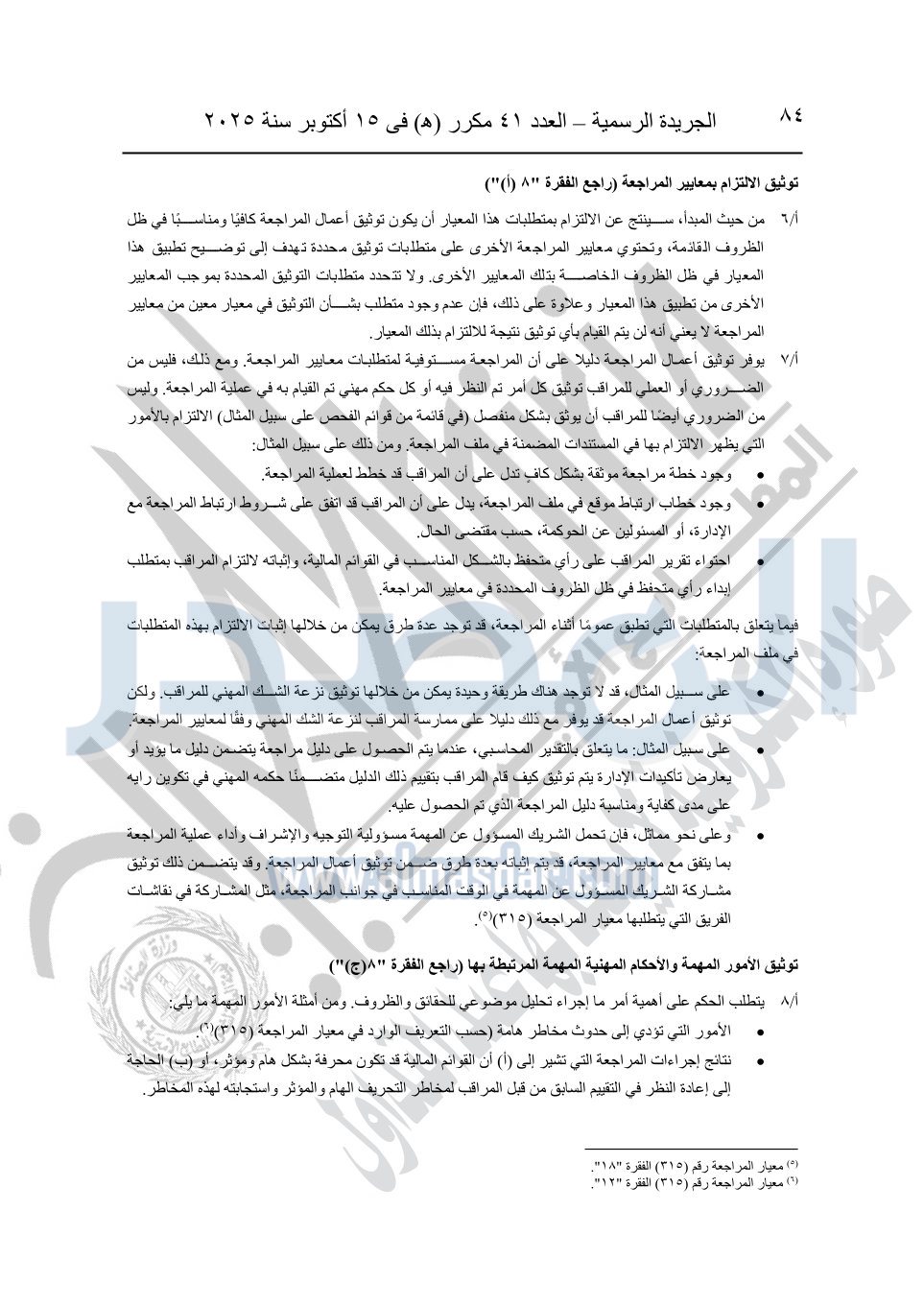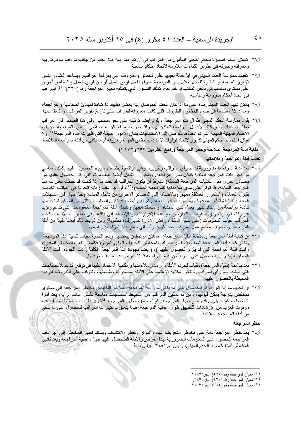 نشرت الجريدة الرسمية في العدد 41 مكرر "هـ" الصادر في 15 أكتوبر سنة 2025، قرار رئيس مجلس الوزراء رقم 3725 لسنة 2025، بشأن العمل بالمعايير المصرية للمراجعة والفحص المحدود ومهام التأكد الأخرى المرافقة لهذا القرار.