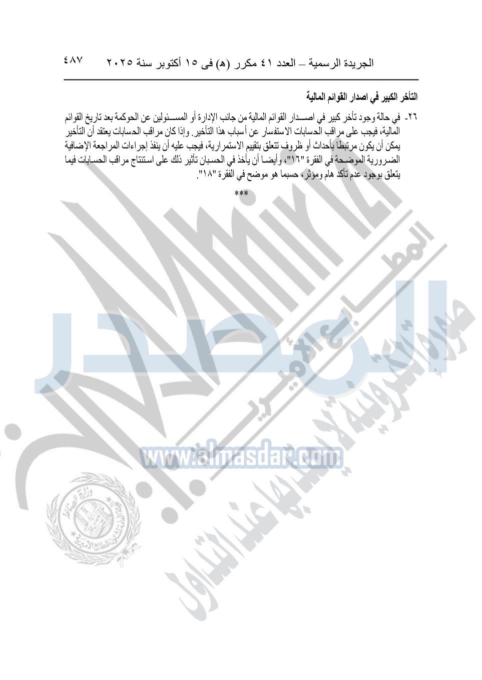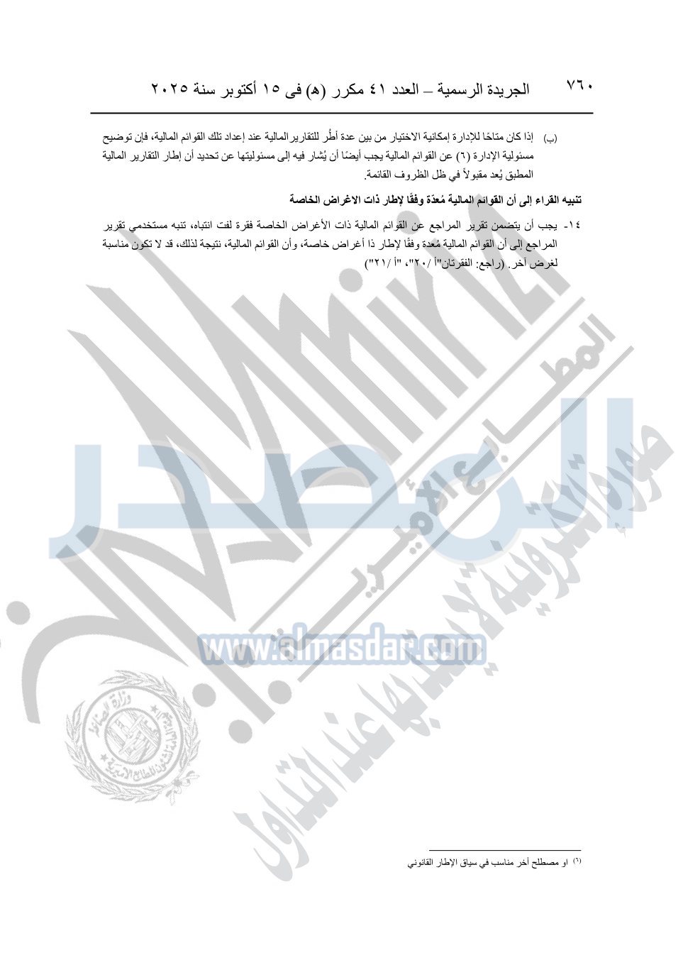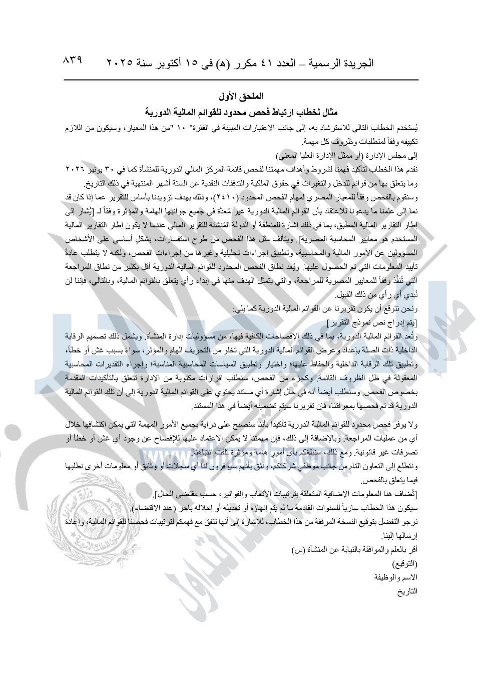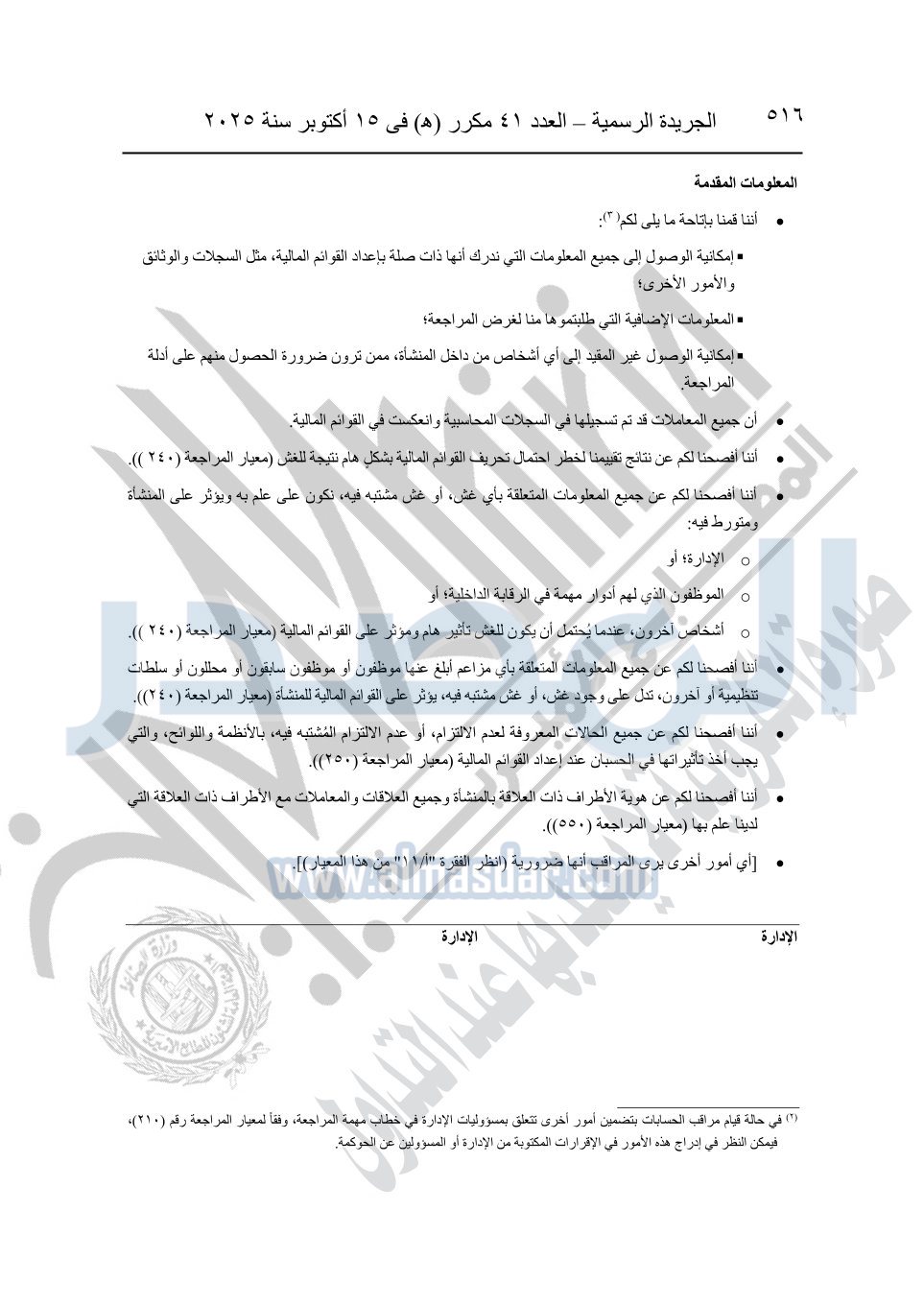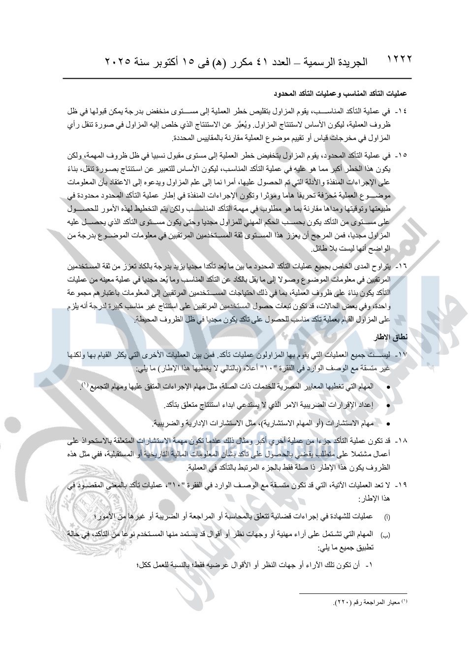 نشرت الجريدة الرسمية في العدد 41 مكرر "هـ" الصادر في 15 أكتوبر سنة 2025، قرار رئيس مجلس الوزراء رقم 3725 لسنة 2025، بشأن العمل بالمعايير المصرية للمراجعة والفحص المحدود ومهام التأكد الأخرى المرافقة لهذا القرار.