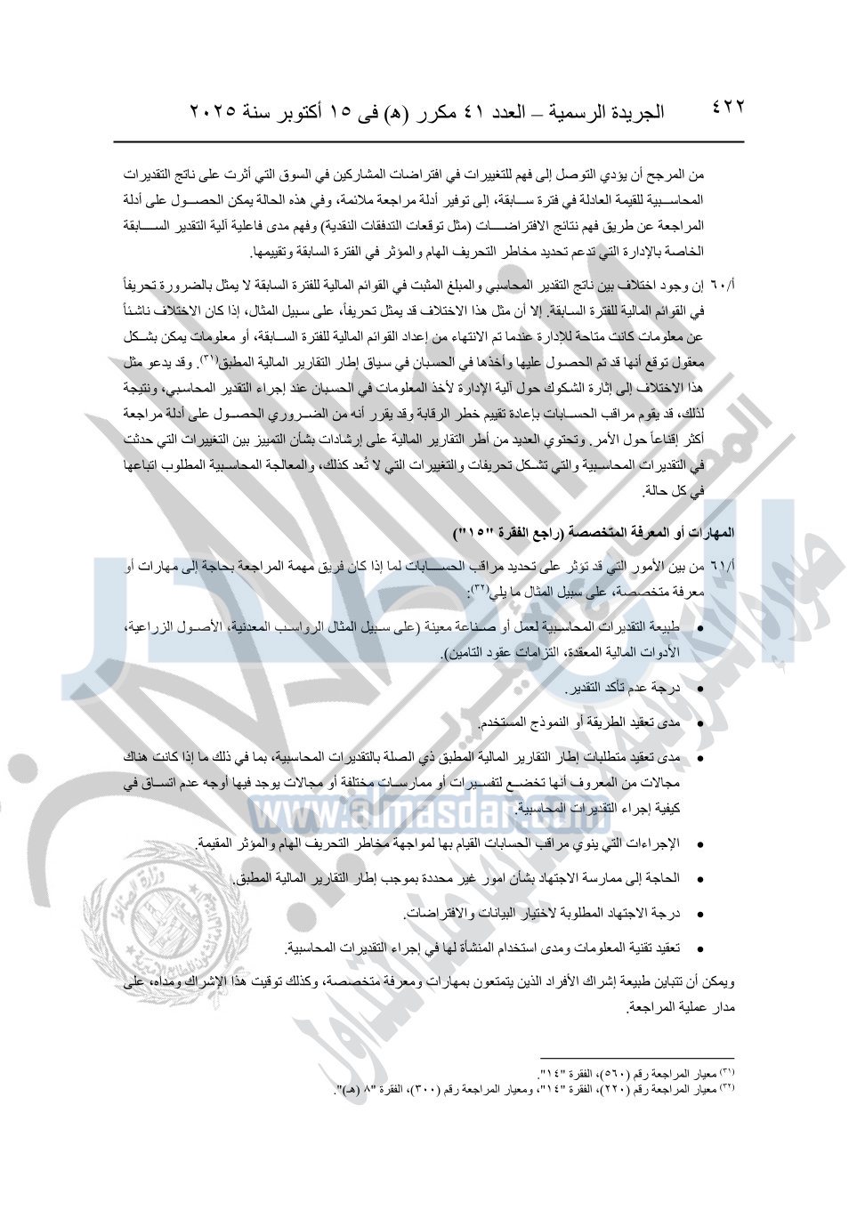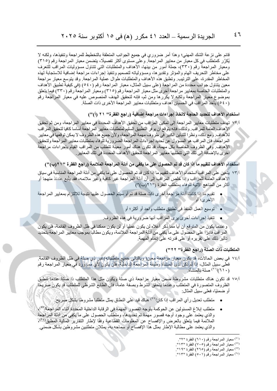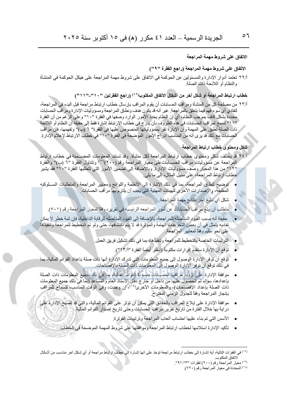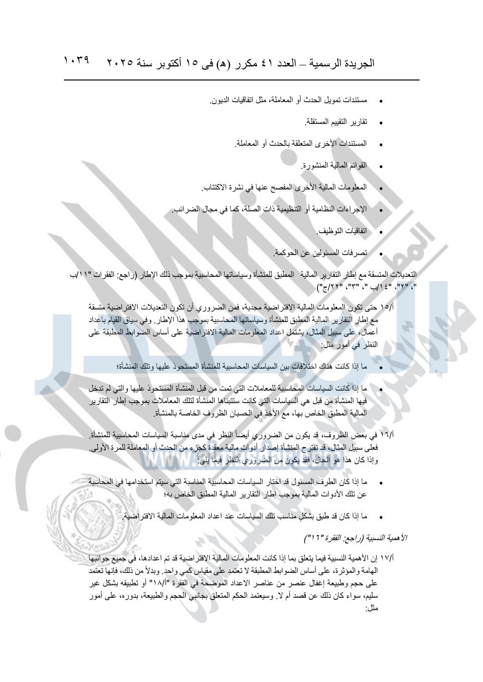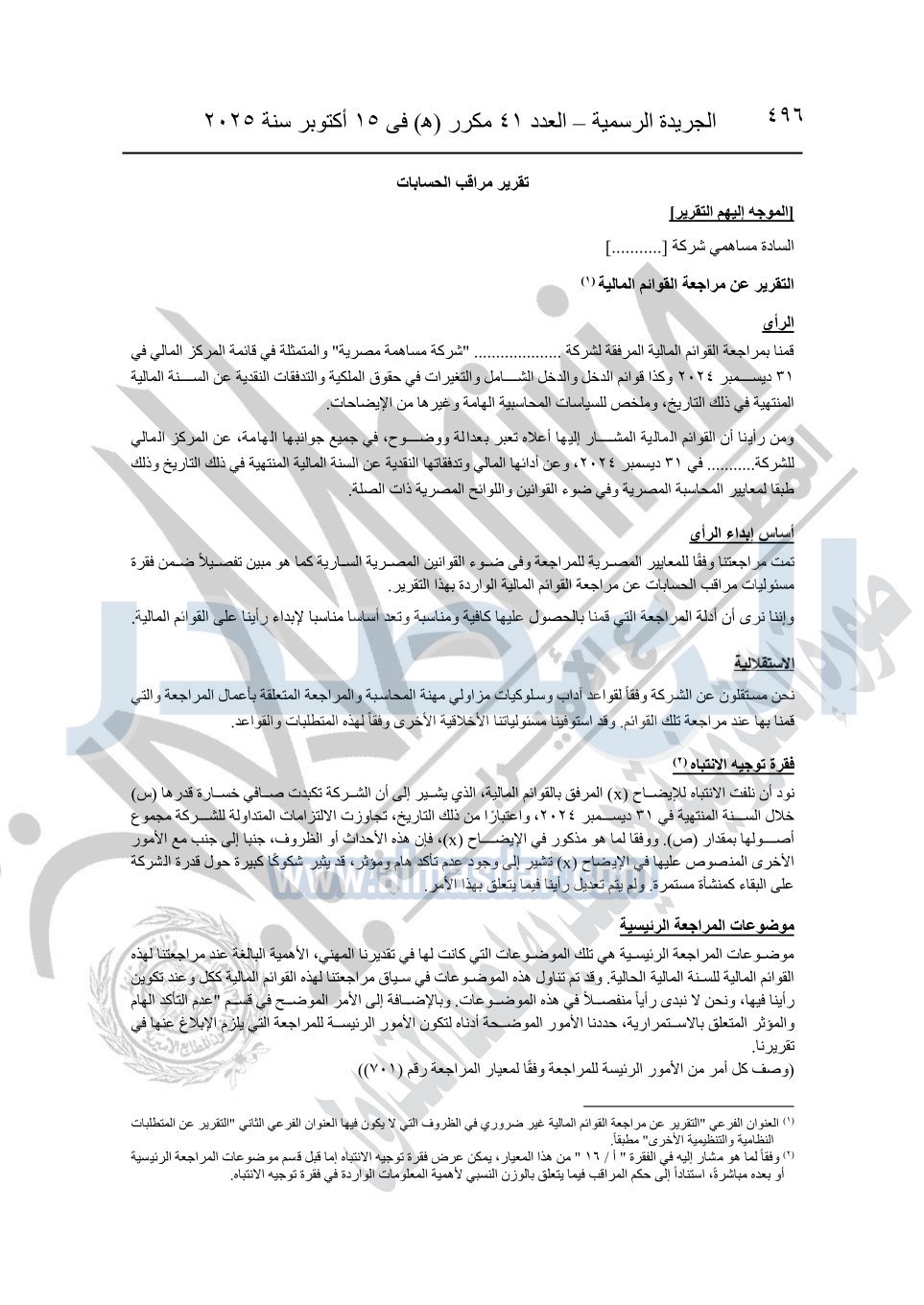 نشرت الجريدة الرسمية في العدد 41 مكرر "هـ" الصادر في 15 أكتوبر سنة 2025، قرار رئيس مجلس الوزراء رقم 3725 لسنة 2025، بشأن العمل بالمعايير المصرية للمراجعة والفحص المحدود ومهام التأكد الأخرى المرافقة لهذا القرار.