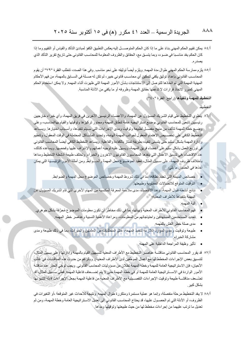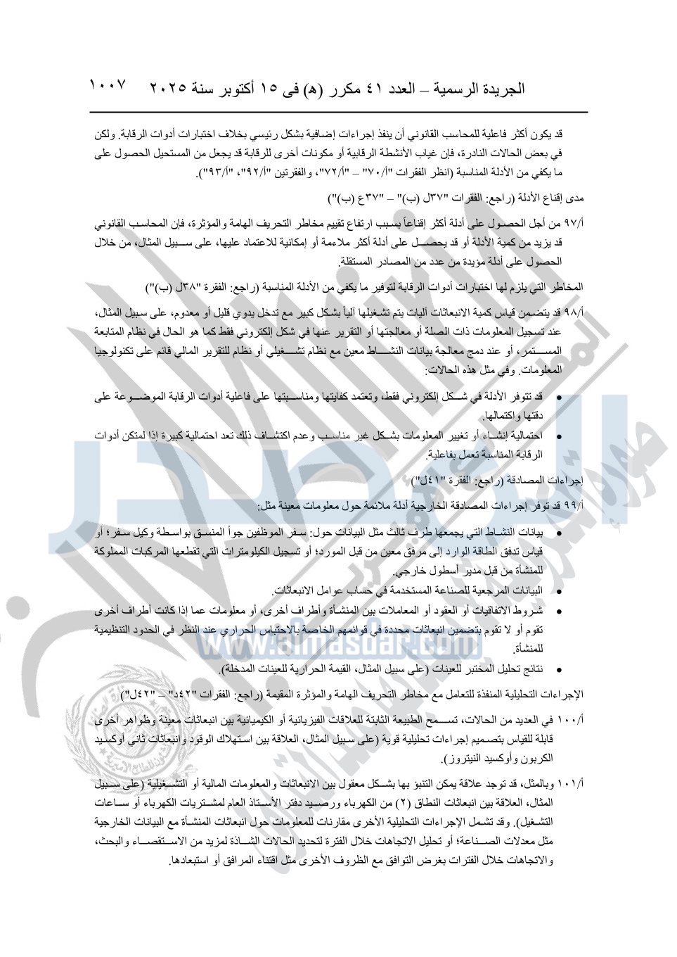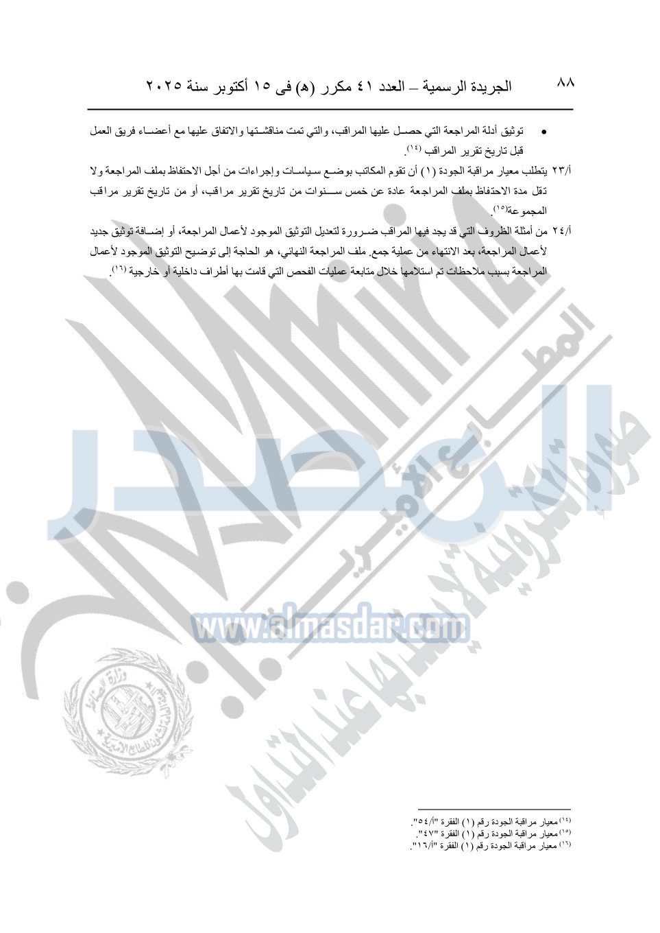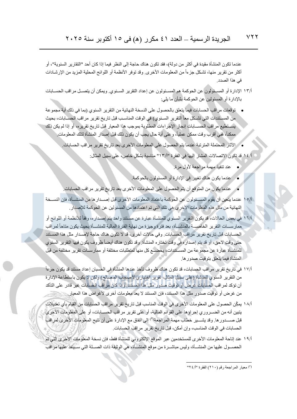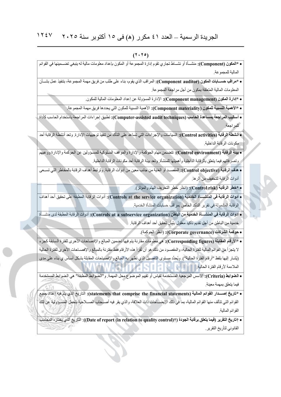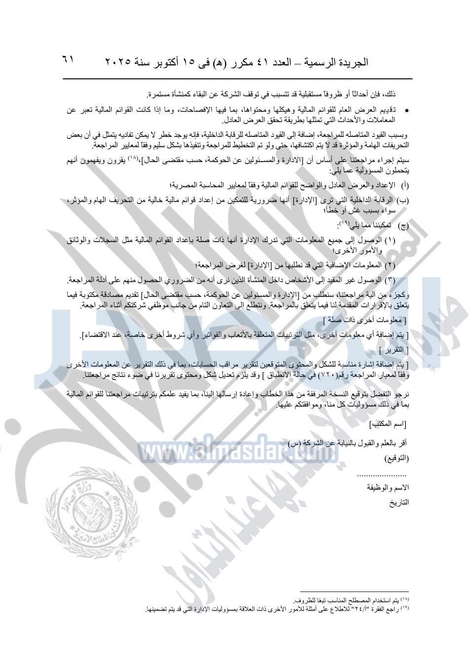 نشرت الجريدة الرسمية في العدد 41 مكرر "هـ" الصادر في 15 أكتوبر سنة 2025، قرار رئيس مجلس الوزراء رقم 3725 لسنة 2025، بشأن العمل بالمعايير المصرية للمراجعة والفحص المحدود ومهام التأكد الأخرى المرافقة لهذا القرار.
