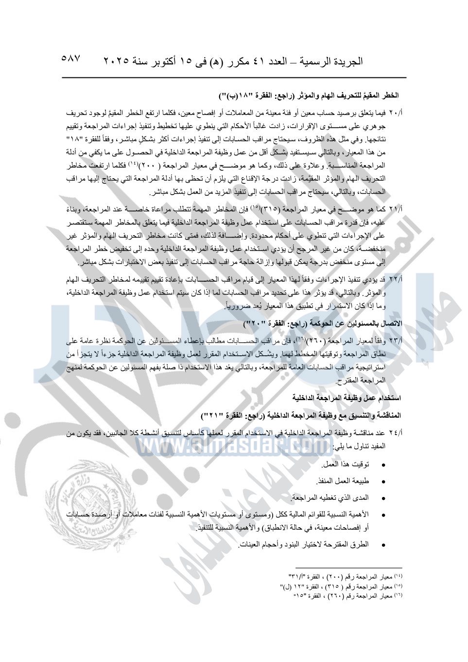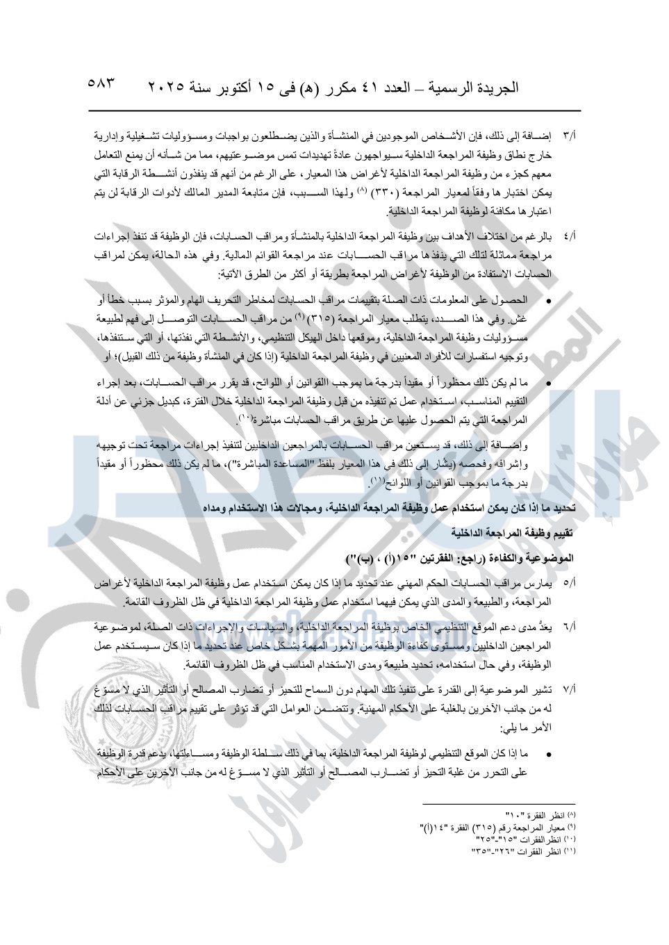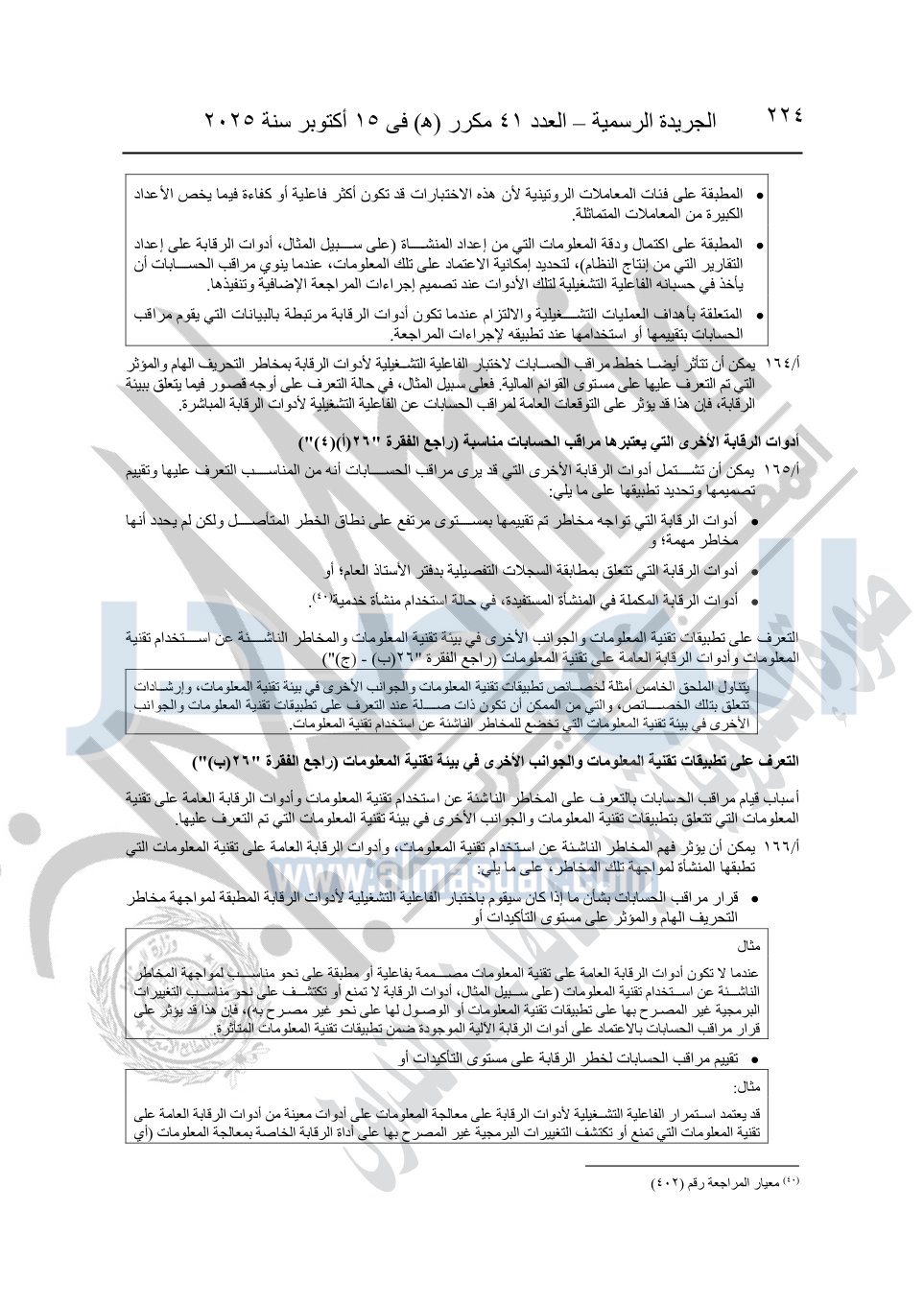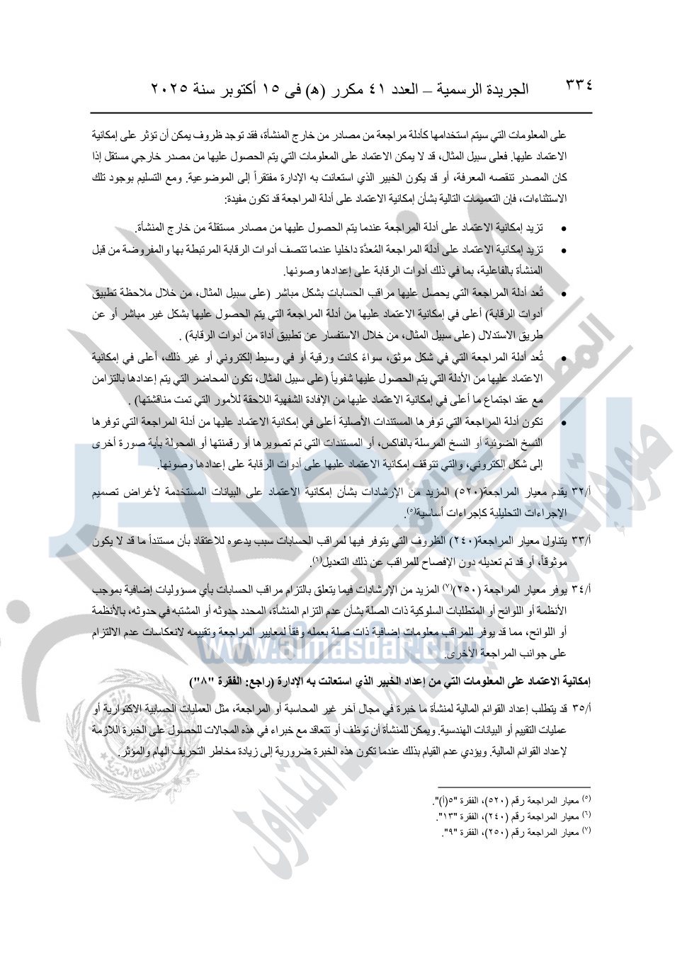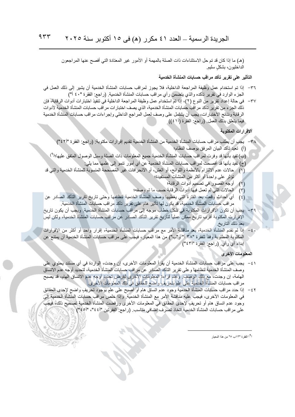 نشرت الجريدة الرسمية في العدد 41 مكرر "هـ" الصادر في 15 أكتوبر سنة 2025، قرار رئيس مجلس الوزراء رقم 3725 لسنة 2025، بشأن العمل بالمعايير المصرية للمراجعة والفحص المحدود ومهام التأكد الأخرى المرافقة لهذا القرار.