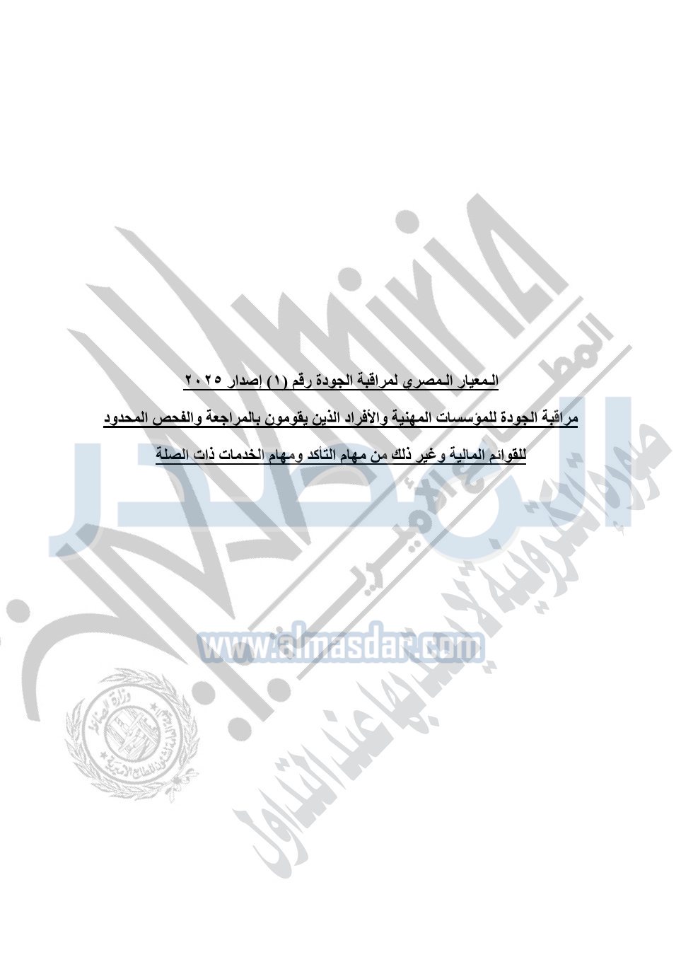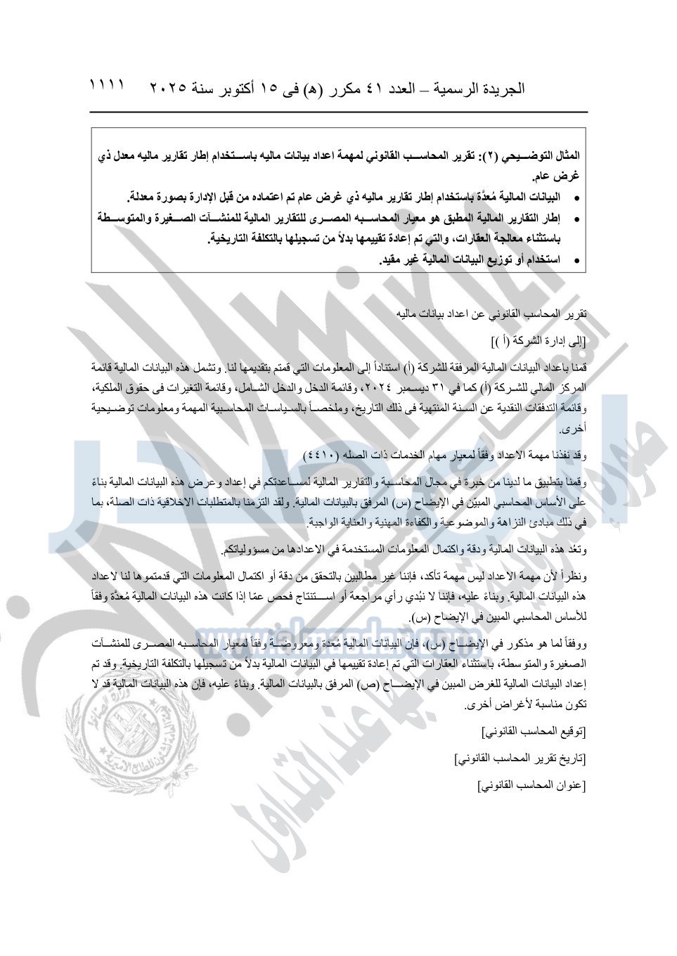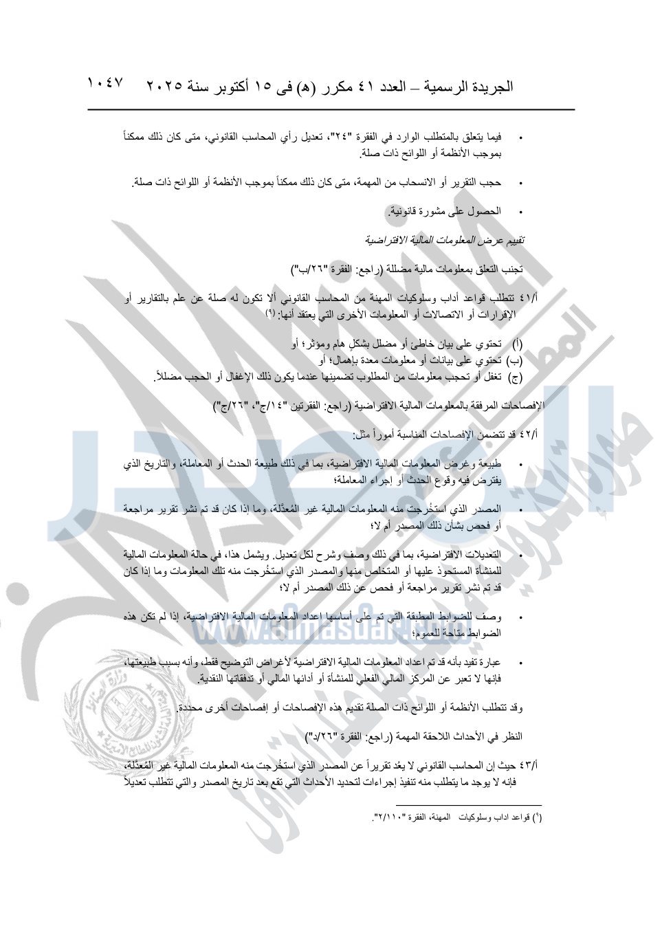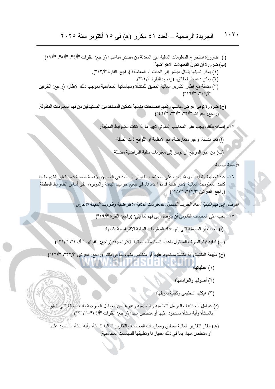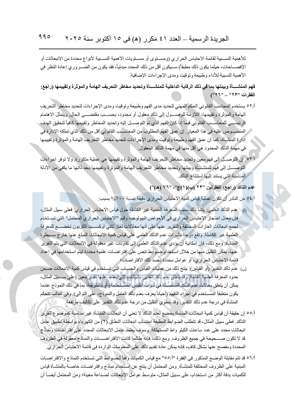 نشرت الجريدة الرسمية في العدد 41 مكرر "هـ" الصادر في 15 أكتوبر سنة 2025، قرار رئيس مجلس الوزراء رقم 3725 لسنة 2025، بشأن العمل بالمعايير المصرية للمراجعة والفحص المحدود ومهام التأكد الأخرى المرافقة لهذا القرار.