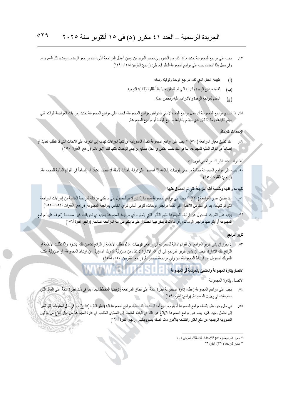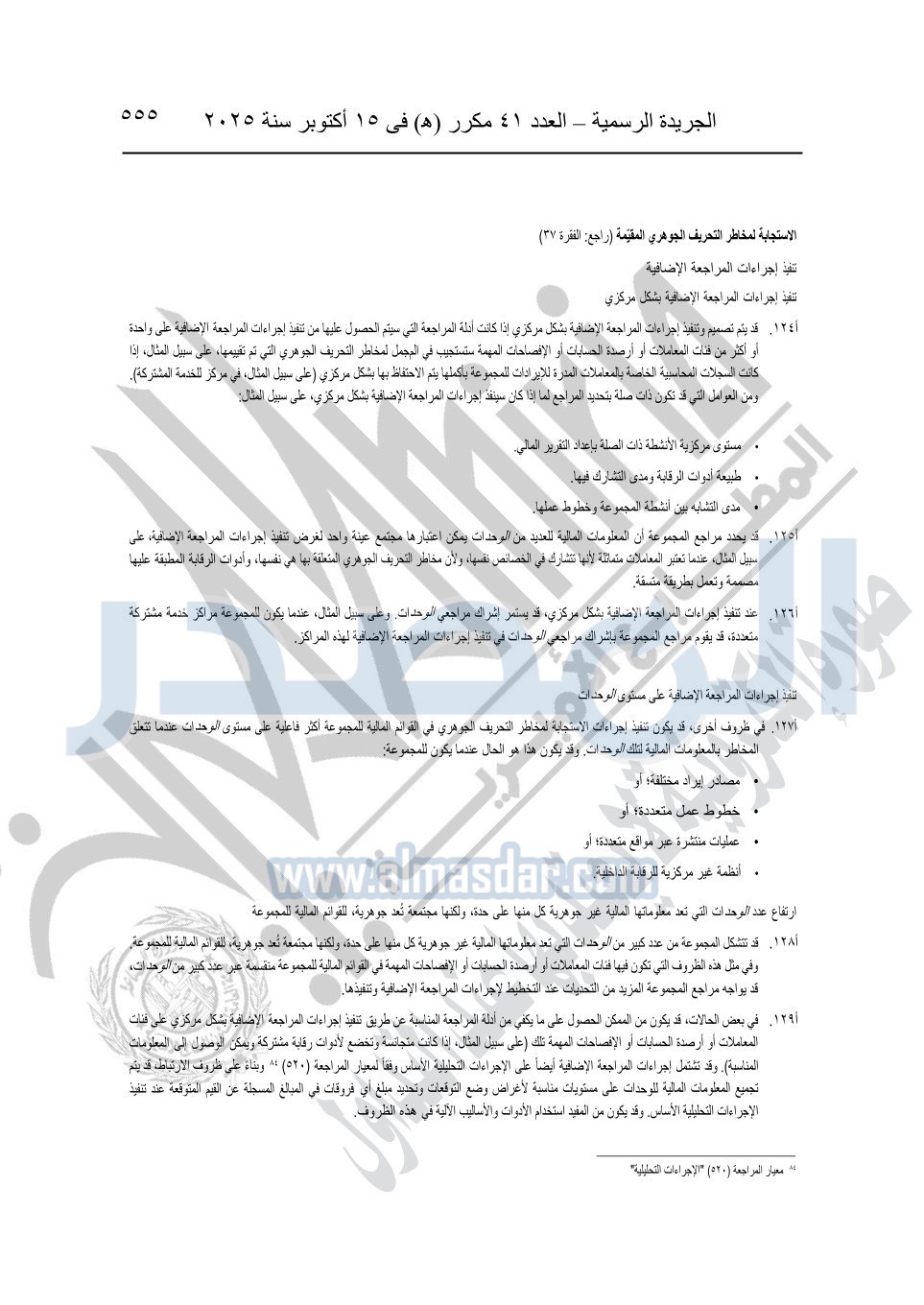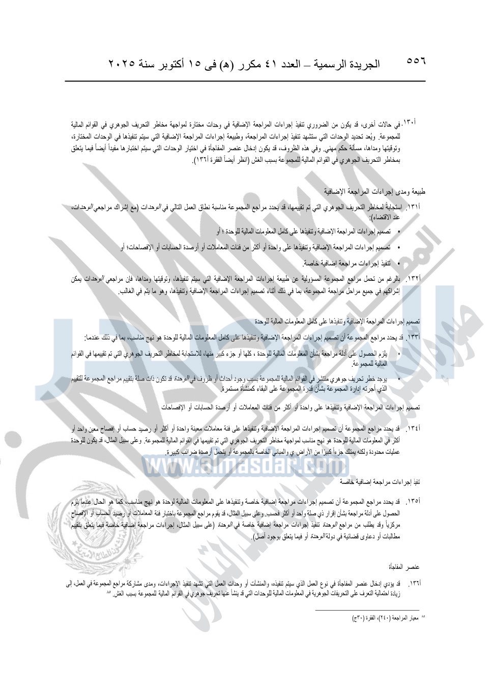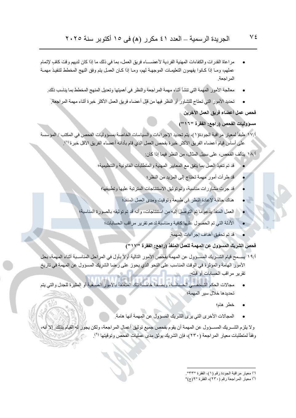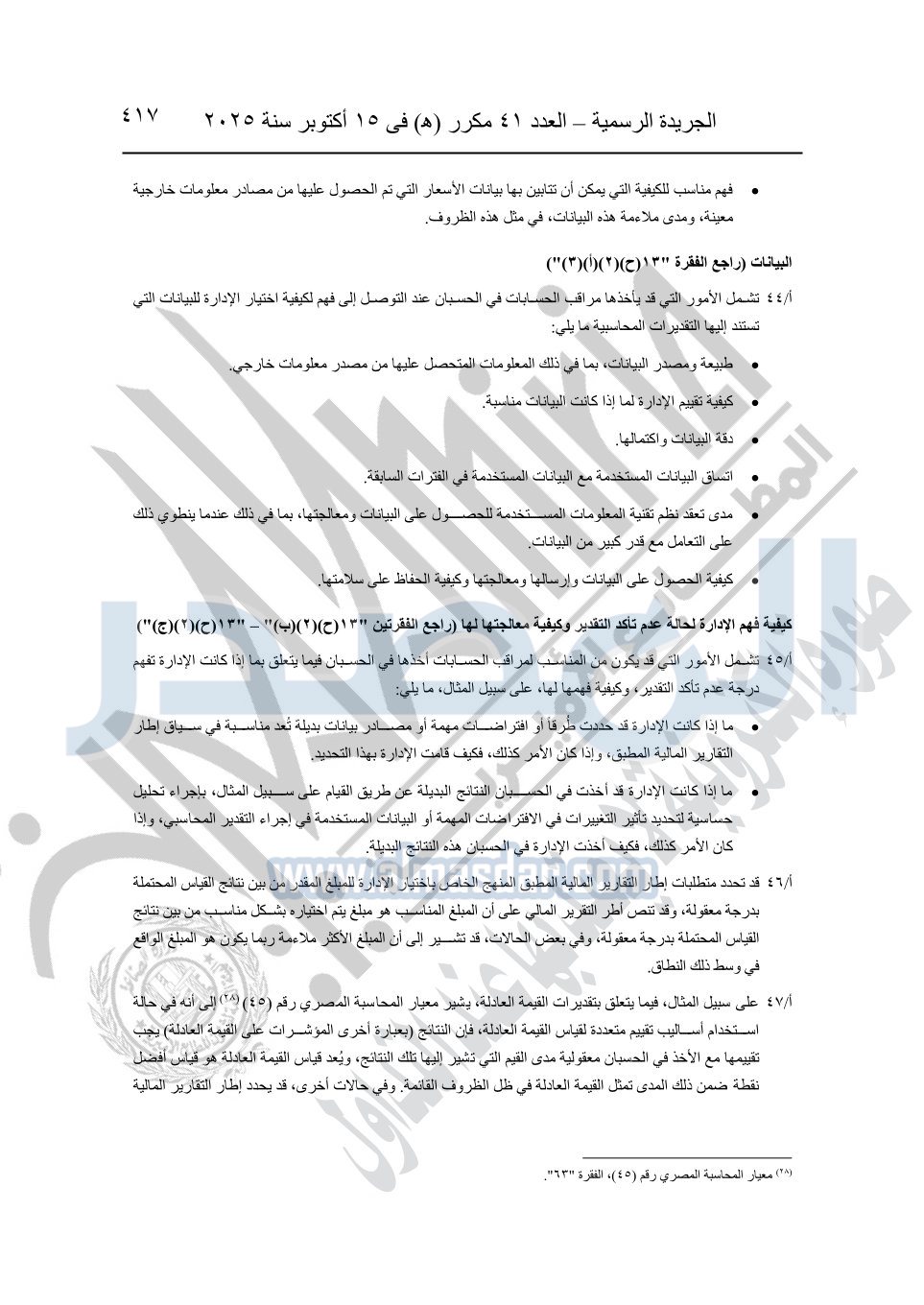 نشرت الجريدة الرسمية في العدد 41 مكرر "هـ" الصادر في 15 أكتوبر سنة 2025، قرار رئيس مجلس الوزراء رقم 3725 لسنة 2025، بشأن العمل بالمعايير المصرية للمراجعة والفحص المحدود ومهام التأكد الأخرى المرافقة لهذا القرار.
