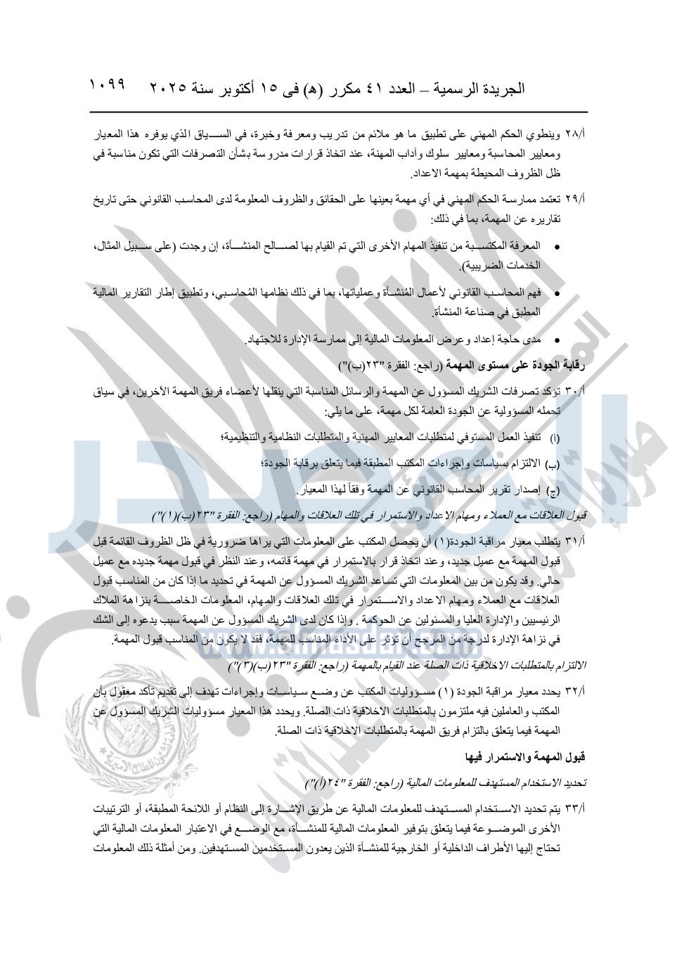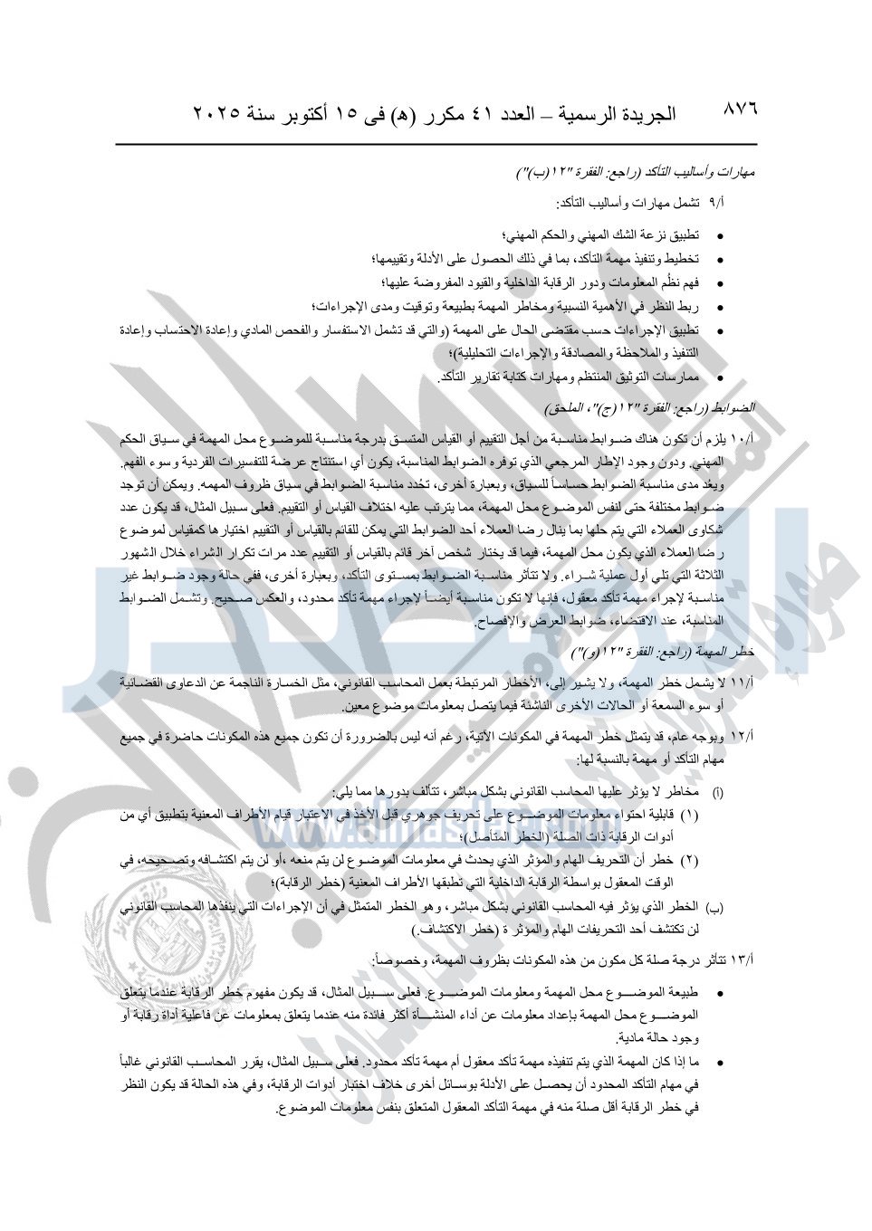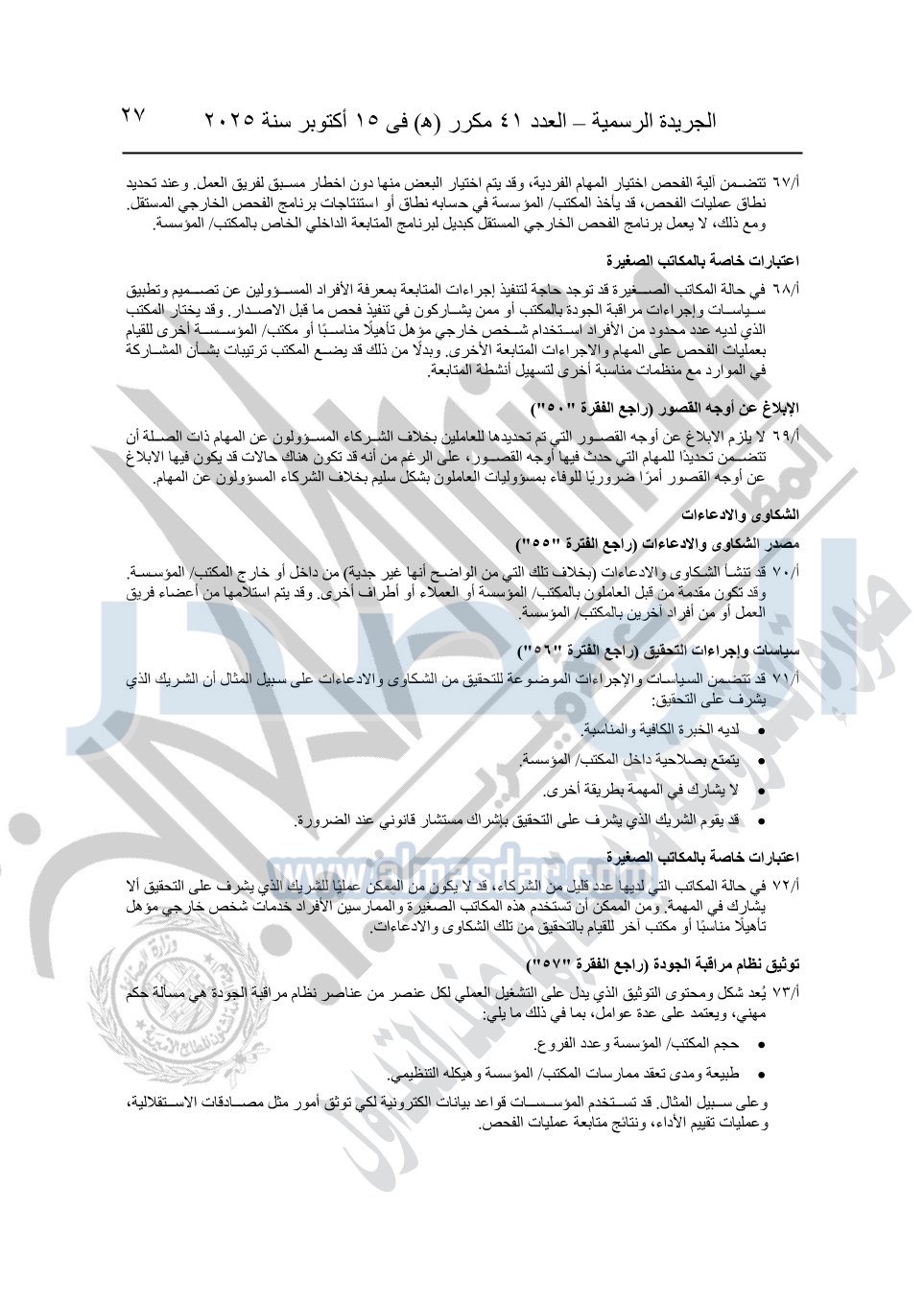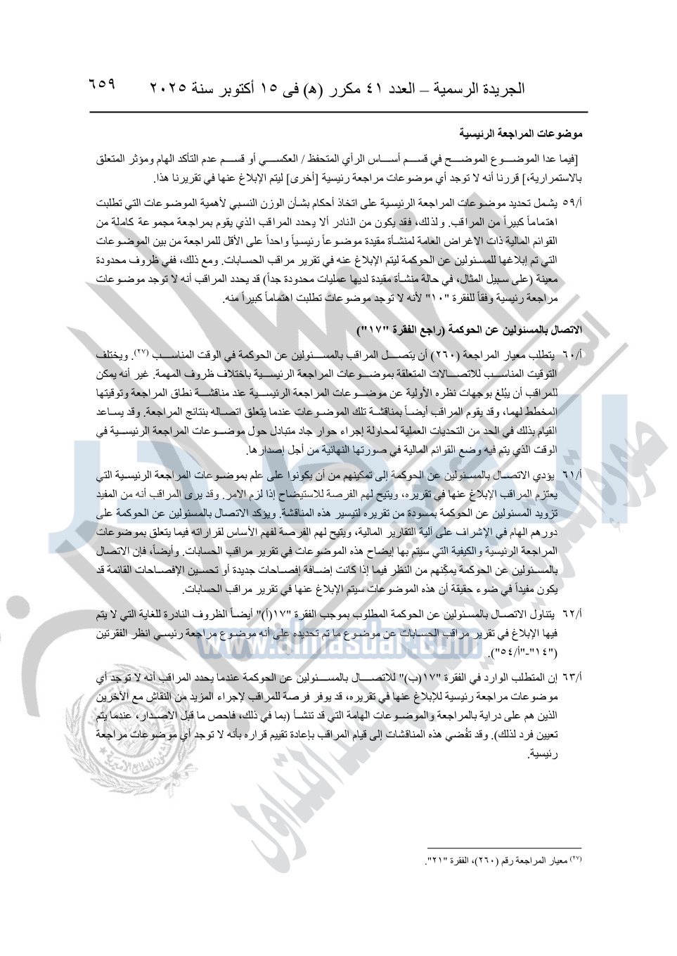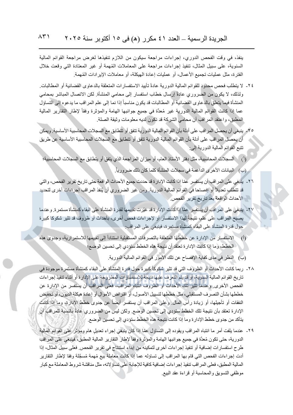 نشرت الجريدة الرسمية في العدد 41 مكرر "هـ" الصادر في 15 أكتوبر سنة 2025، قرار رئيس مجلس الوزراء رقم 3725 لسنة 2025، بشأن العمل بالمعايير المصرية للمراجعة والفحص المحدود ومهام التأكد الأخرى المرافقة لهذا القرار.