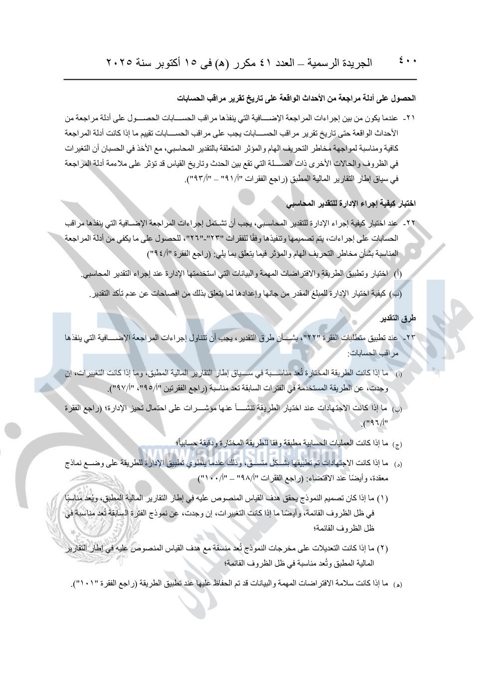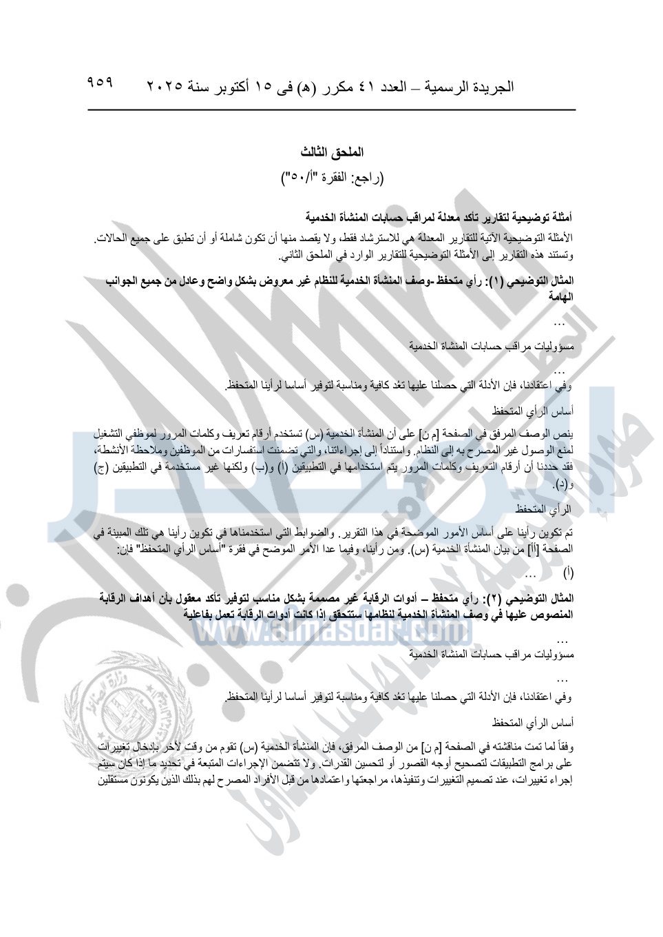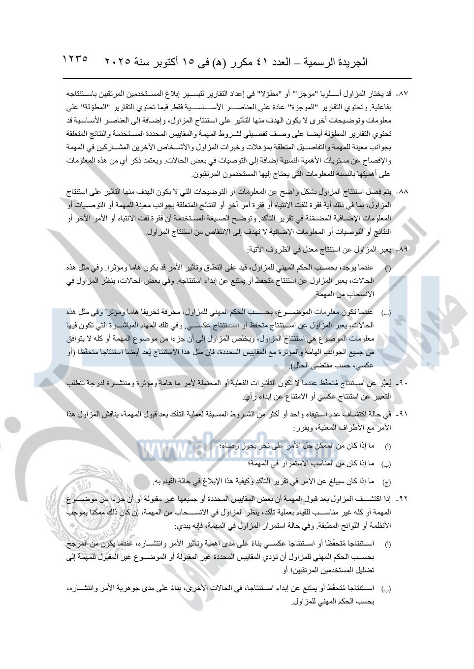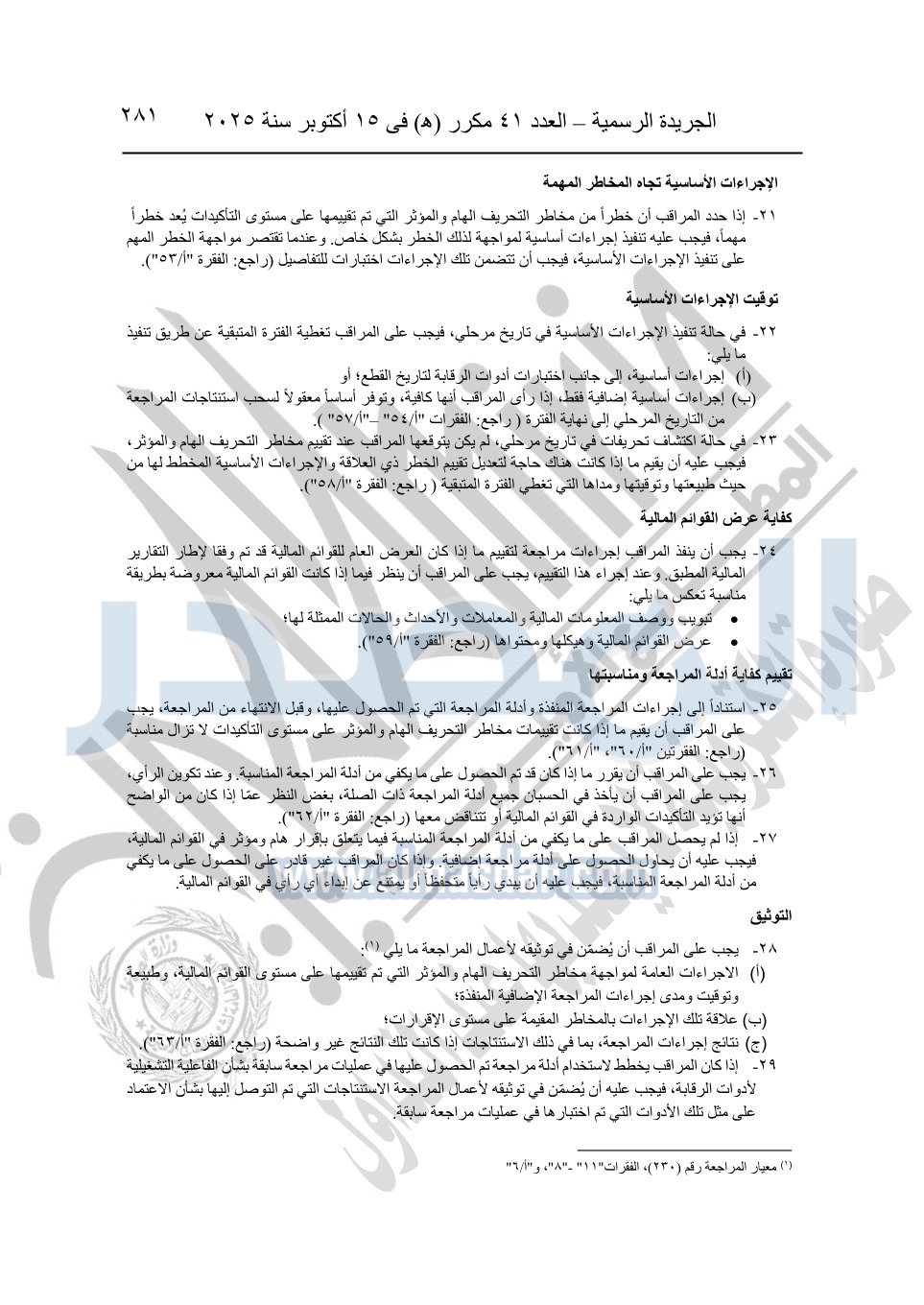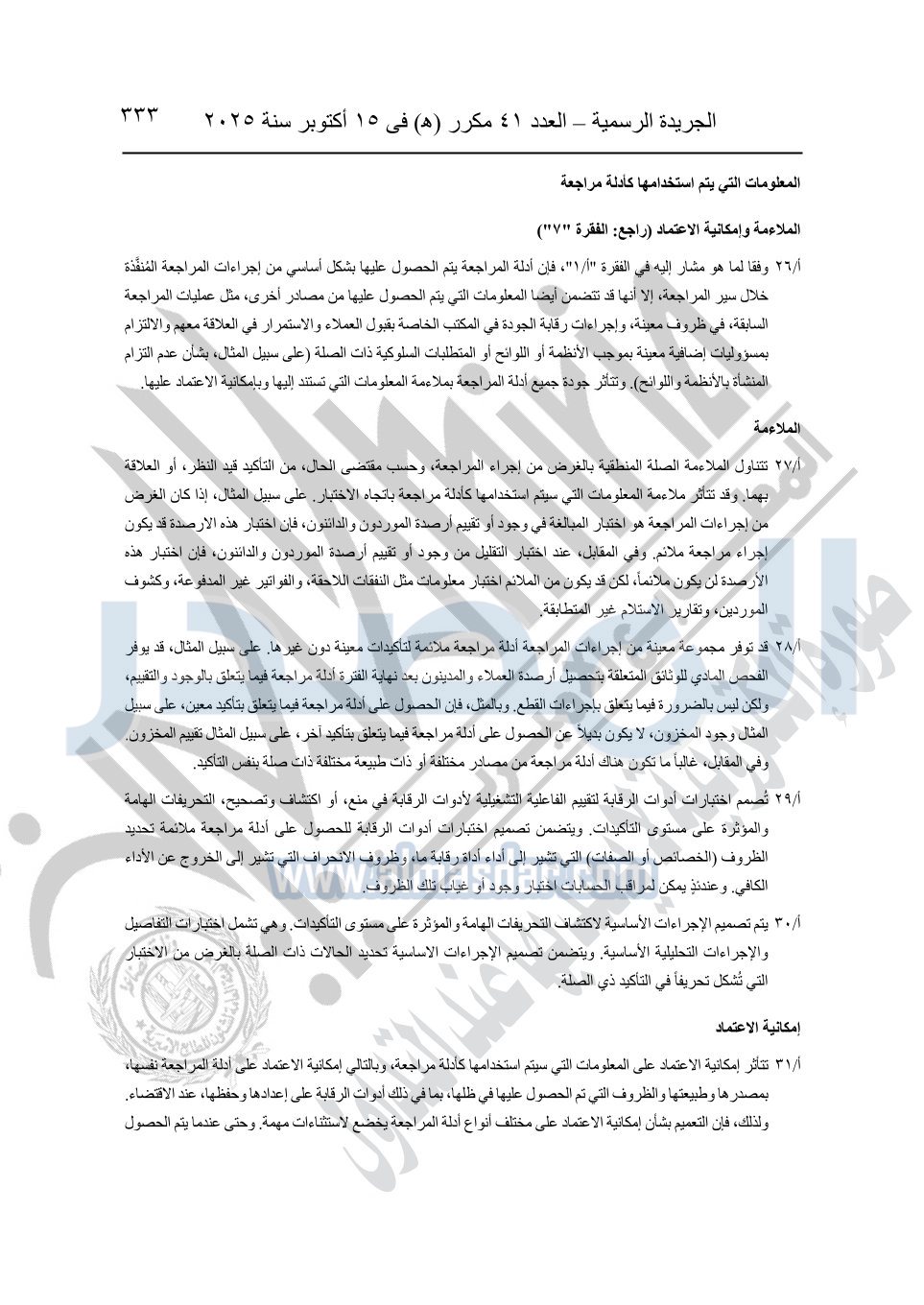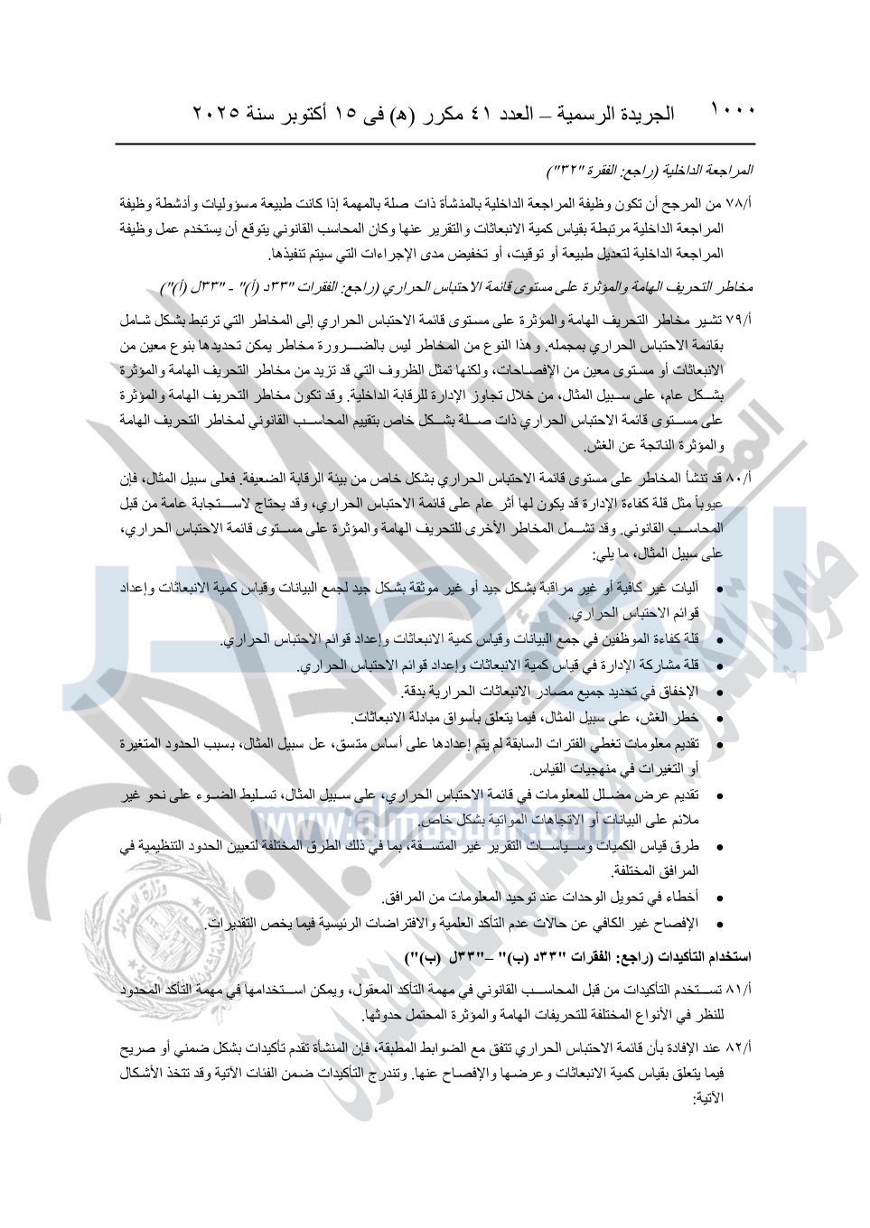 نشرت الجريدة الرسمية في العدد 41 مكرر "هـ" الصادر في 15 أكتوبر سنة 2025، قرار رئيس مجلس الوزراء رقم 3725 لسنة 2025، بشأن العمل بالمعايير المصرية للمراجعة والفحص المحدود ومهام التأكد الأخرى المرافقة لهذا القرار.