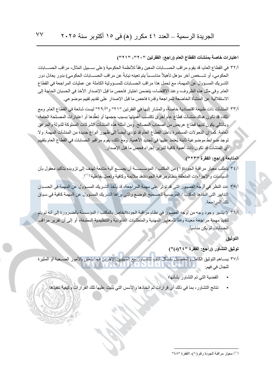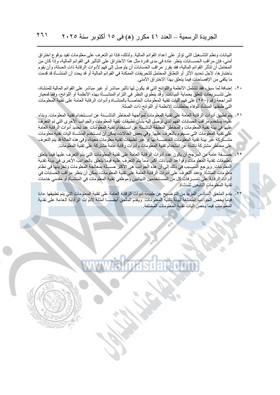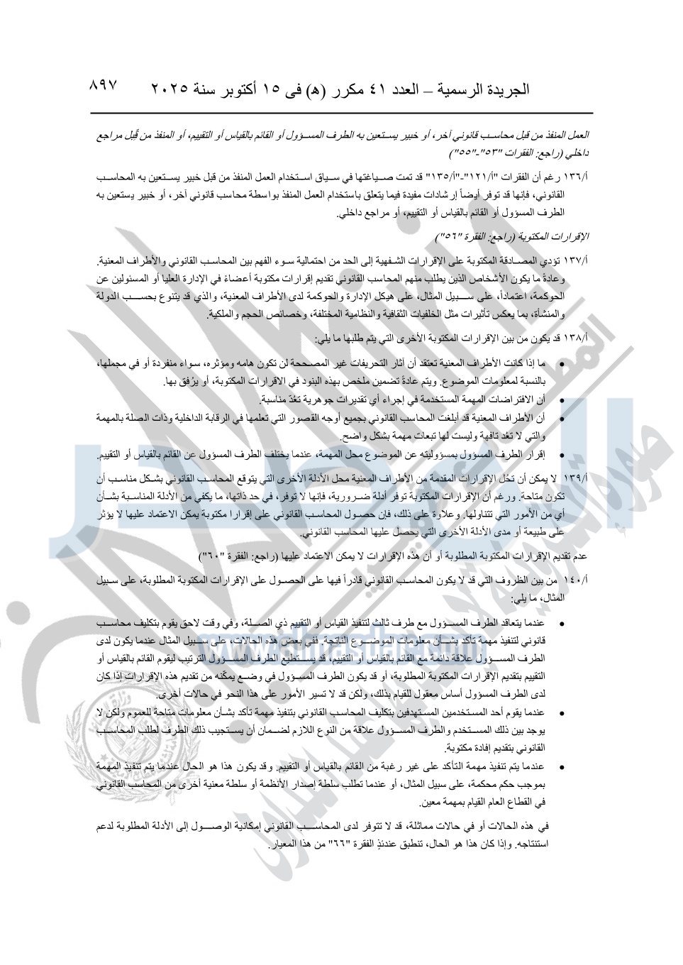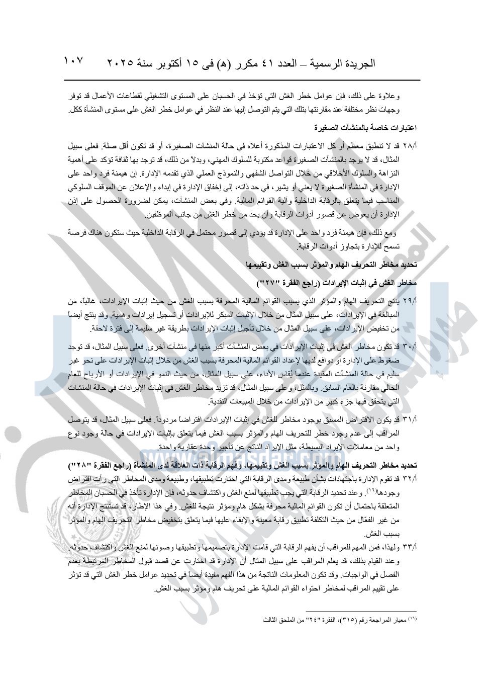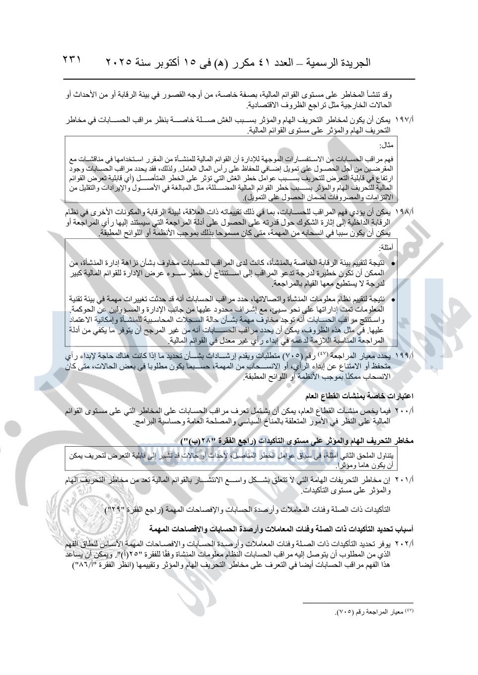نشرت الجريدة الرسمية في العدد 41 مكرر "هـ" الصادر في 15 أكتوبر سنة 2025، قرار رئيس مجلس الوزراء رقم 3725 لسنة 2025، بشأن العمل بالمعايير المصرية للمراجعة والفحص المحدود ومهام التأكد الأخرى المرافقة لهذا القرار.