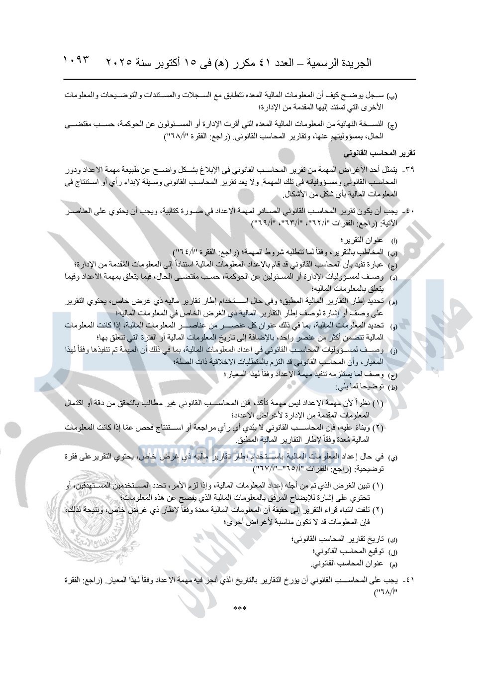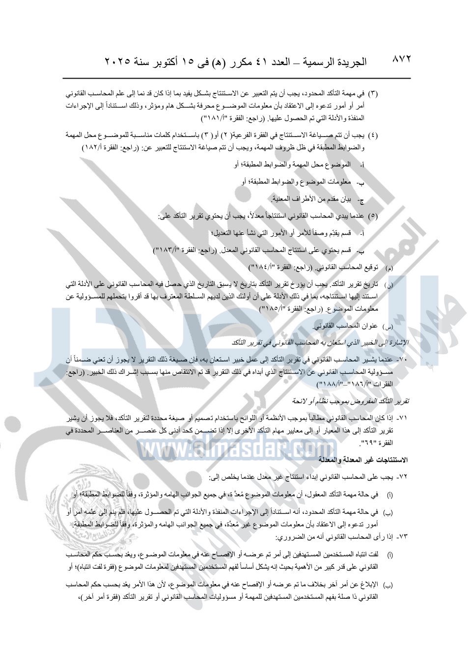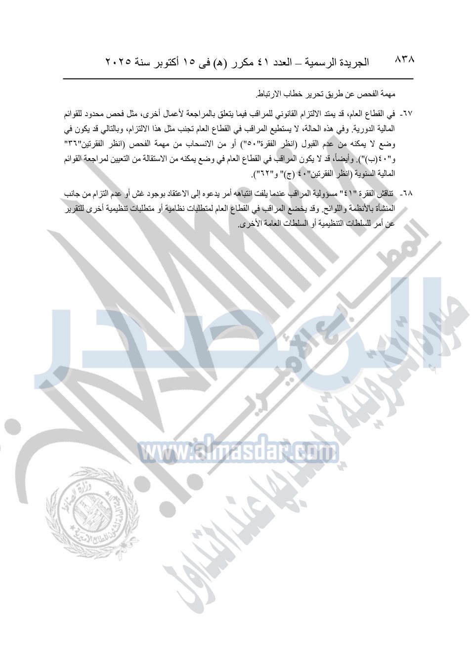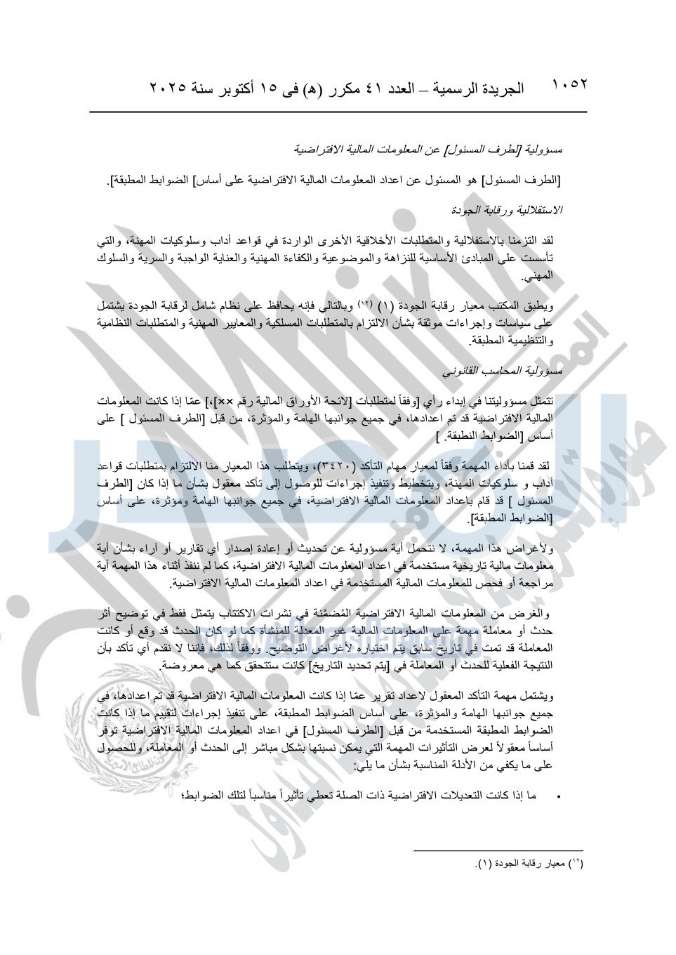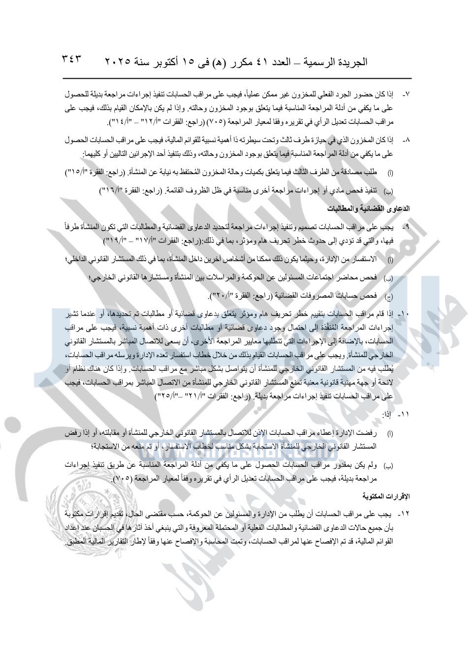 نشرت الجريدة الرسمية في العدد 41 مكرر "هـ" الصادر في 15 أكتوبر سنة 2025، قرار رئيس مجلس الوزراء رقم 3725 لسنة 2025، بشأن العمل بالمعايير المصرية للمراجعة والفحص المحدود ومهام التأكد الأخرى المرافقة لهذا القرار.