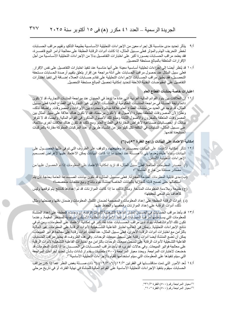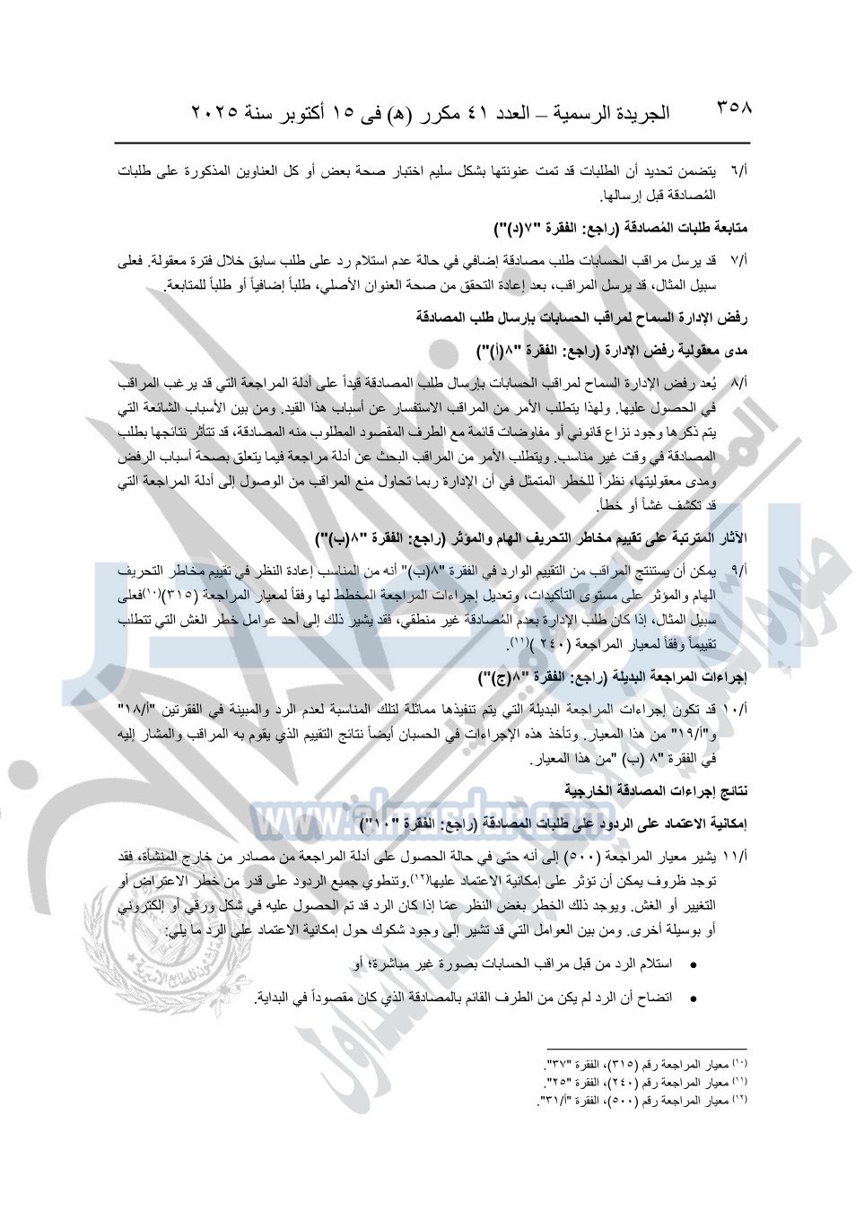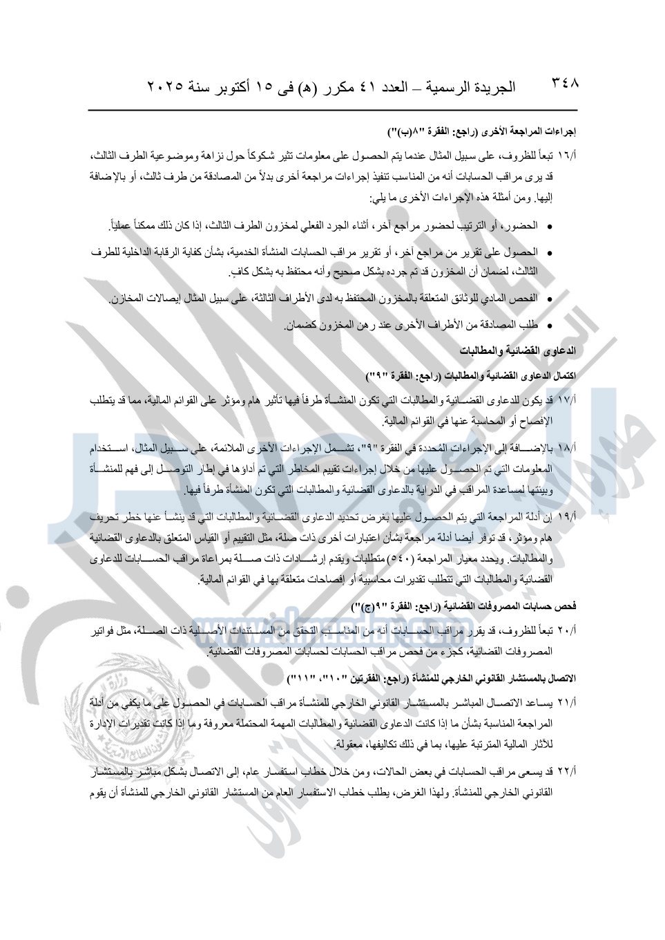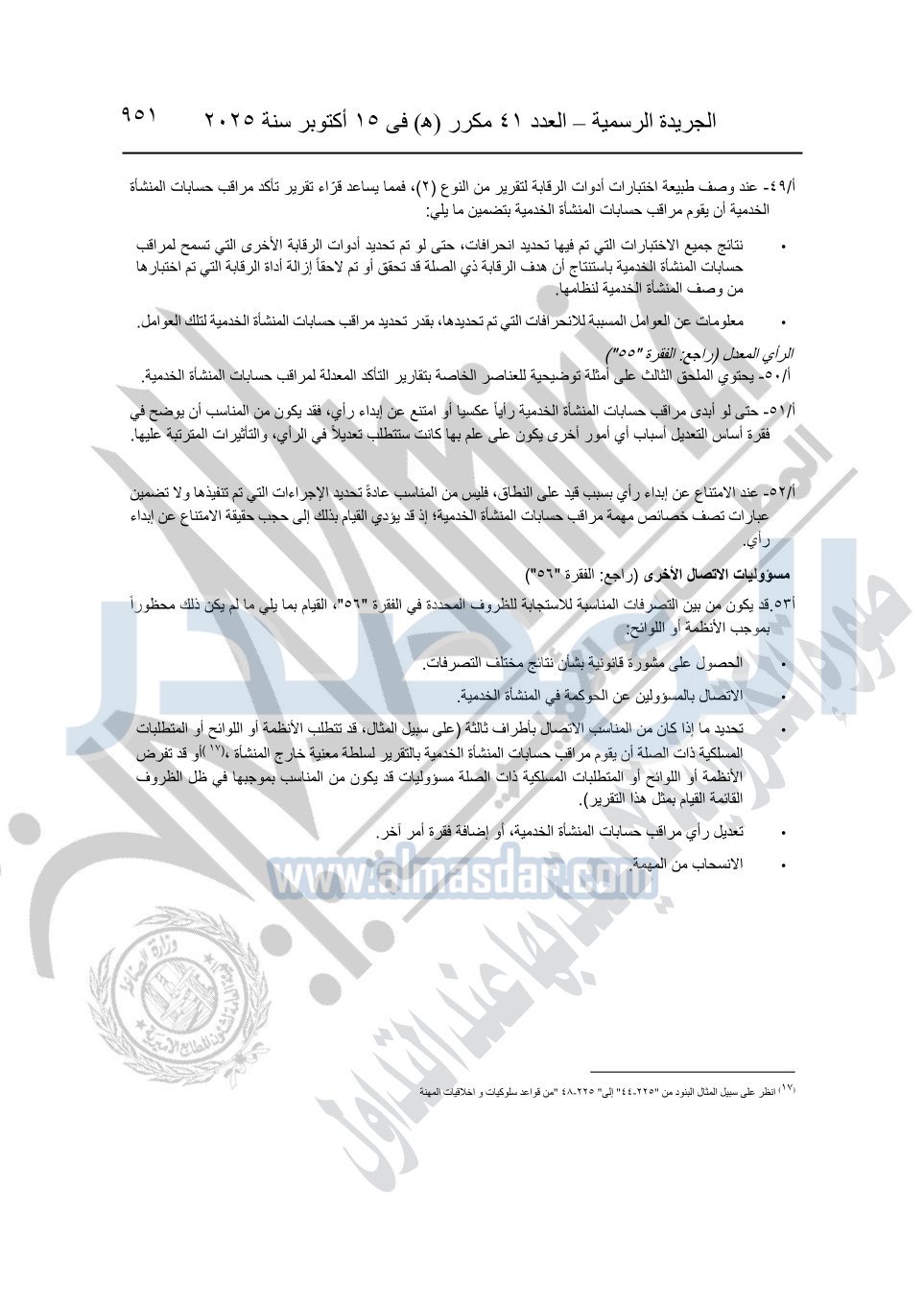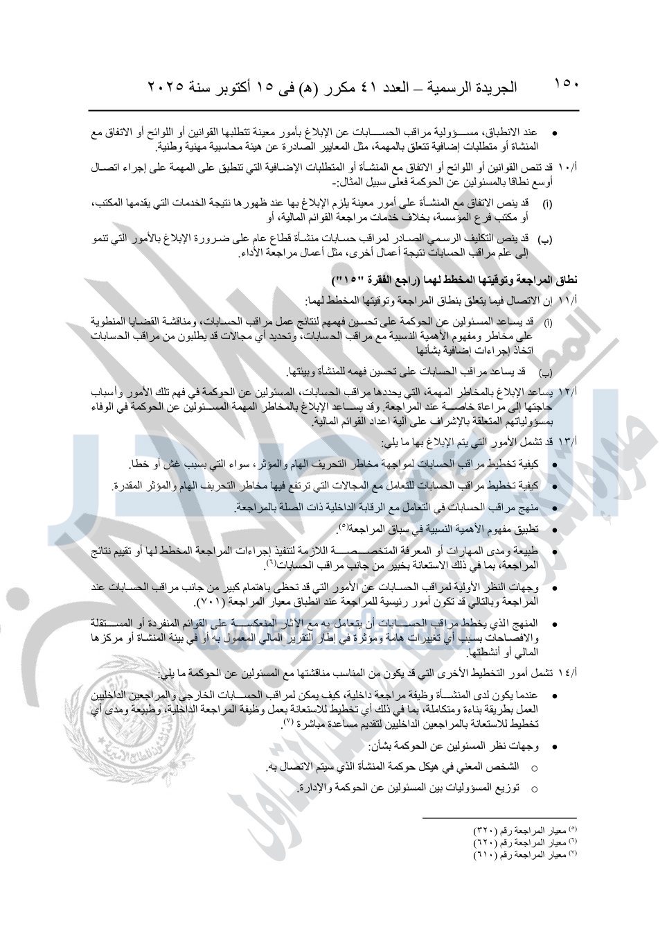نشرت الجريدة الرسمية في العدد 41 مكرر "هـ" الصادر في 15 أكتوبر سنة 2025، قرار رئيس مجلس الوزراء رقم 3725 لسنة 2025، بشأن العمل بالمعايير المصرية للمراجعة والفحص المحدود ومهام التأكد الأخرى المرافقة لهذا القرار.