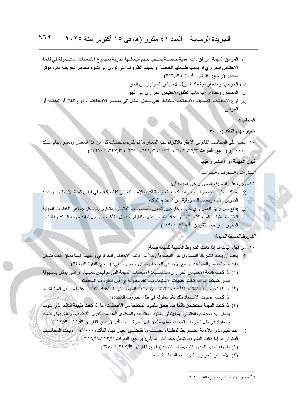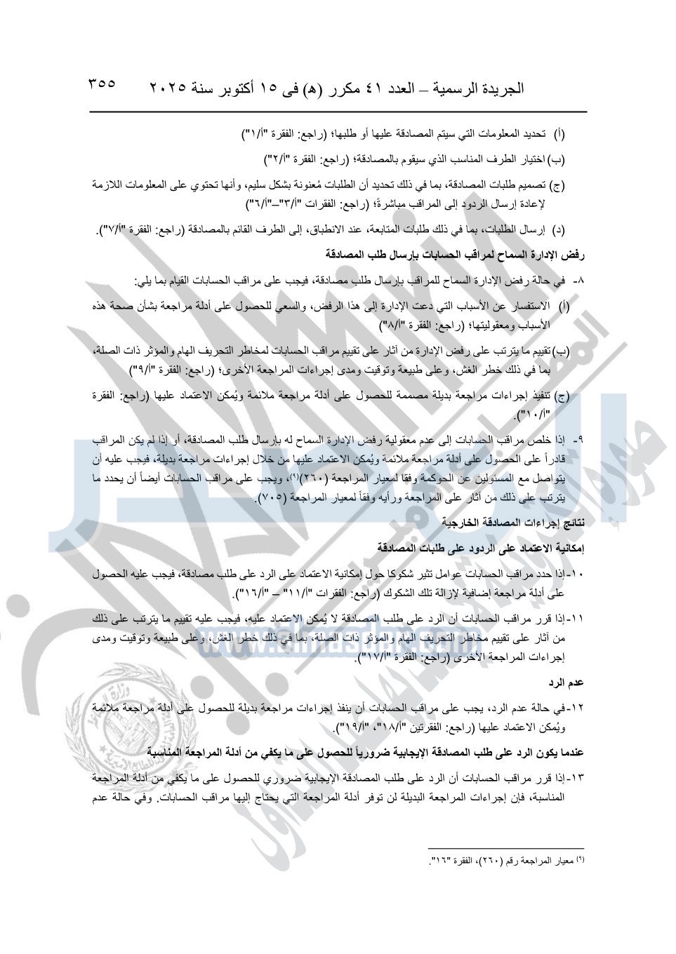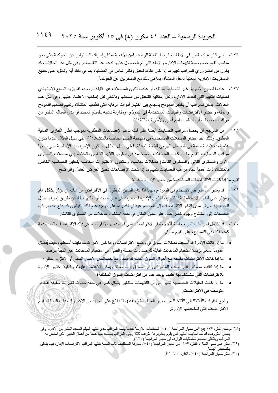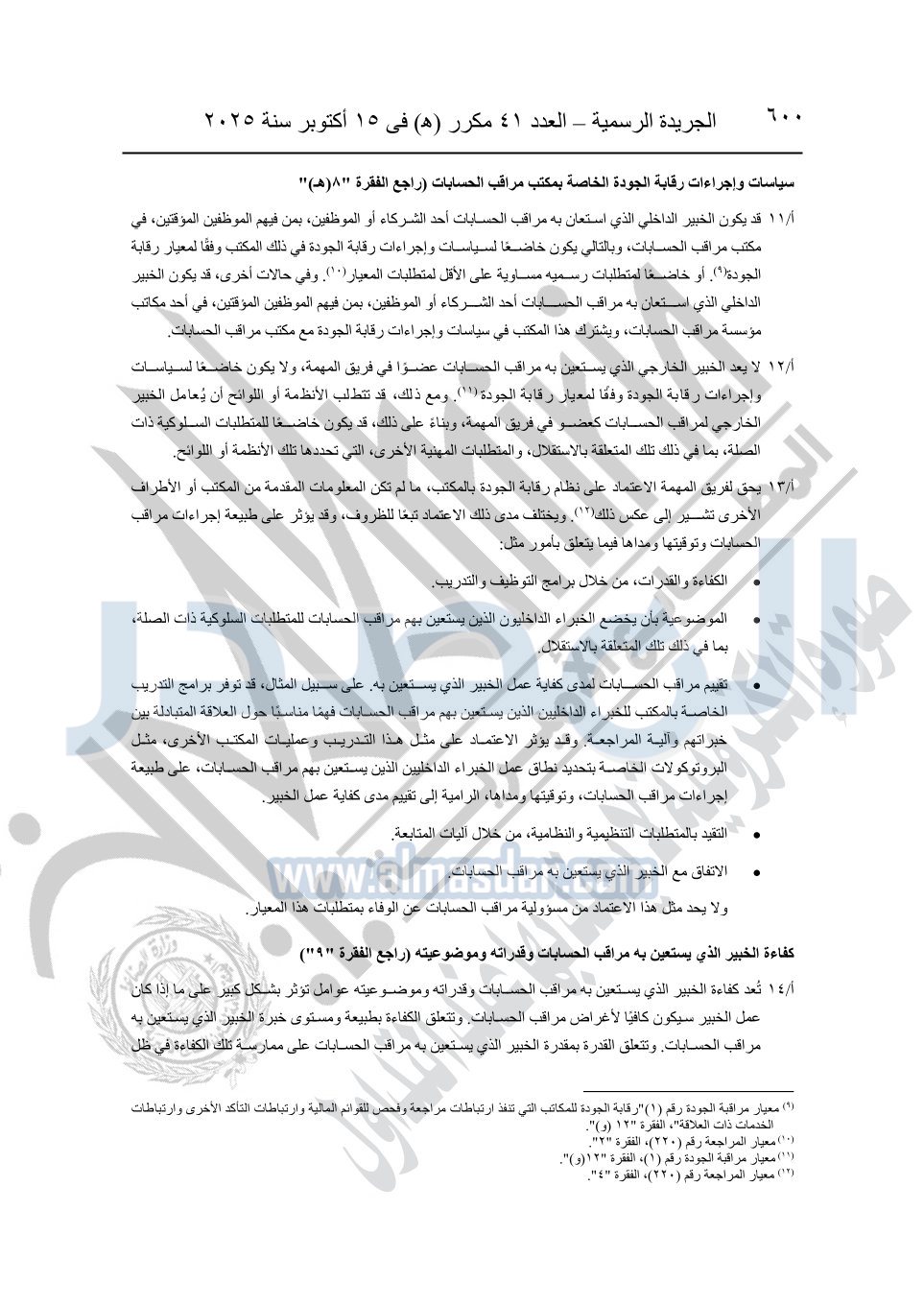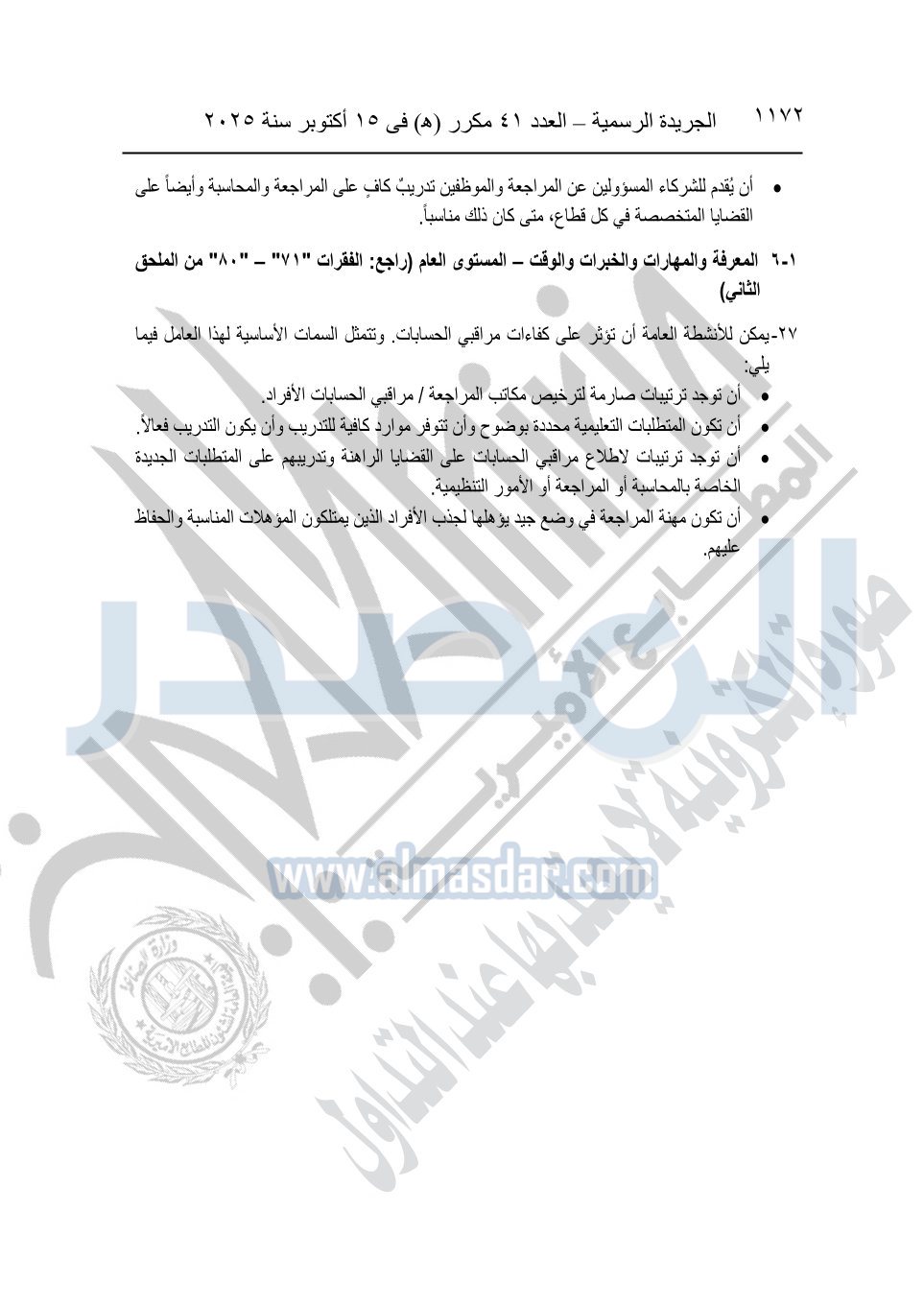نشرت الجريدة الرسمية في العدد 41 مكرر "هـ" الصادر في 15 أكتوبر سنة 2025، قرار رئيس مجلس الوزراء رقم 3725 لسنة 2025، بشأن العمل بالمعايير المصرية للمراجعة والفحص المحدود ومهام التأكد الأخرى المرافقة لهذا القرار.
