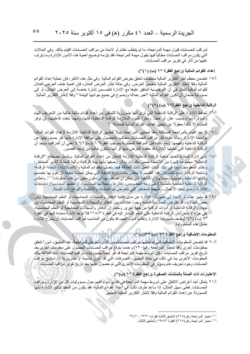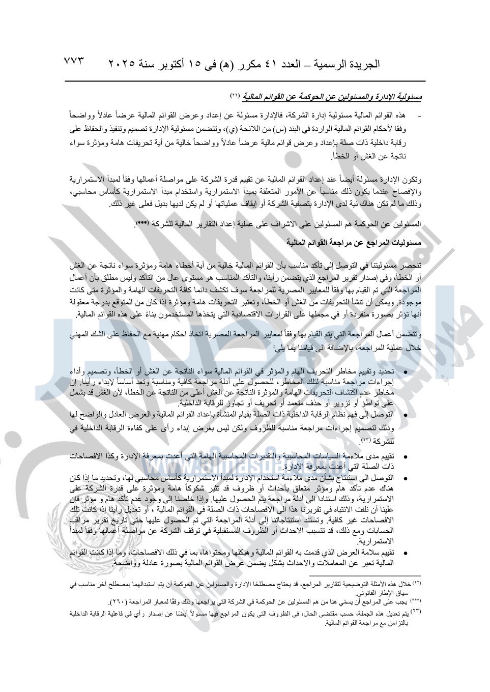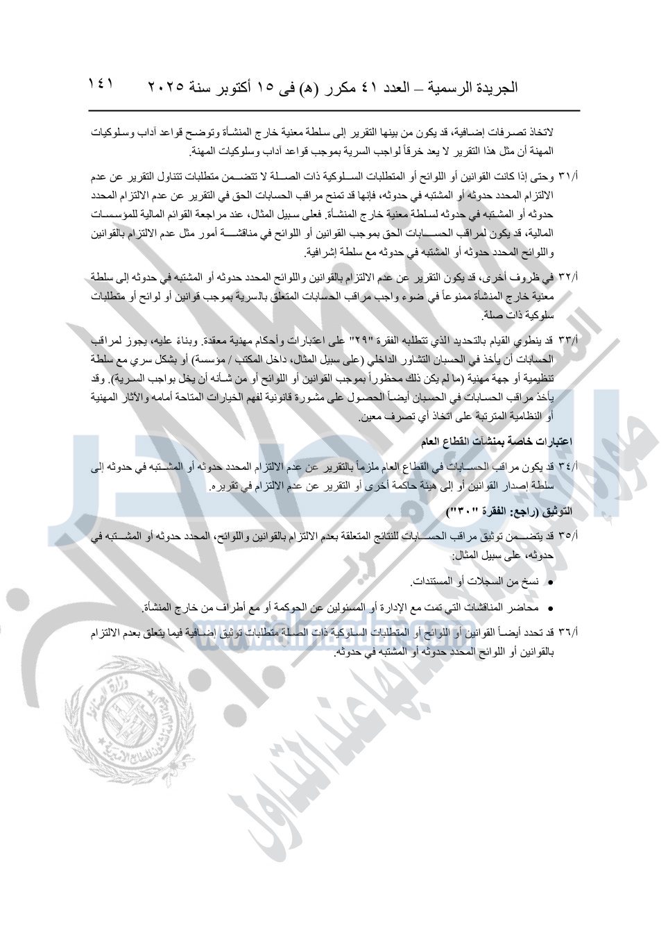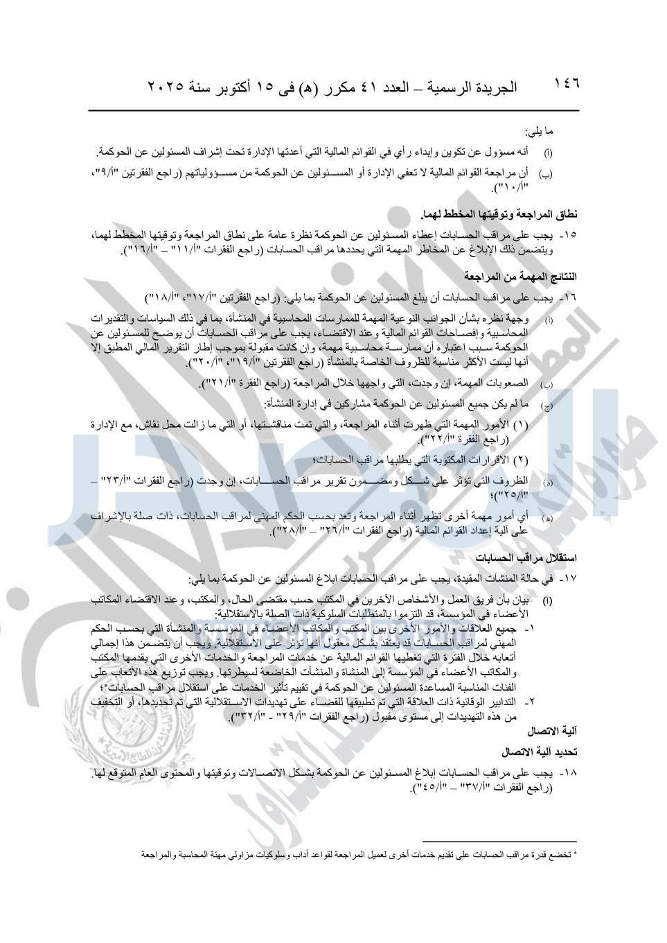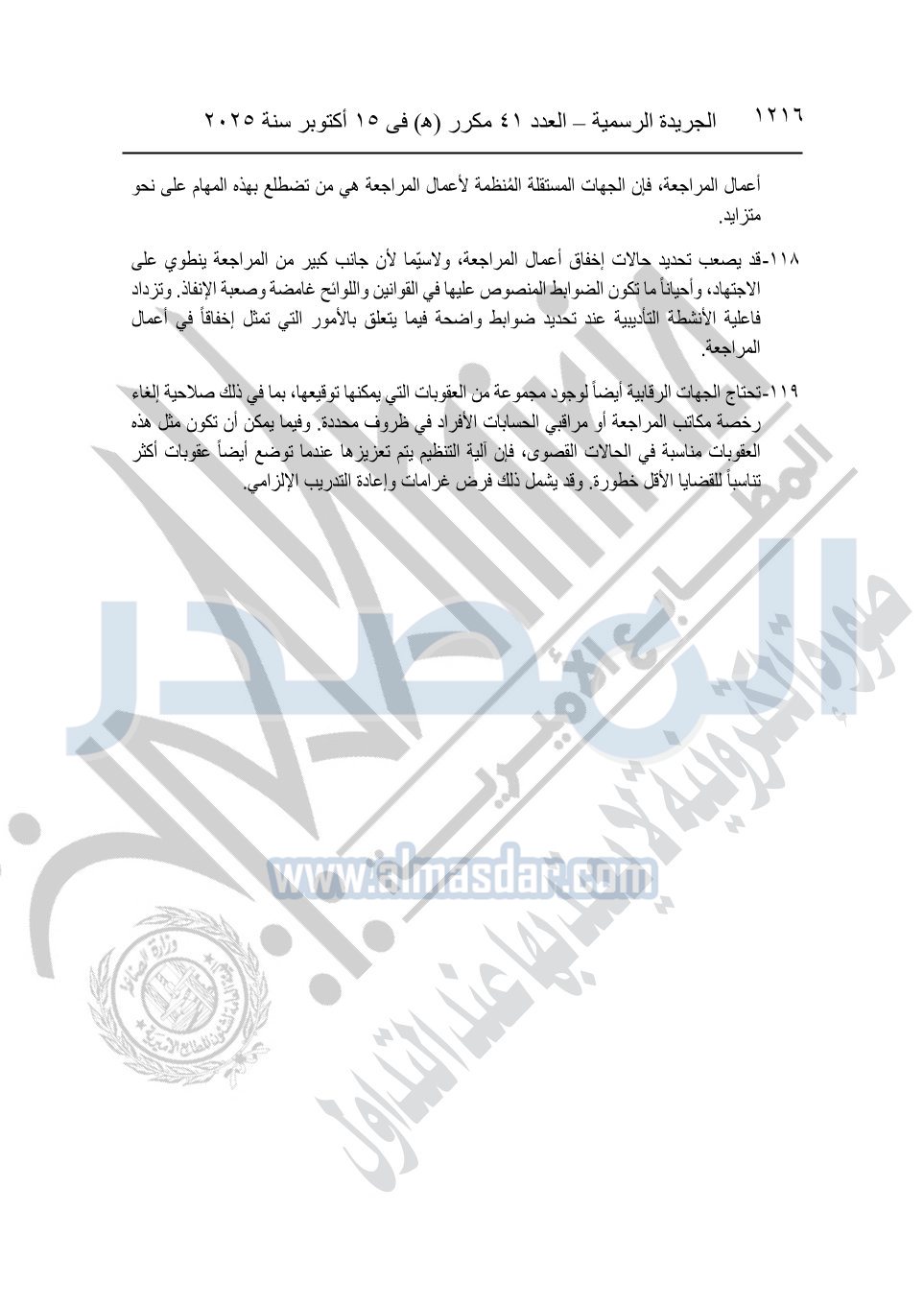نشرت الجريدة الرسمية في العدد 41 مكرر "هـ" الصادر في 15 أكتوبر سنة 2025، قرار رئيس مجلس الوزراء رقم 3725 لسنة 2025، بشأن العمل بالمعايير المصرية للمراجعة والفحص المحدود ومهام التأكد الأخرى المرافقة لهذا القرار.