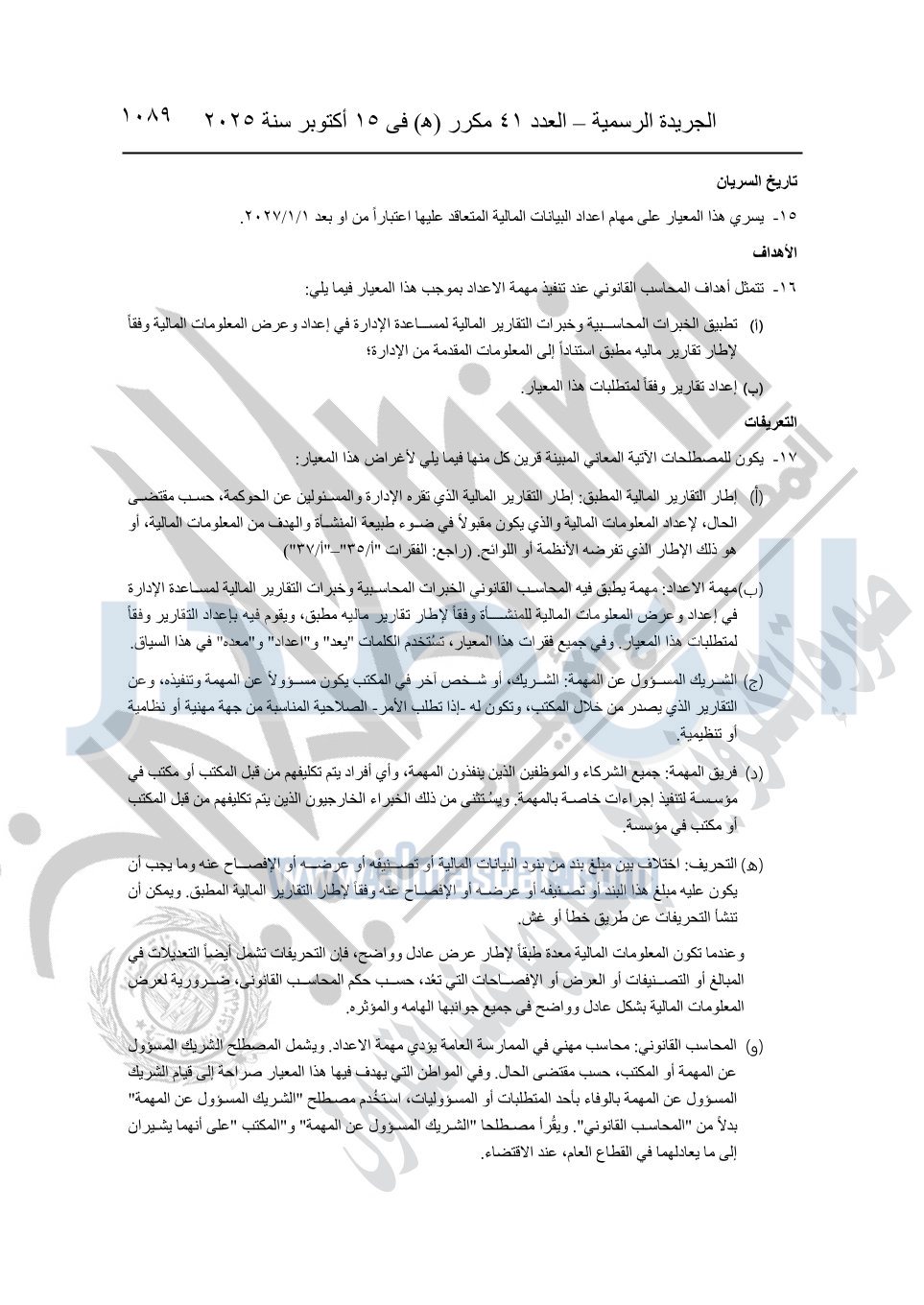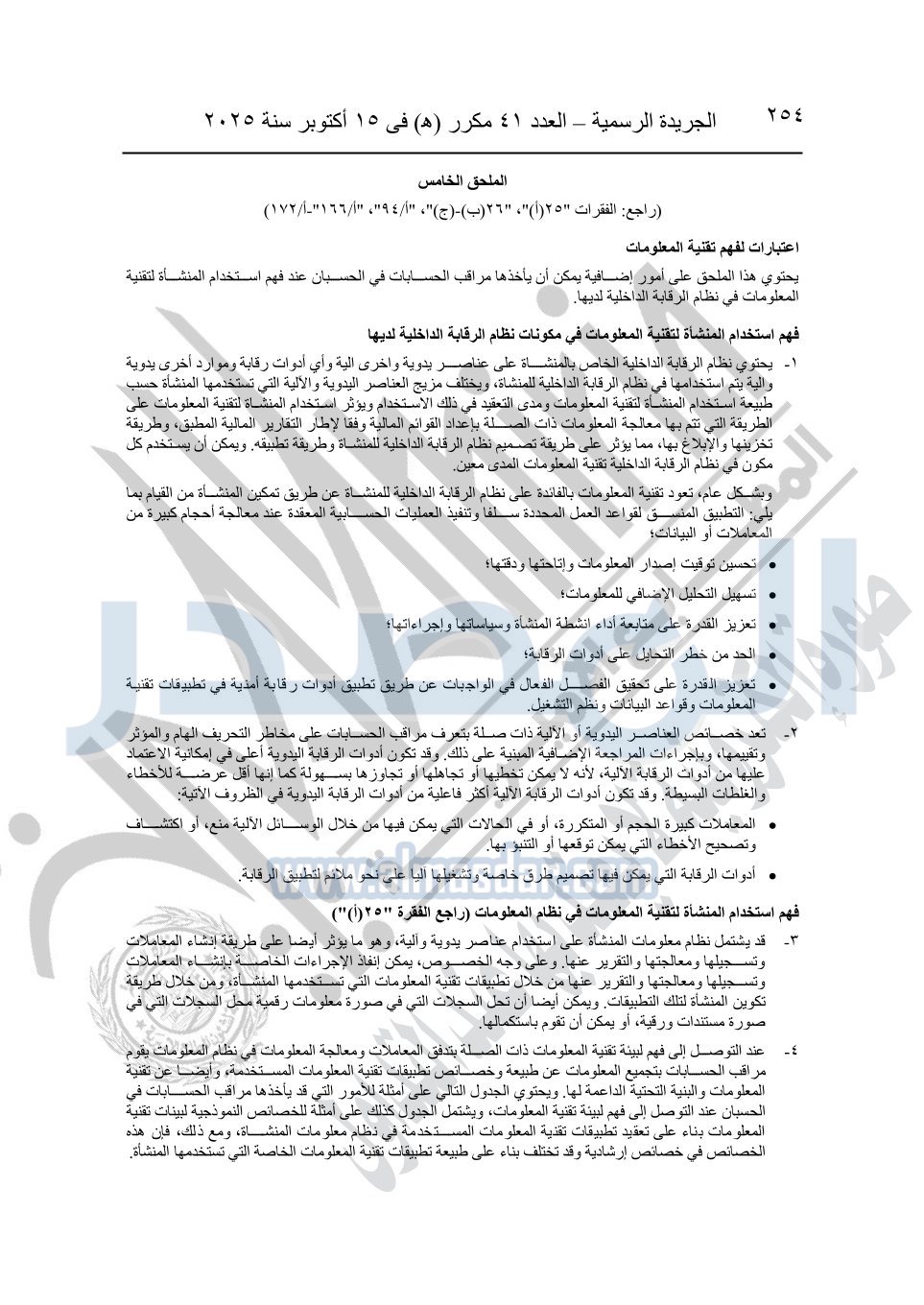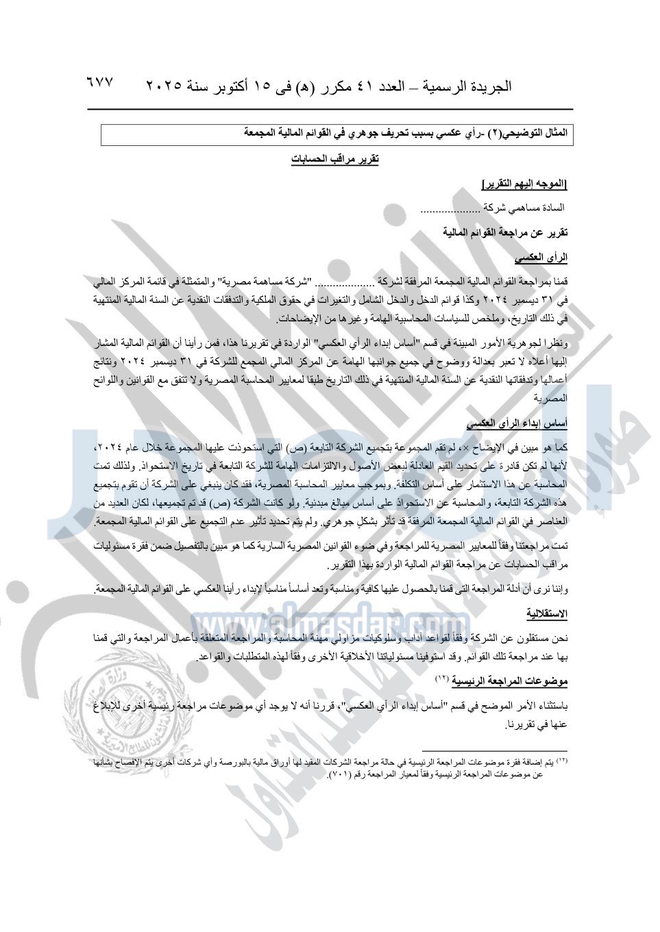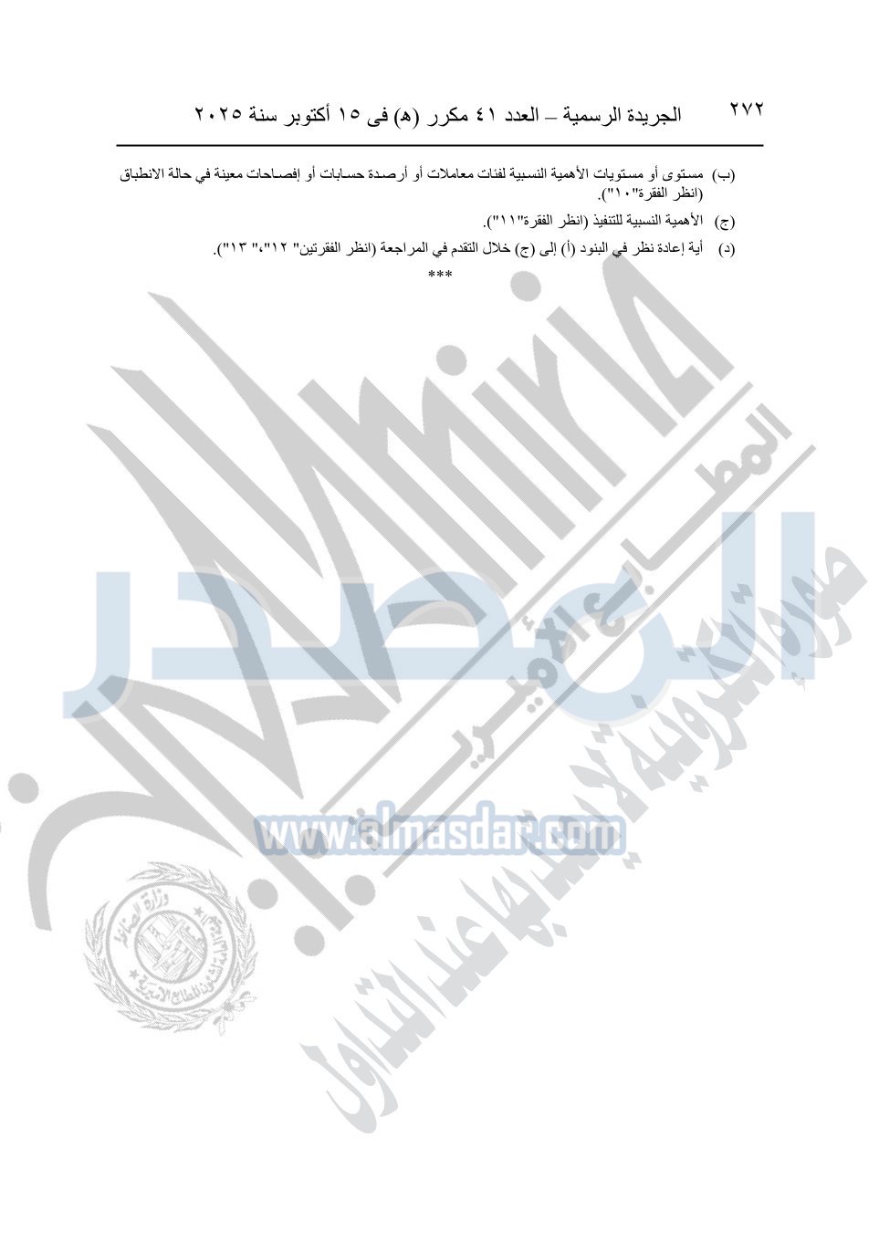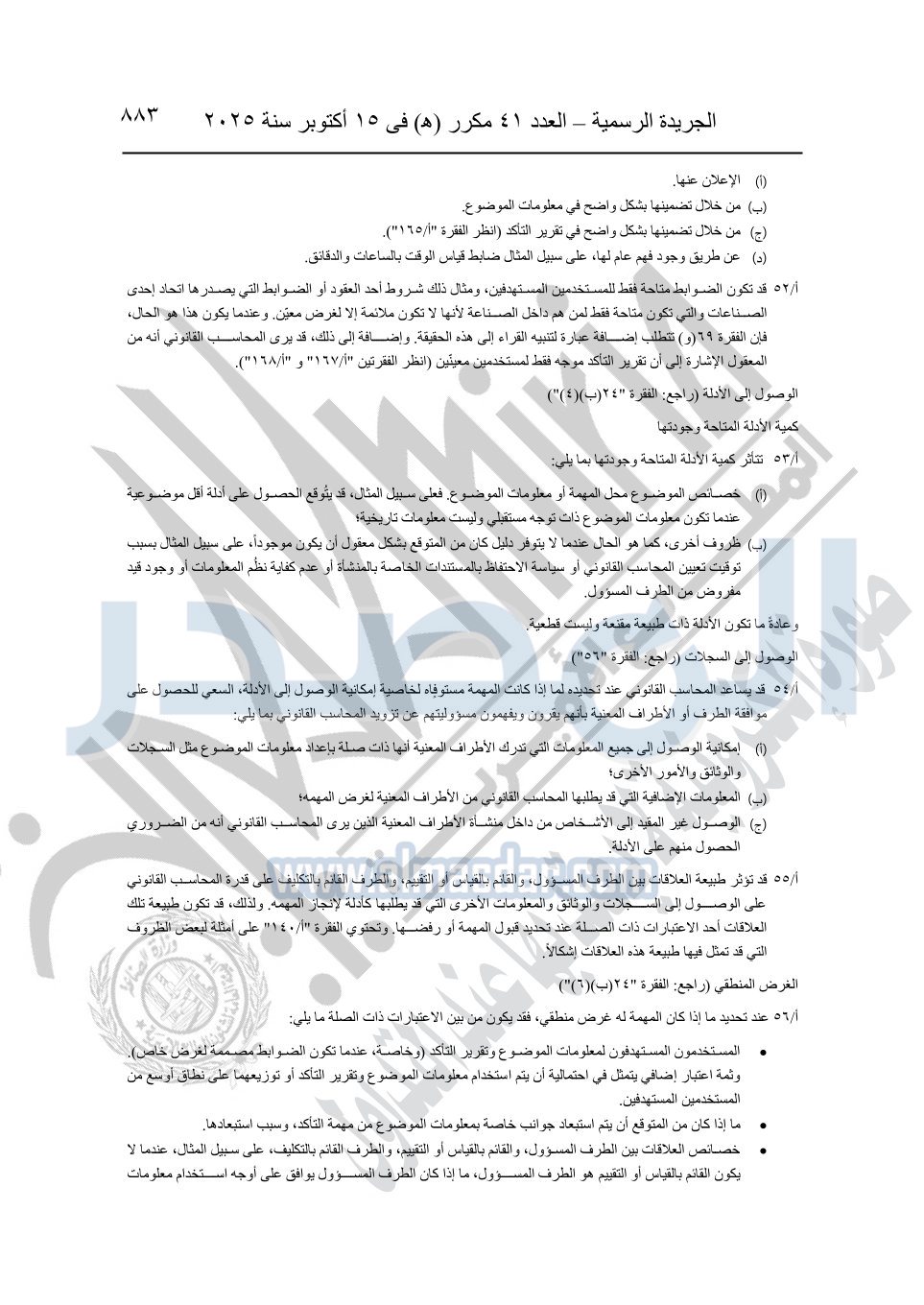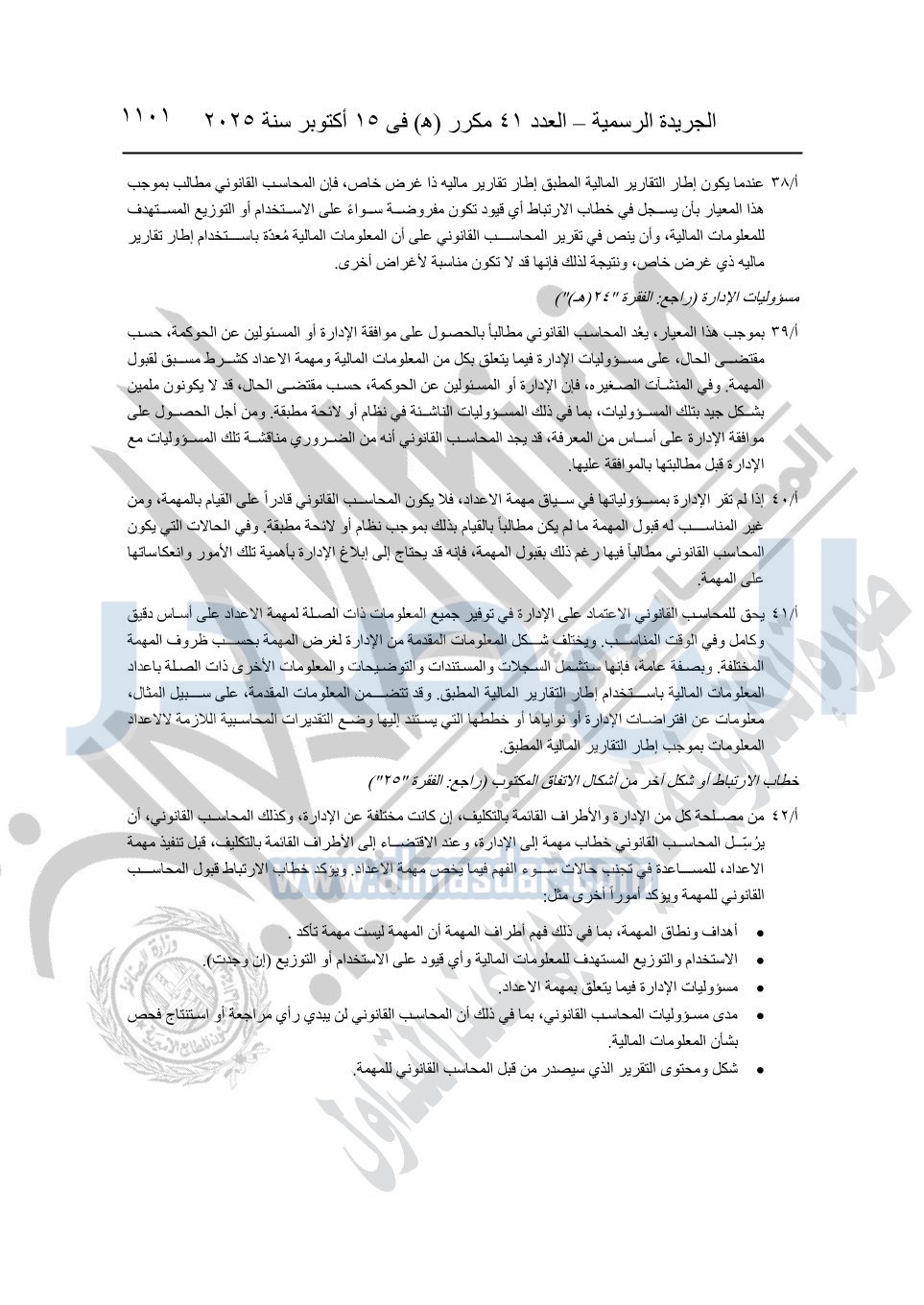نشرت الجريدة الرسمية في العدد 41 مكرر "هـ" الصادر في 15 أكتوبر سنة 2025، قرار رئيس مجلس الوزراء رقم 3725 لسنة 2025، بشأن العمل بالمعايير المصرية للمراجعة والفحص المحدود ومهام التأكد الأخرى المرافقة لهذا القرار.