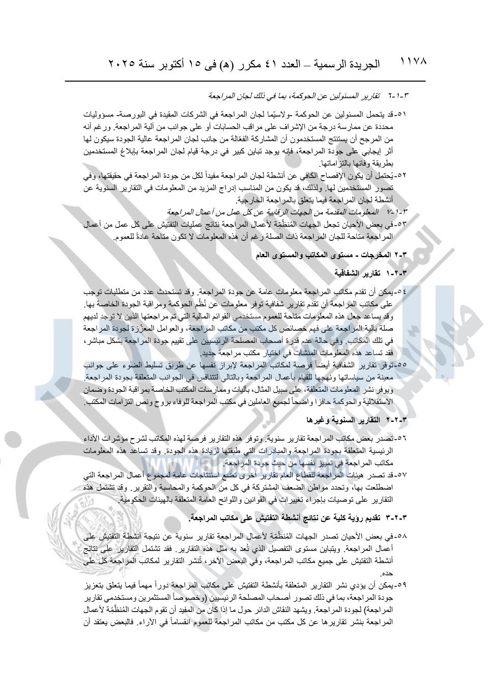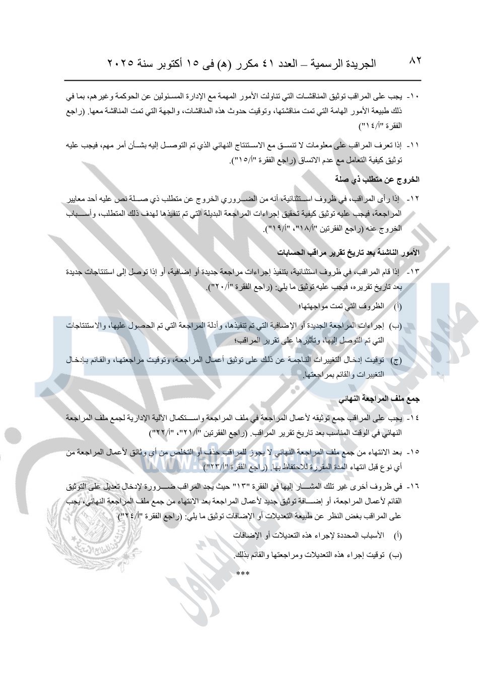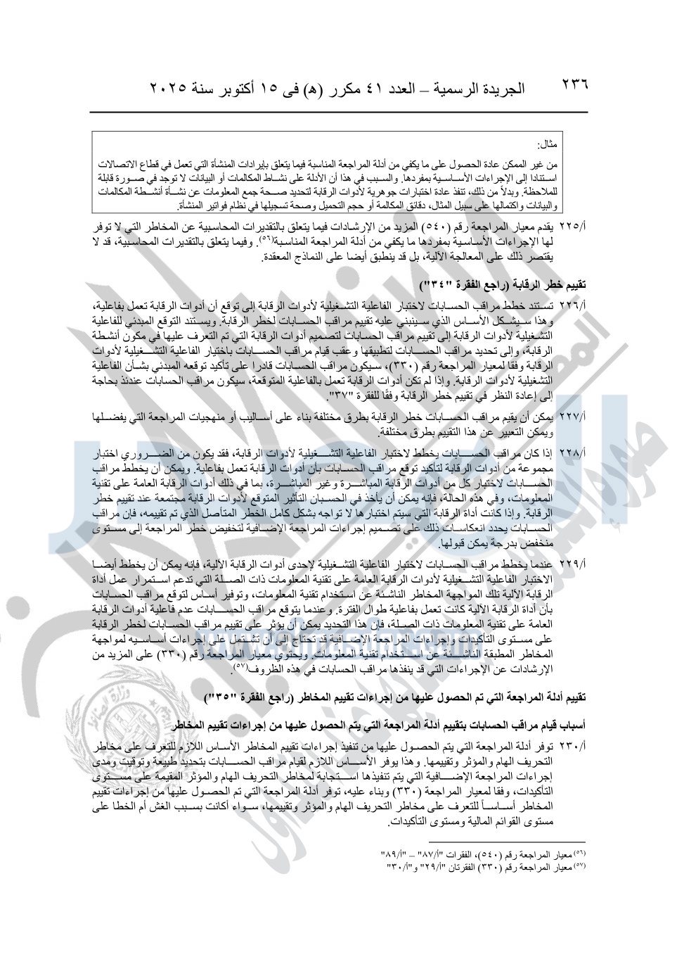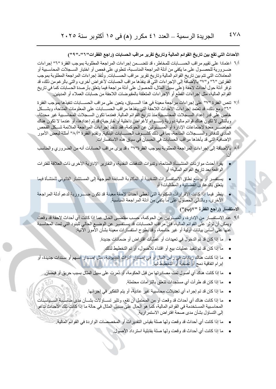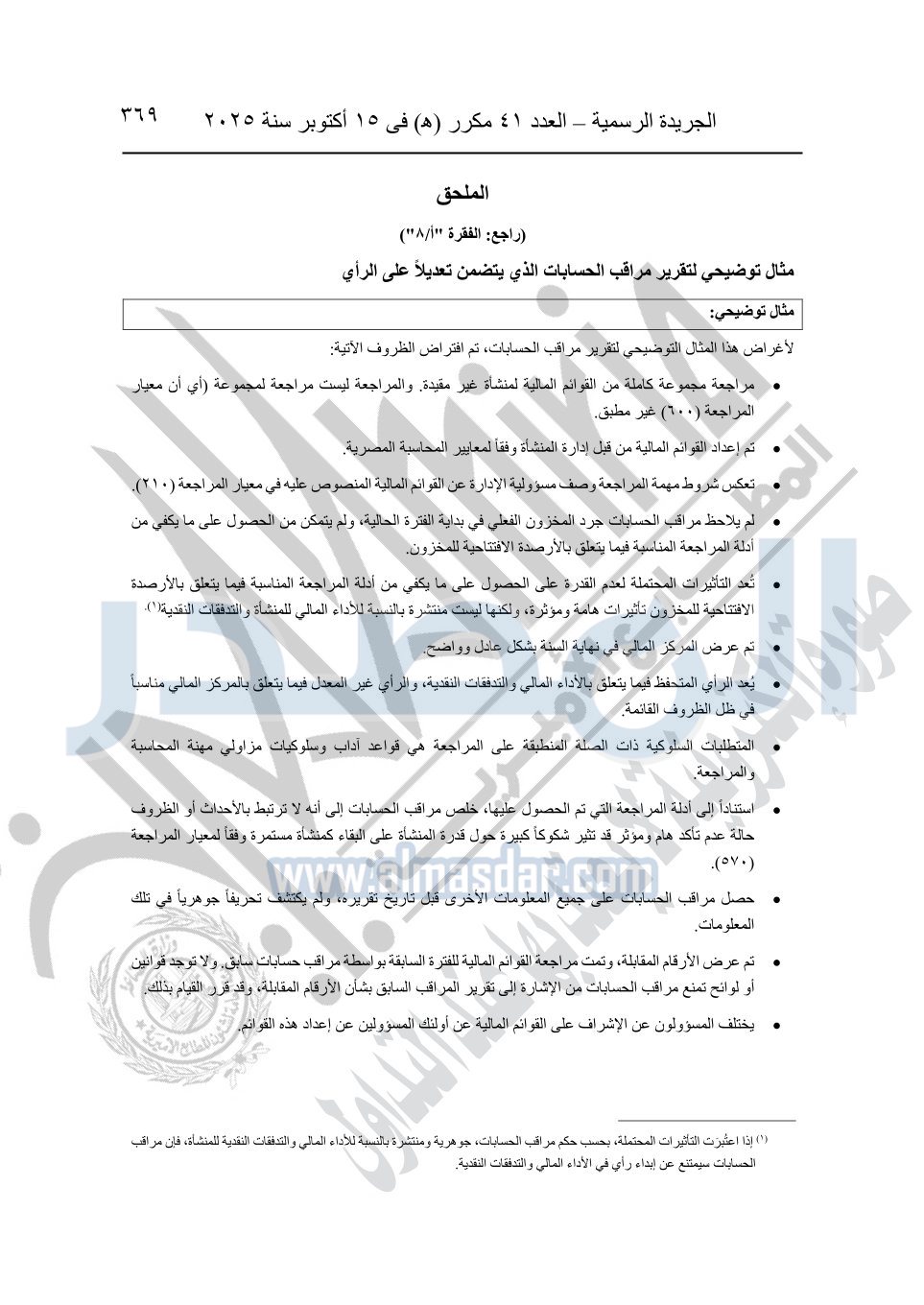 نشرت الجريدة الرسمية في العدد 41 مكرر "هـ" الصادر في 15 أكتوبر سنة 2025، قرار رئيس مجلس الوزراء رقم 3725 لسنة 2025، بشأن العمل بالمعايير المصرية للمراجعة والفحص المحدود ومهام التأكد الأخرى المرافقة لهذا القرار.