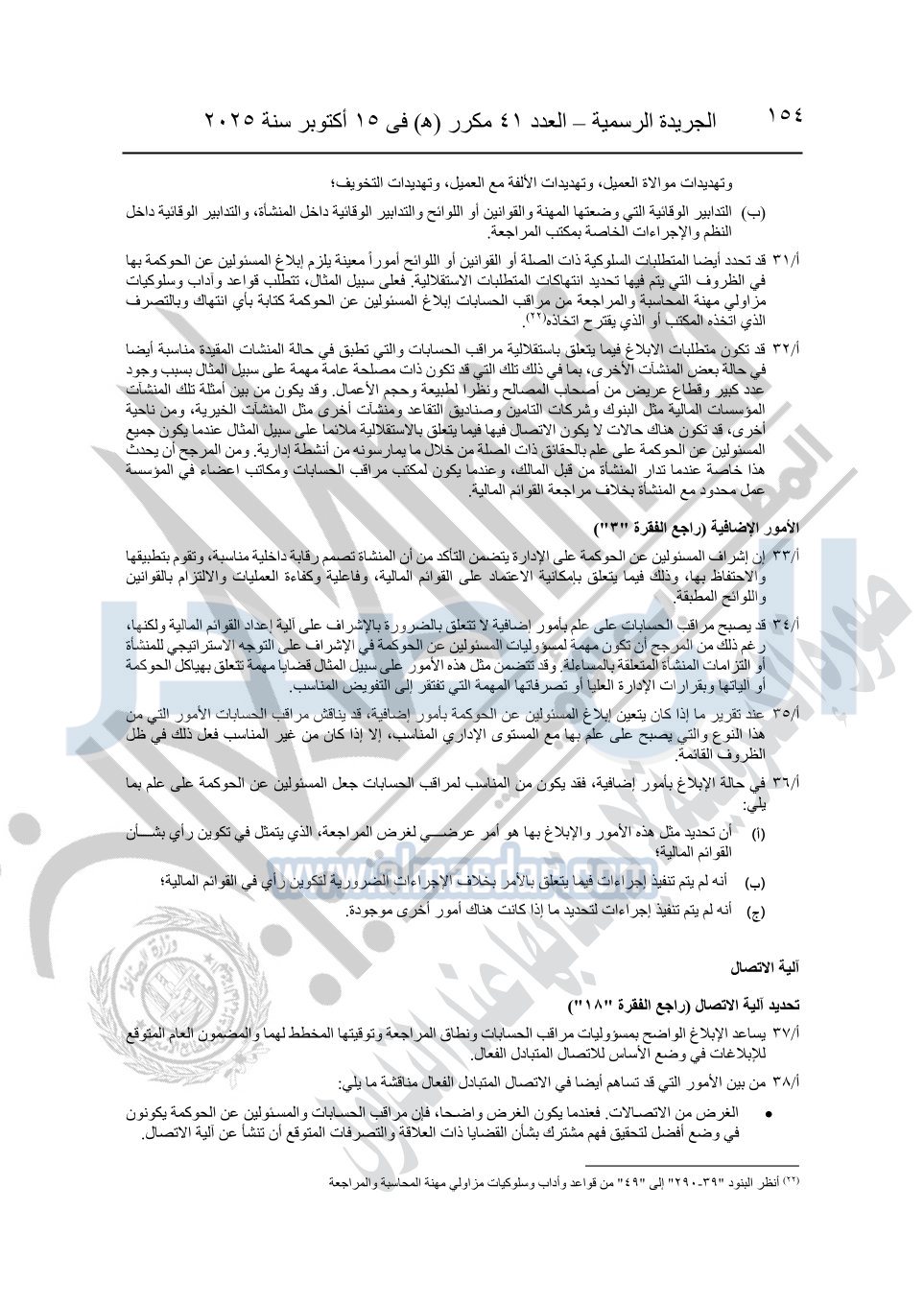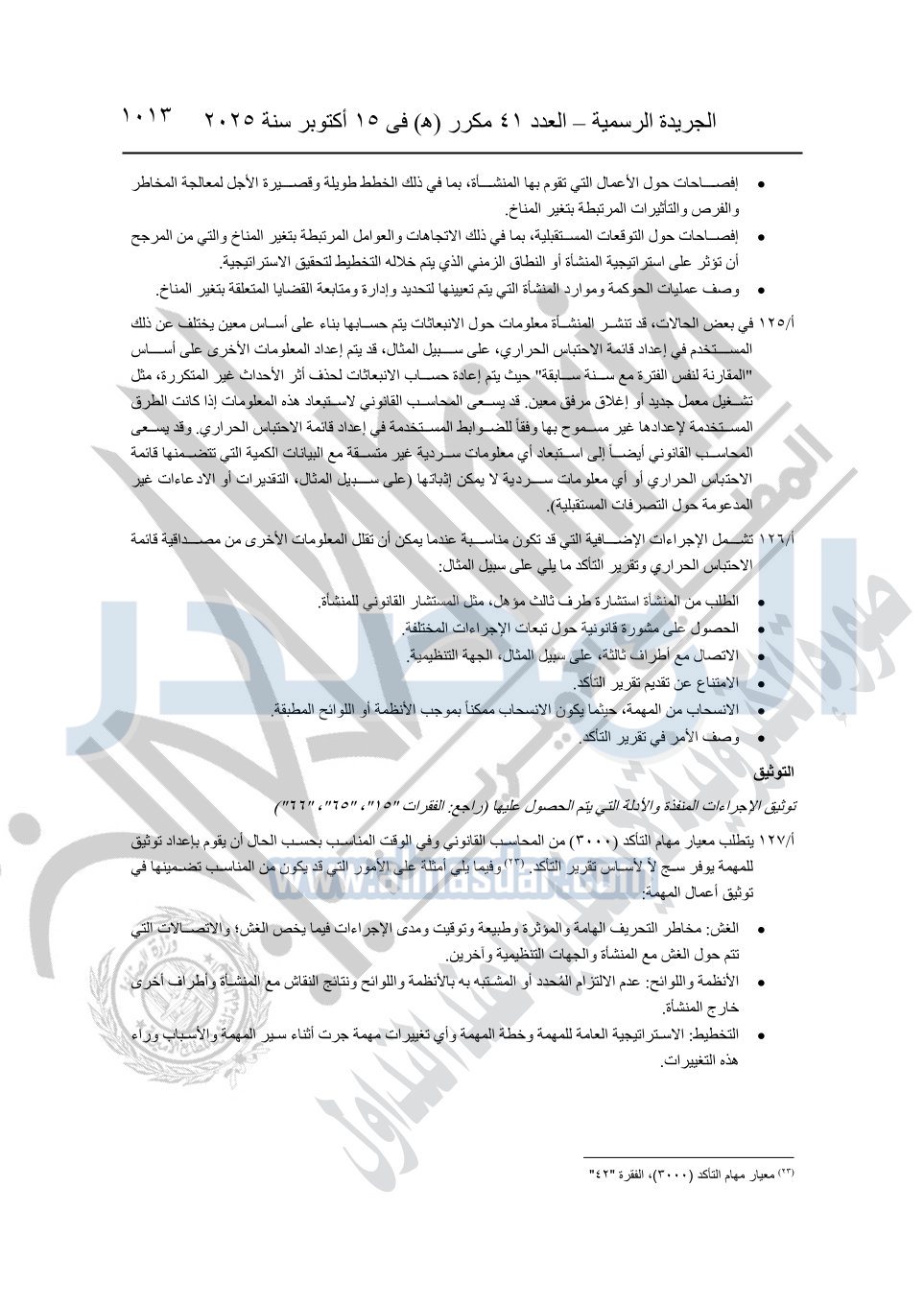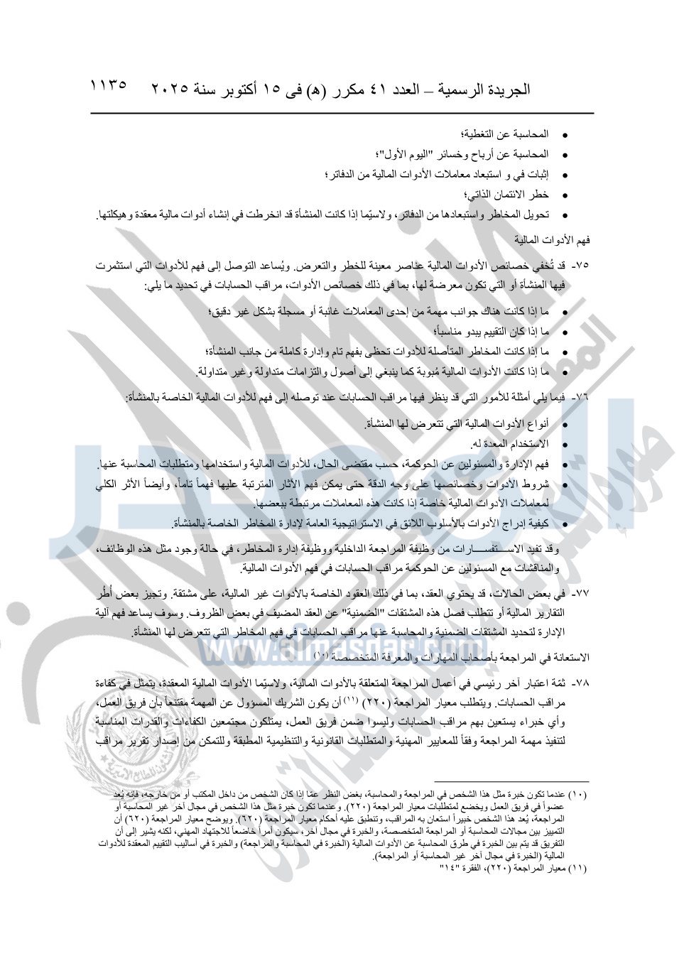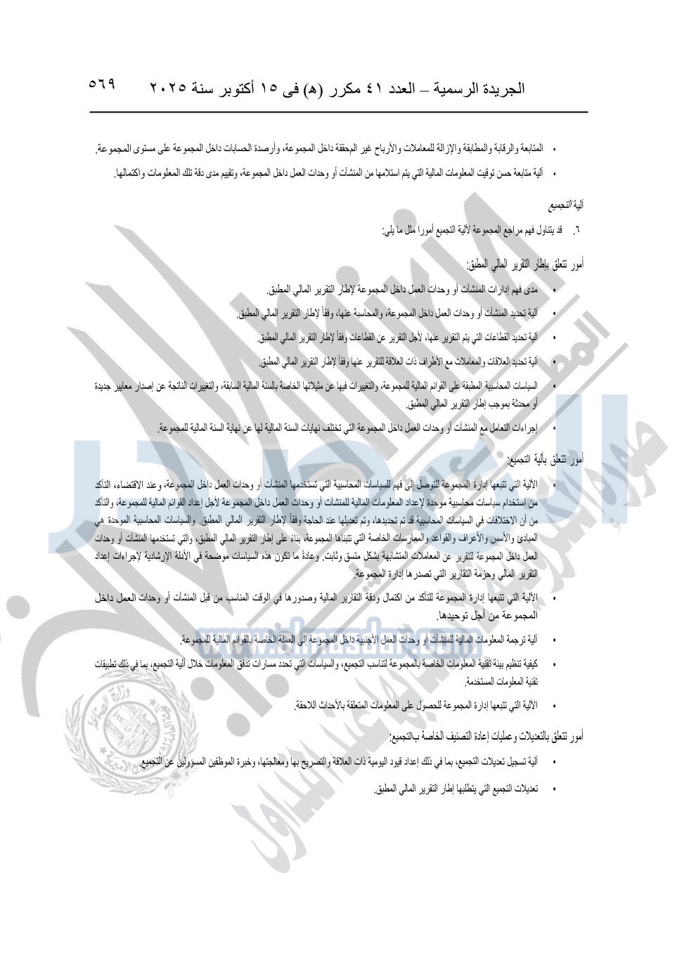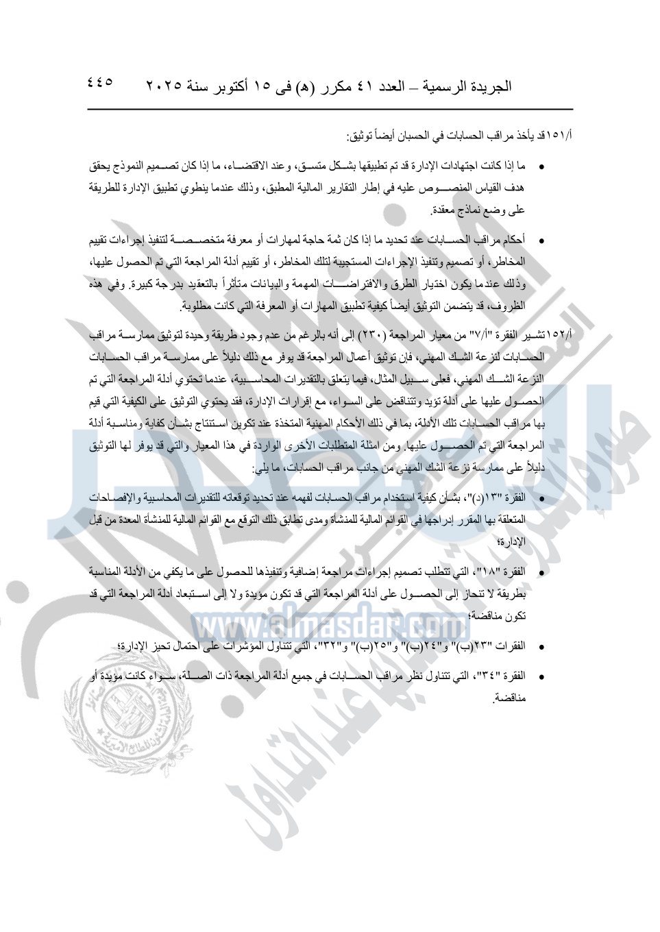نشرت الجريدة الرسمية في العدد 41 مكرر "هـ" الصادر في 15 أكتوبر سنة 2025، قرار رئيس مجلس الوزراء رقم 3725 لسنة 2025، بشأن العمل بالمعايير المصرية للمراجعة والفحص المحدود ومهام التأكد الأخرى المرافقة لهذا القرار.