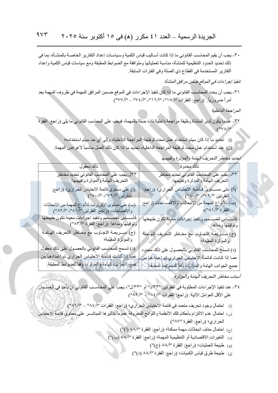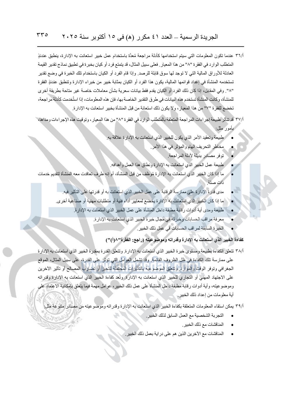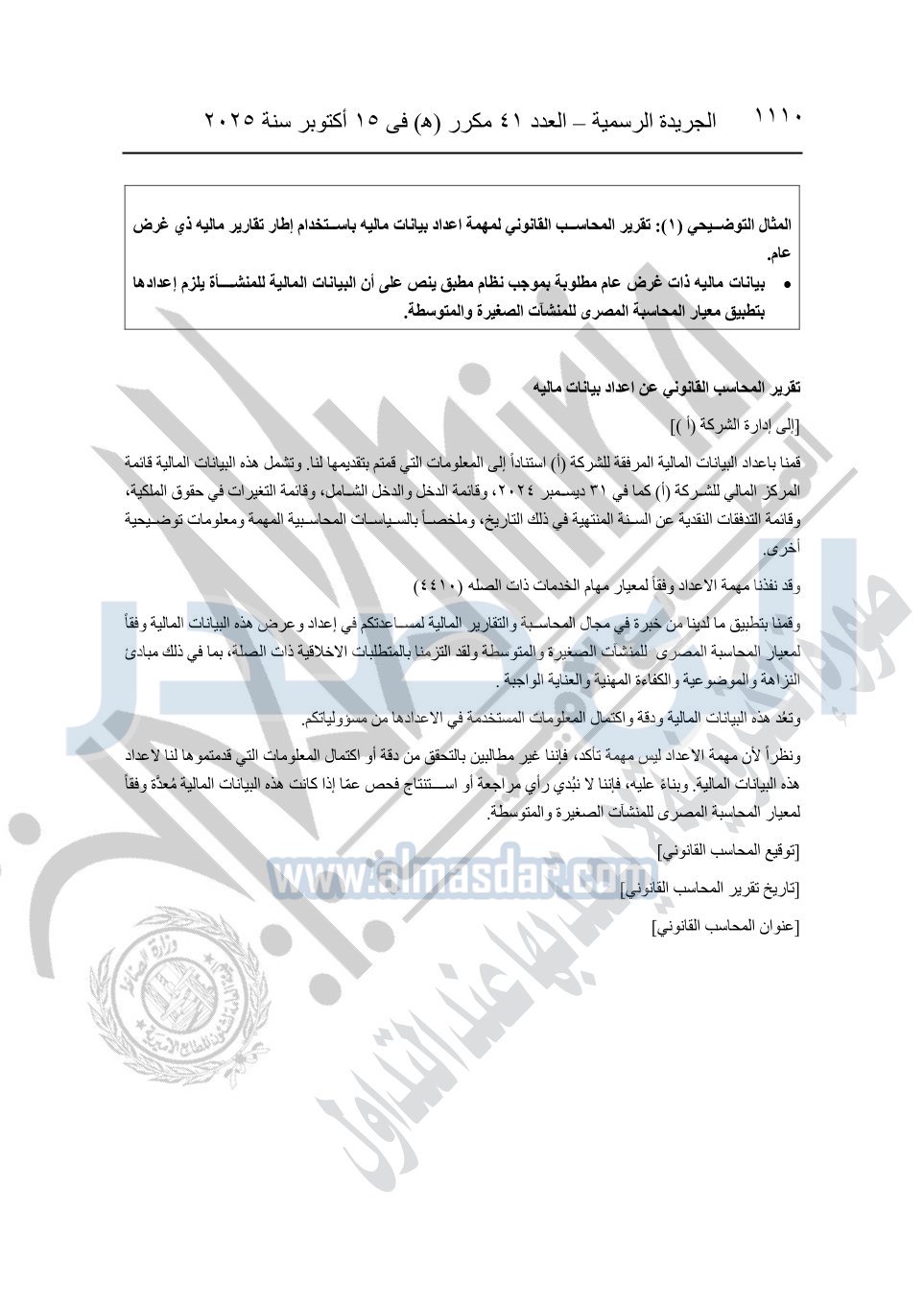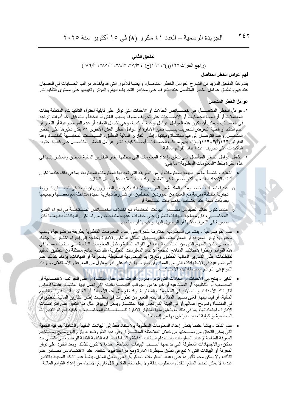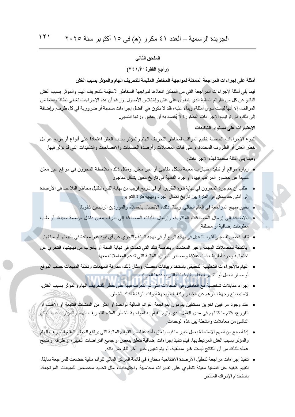 نشرت الجريدة الرسمية في العدد 41 مكرر "هـ" الصادر في 15 أكتوبر سنة 2025، قرار رئيس مجلس الوزراء رقم 3725 لسنة 2025، بشأن العمل بالمعايير المصرية للمراجعة والفحص المحدود ومهام التأكد الأخرى المرافقة لهذا القرار.