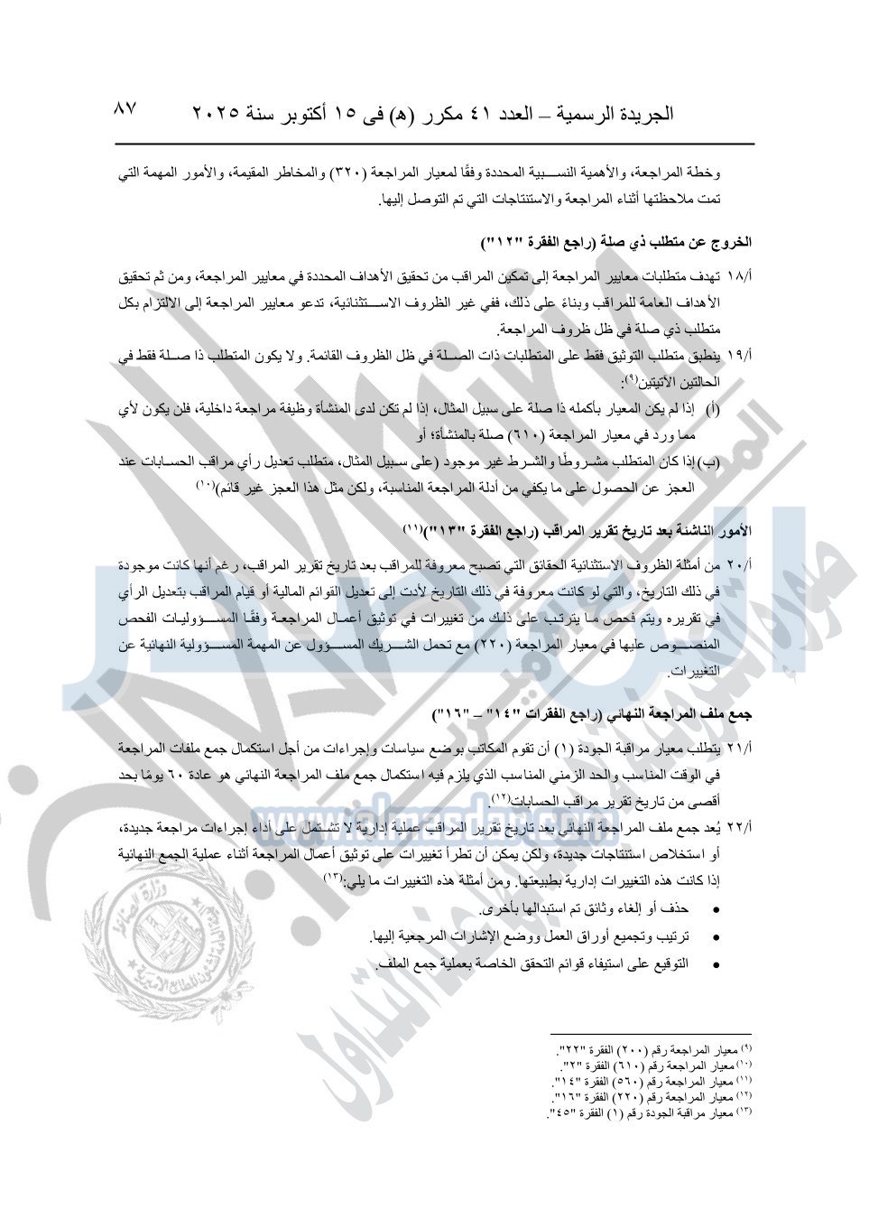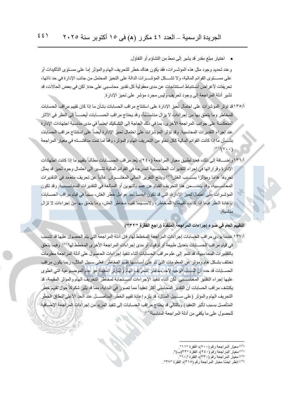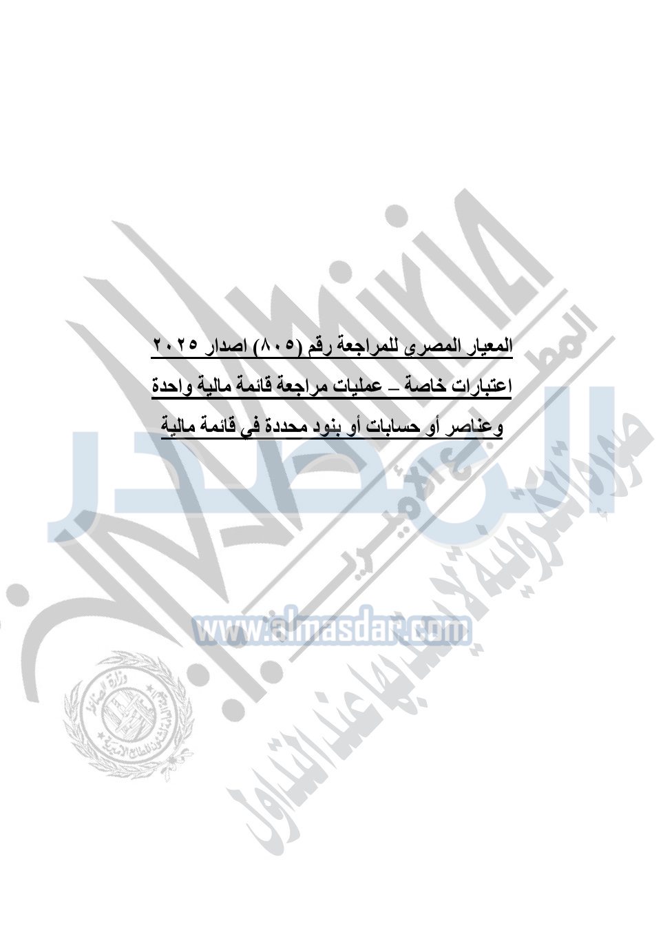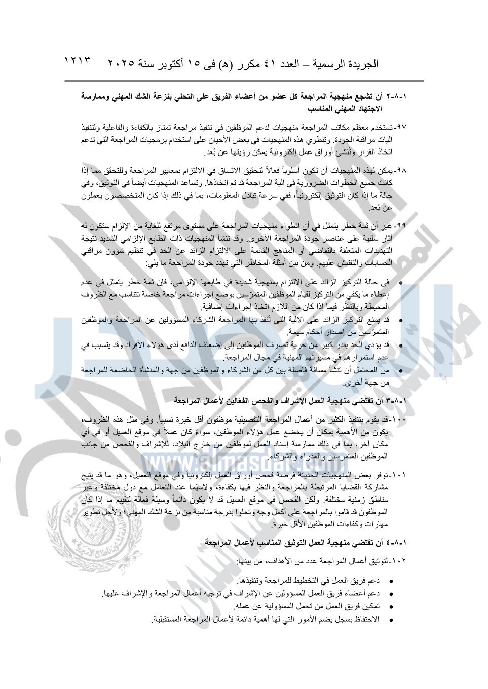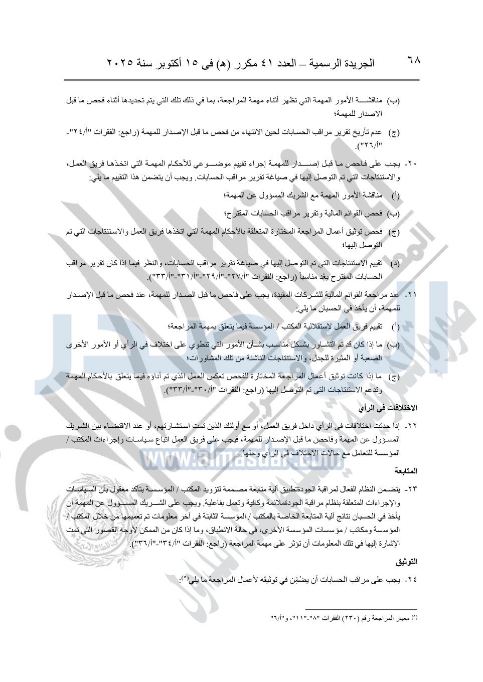 نشرت الجريدة الرسمية في العدد 41 مكرر "هـ" الصادر في 15 أكتوبر سنة 2025، قرار رئيس مجلس الوزراء رقم 3725 لسنة 2025، بشأن العمل بالمعايير المصرية للمراجعة والفحص المحدود ومهام التأكد الأخرى المرافقة لهذا القرار.