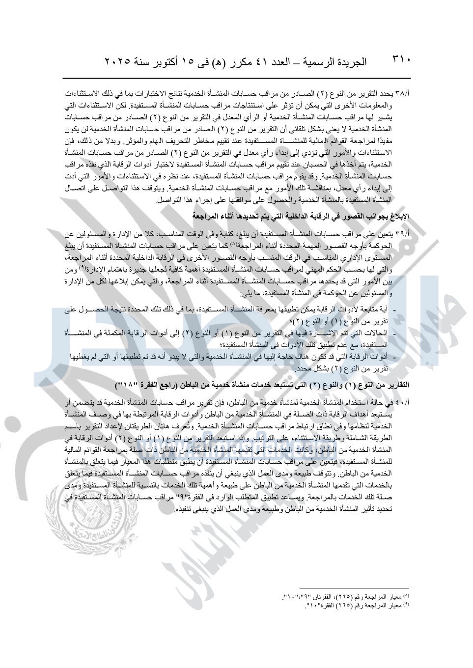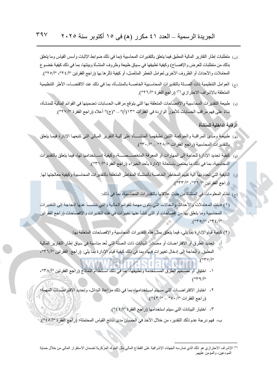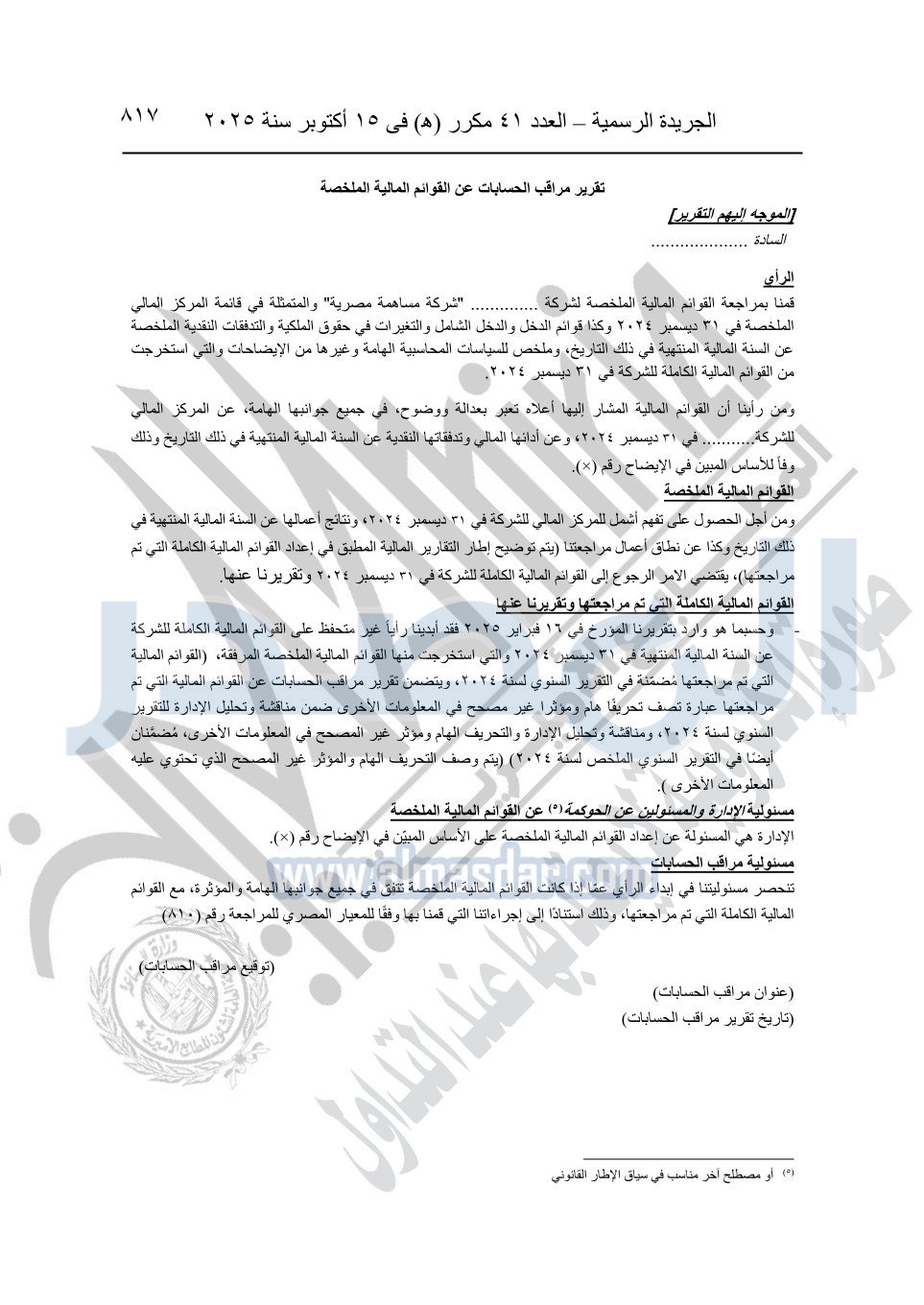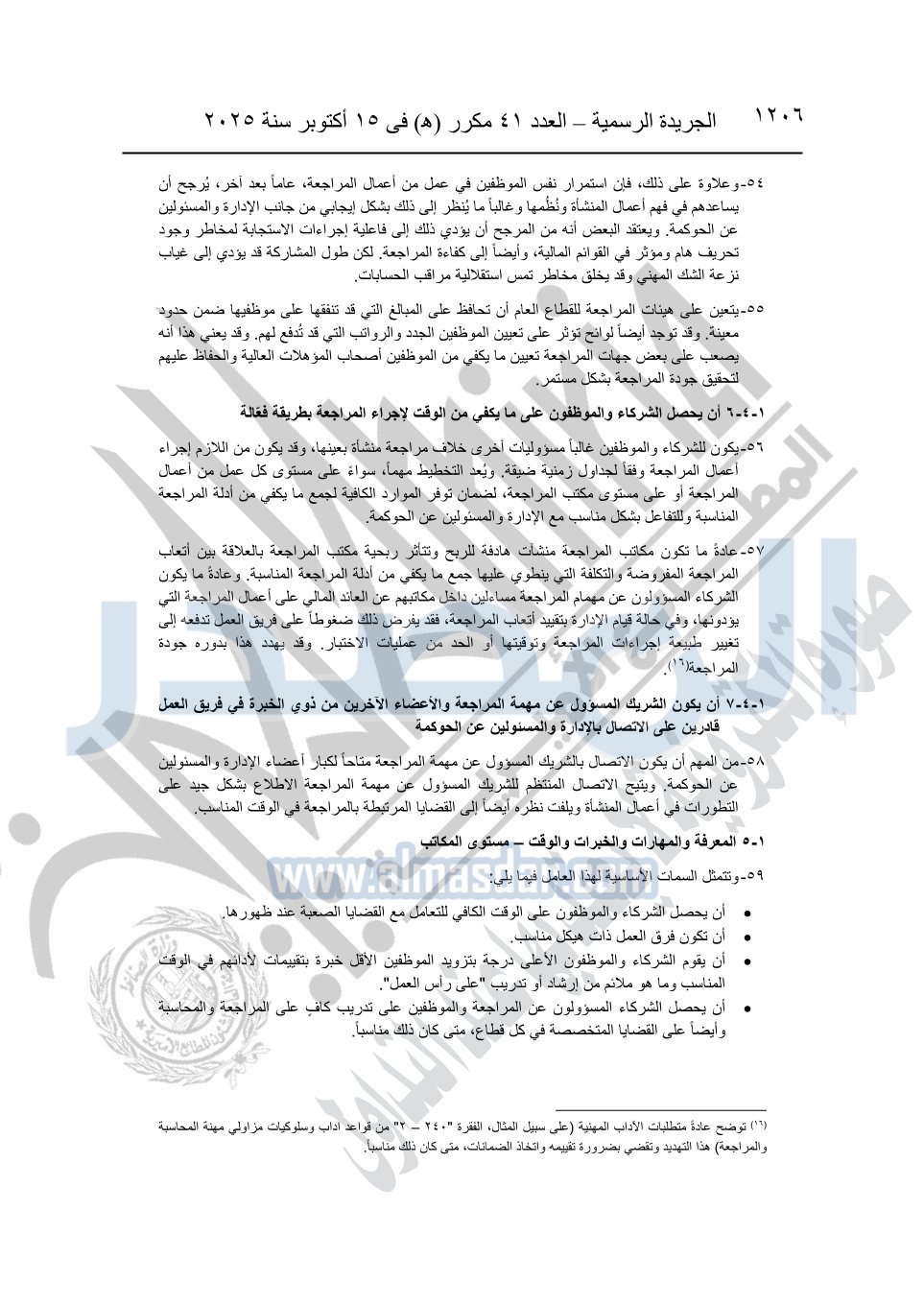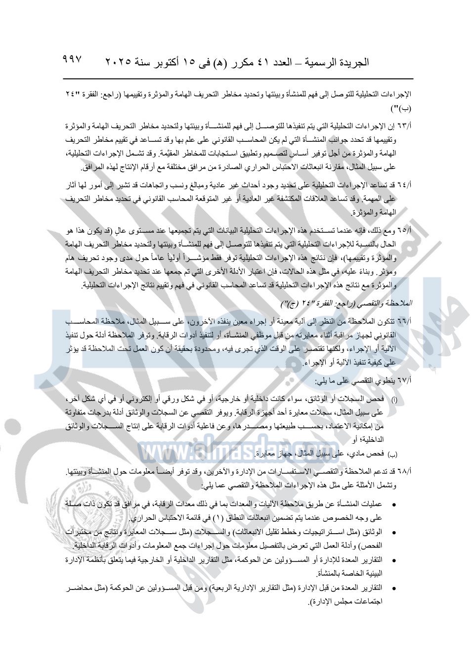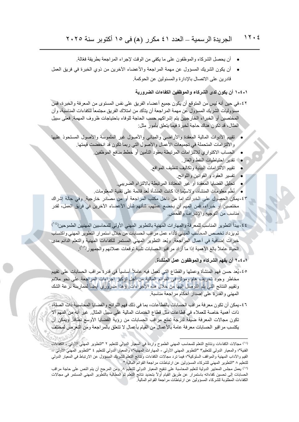 نشرت الجريدة الرسمية في العدد 41 مكرر "هـ" الصادر في 15 أكتوبر سنة 2025، قرار رئيس مجلس الوزراء رقم 3725 لسنة 2025، بشأن العمل بالمعايير المصرية للمراجعة والفحص المحدود ومهام التأكد الأخرى المرافقة لهذا القرار.