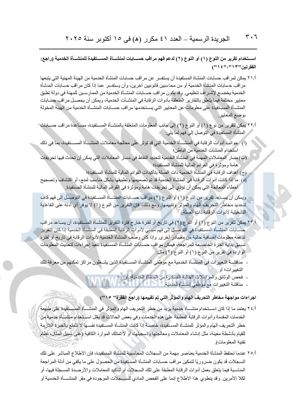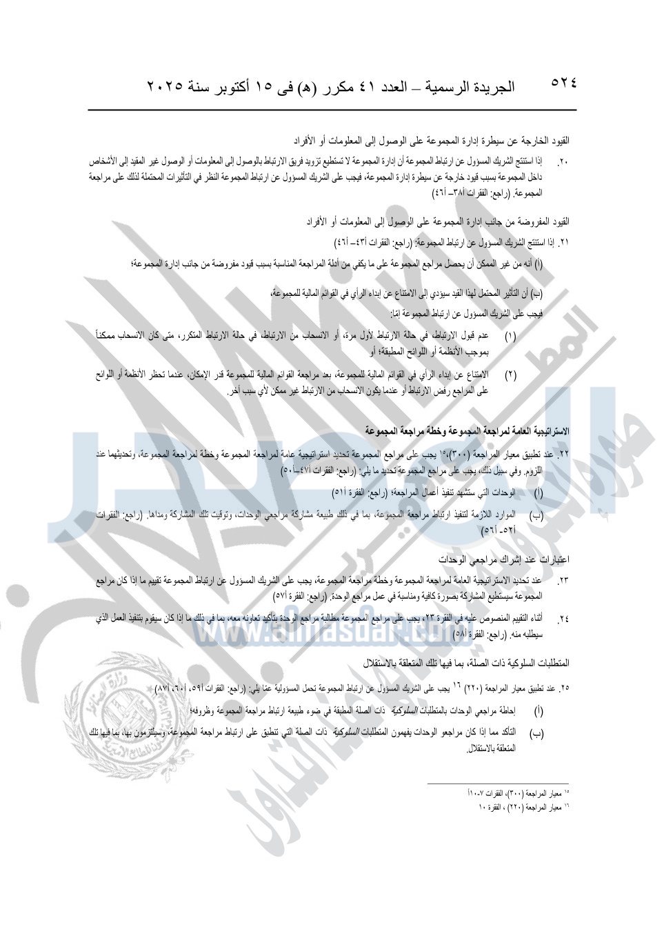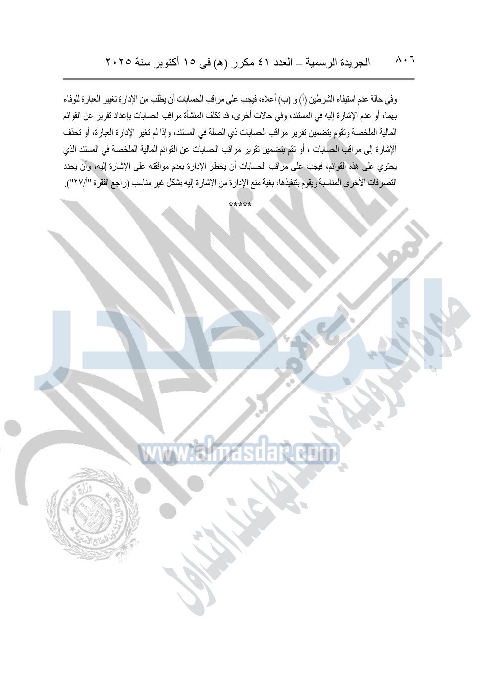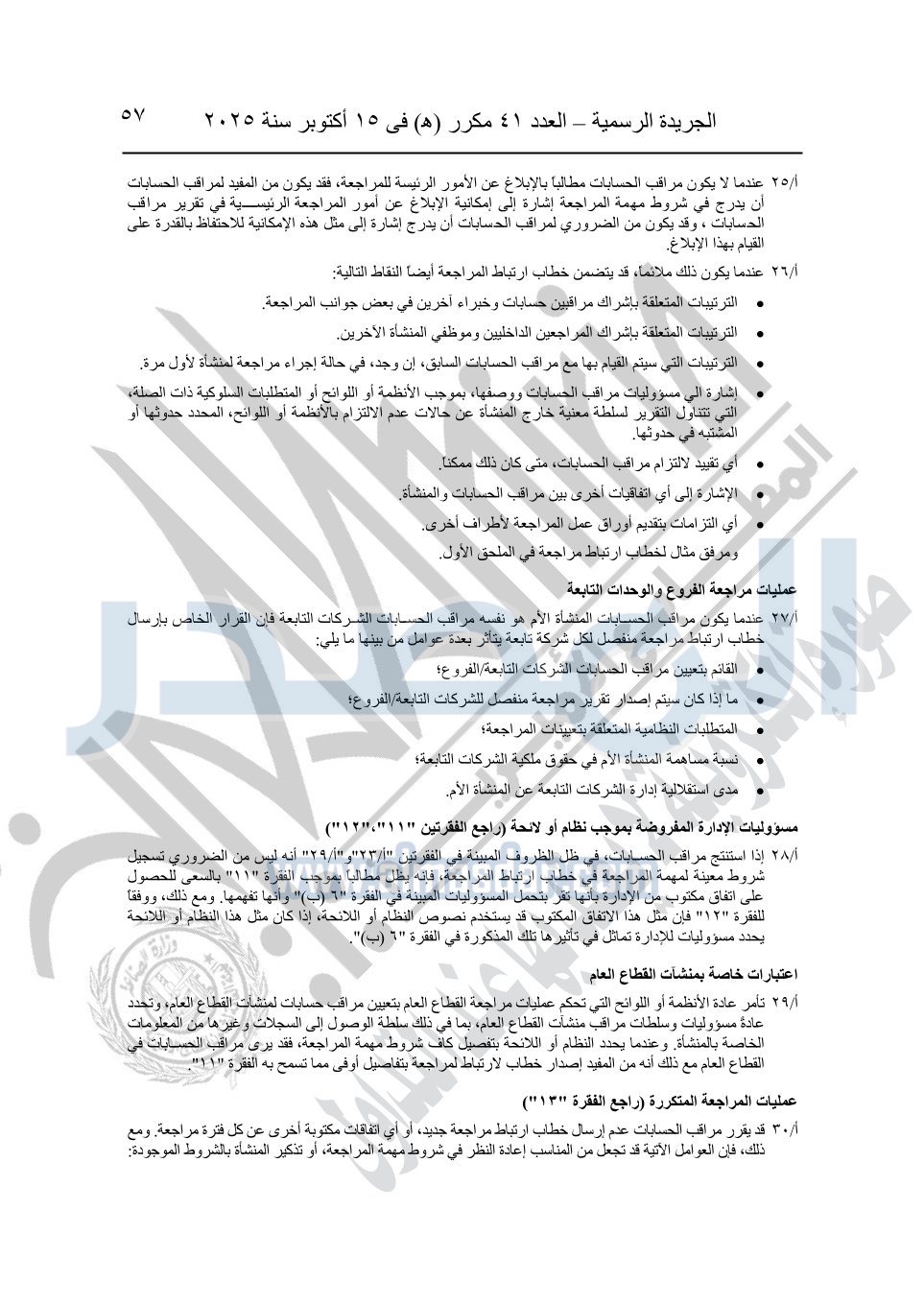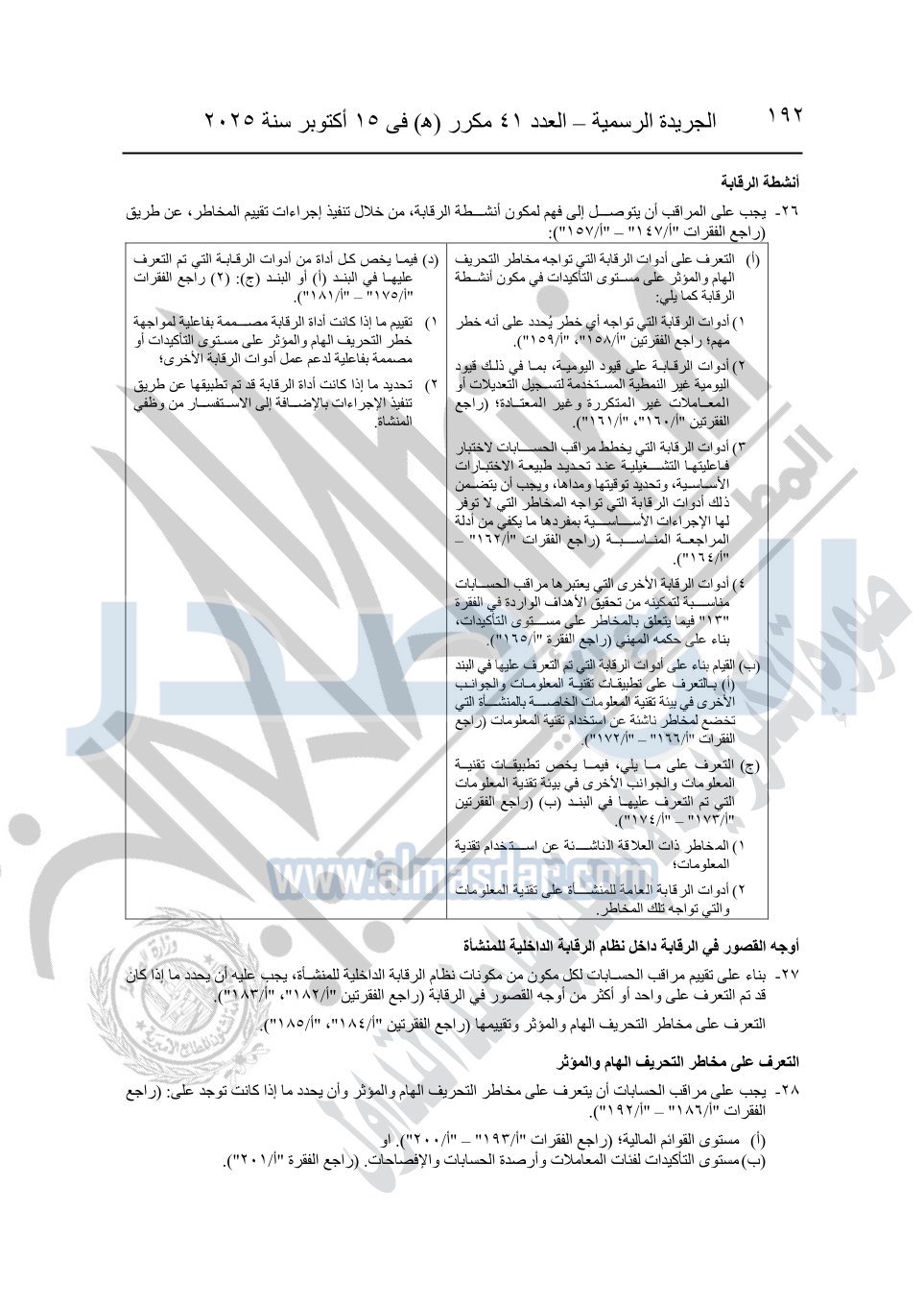 نشرت الجريدة الرسمية في العدد 41 مكرر "هـ" الصادر في 15 أكتوبر سنة 2025، قرار رئيس مجلس الوزراء رقم 3725 لسنة 2025، بشأن العمل بالمعايير المصرية للمراجعة والفحص المحدود ومهام التأكد الأخرى المرافقة لهذا القرار.